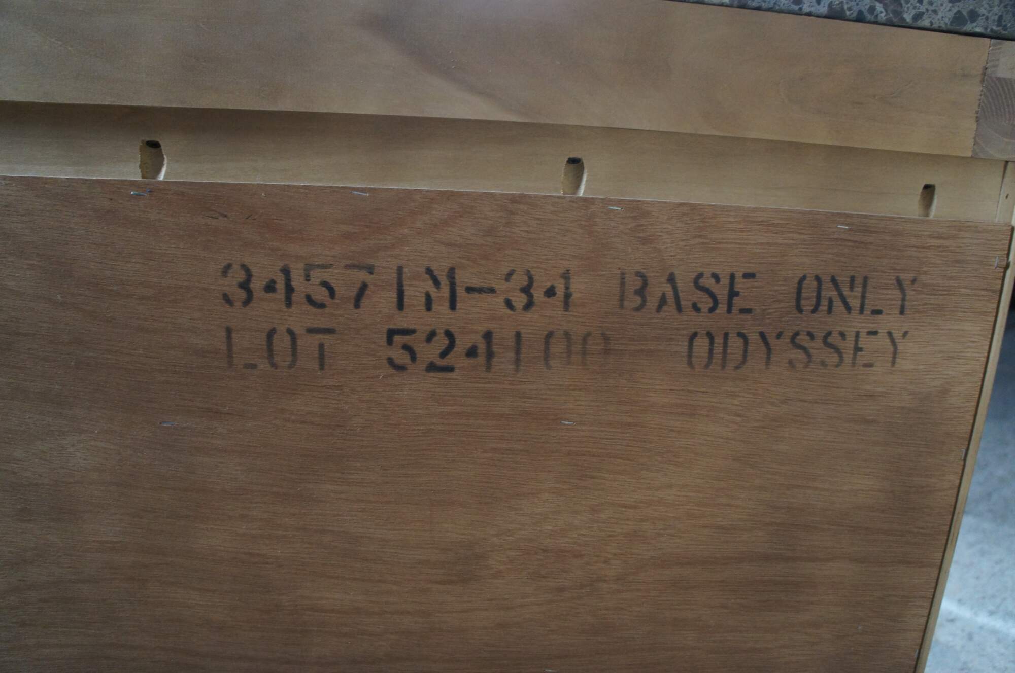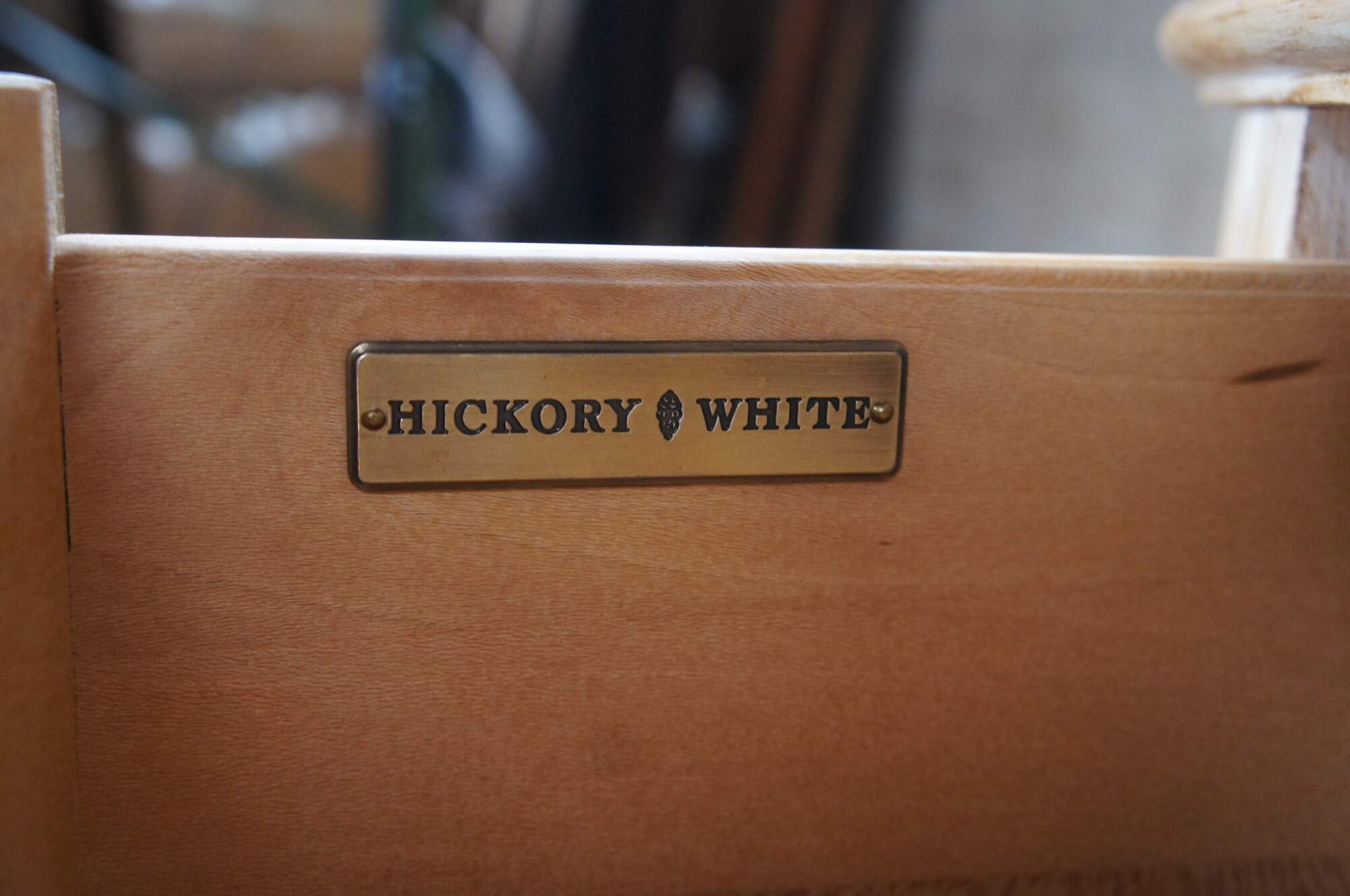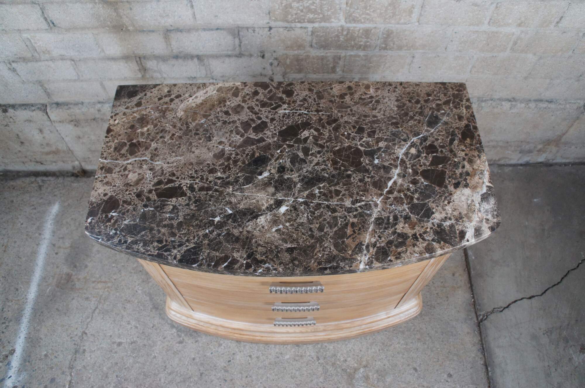 Hickory White Odyssey Collection Modern Bedside Table. A demilune form made from pickled oak with three dovetailed drawers and a granite top.