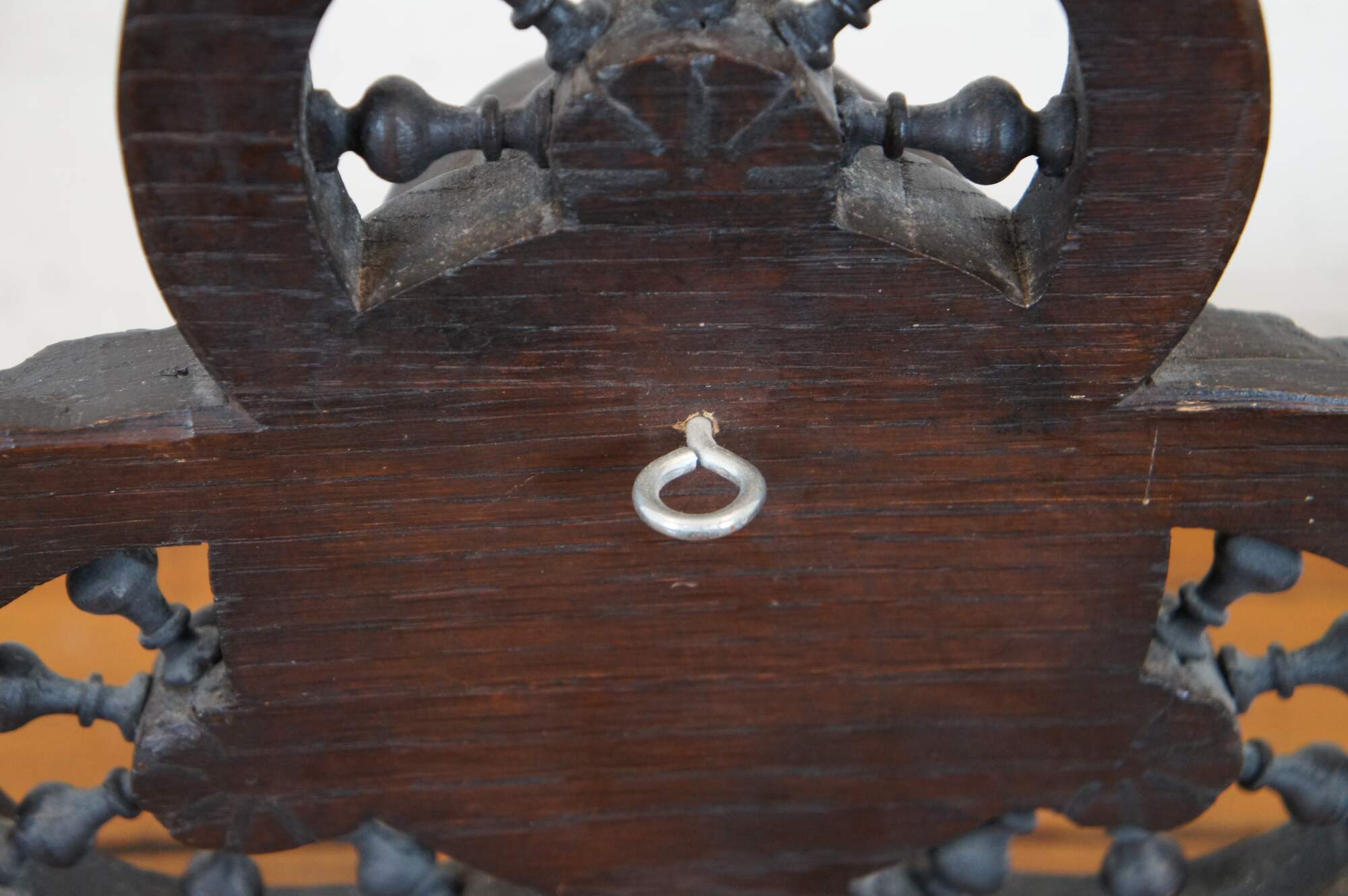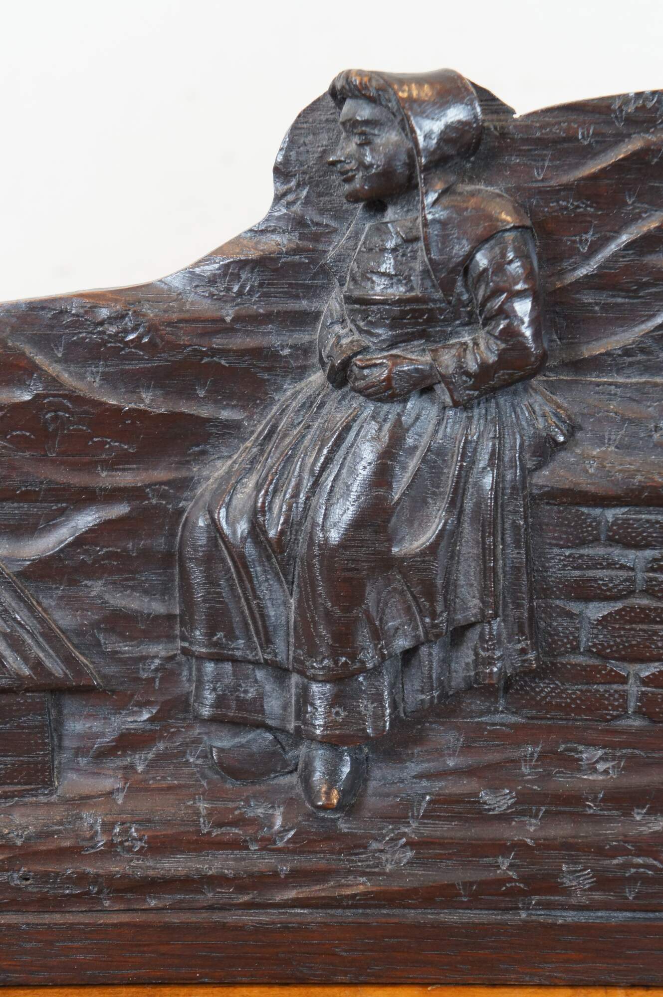 Antique 19th century hand carved Brittany / Breton architectural pediment or backsplash, featuring a nautical high relief design with the face of a man at the center, mounted on three spindled ship wheels, flanked on either side by a male and female peasant figure and provincial landscape of buildings.