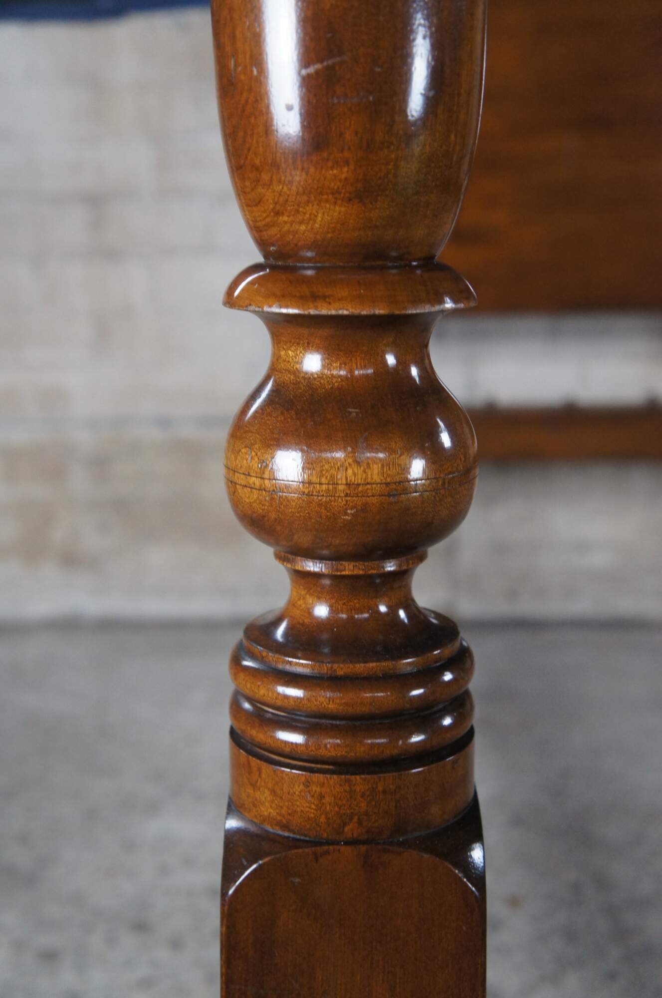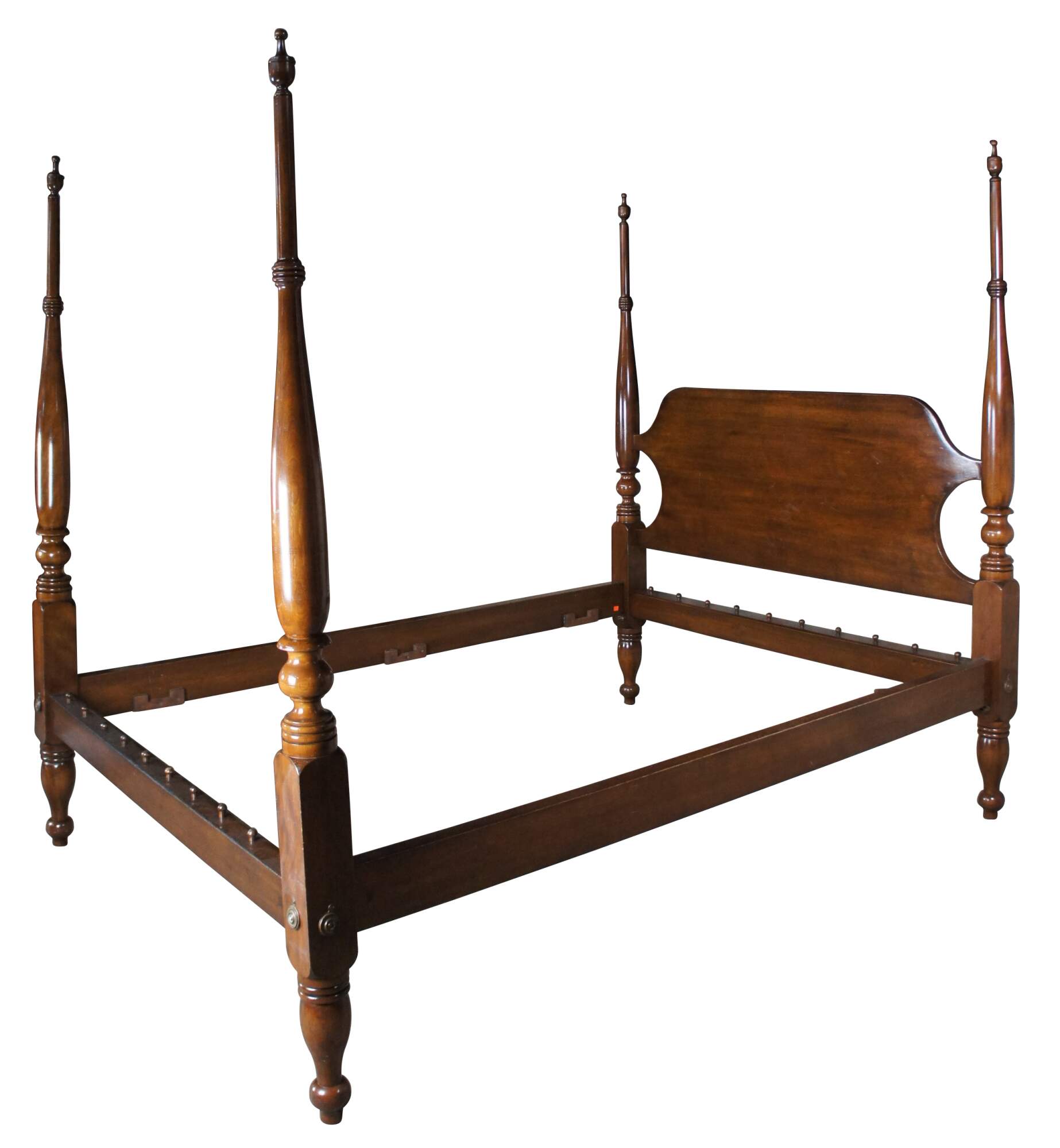 A beautiful 4 poster solid Mahogany, circa 1950s. Features a camelback headboard and long turned ribbed posts with leading to trophy finials. The bed has colonial brass plates along the corners and is supported by turned toupie or turnip feet.