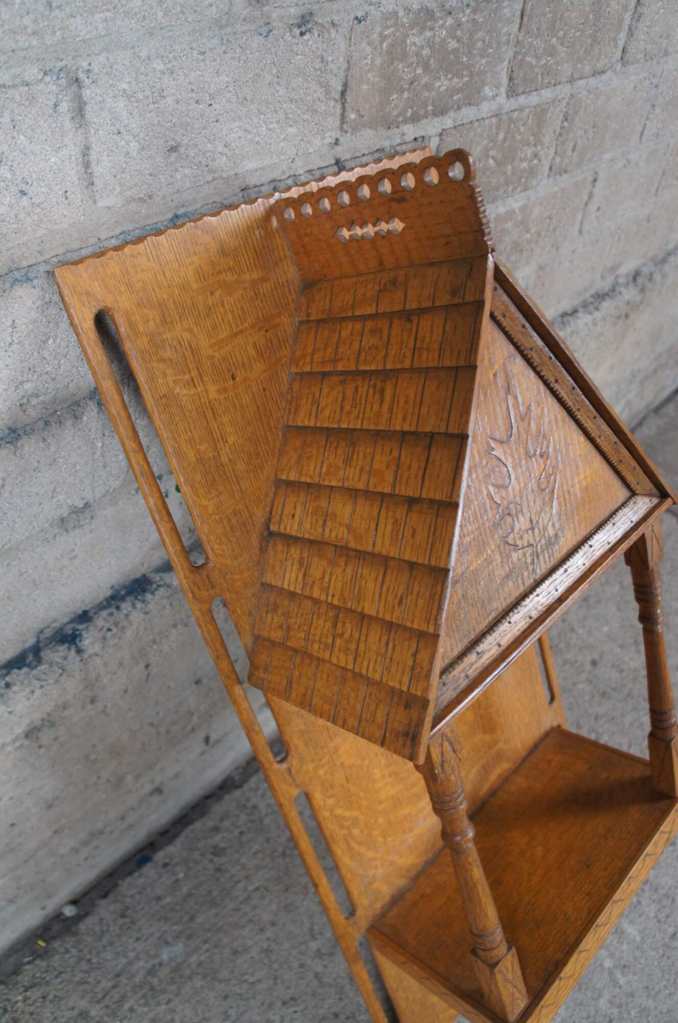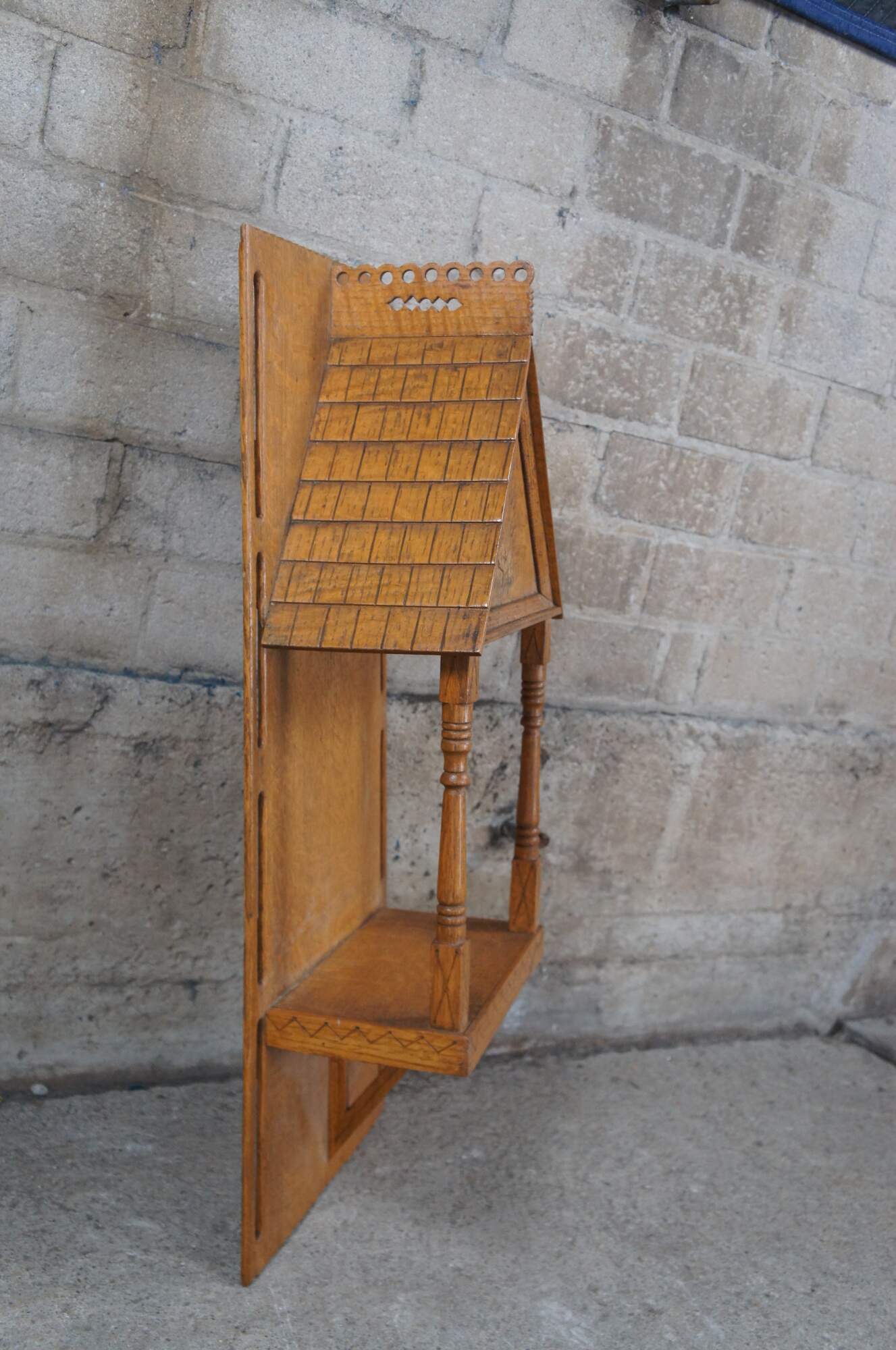 Vintage ornamental folk art wall shelf or sconce in the form of a house. Made of quartersawn oak featuring reticulated ornate details with turned columns and central maple leaf.
