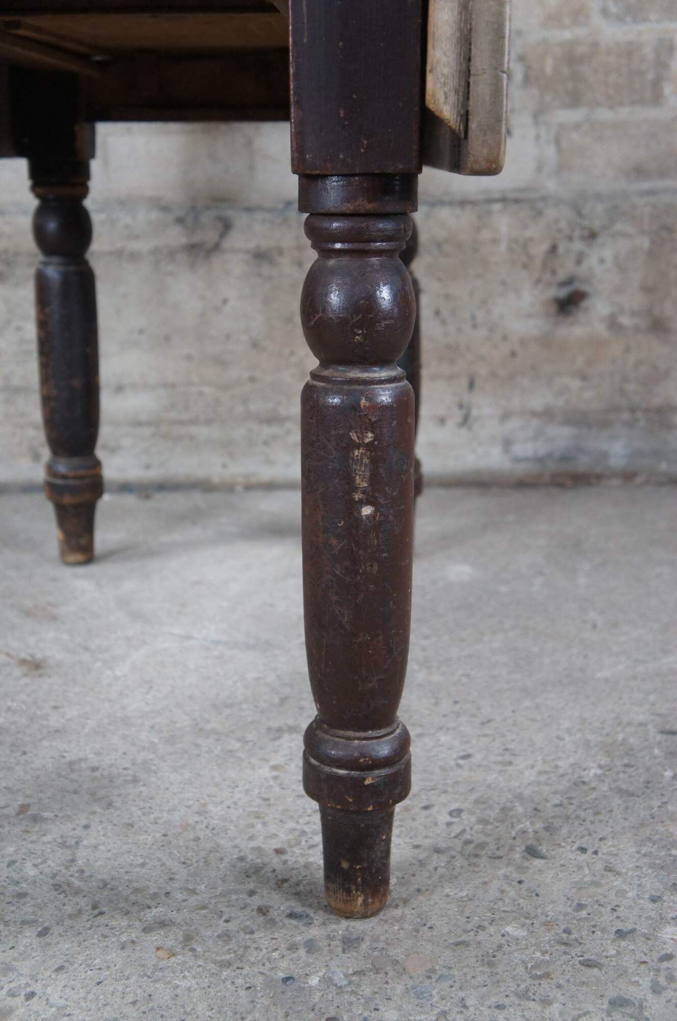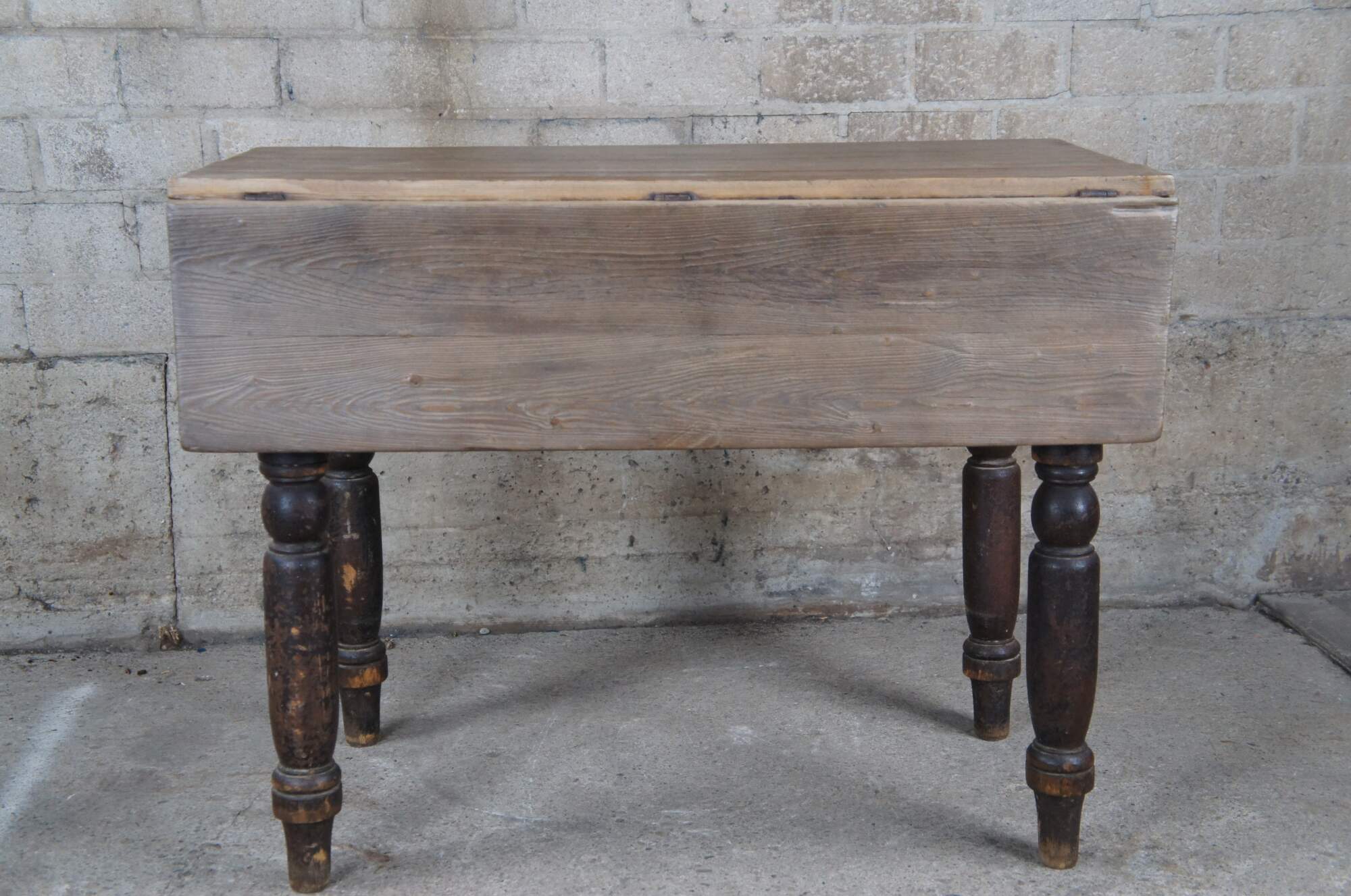 A quaint primitive 19th century English pine farmhouse tavern dropleaf breakfast table or console featuring a rectangular form, central drawer and turned legs. Leafs are supported by iron fold outs.