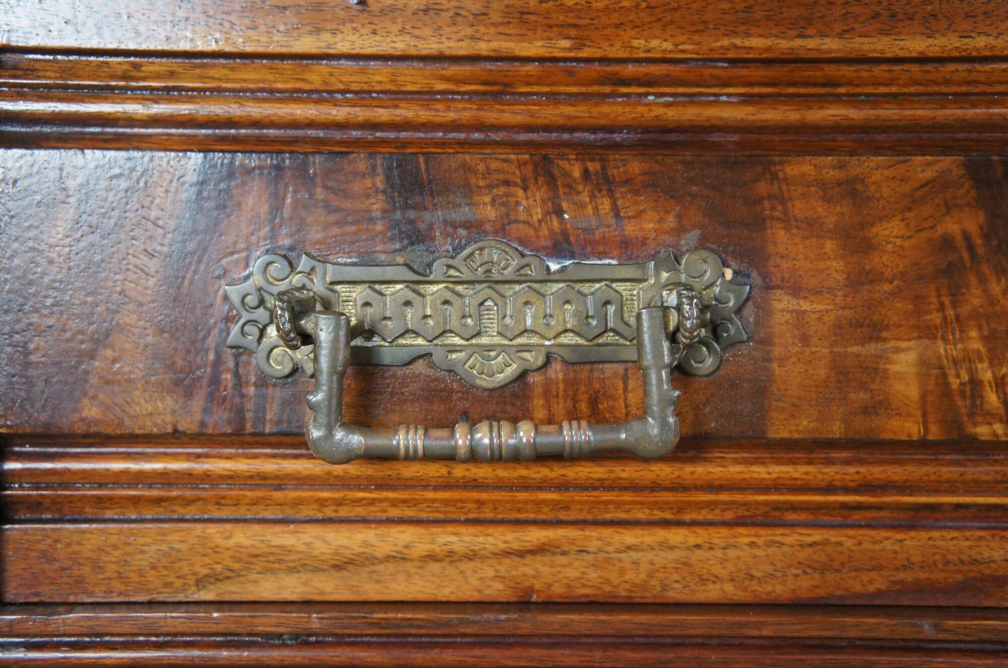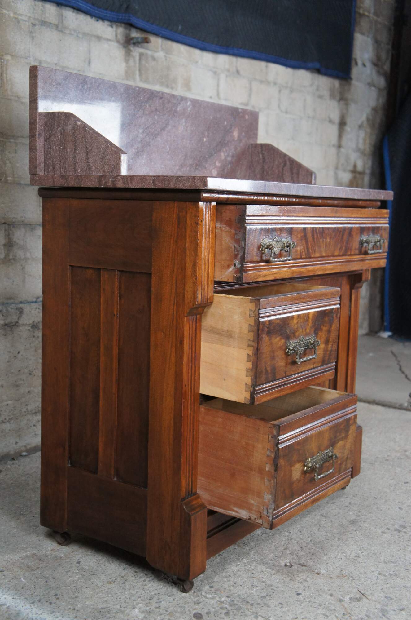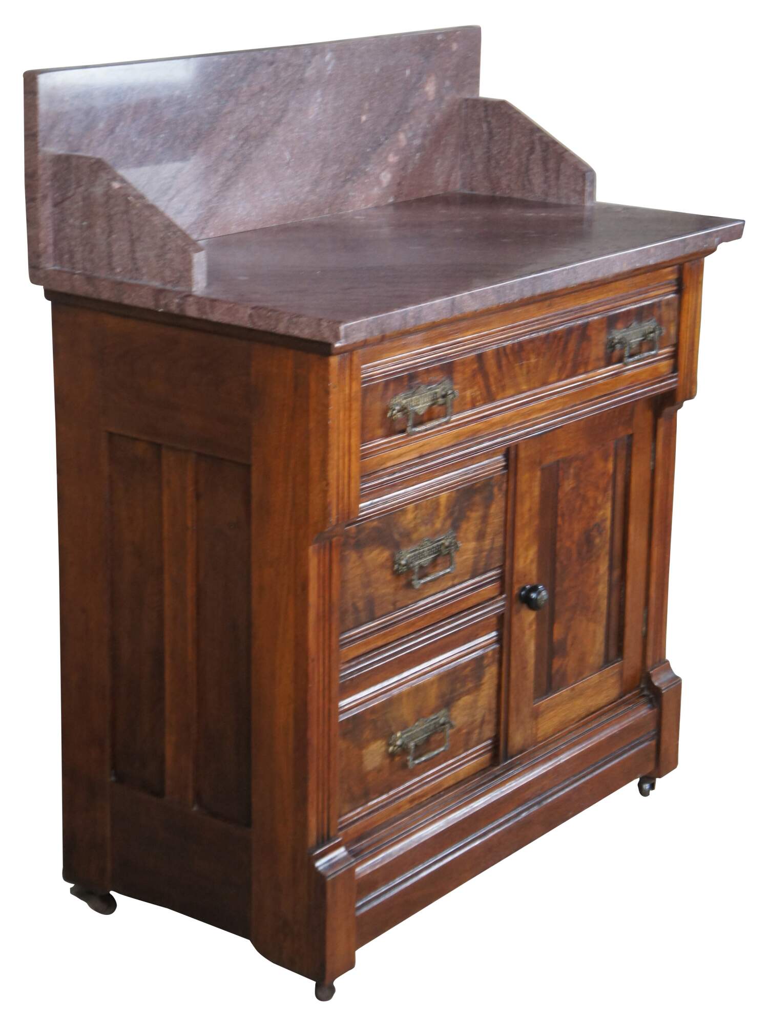Antique Victorian wash stand / chest / side table. Made of walnut featuring Eastlake styling with marble top backsplash over three drawers and one cabinet accented with walnut burl panels and brass hardware