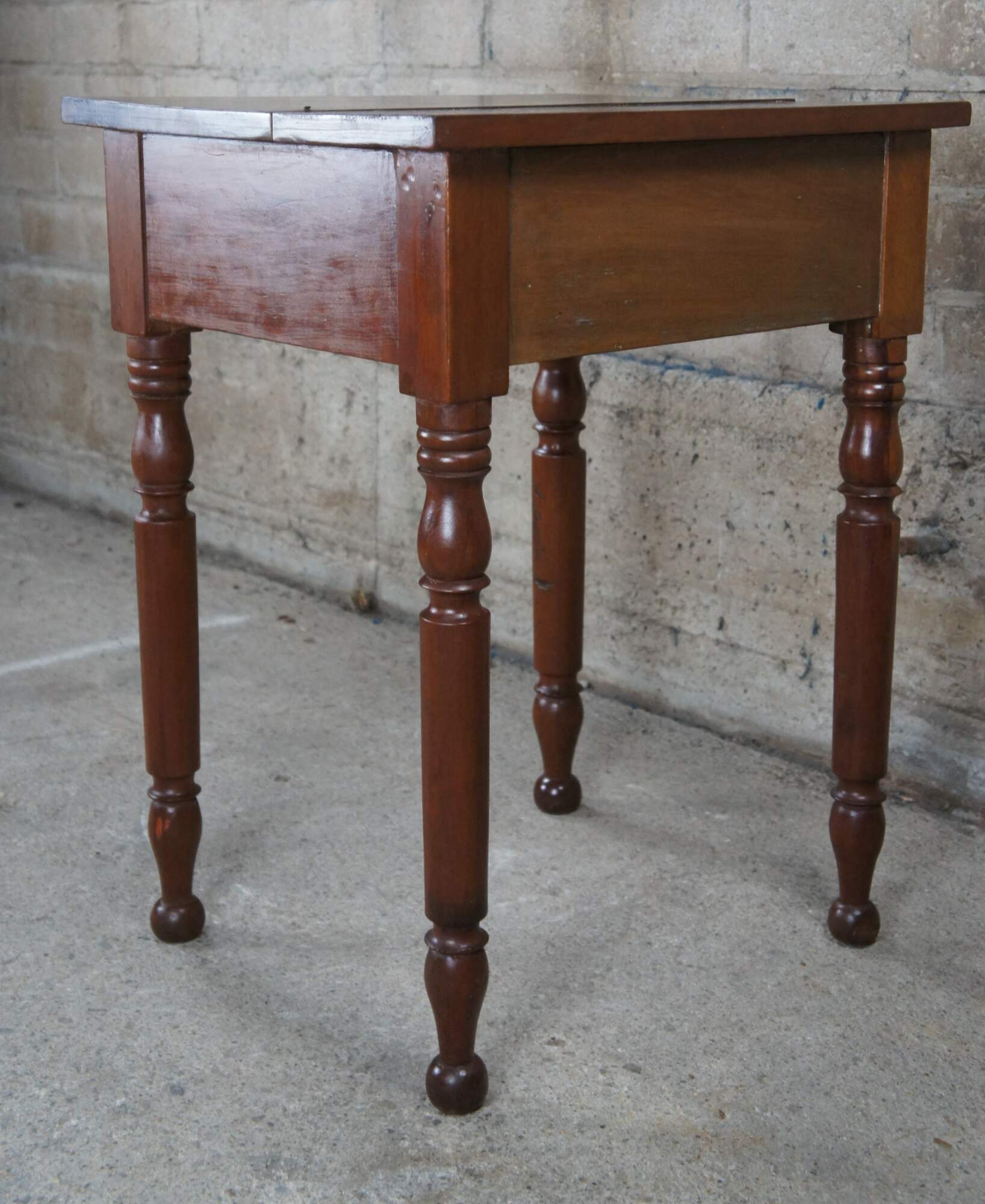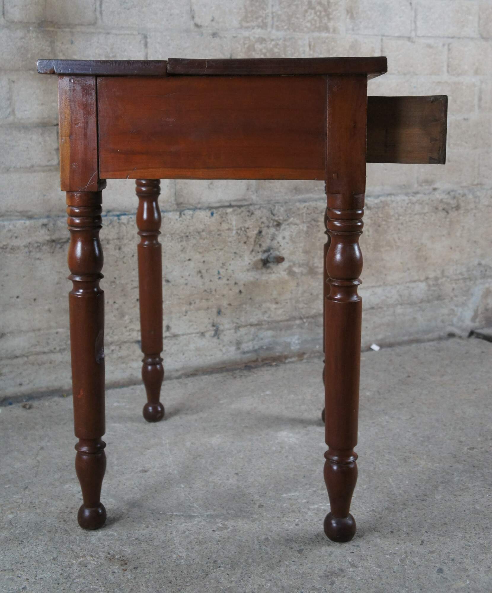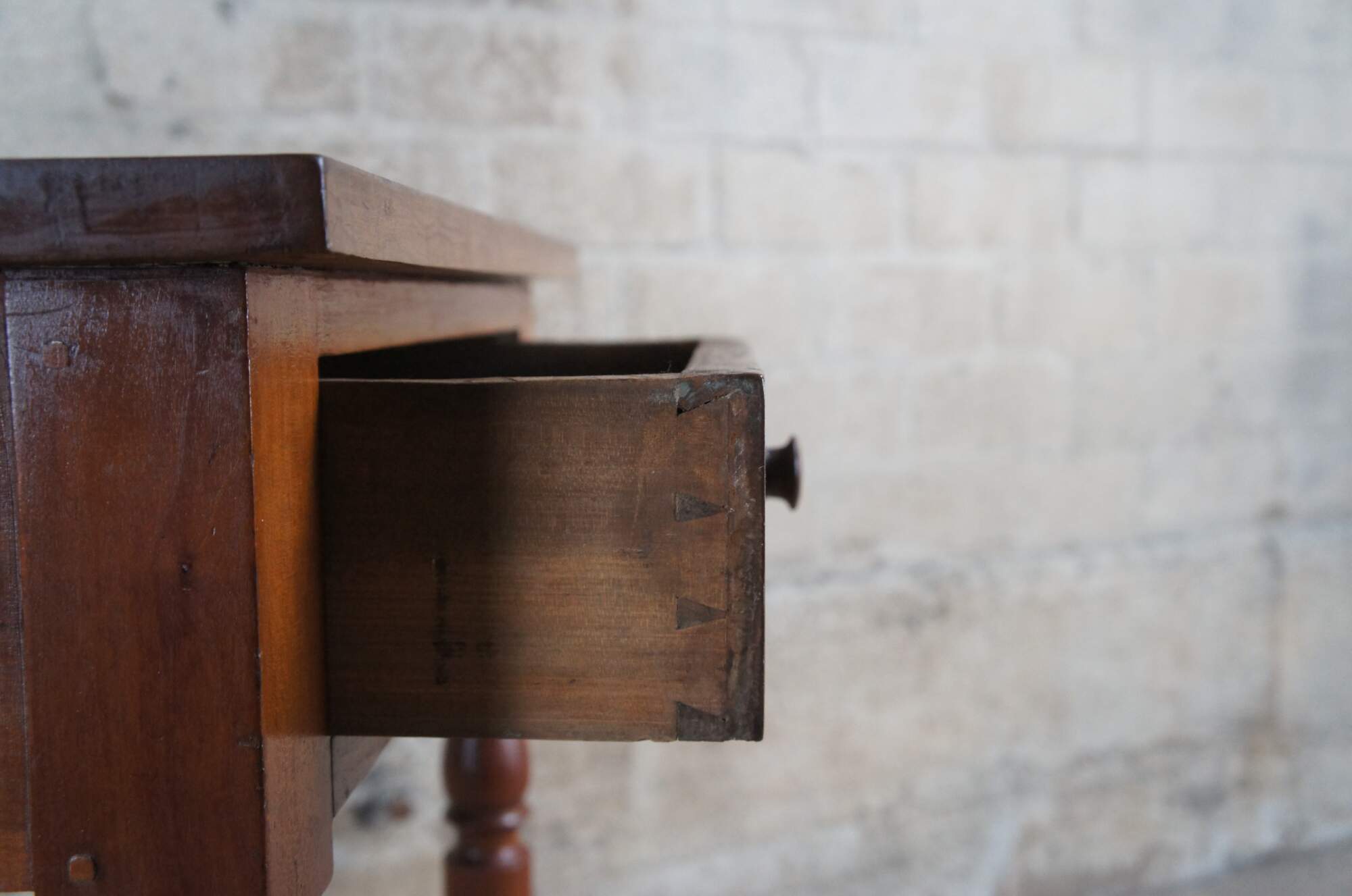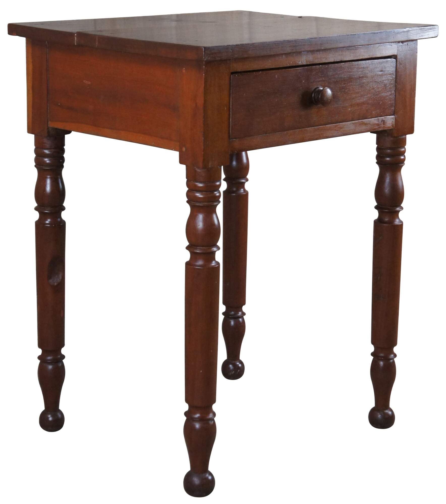 Antique Early American 19th century side table. Made of cherry featuring rectangular form with one drawer, turned legs and hand planing and dovetailing.