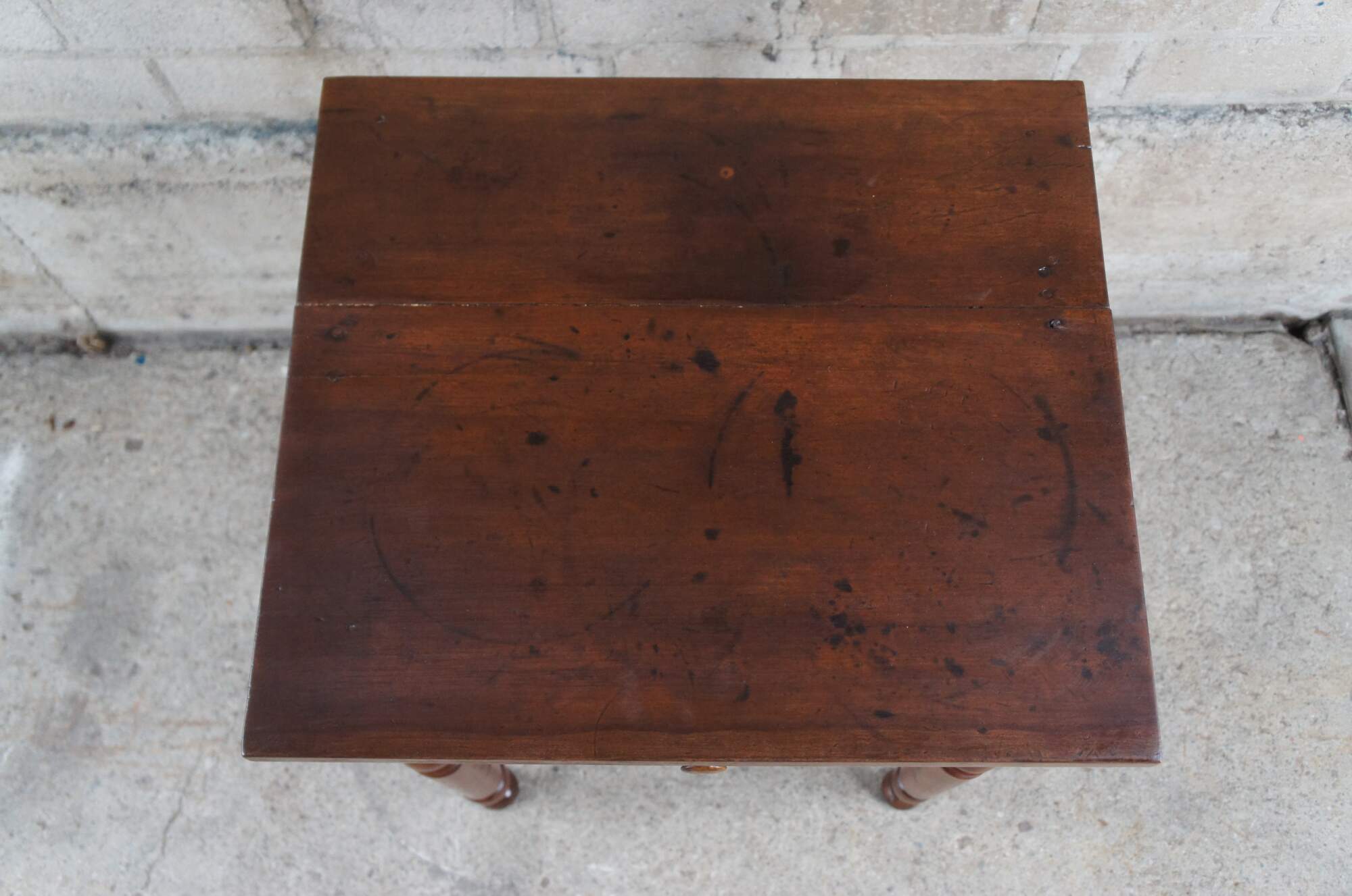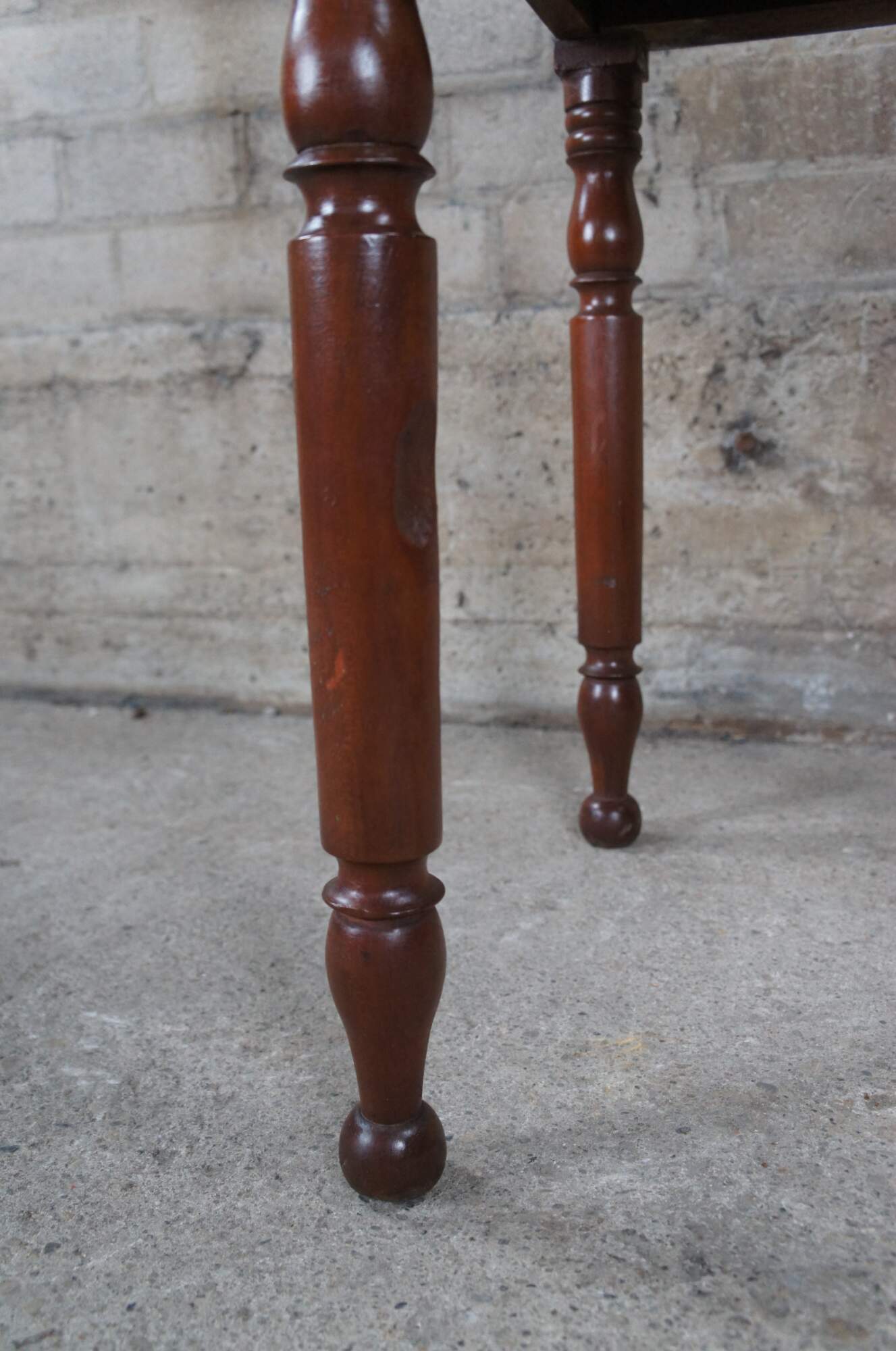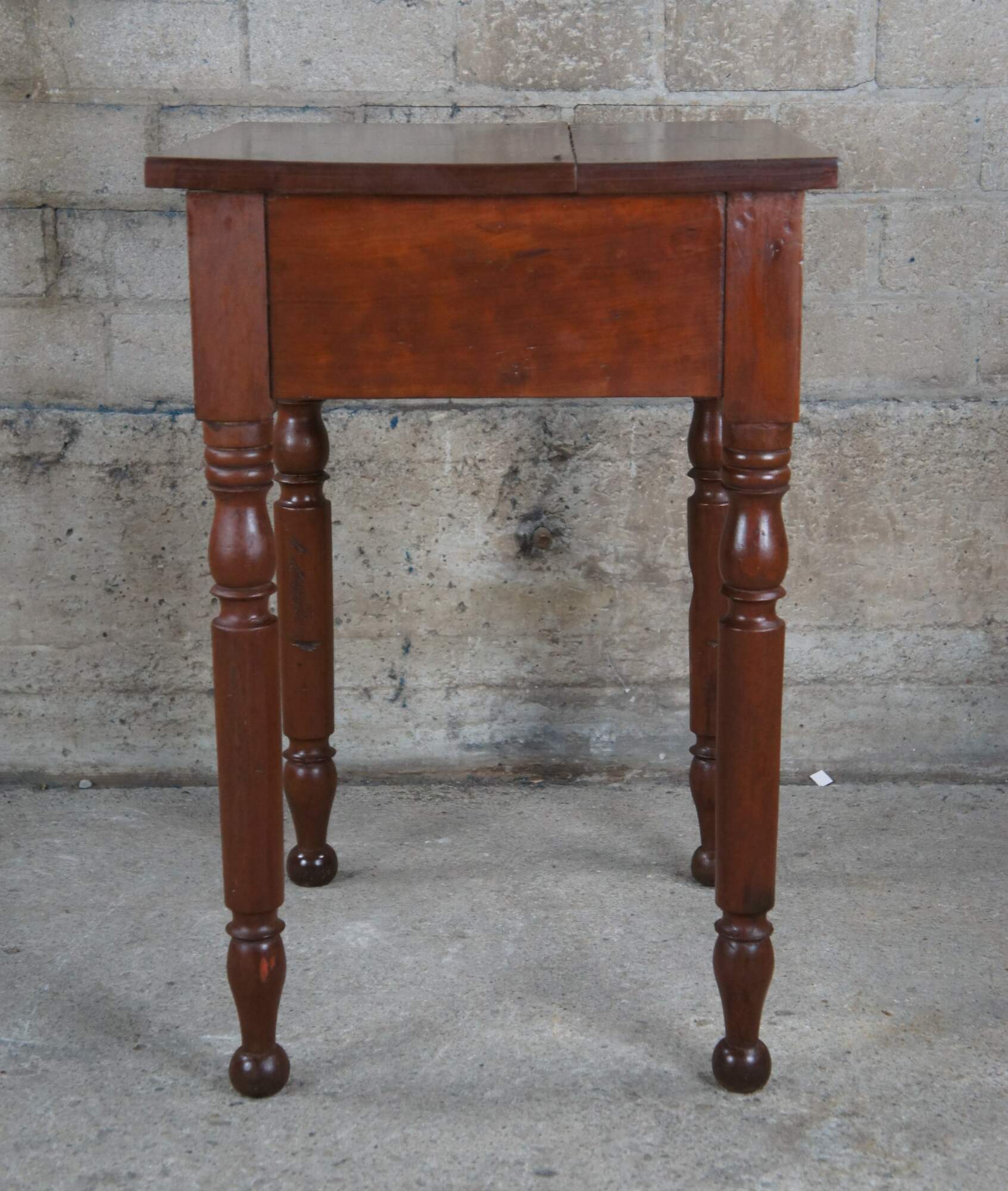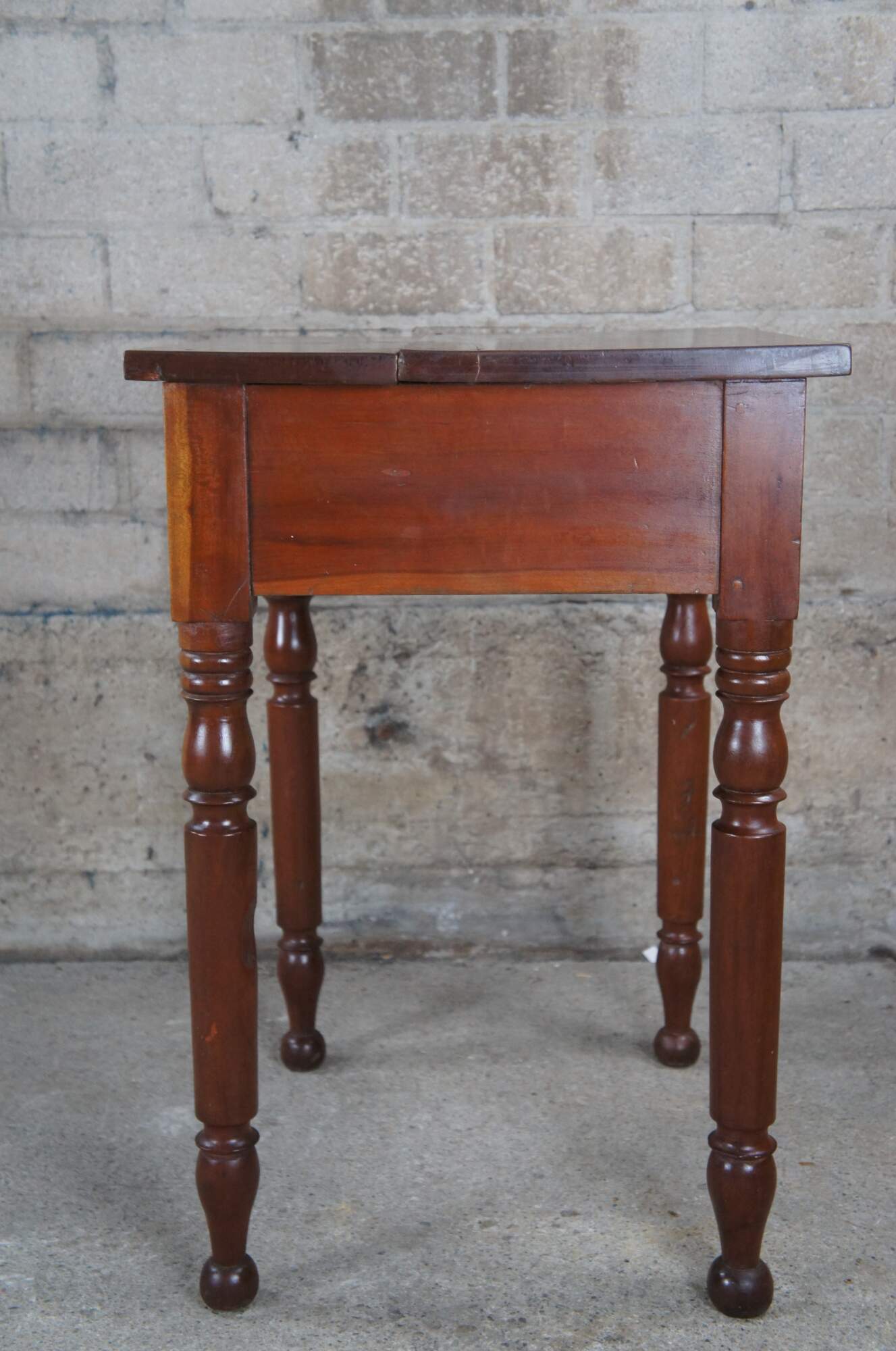 Antique Early American 19th century side table. Made of cherry featuring rectangular form with one drawer, turned legs and hand planing and dovetailing.