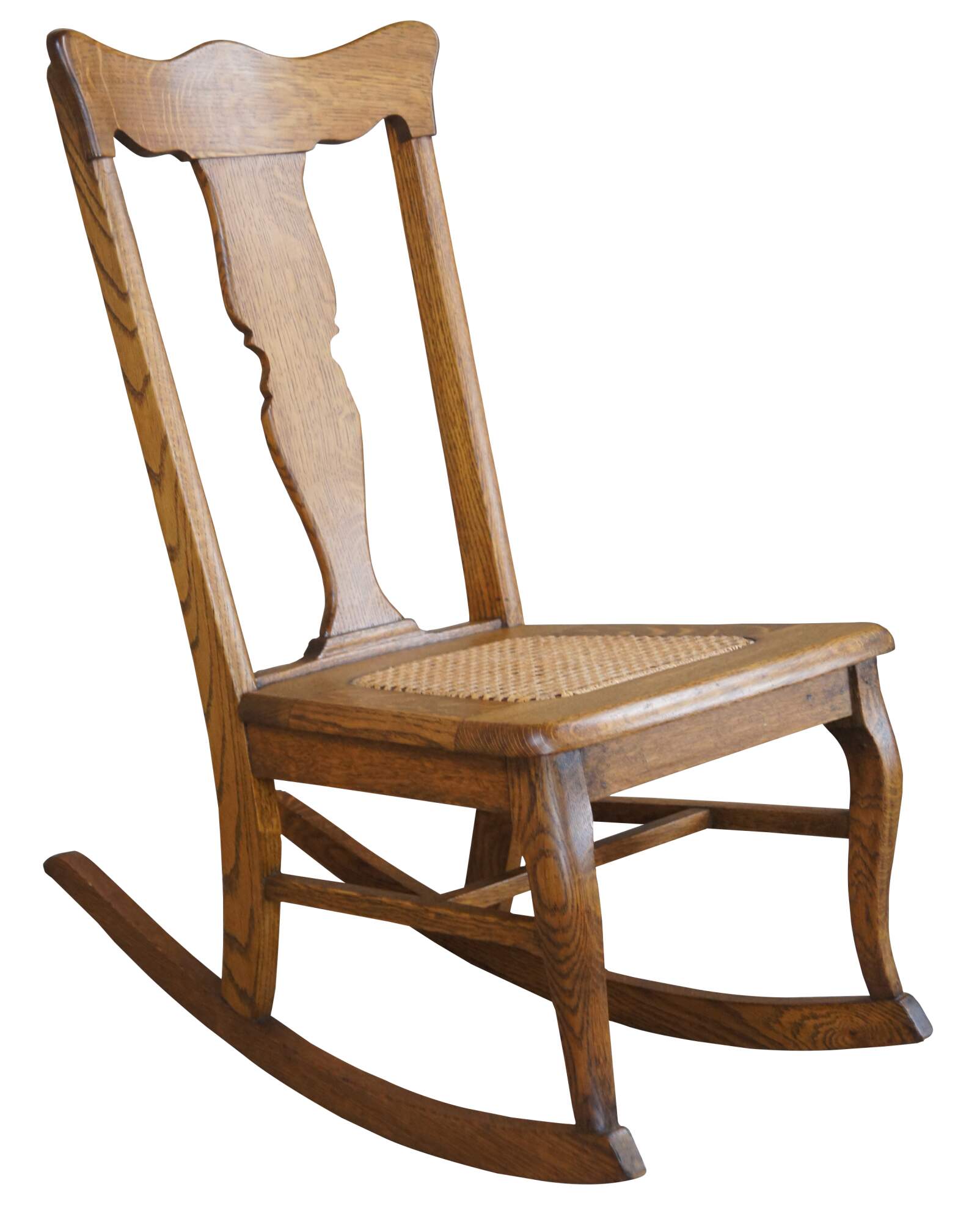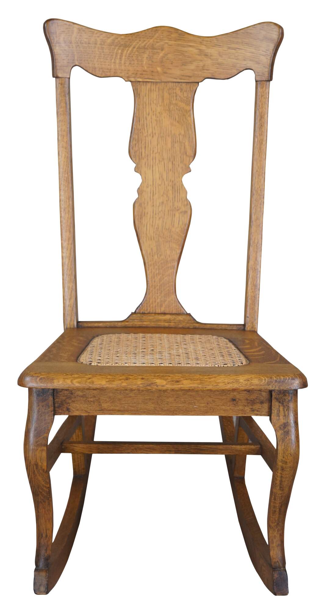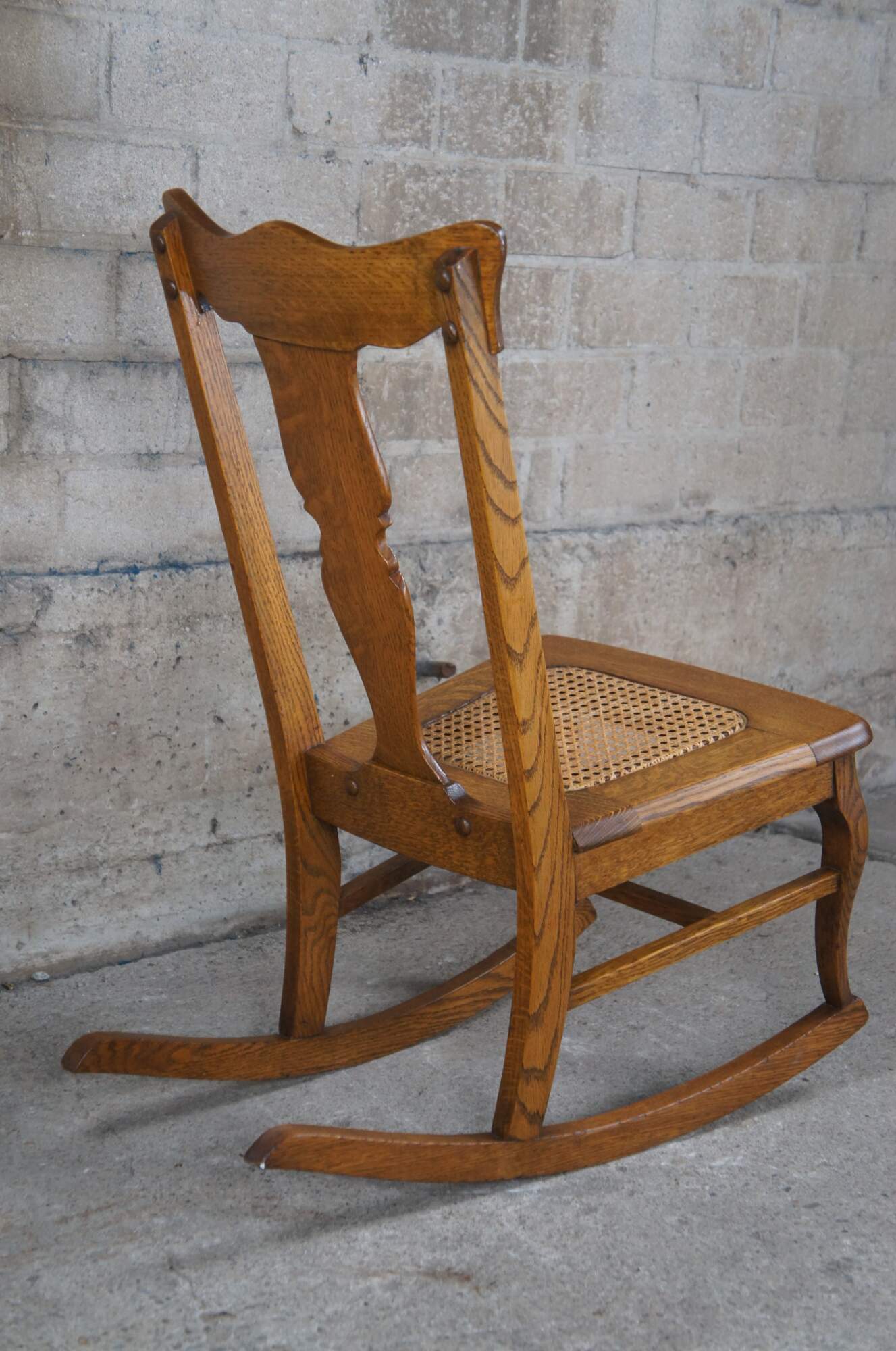 Antique Victorian Stomps Burkhardt rocking chair. Made of quartersawn oak featuring serpentine form with caned seat.