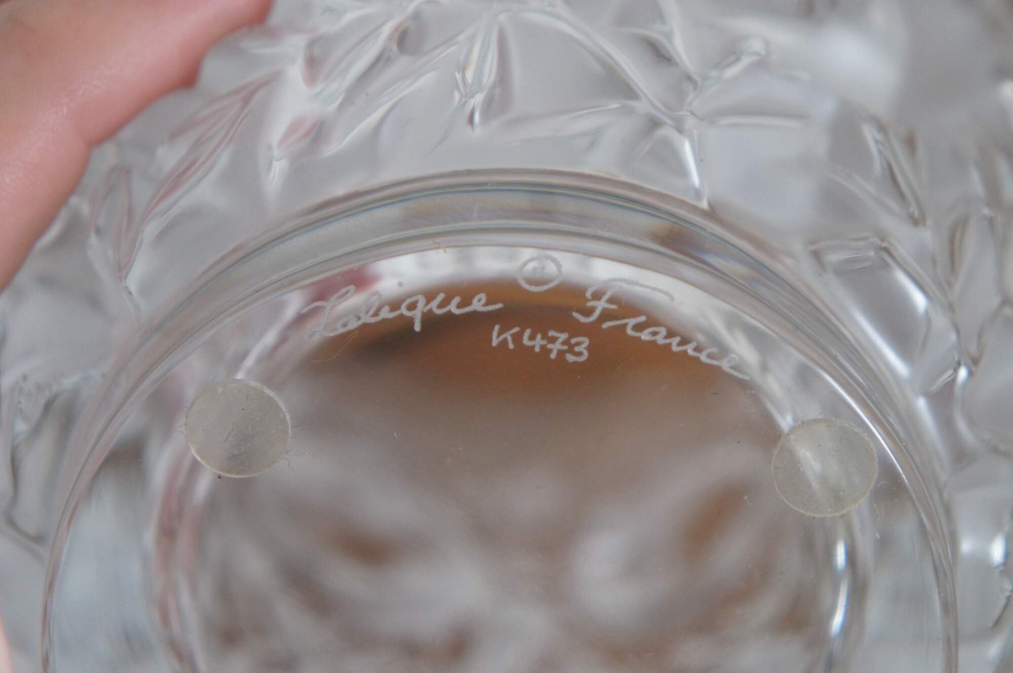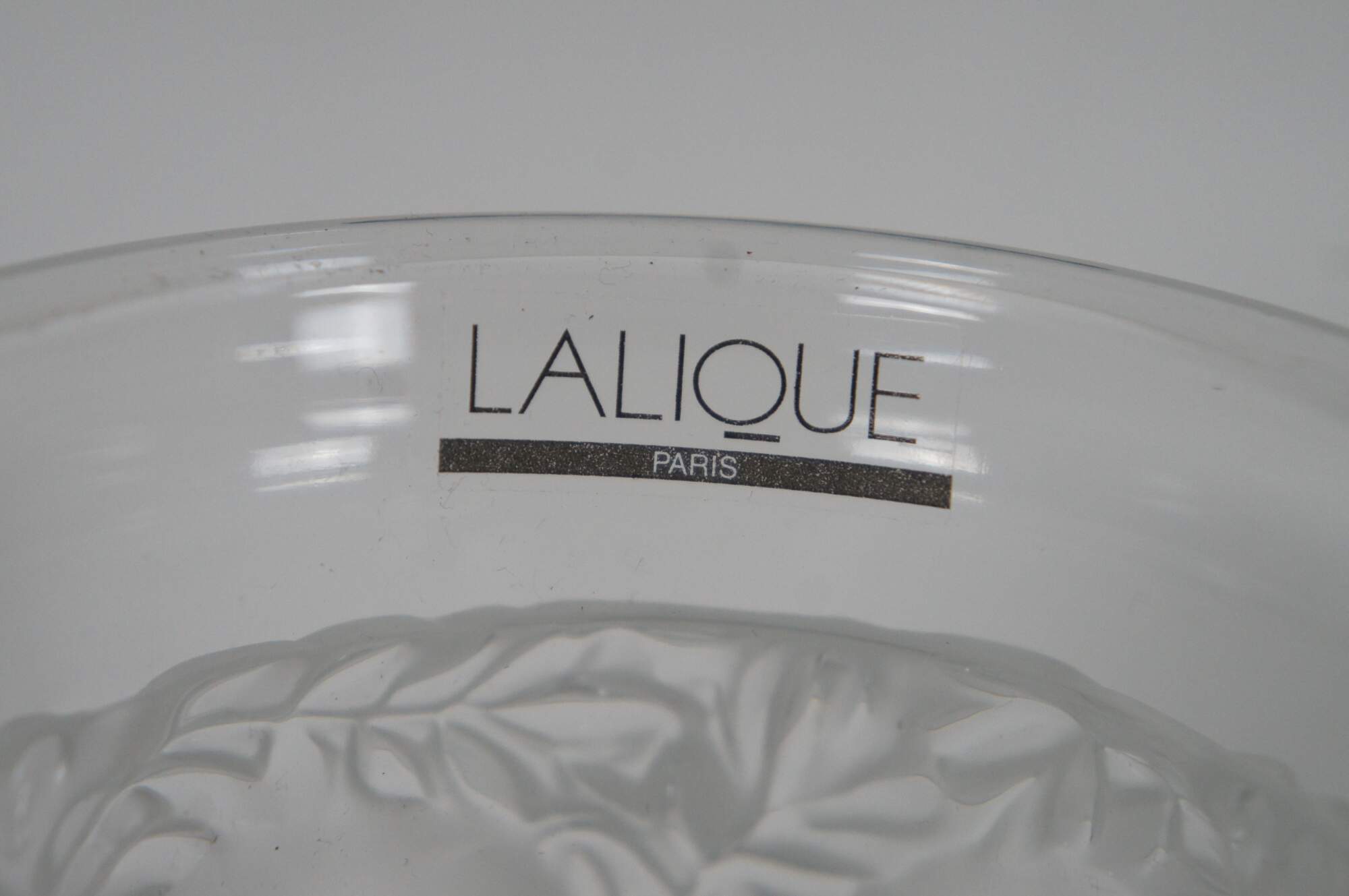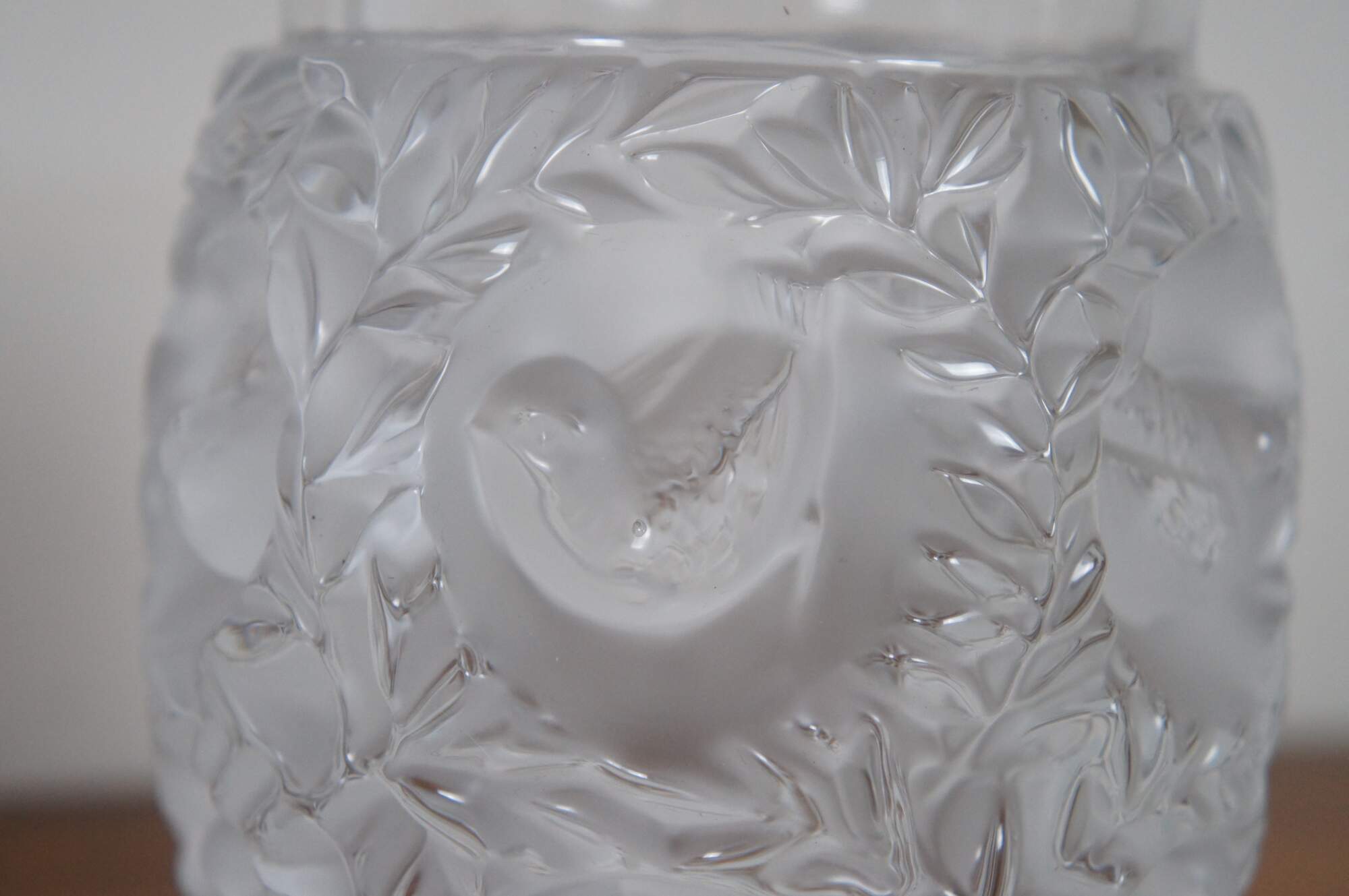 Vintage Lalique France Bagatelle frosted crystal vase featuring molded birds nestled among leaves and foliage.