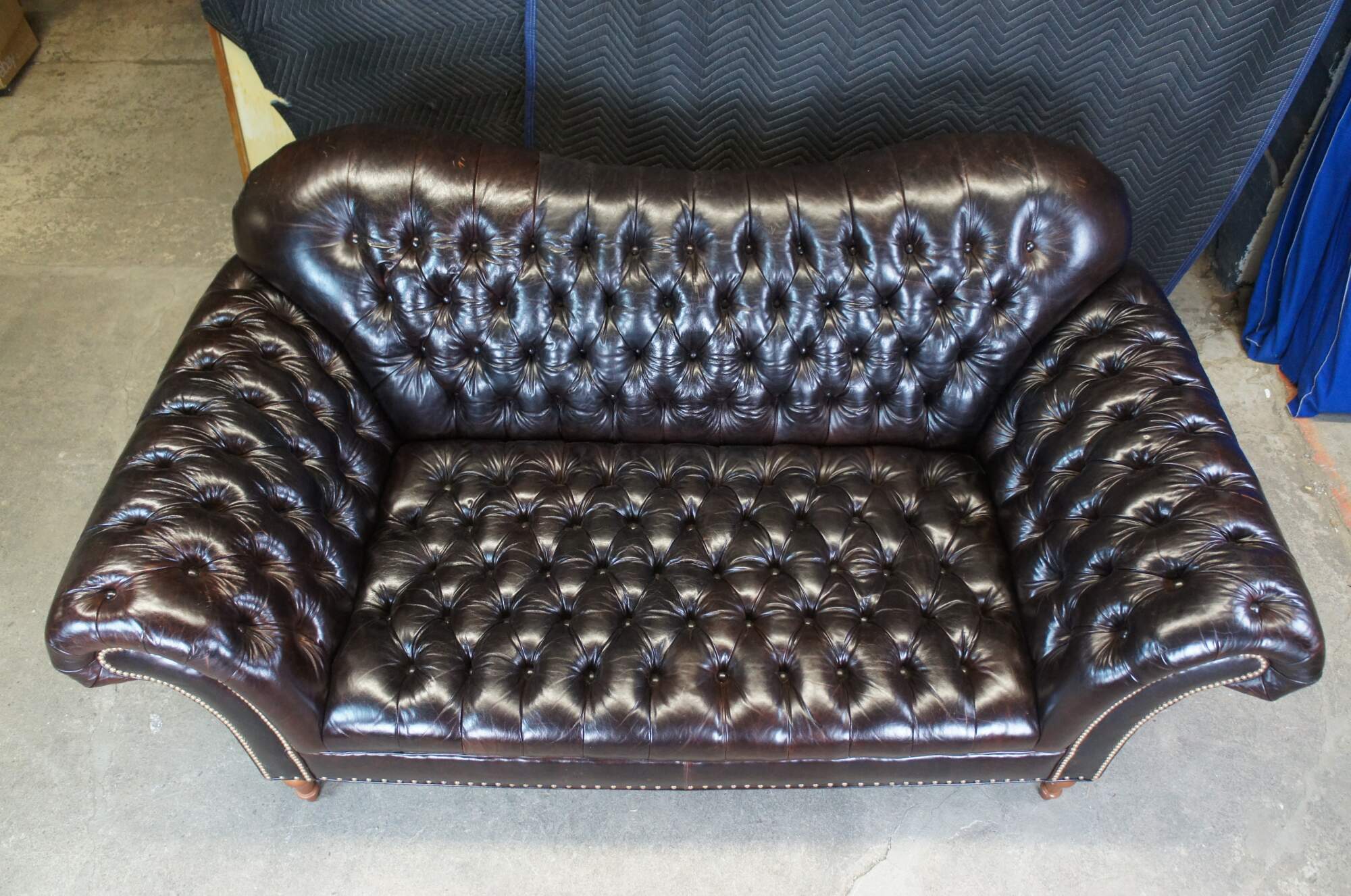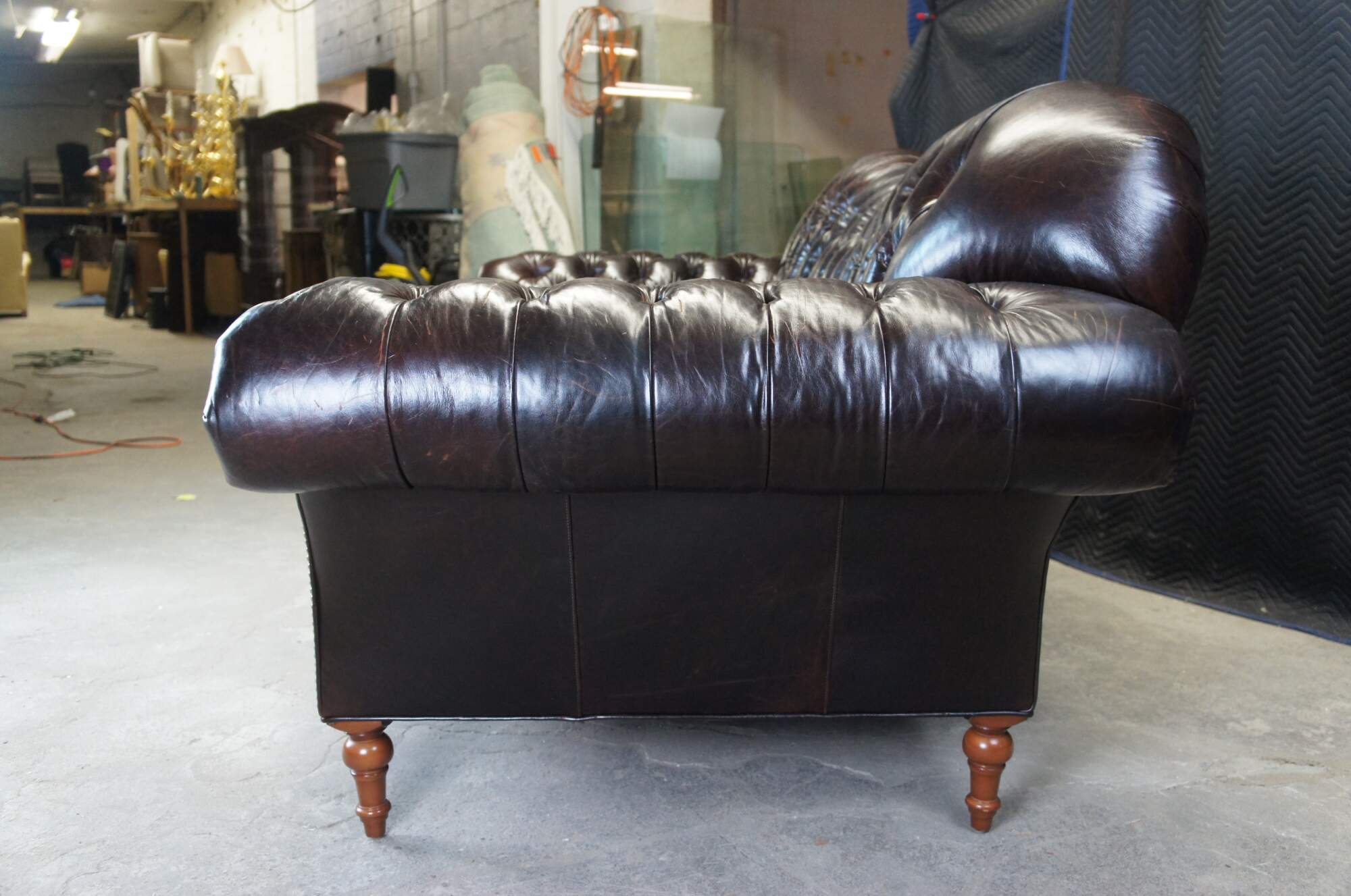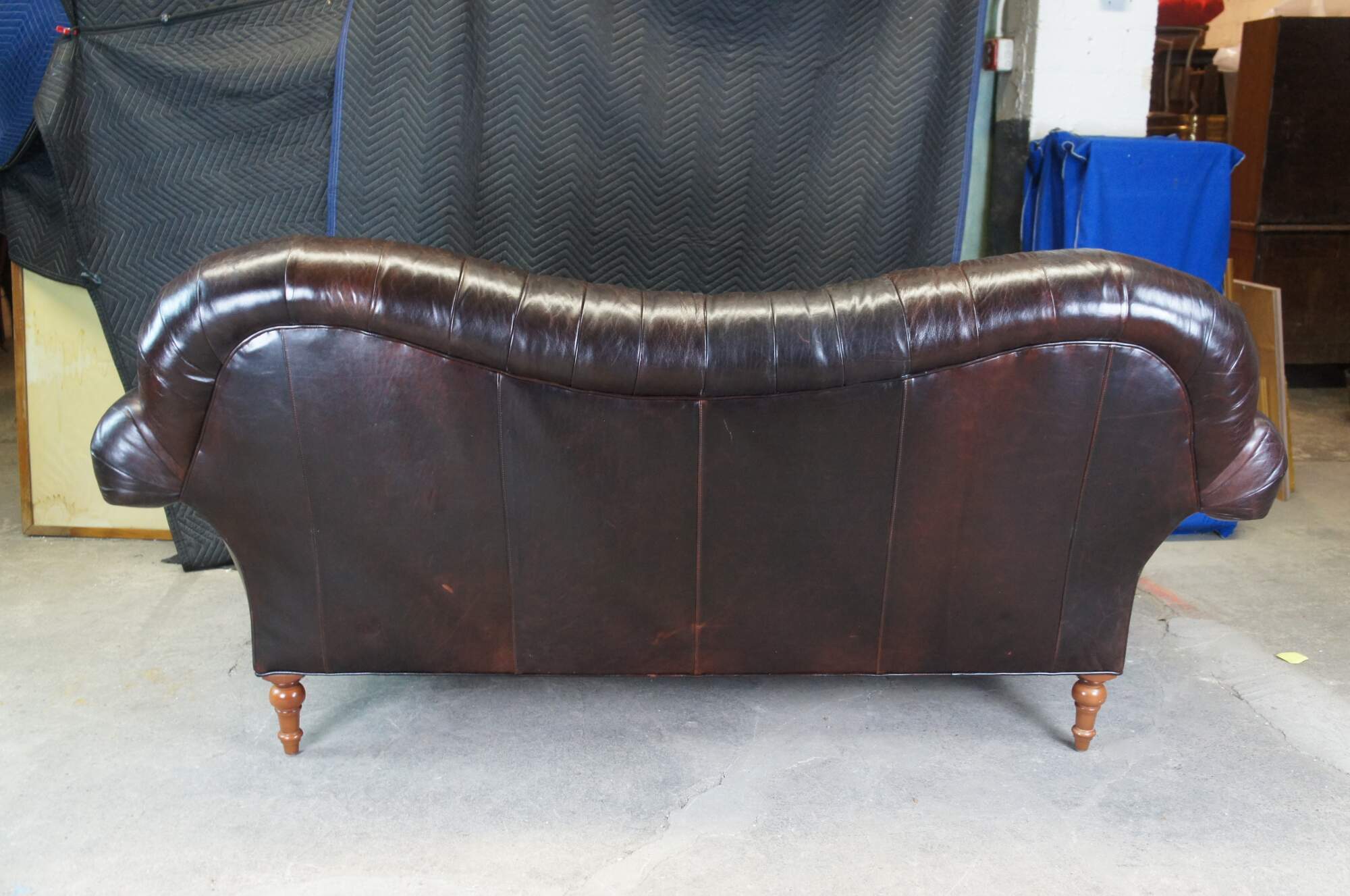 Vintage Arhaus Arabelle club fitted sofa, couch or love seat. Upholstered in a dark brown tufted leather featuring Chesterfield form with flared arms, a camelback and nailhead trim. The sofa is supported by maple turned feet.