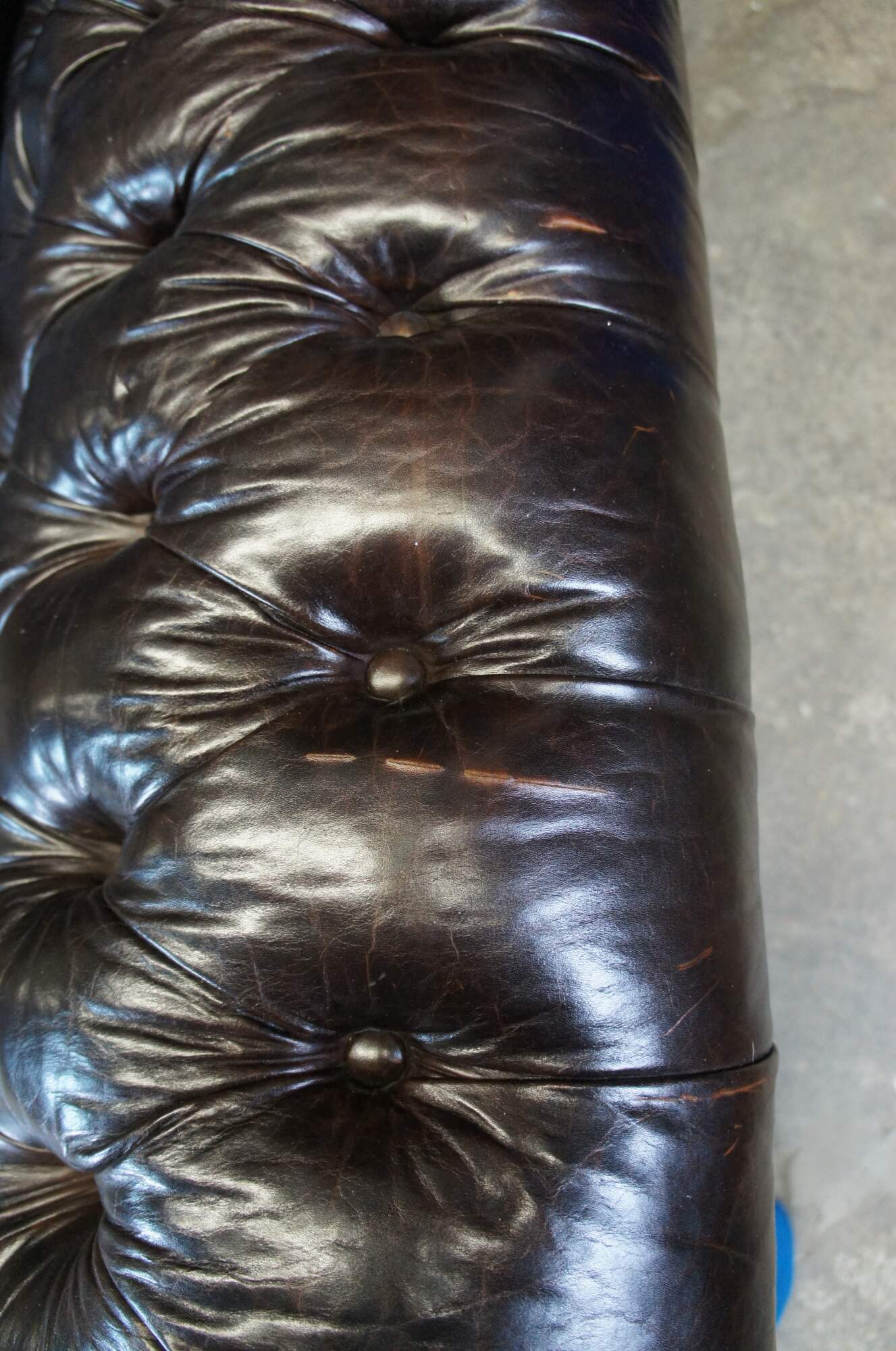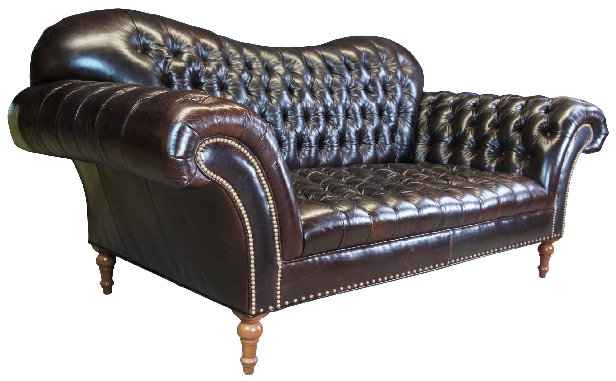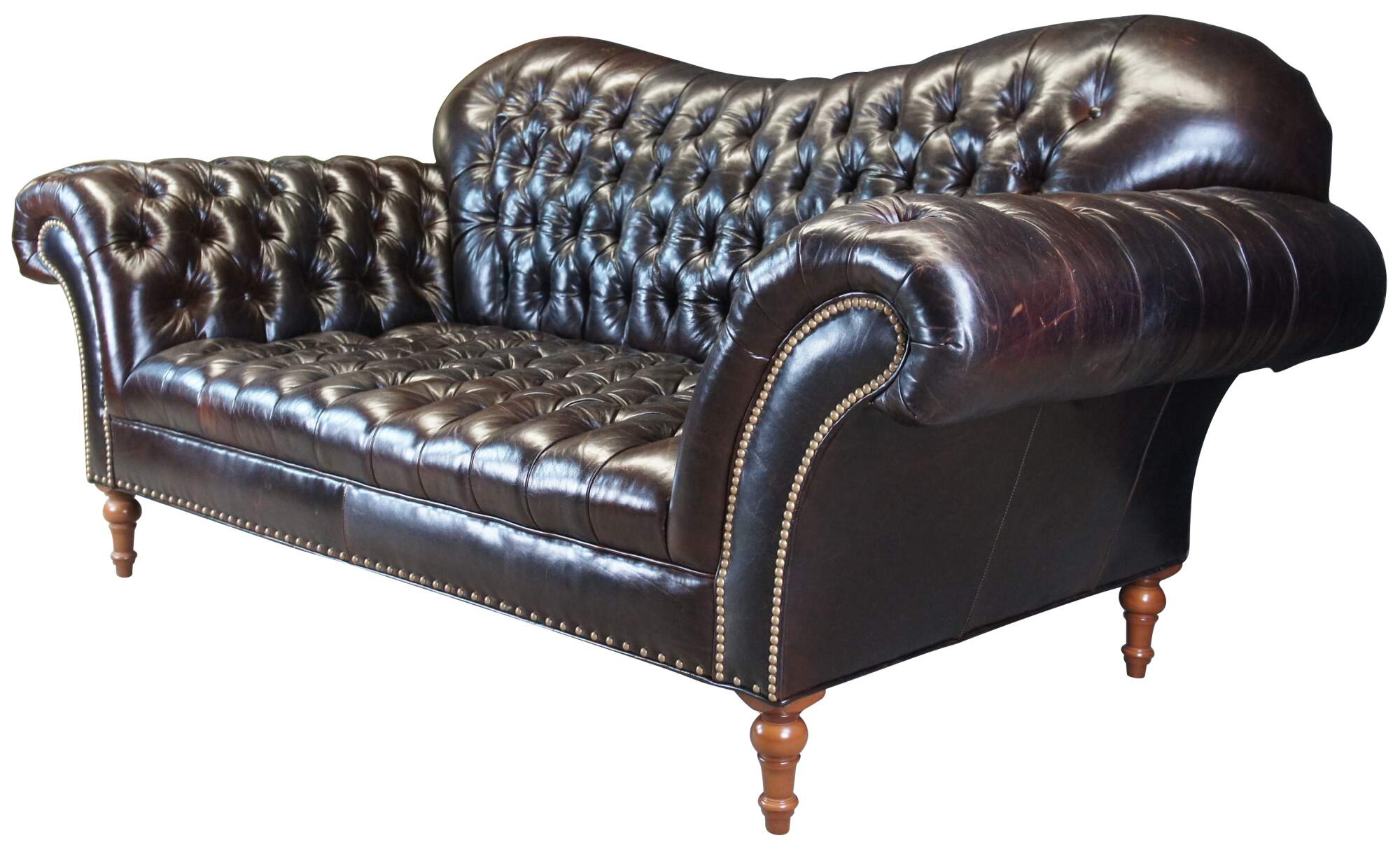 Vintage Arhaus Arabelle club fitted sofa, couch or love seat. Upholstered in a dark brown tufted leather featuring Chesterfield form with flared arms, a camelback and nailhead trim. The sofa is supported by maple turned feet.