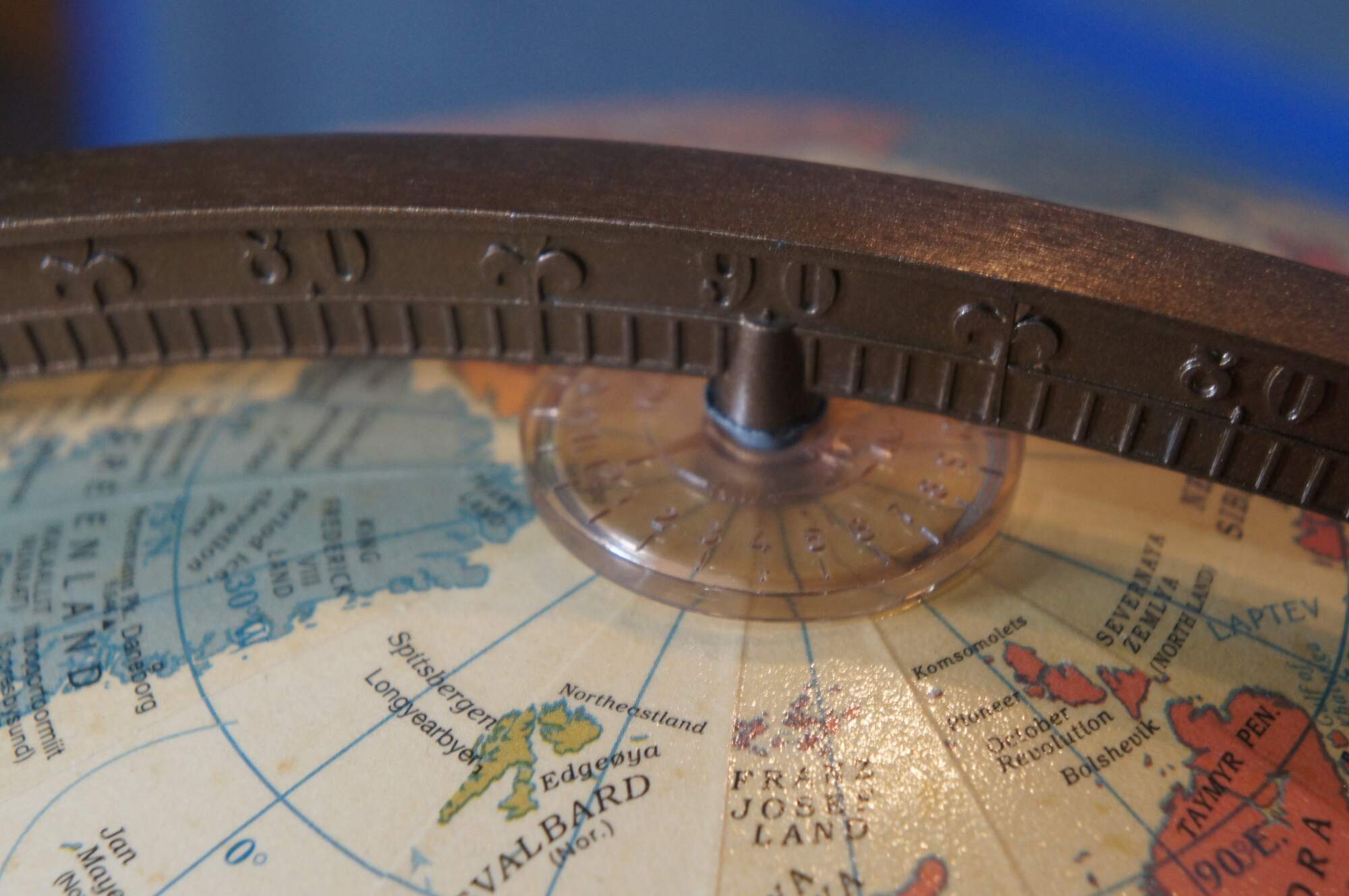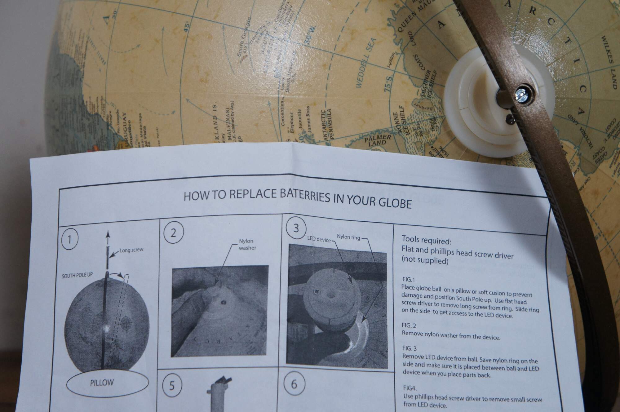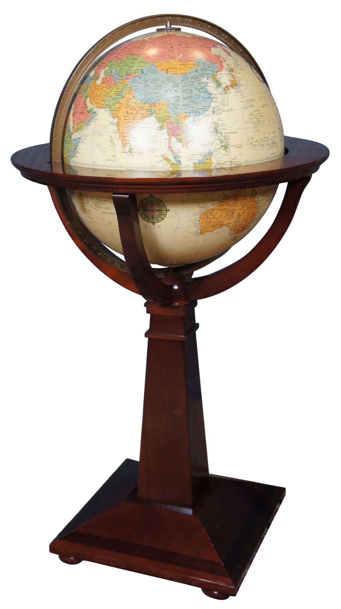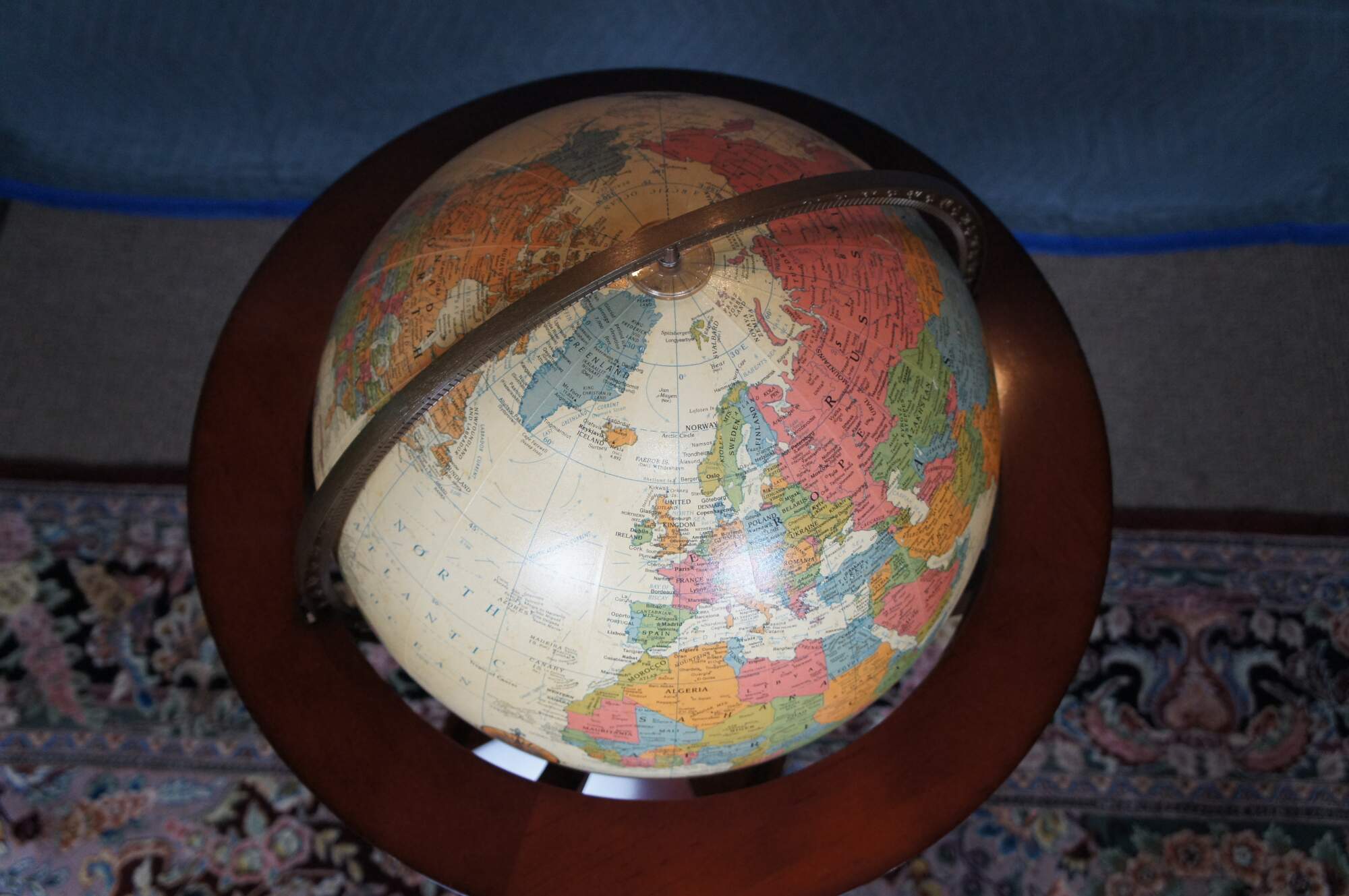Vintage Replogle 16” floor globe set in an elegant pedestal stand with brass meridian. Batteries can be inserted for illumination.
