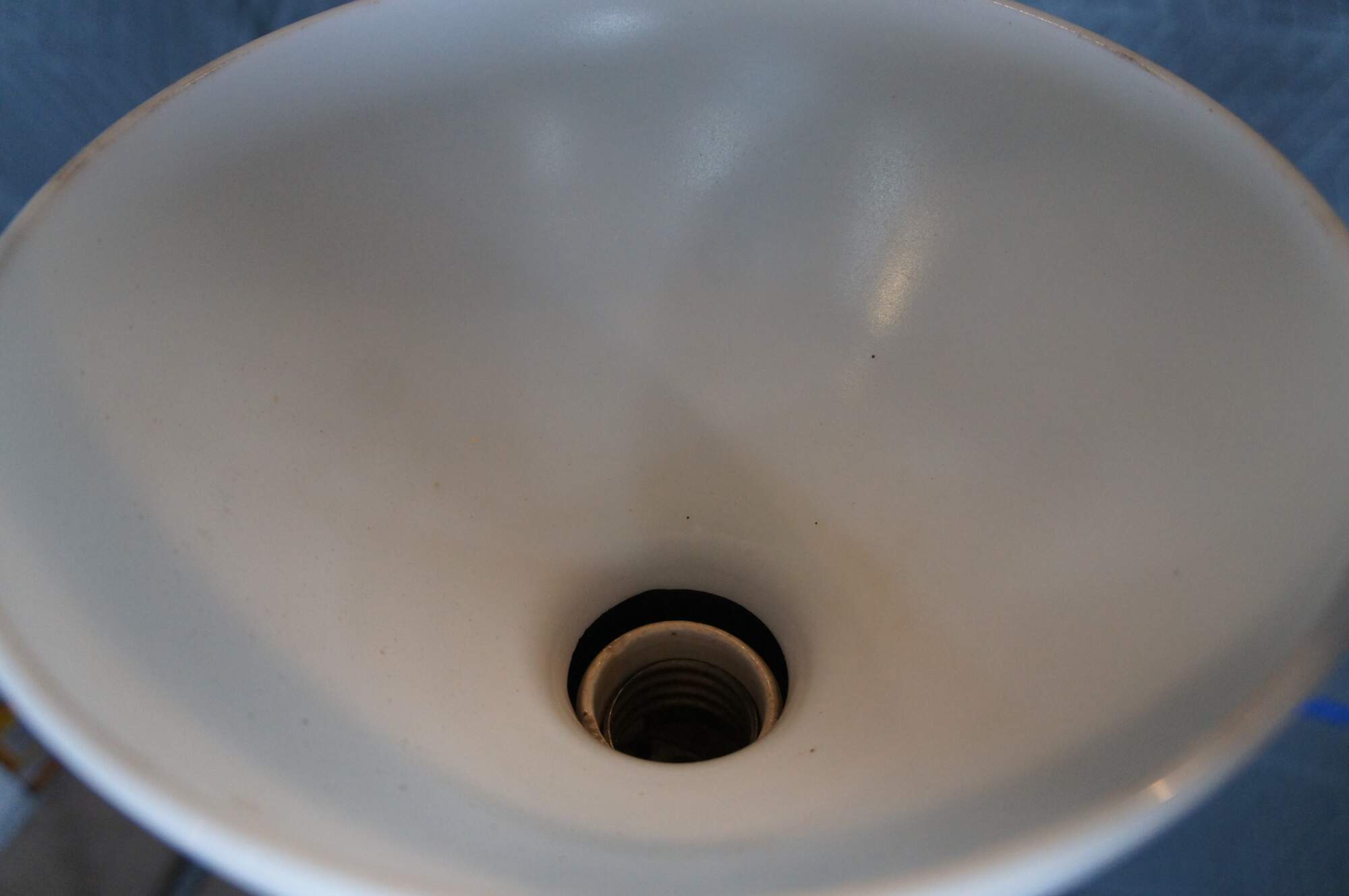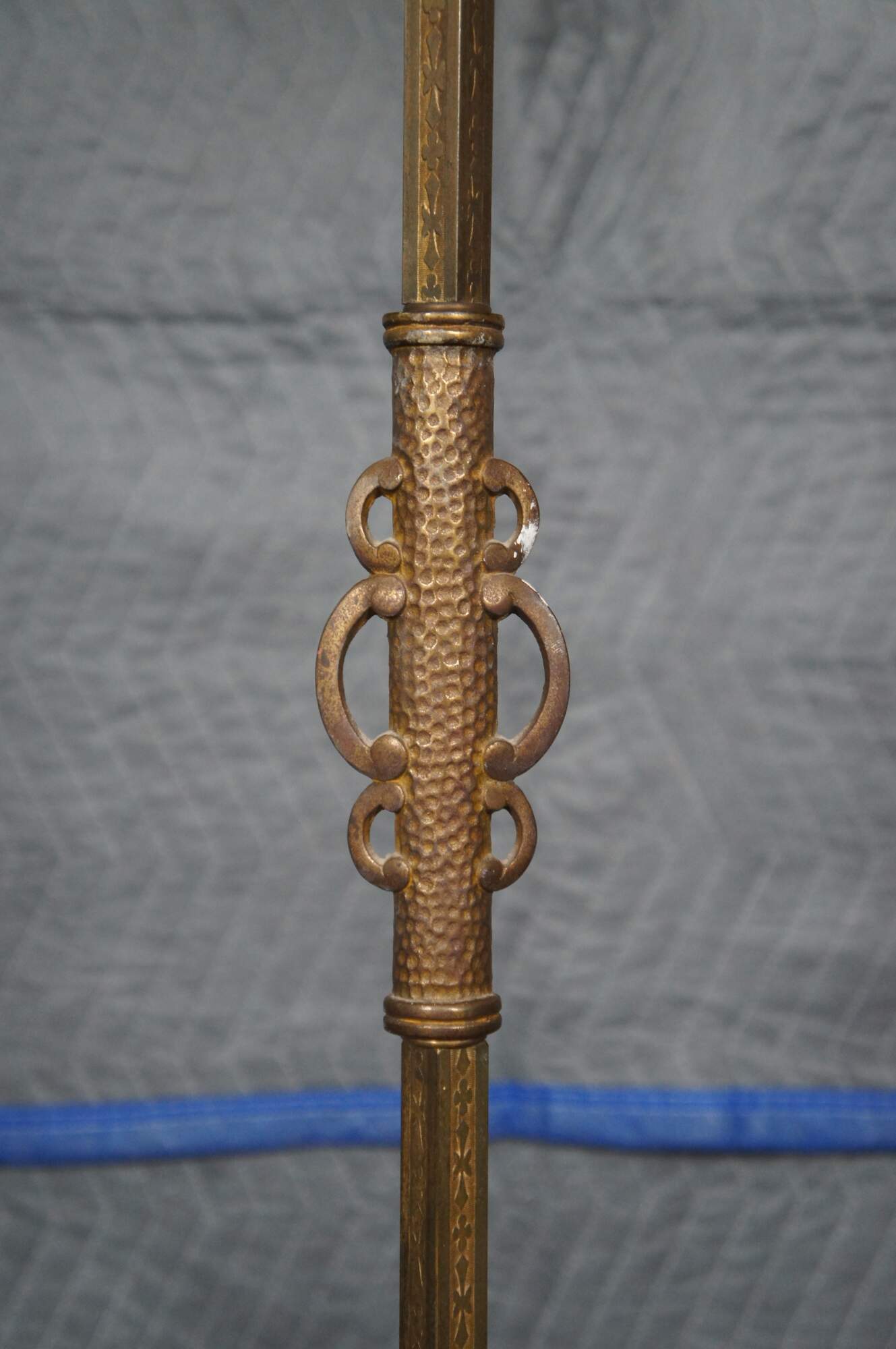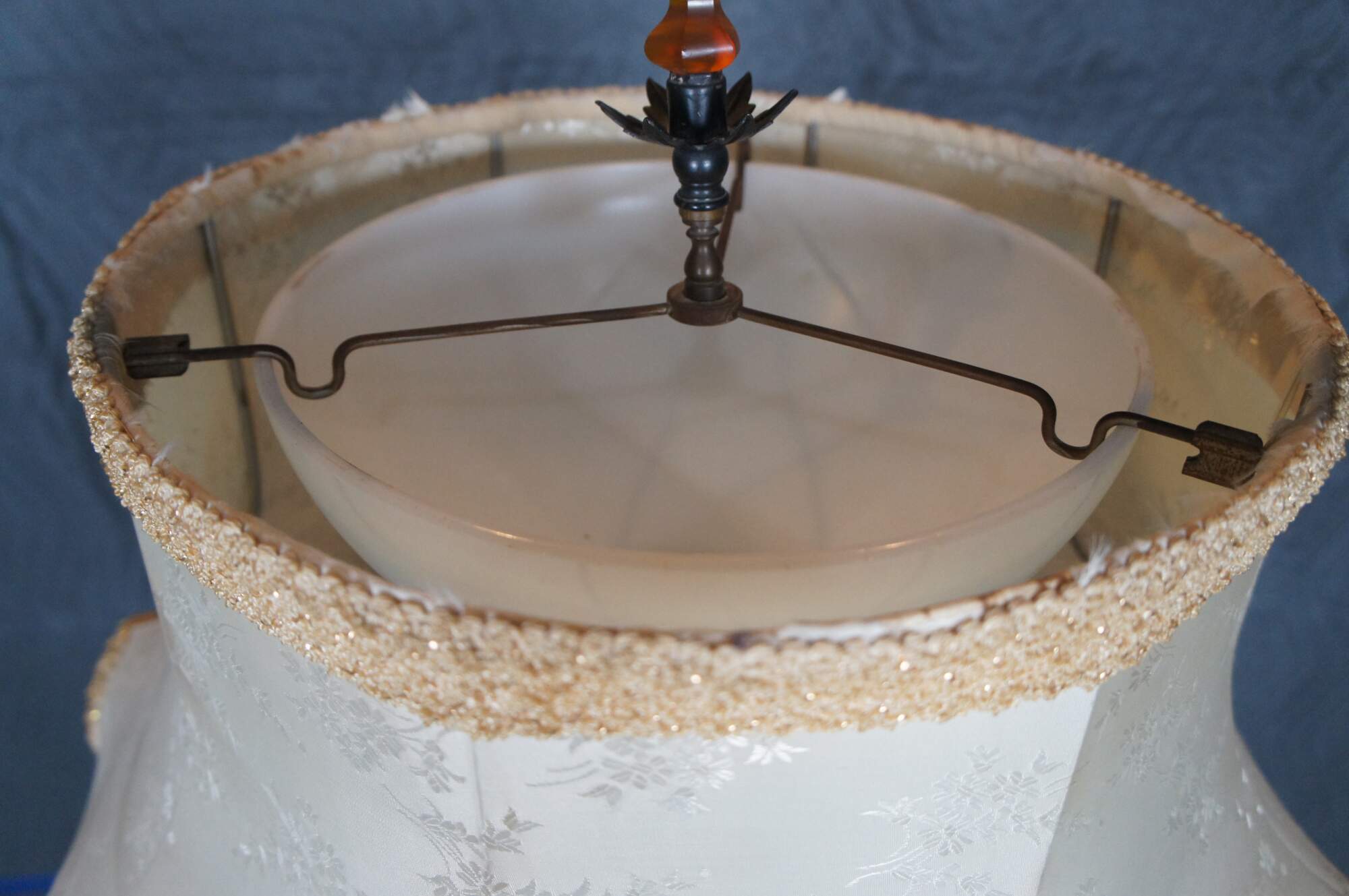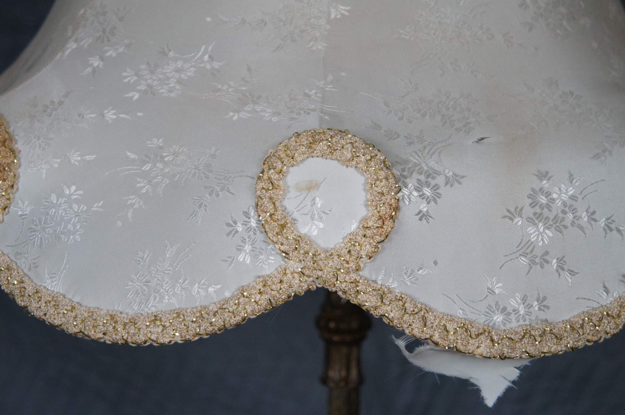 Good Antique Condition - some tarnish/oxidation/paint spots; a few small stains/holes in shade; edges of silk fraying in some places, damaged cord / needs rewiring, can have rewired for $50.