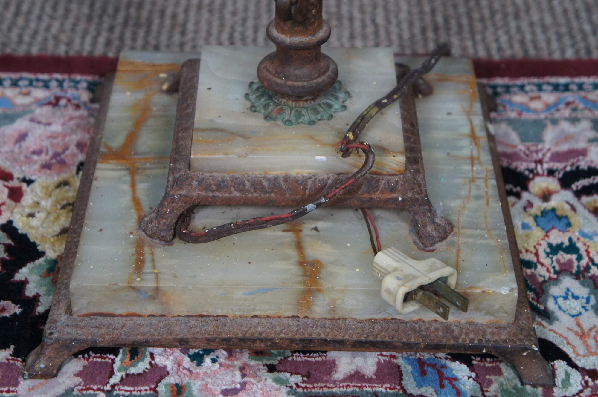 Late 19th-early 20th century large floor lamp with an iron and white marble base, brass body with candelabra sockets for three candle shaped bulbs and main torchiere style top with milk glass shade, all topped with a scalloped silk shade with amber colored finial.