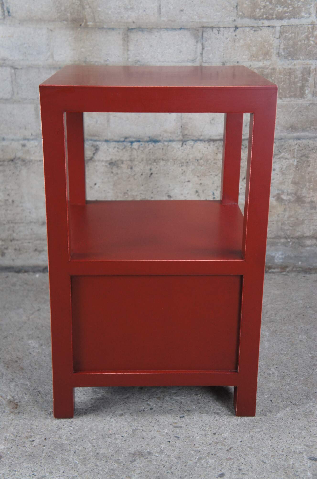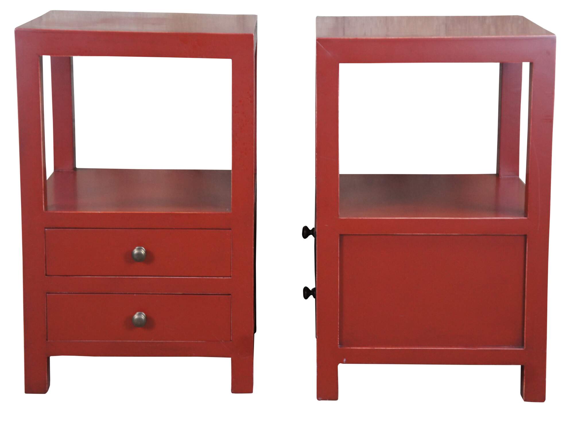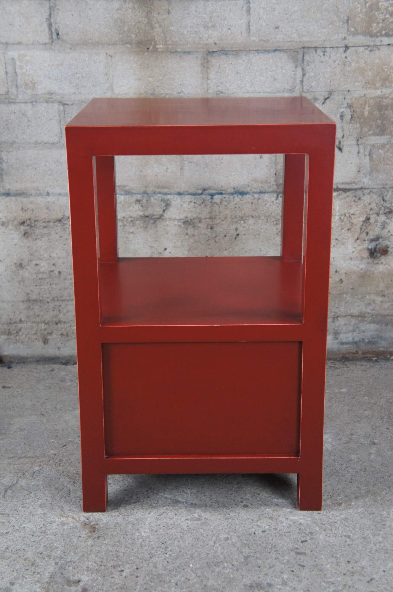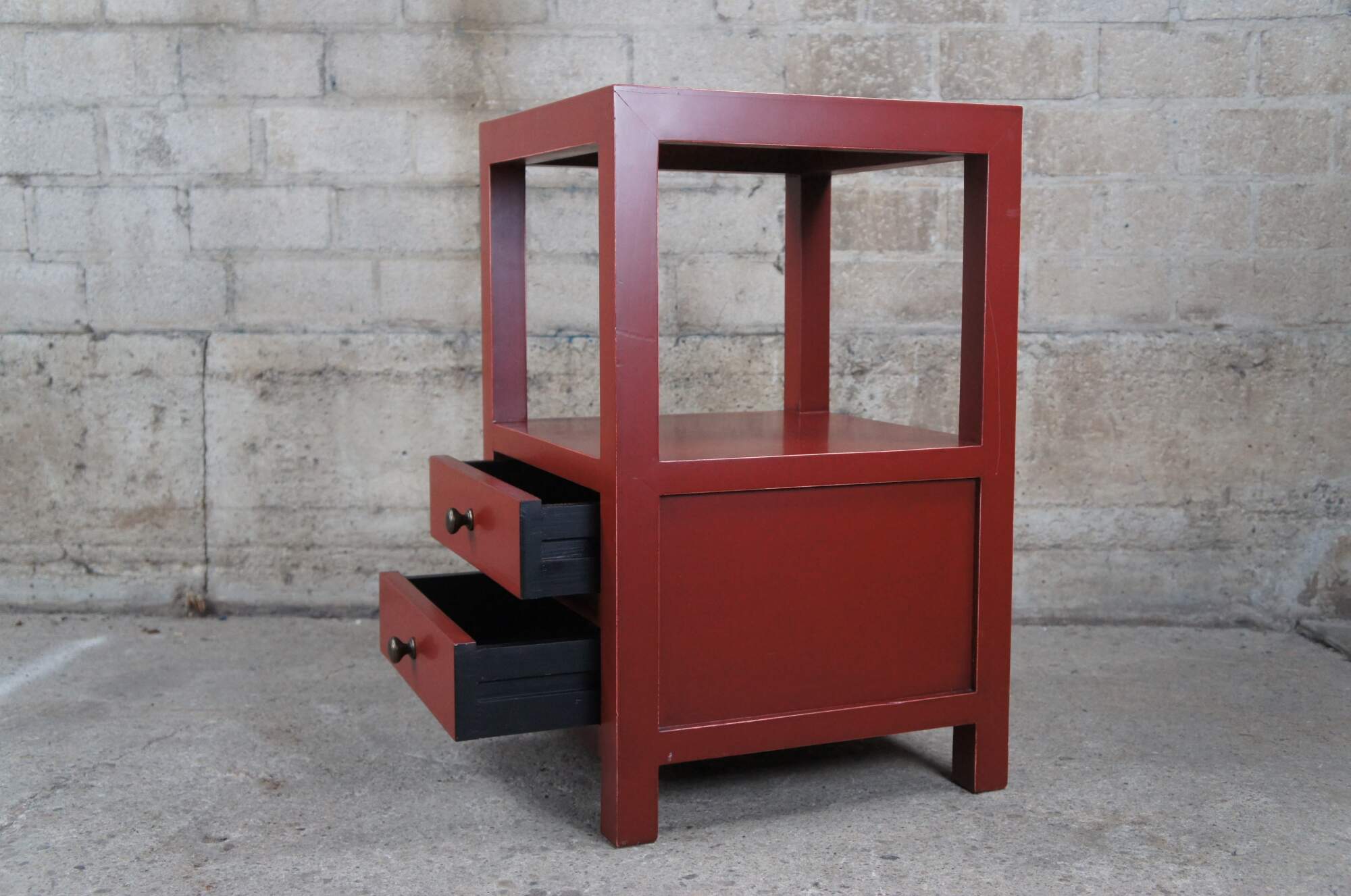 Two vintage red lacquer side tables or nightstands featuring modern Chinoiserie styling with square / cube form, tiered central opening and two lower drawers.