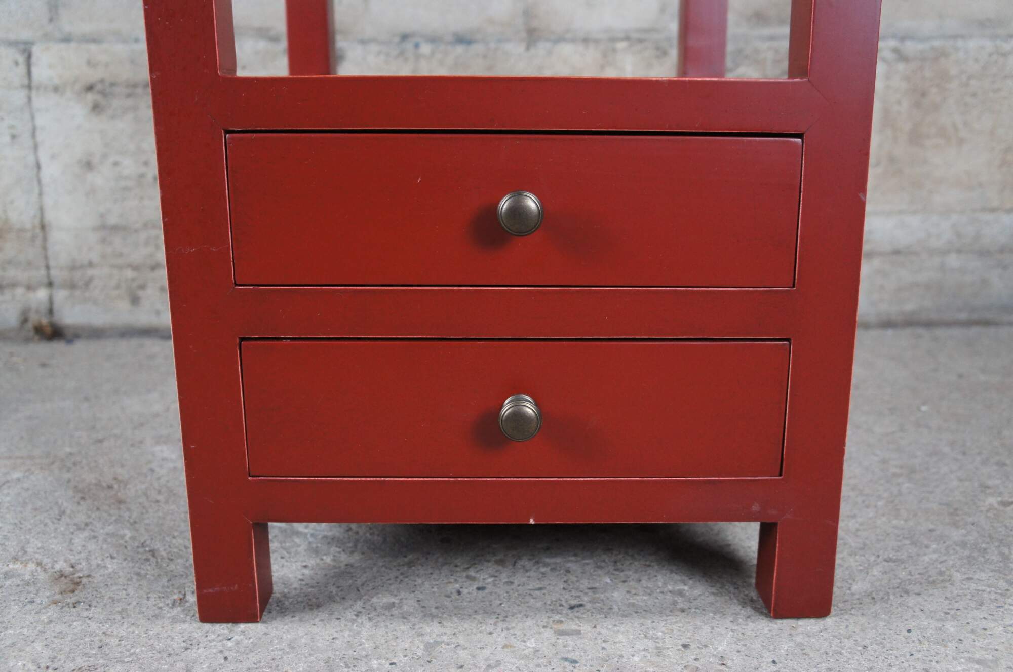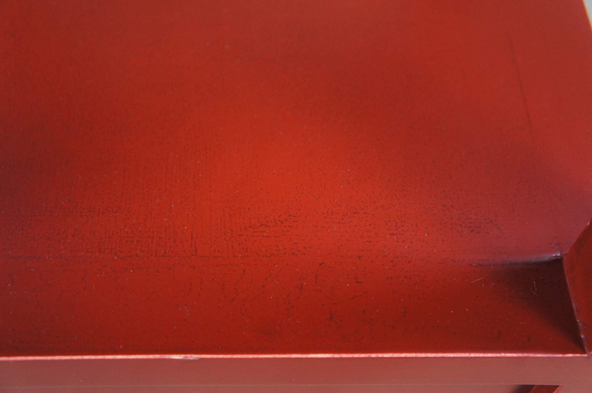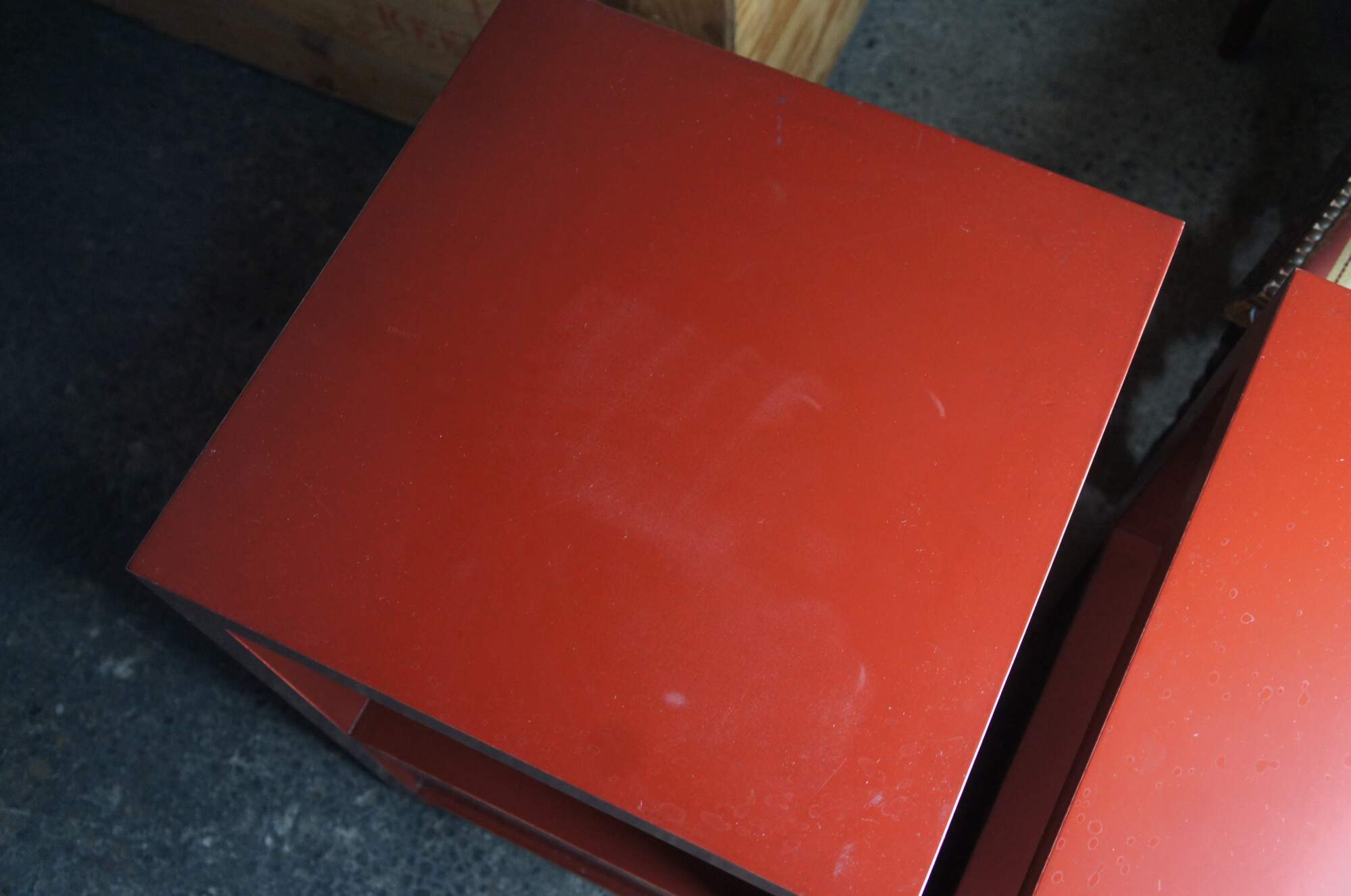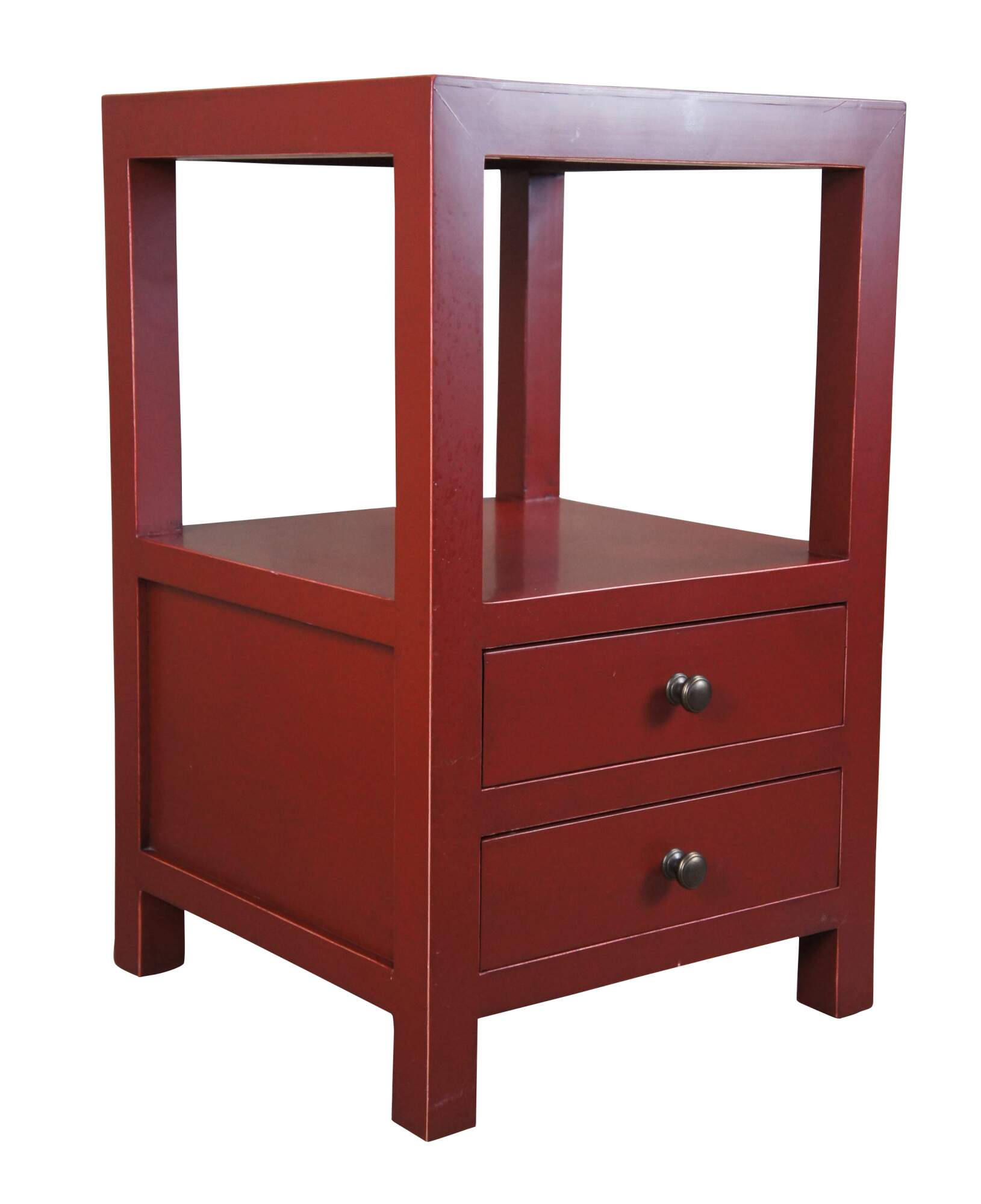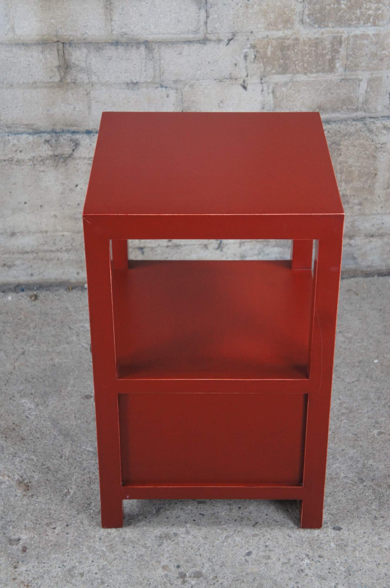 Two vintage red lacquer side tables or nightstands featuring modern Chinoiserie styling with square / cube form, tiered central opening and two lower drawers.