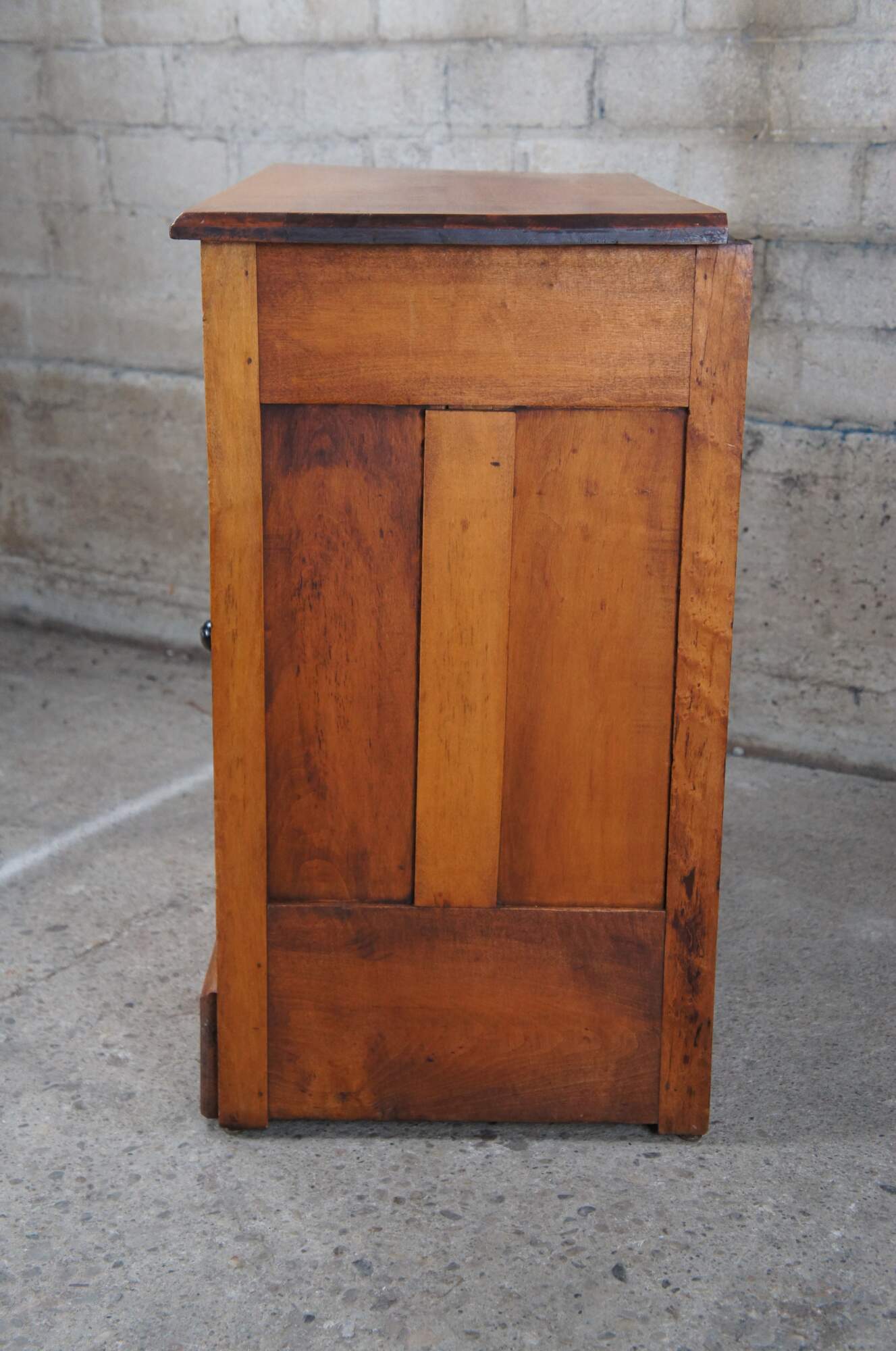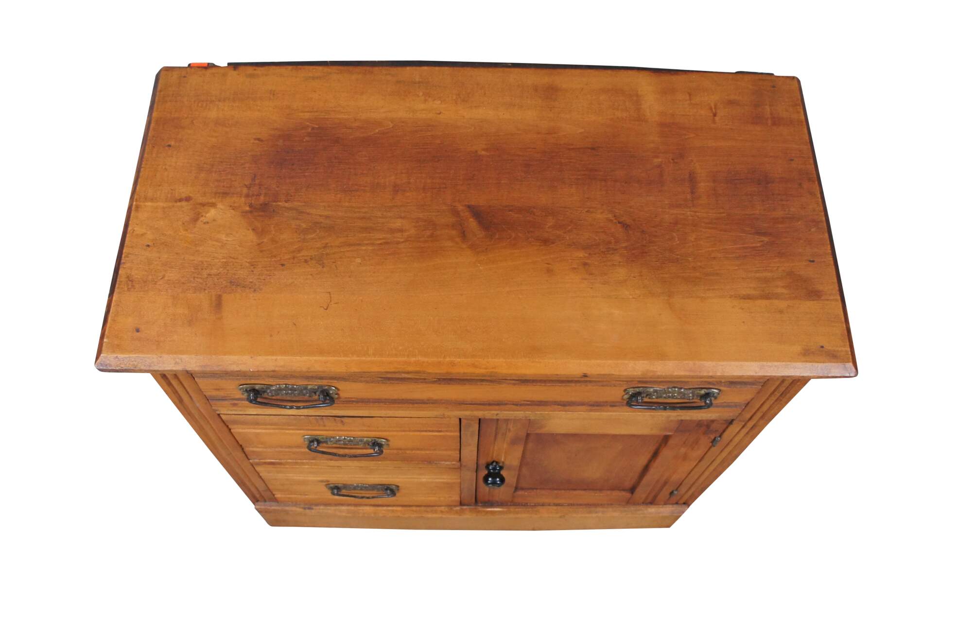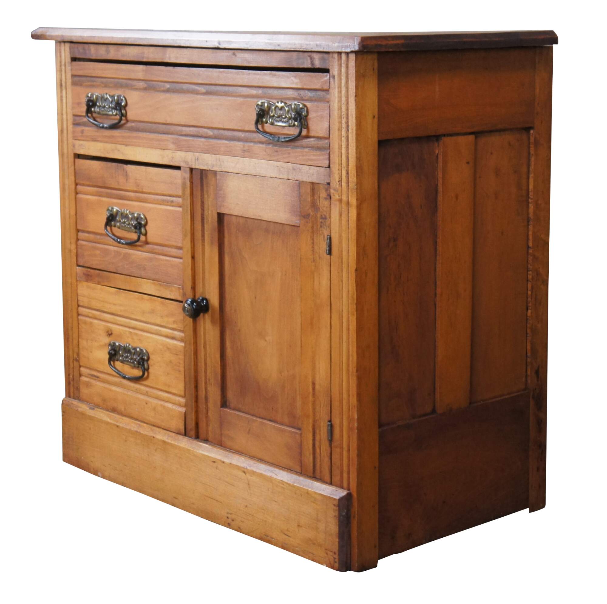 Turn of the century oak washstand featuring three drawers with side cabinet and brass hardware.