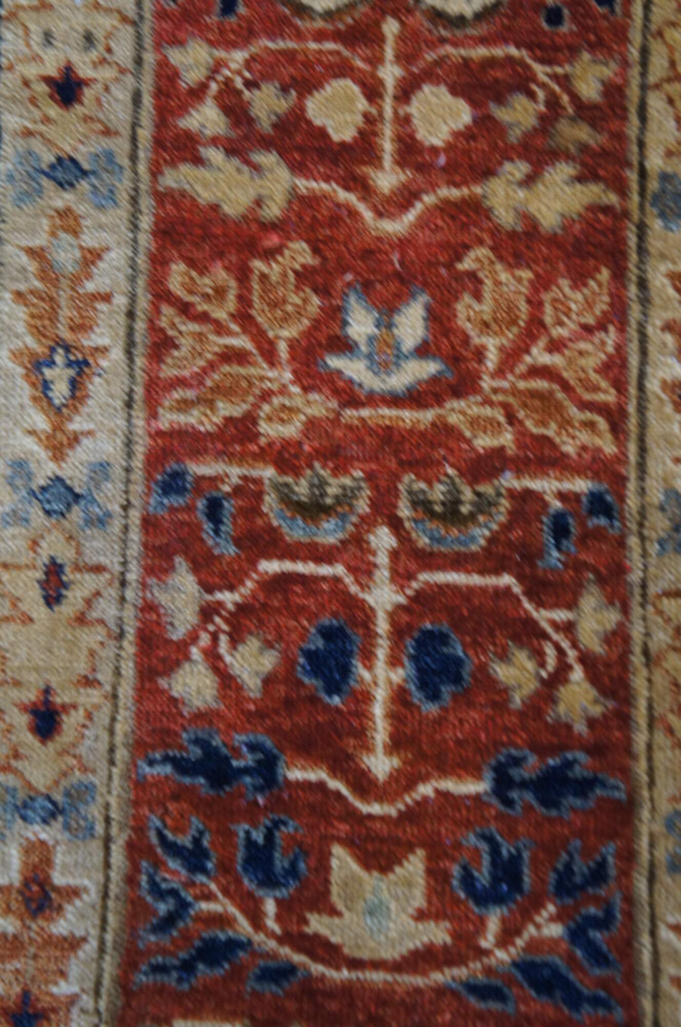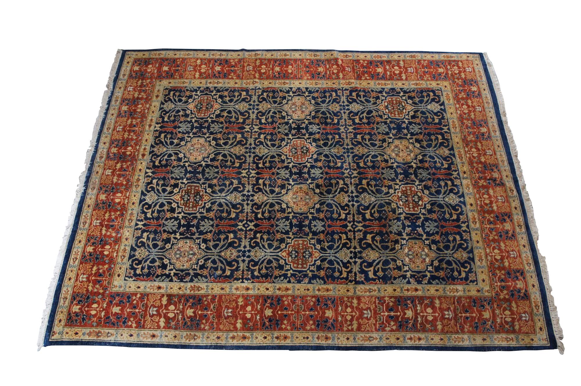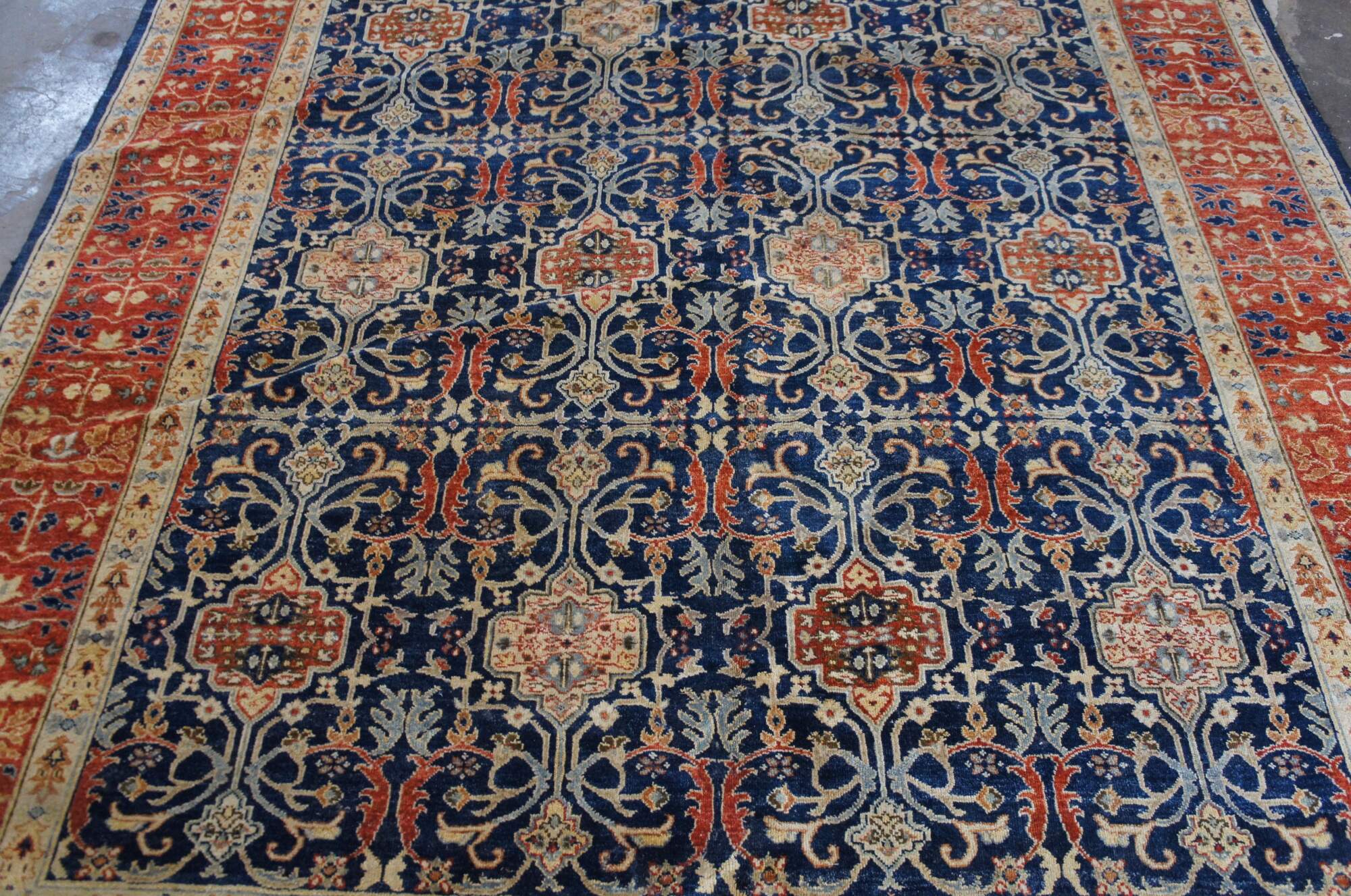 A nice medium sized hand knotted oriental area rug or carpet. Features a blue and red foreground with geometric foliate and filigree motifs.
