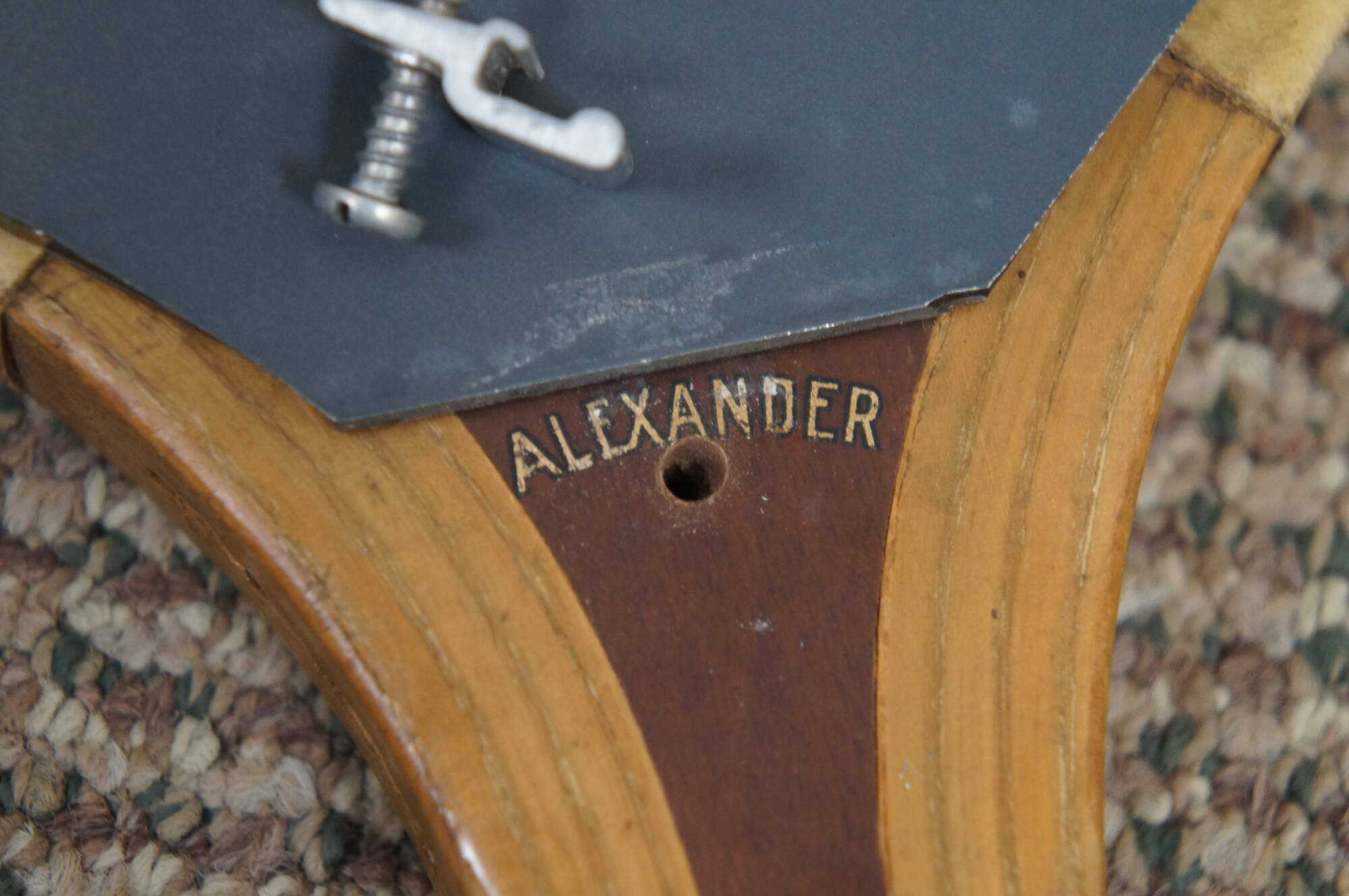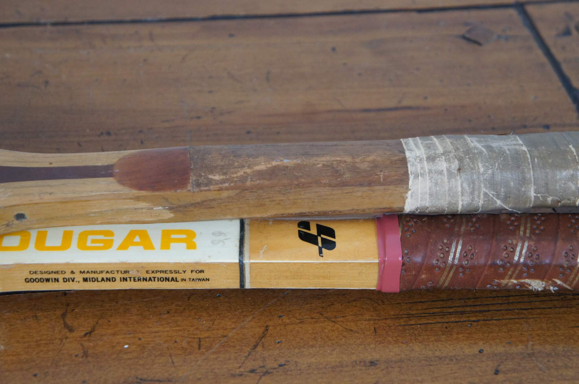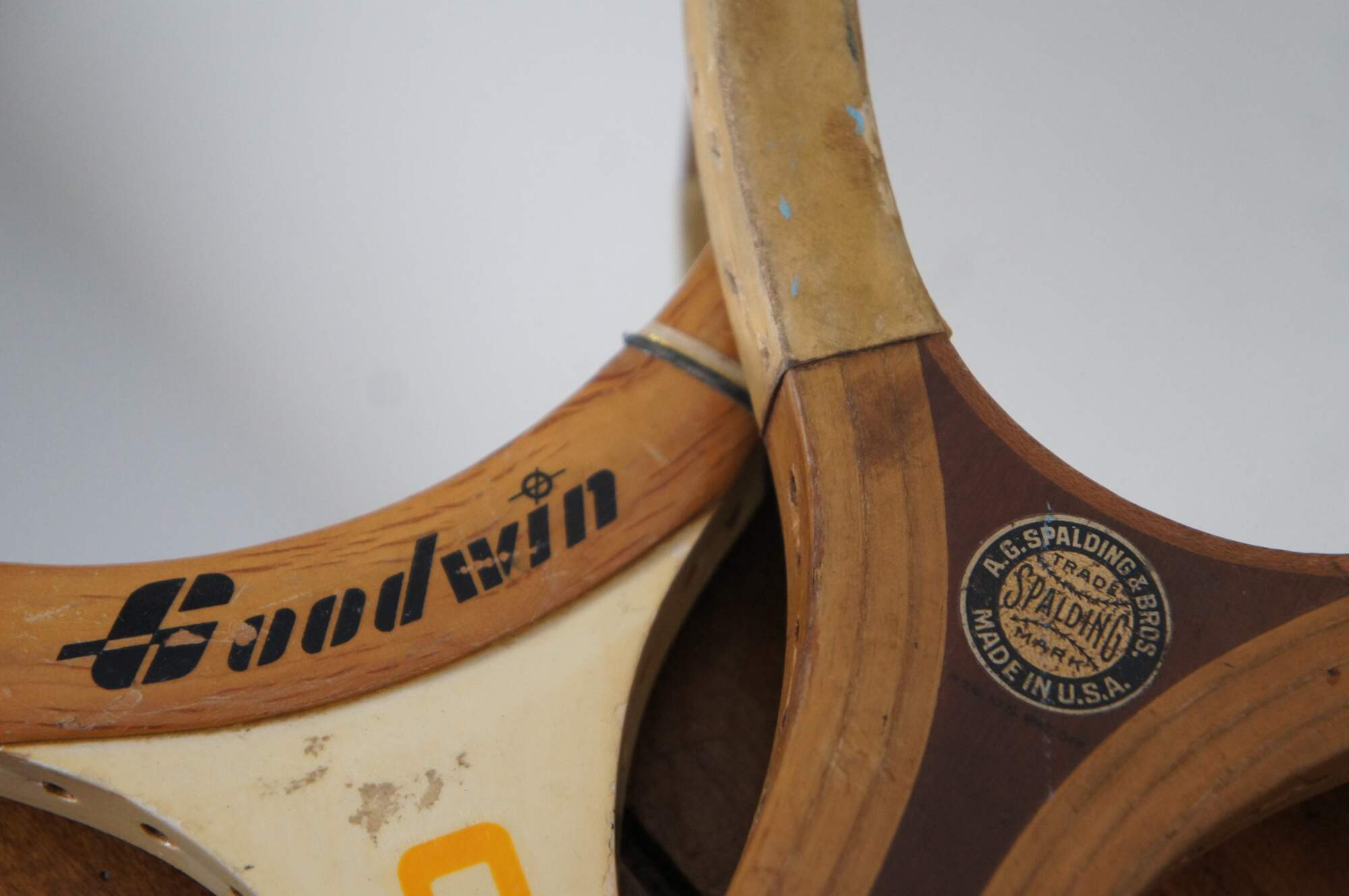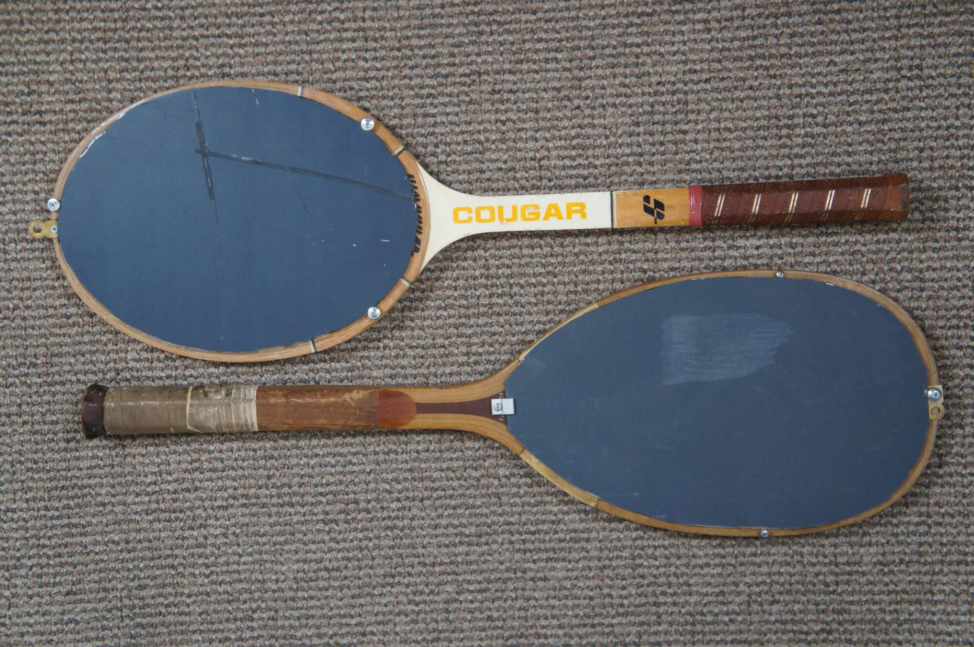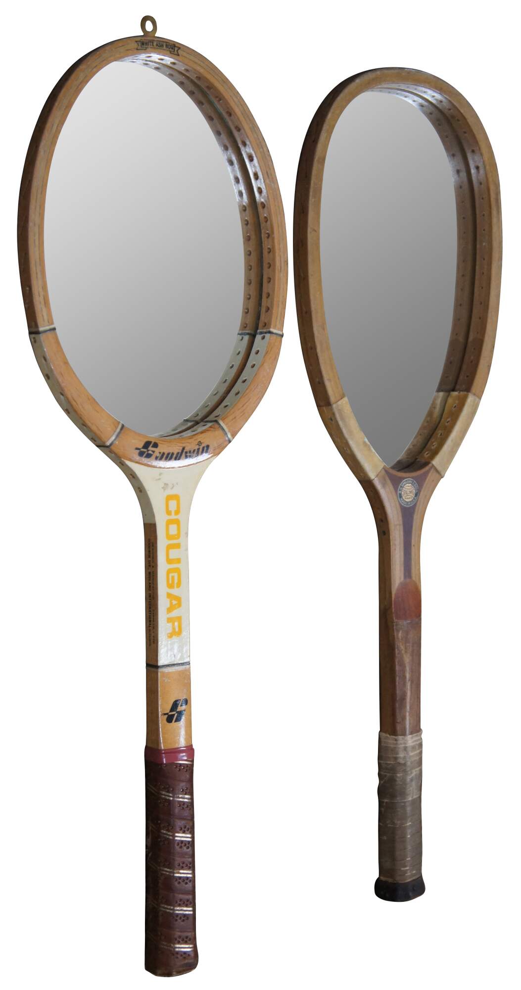 Pair of wall mirrors upcycled from vintage tennis rackets, one Goodwin Cougar and the other Spaulding & Bros Alexander.
