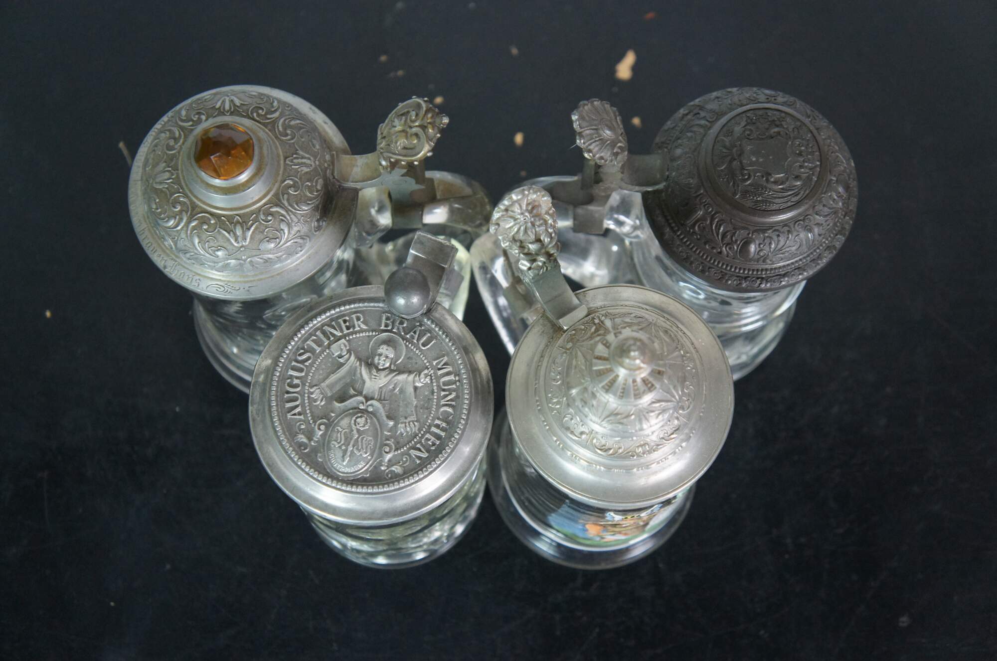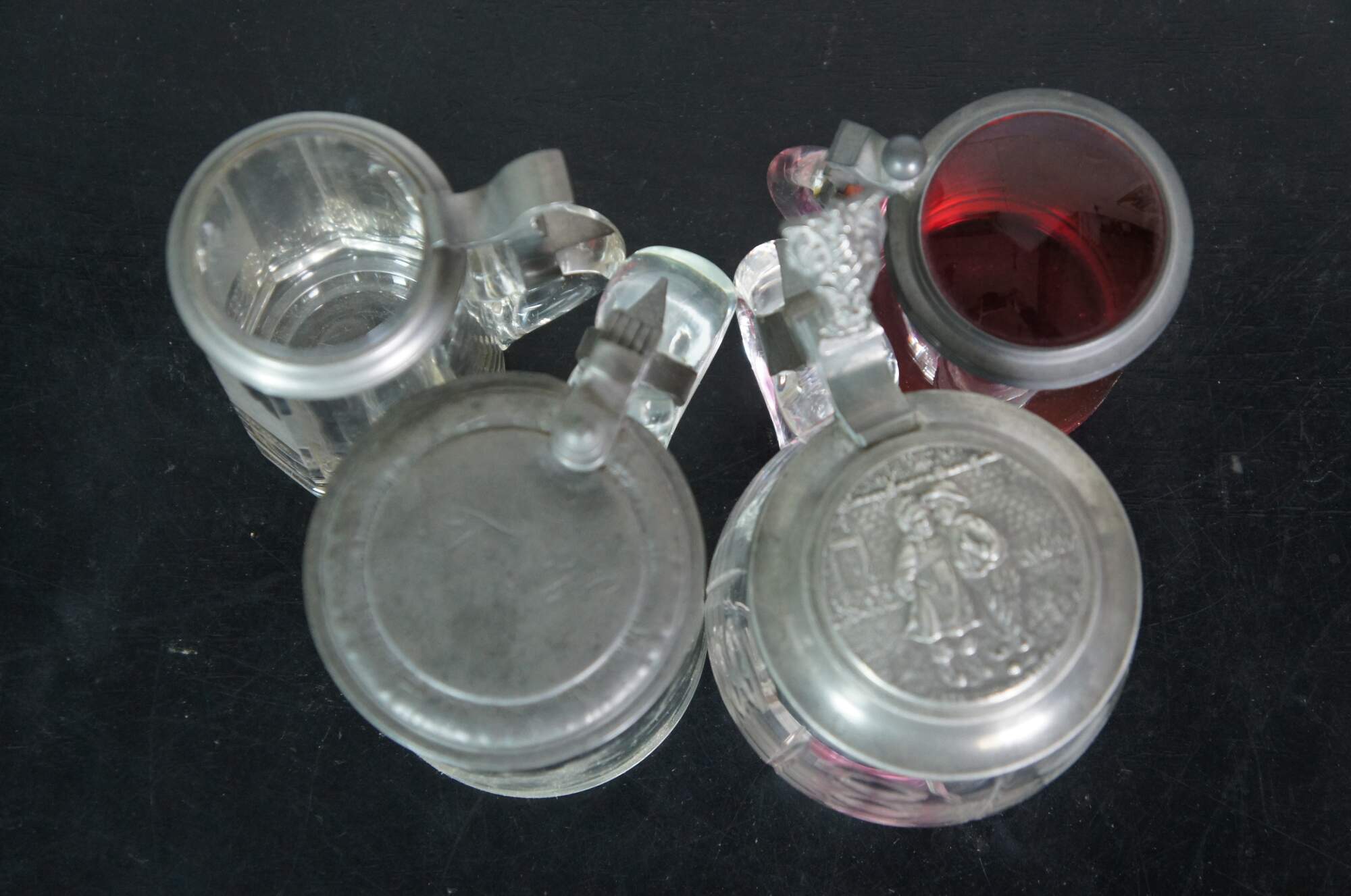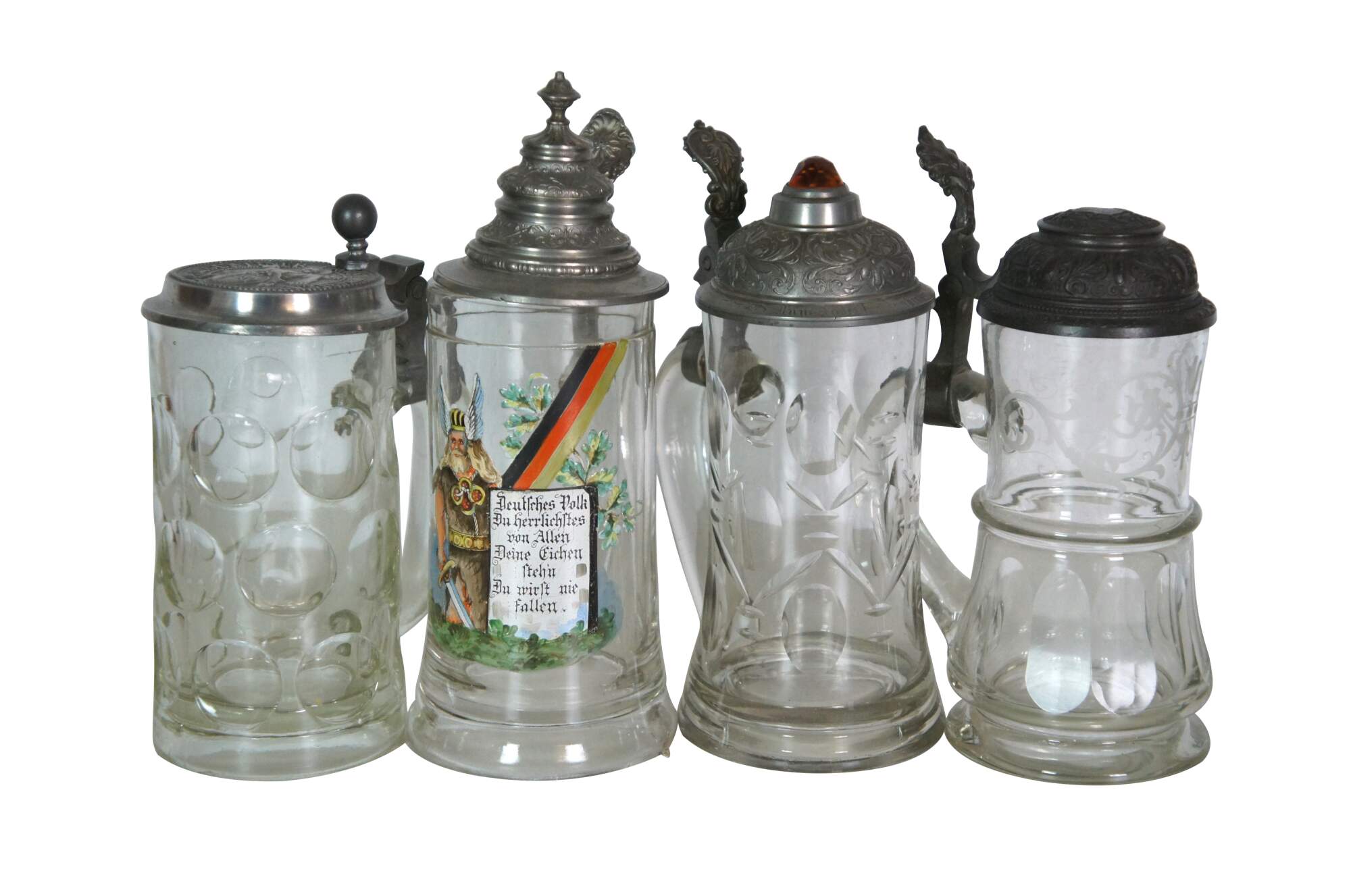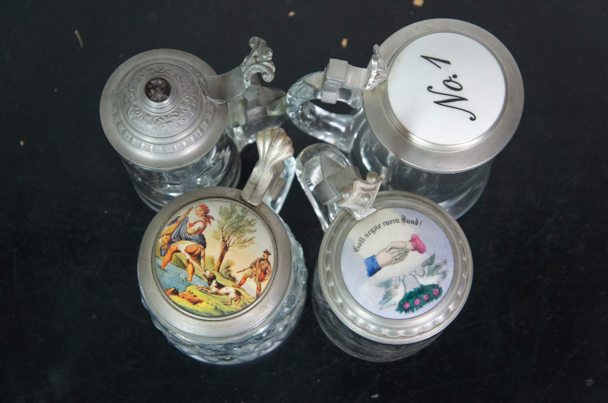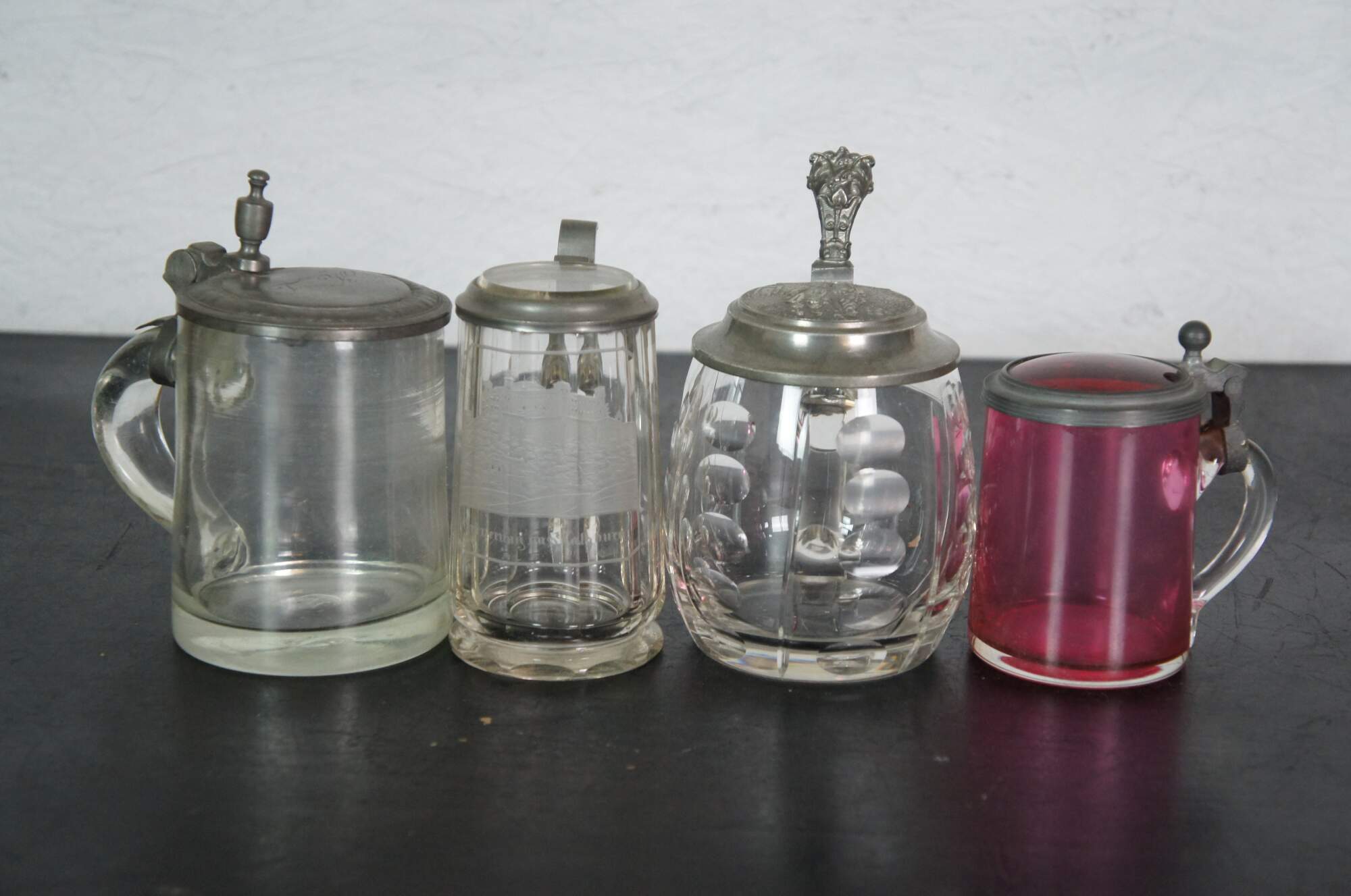 Lot of 19 rare early 20th century antique German cut / etched / faceted glass beer bar steins with metal / pewter flip top lids. Thumbprint, bubble glass, cut, and etched. Lids with painted / enameled glass or rhinestone finials - 8. Lids with painted scenes / ceramic inlays on lids - 4. Repousse floral / plain metal lids - 7. Smallest mug is a pink bohemian glass.