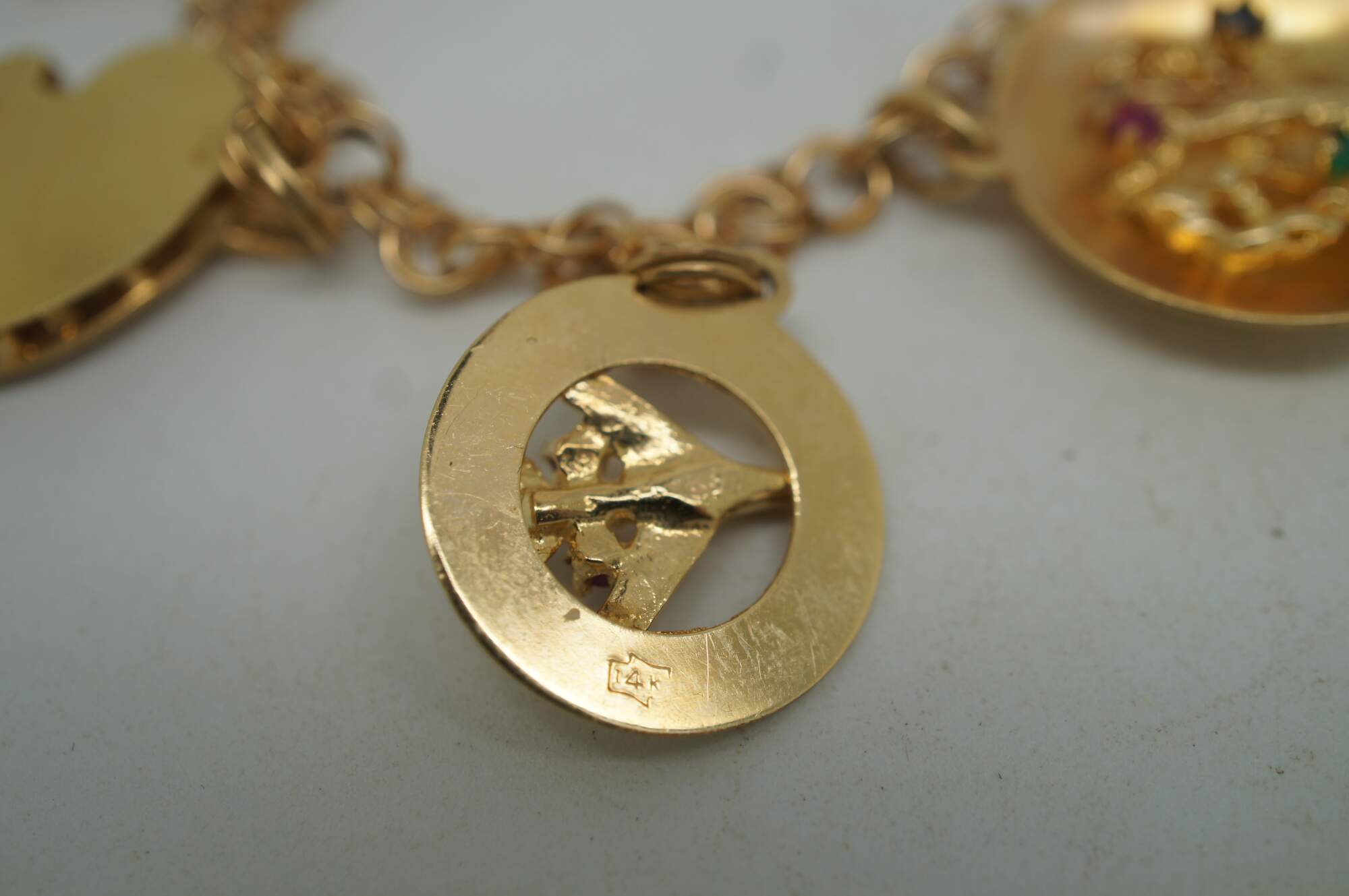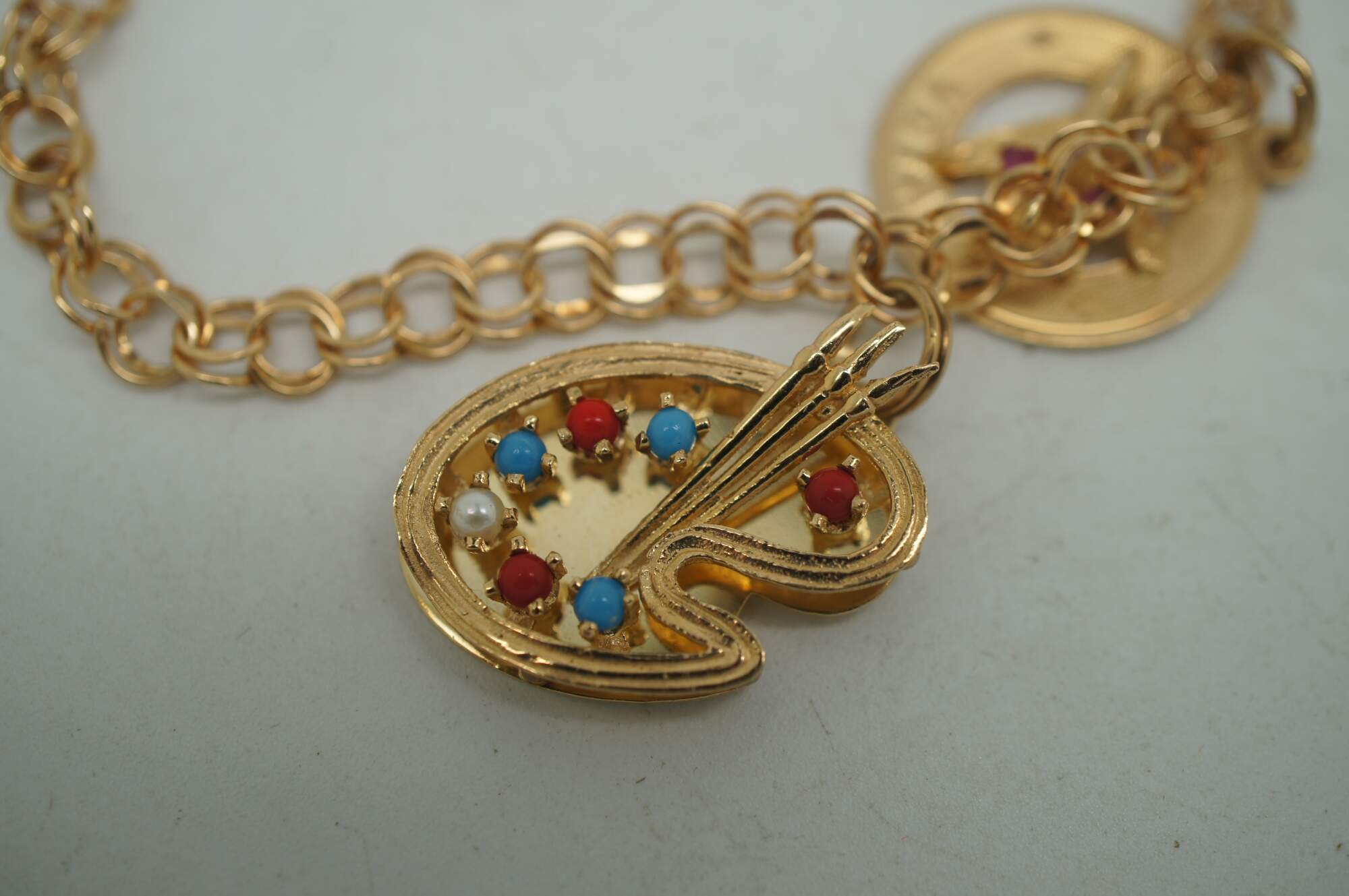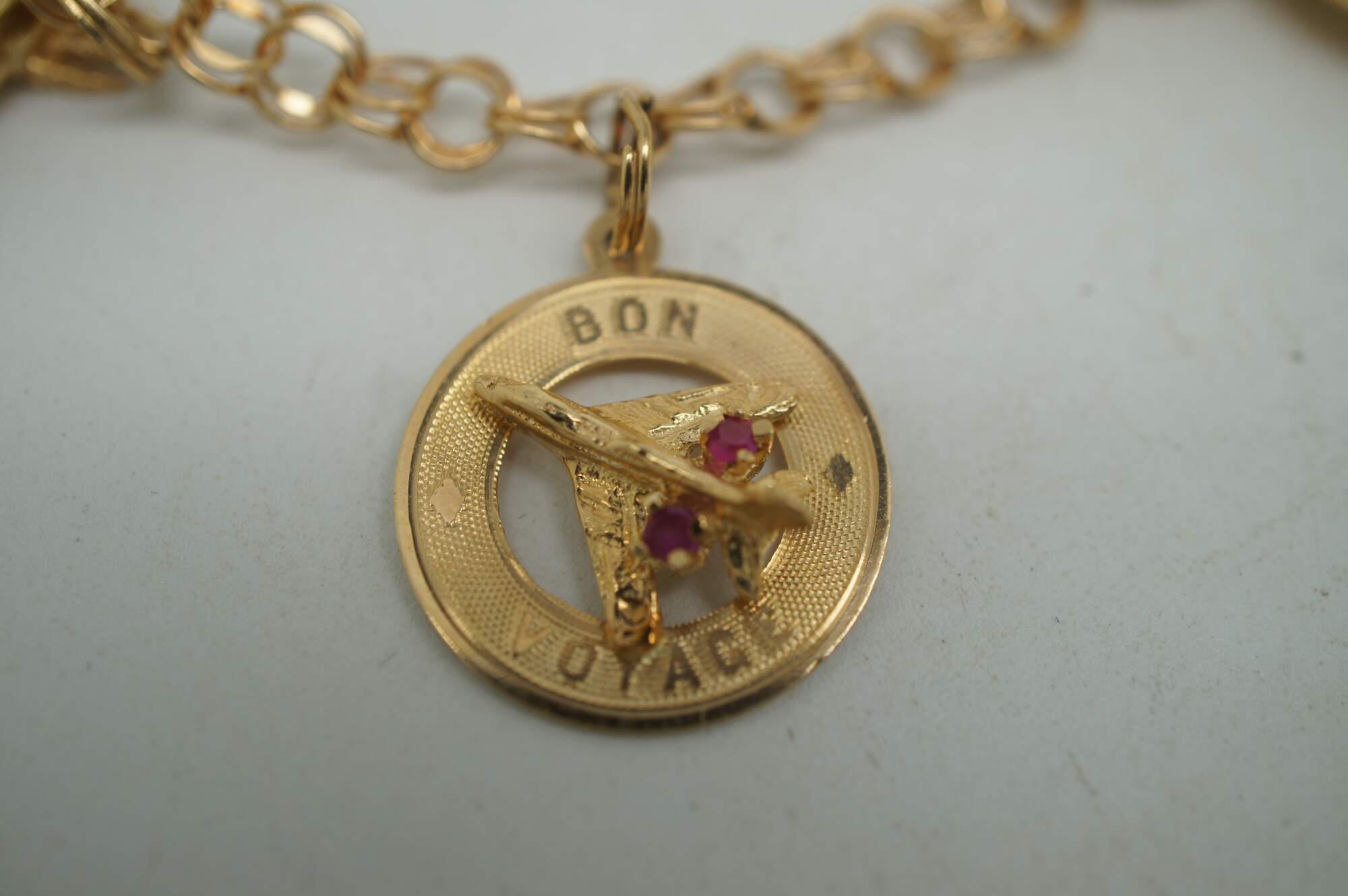 Vintage 14k yellow gold double link charm bracelet with open box clasp. The gold and jeweled charms include a paint palette with coral, turquoise and a pearl, a tree of life with emerald, ruby and sapphire, and a Bon Voyage jet airplane / plane with two rubies.