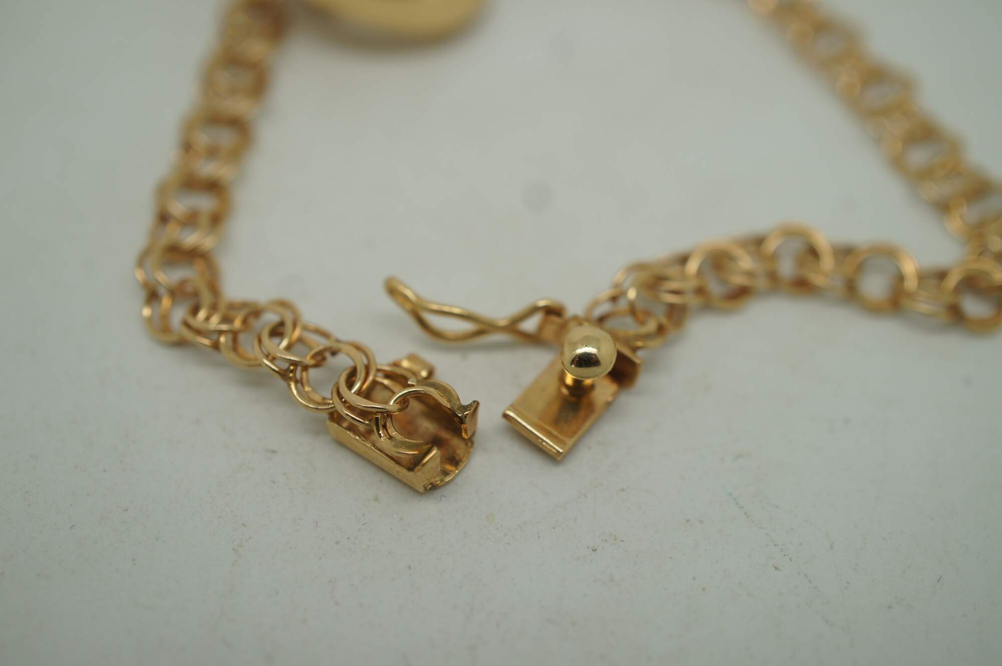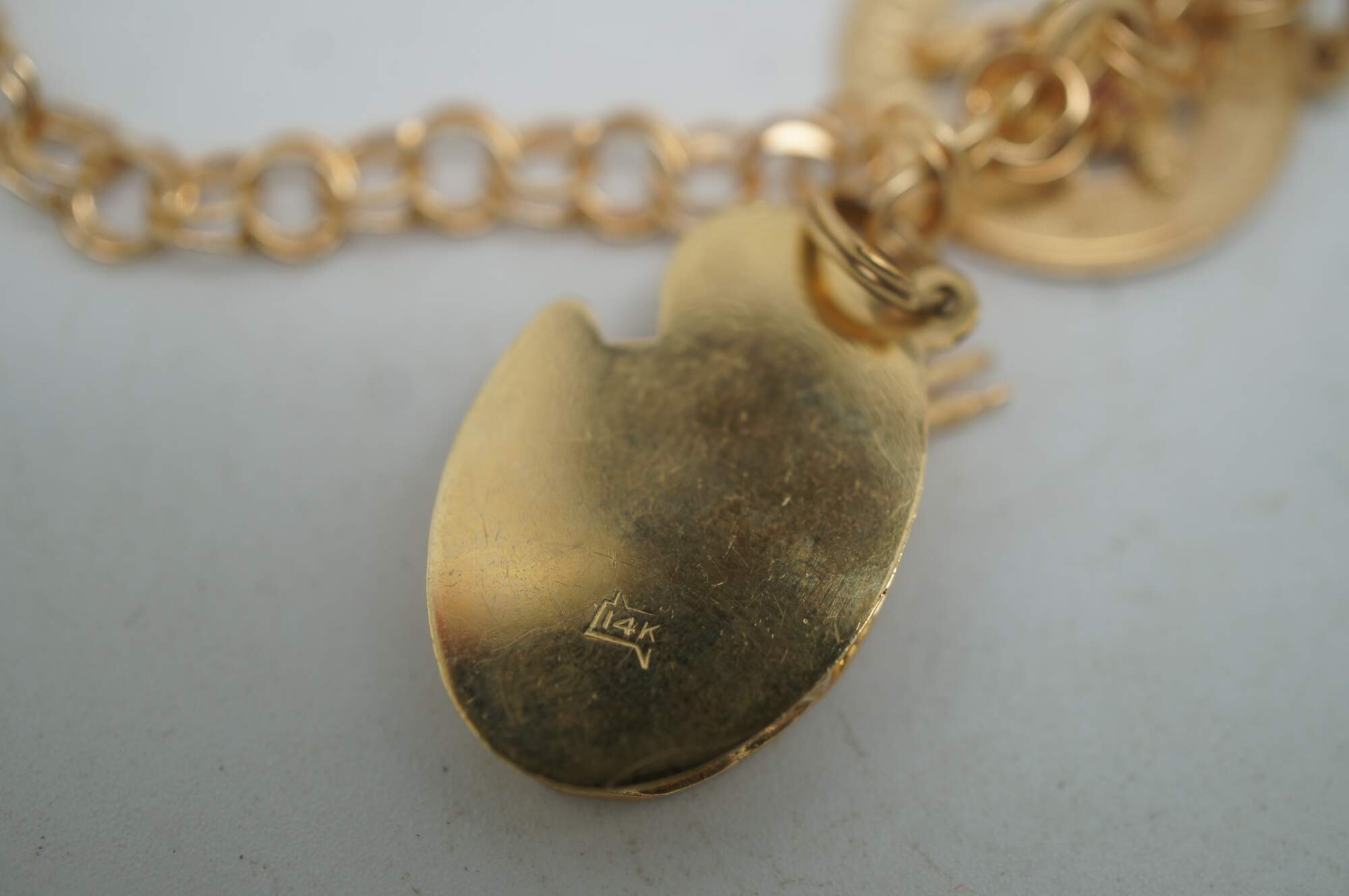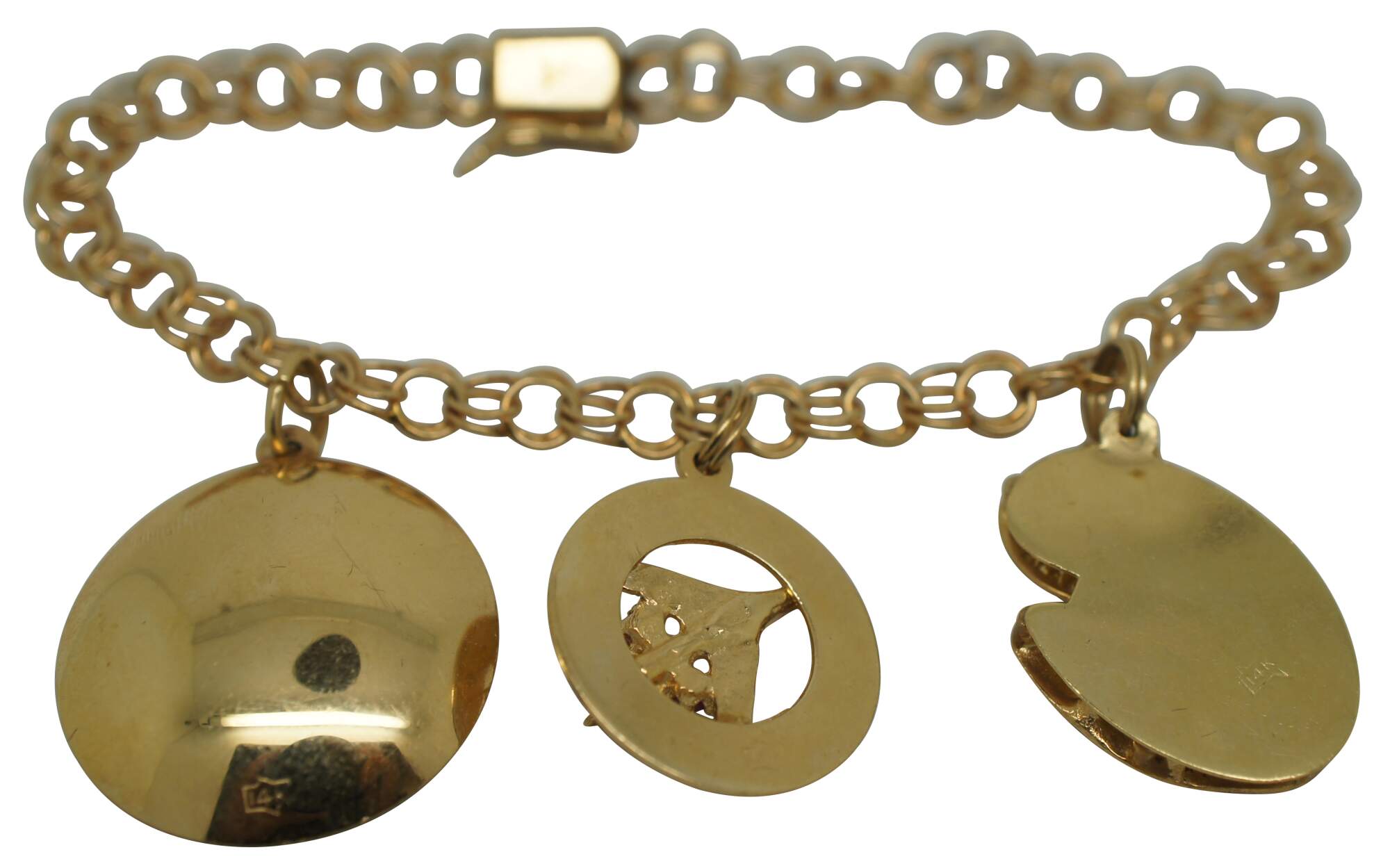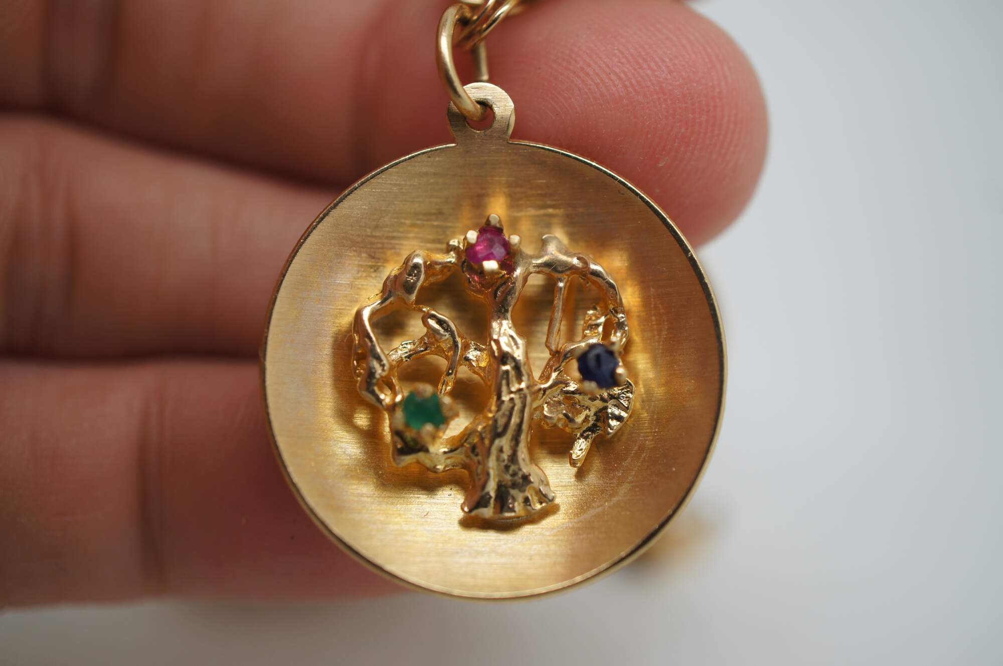 Vintage 14k yellow gold double link charm bracelet with open box clasp. The gold and jeweled charms include a paint palette with coral, turquoise and a pearl, a tree of life with emerald, ruby and sapphire, and a Bon Voyage jet airplane / plane with two rubies.