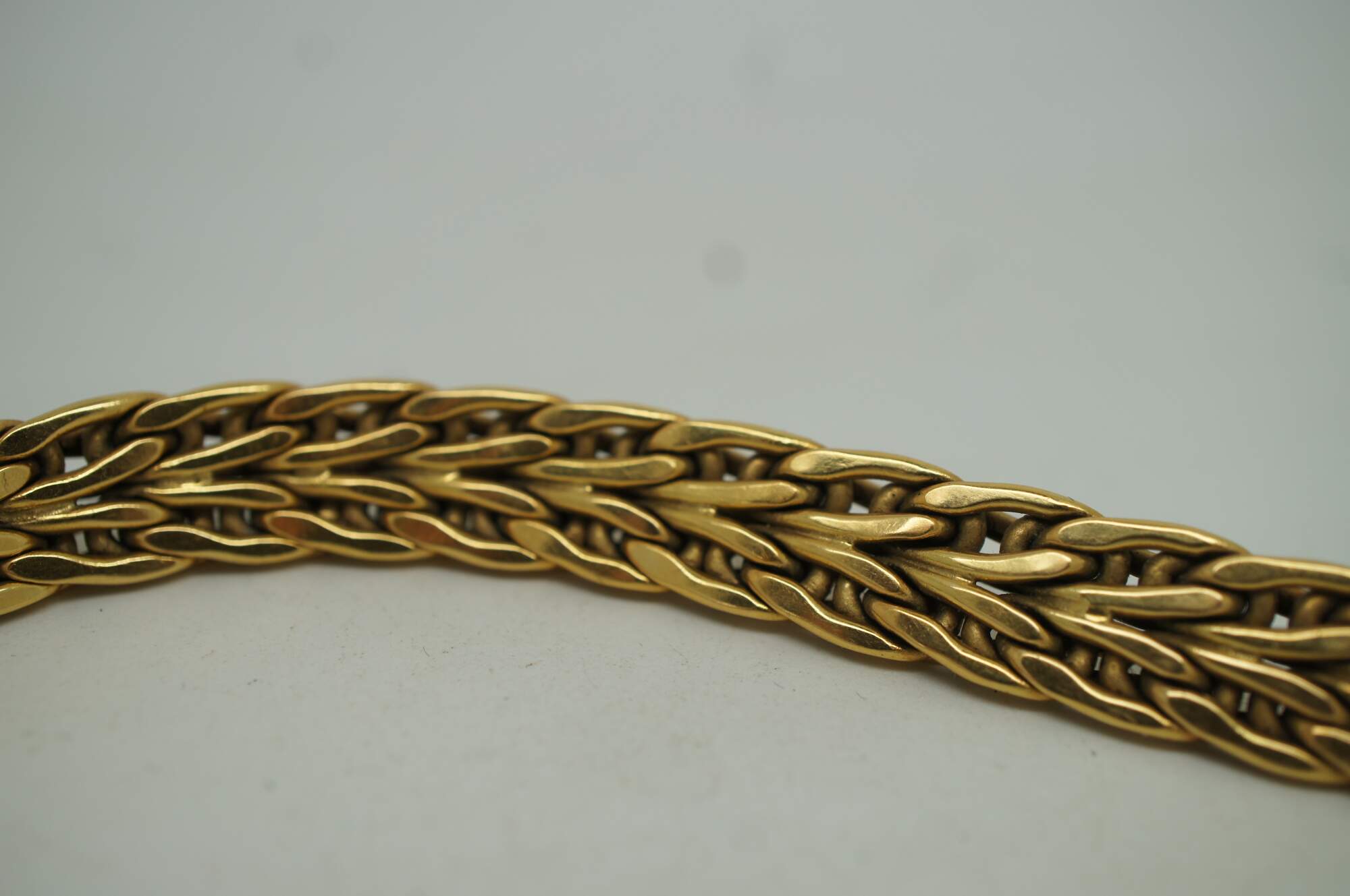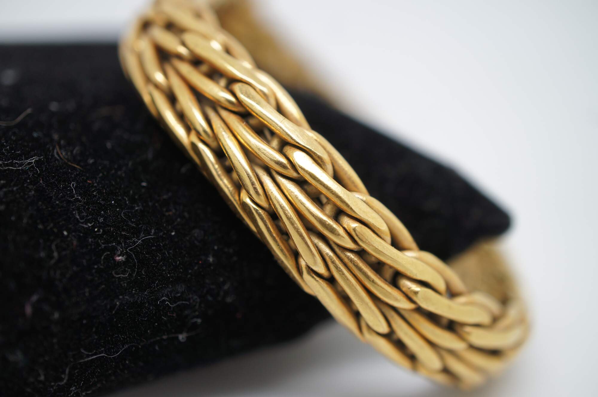 Vintage 18k / 750 yellow gold 9.5mm wide woven chain bracelet with open box clasp. Made in Arezzo, Italy. Marked 1AR which is the identification mark for UnoAErre, which was the first goldsmith company of Arezzo.
