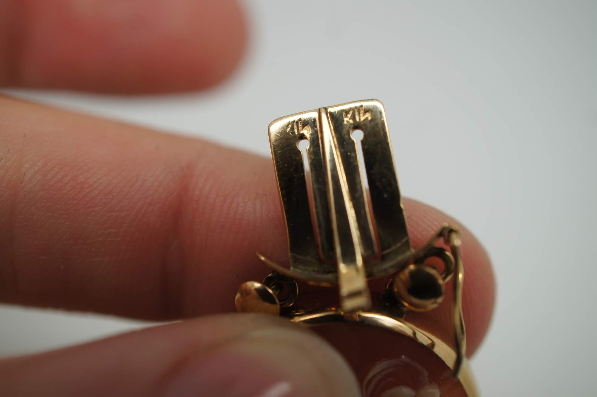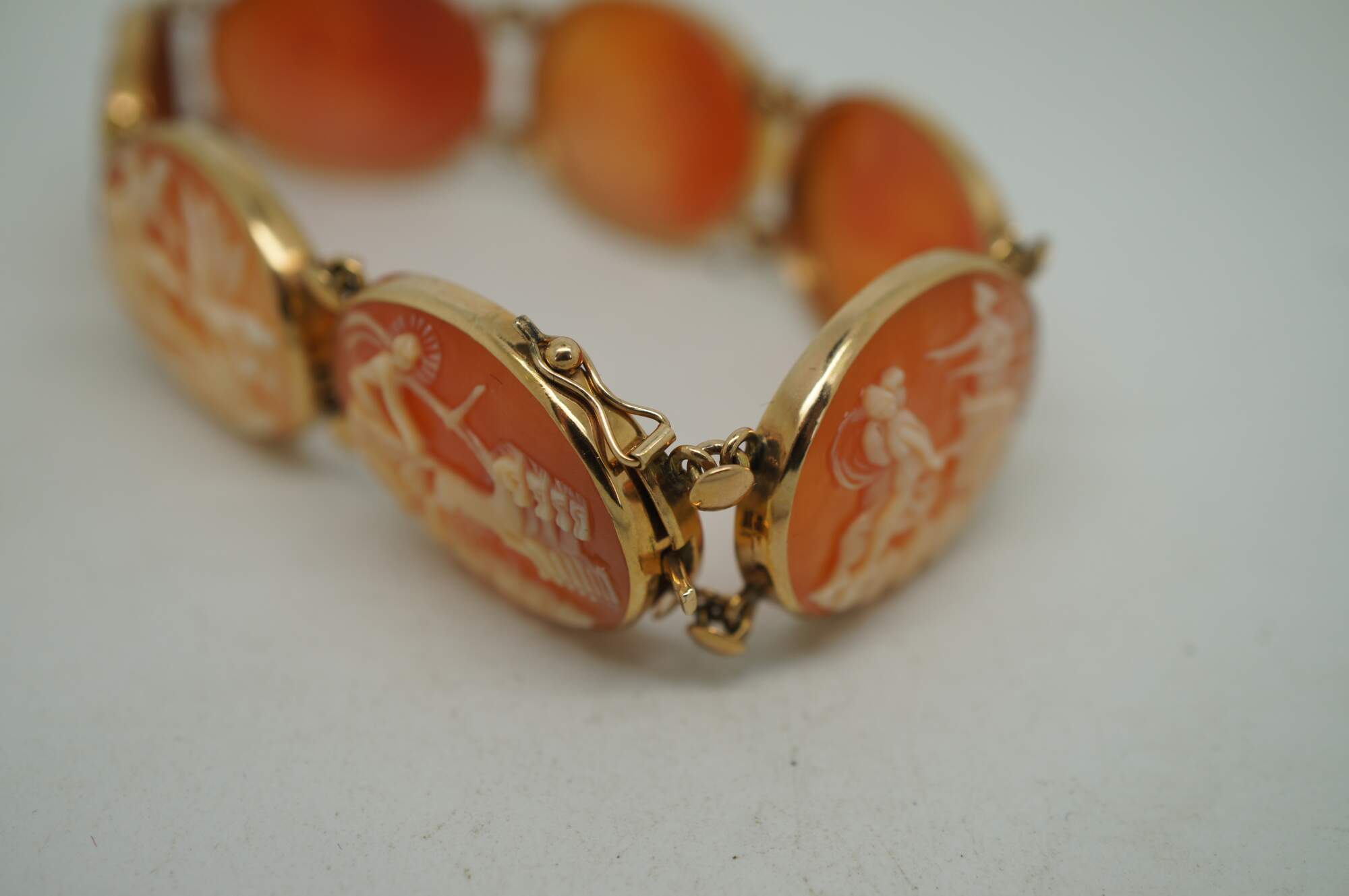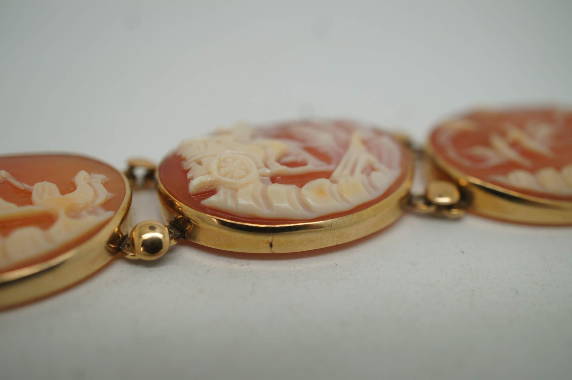 Vintage mid 20th century Italian 14k yellow gold and carved shell cameo bracelet with open box clasp, featuring seven discrete neoclassical scenes of Greek / Roman gods and goddesses driving chariots.