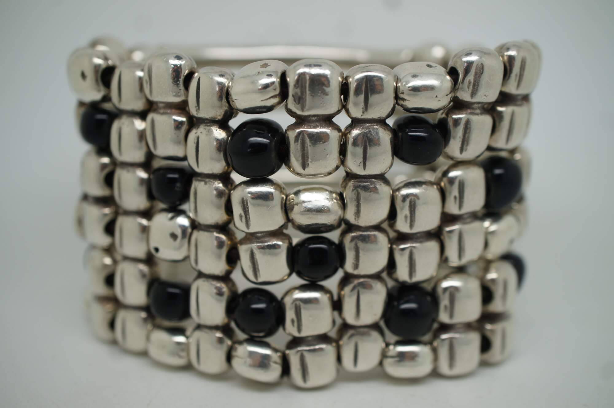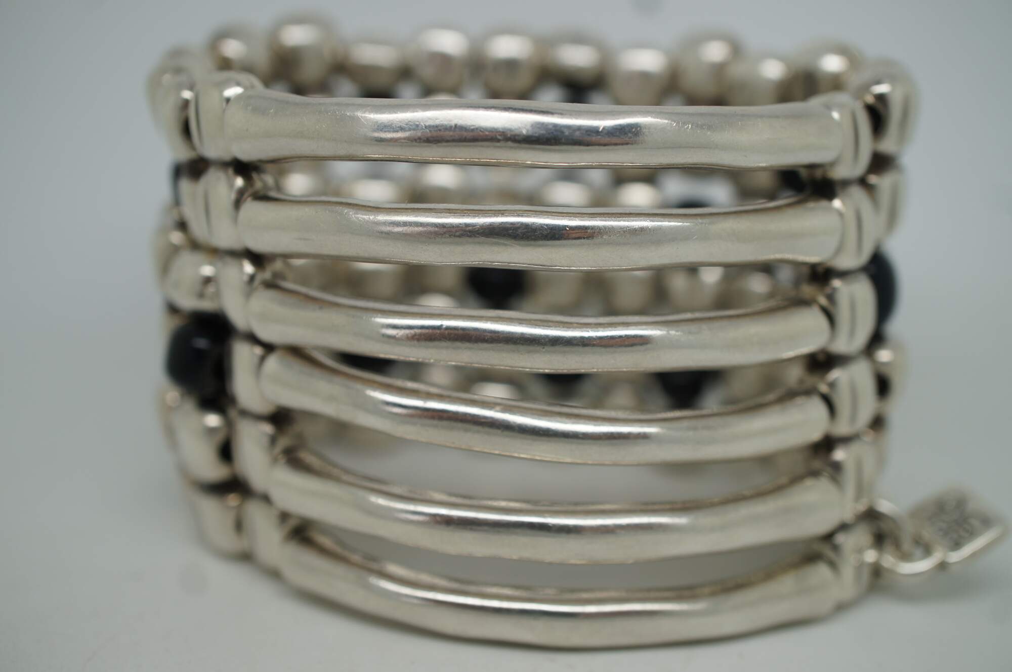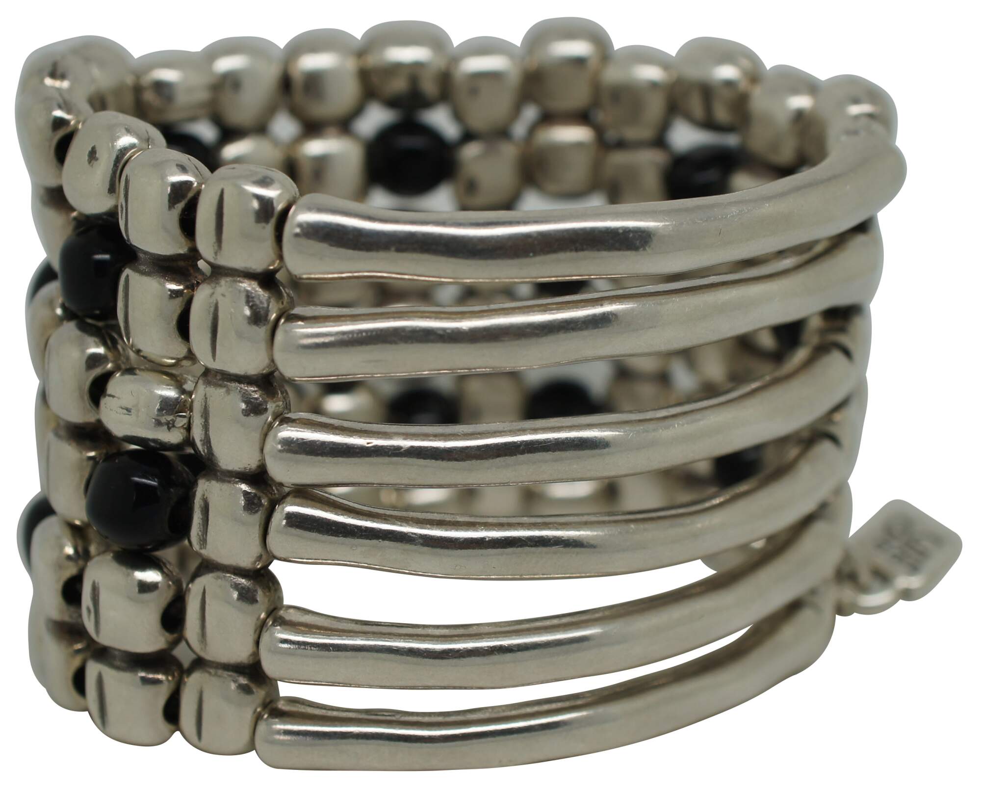 Uno de 50 silver tone and black beaded six layer wide stretchy cuff / bangle bracelet with stone shaped beads at the front and bone / coral shaped beads at the back.