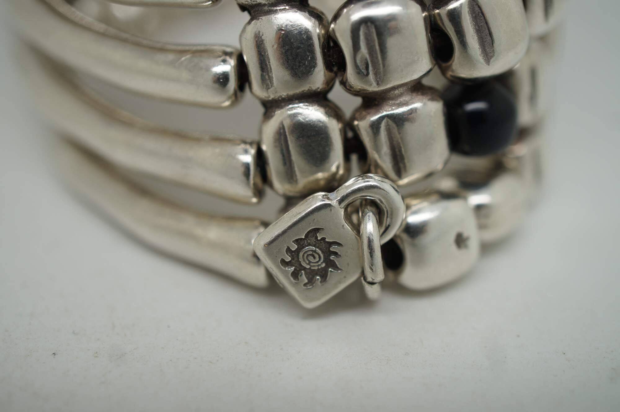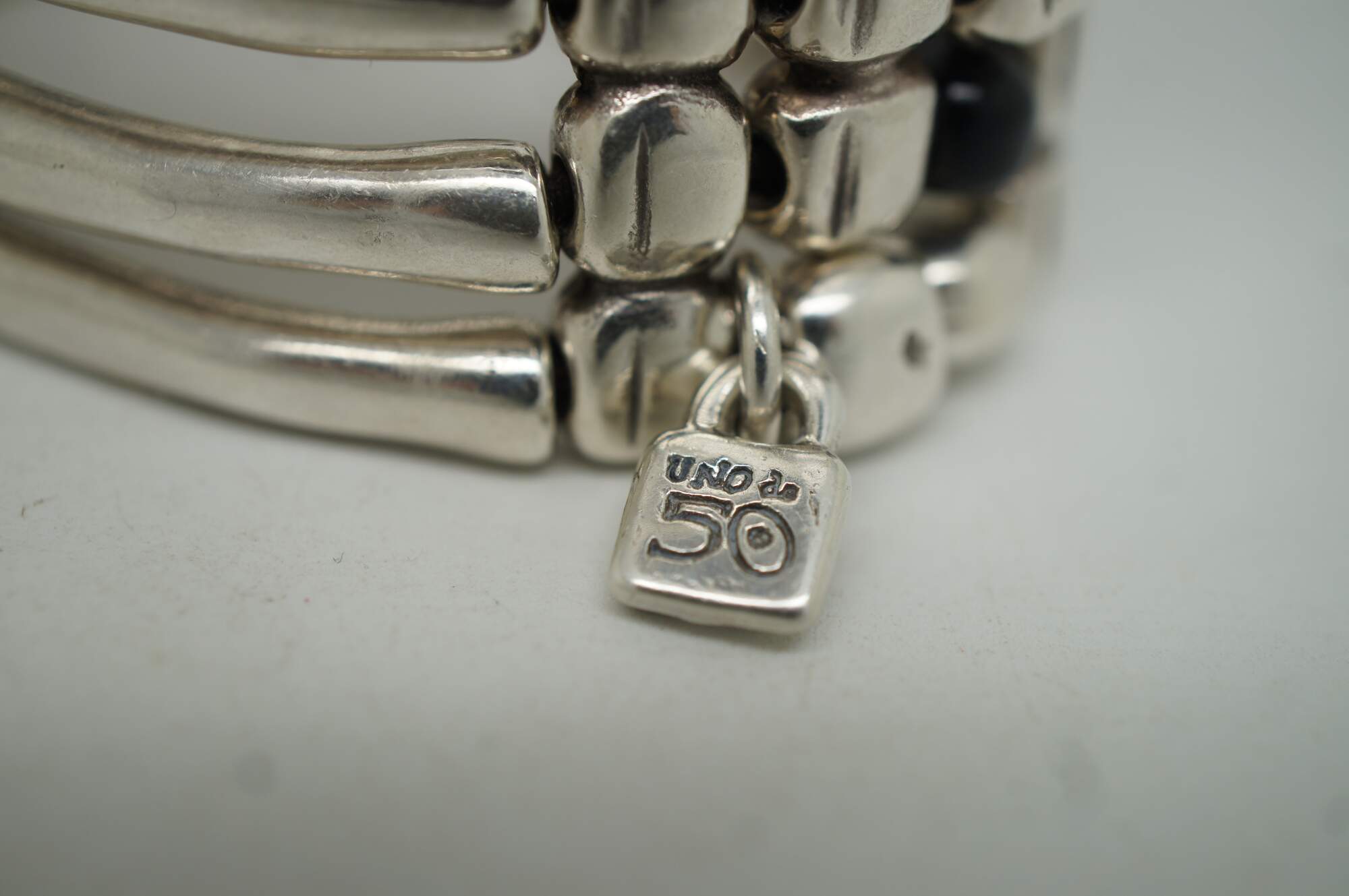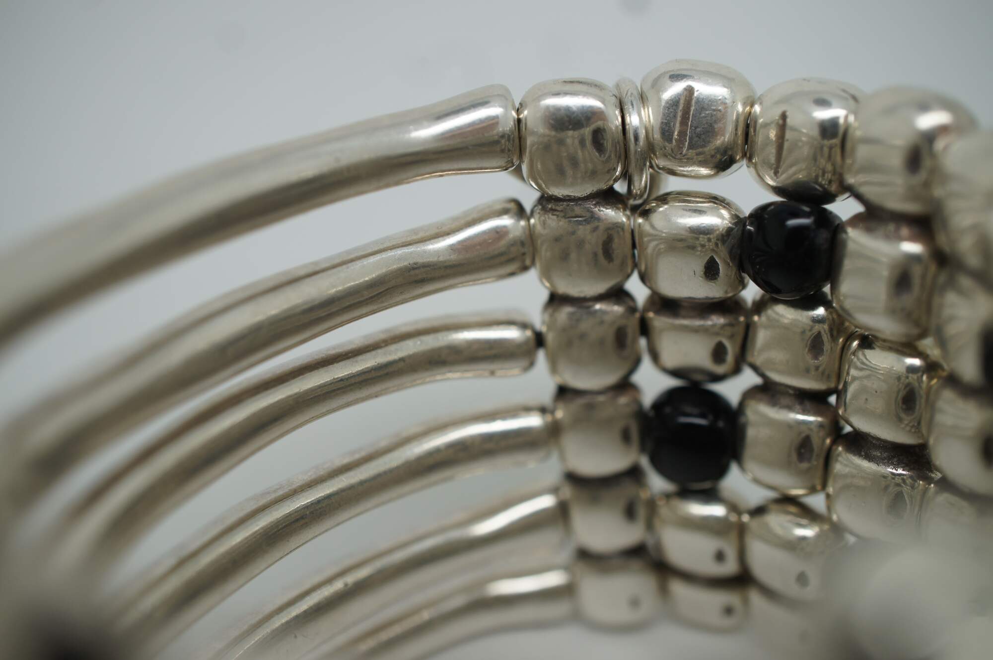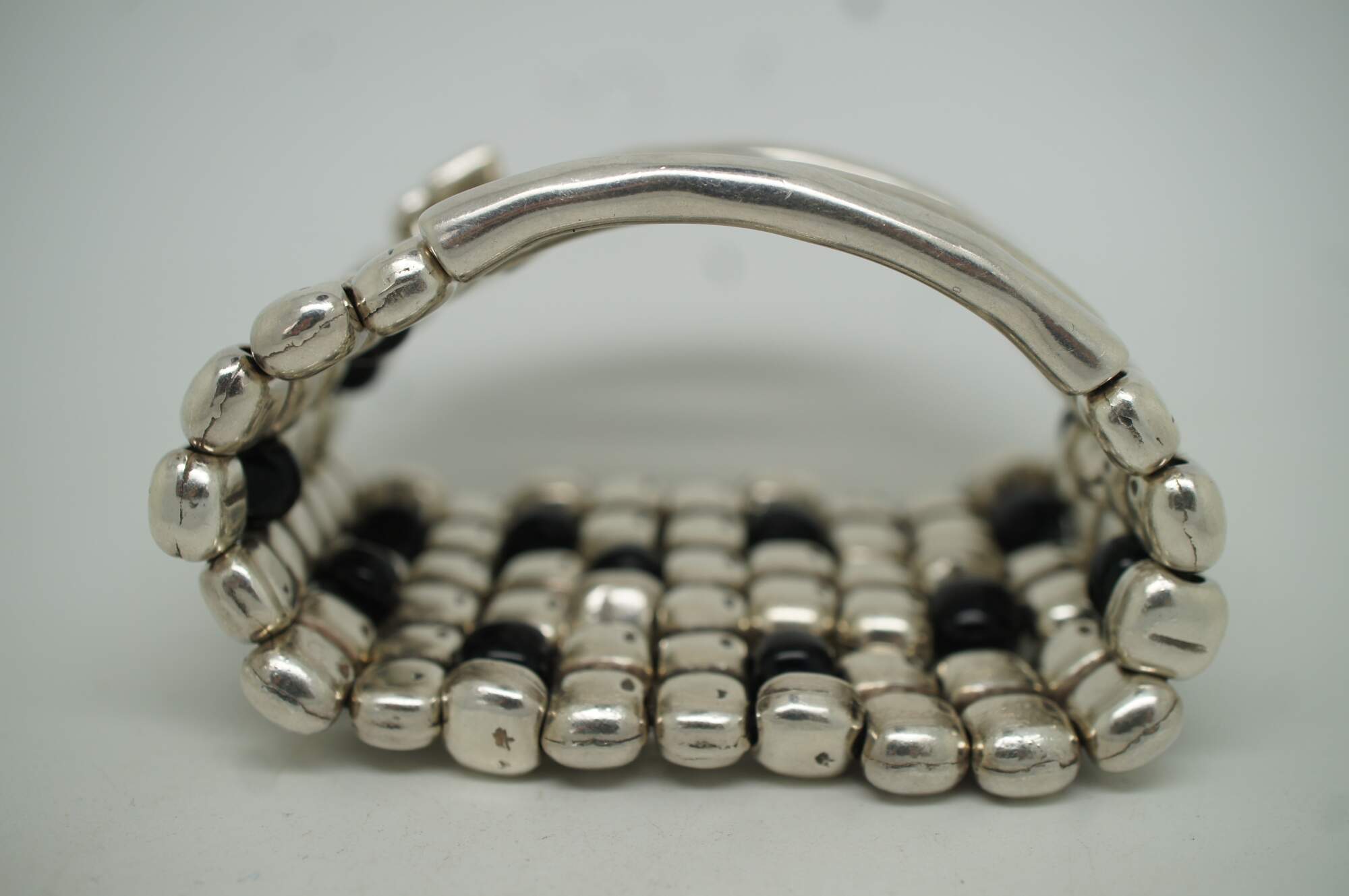 Uno de 50 silver tone and black beaded six layer wide stretchy cuff / bangle bracelet with stone shaped beads at the front and bone / coral shaped beads at the back.