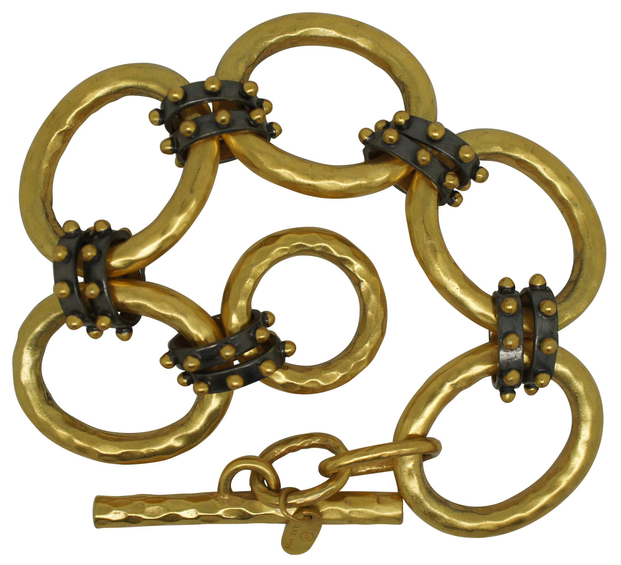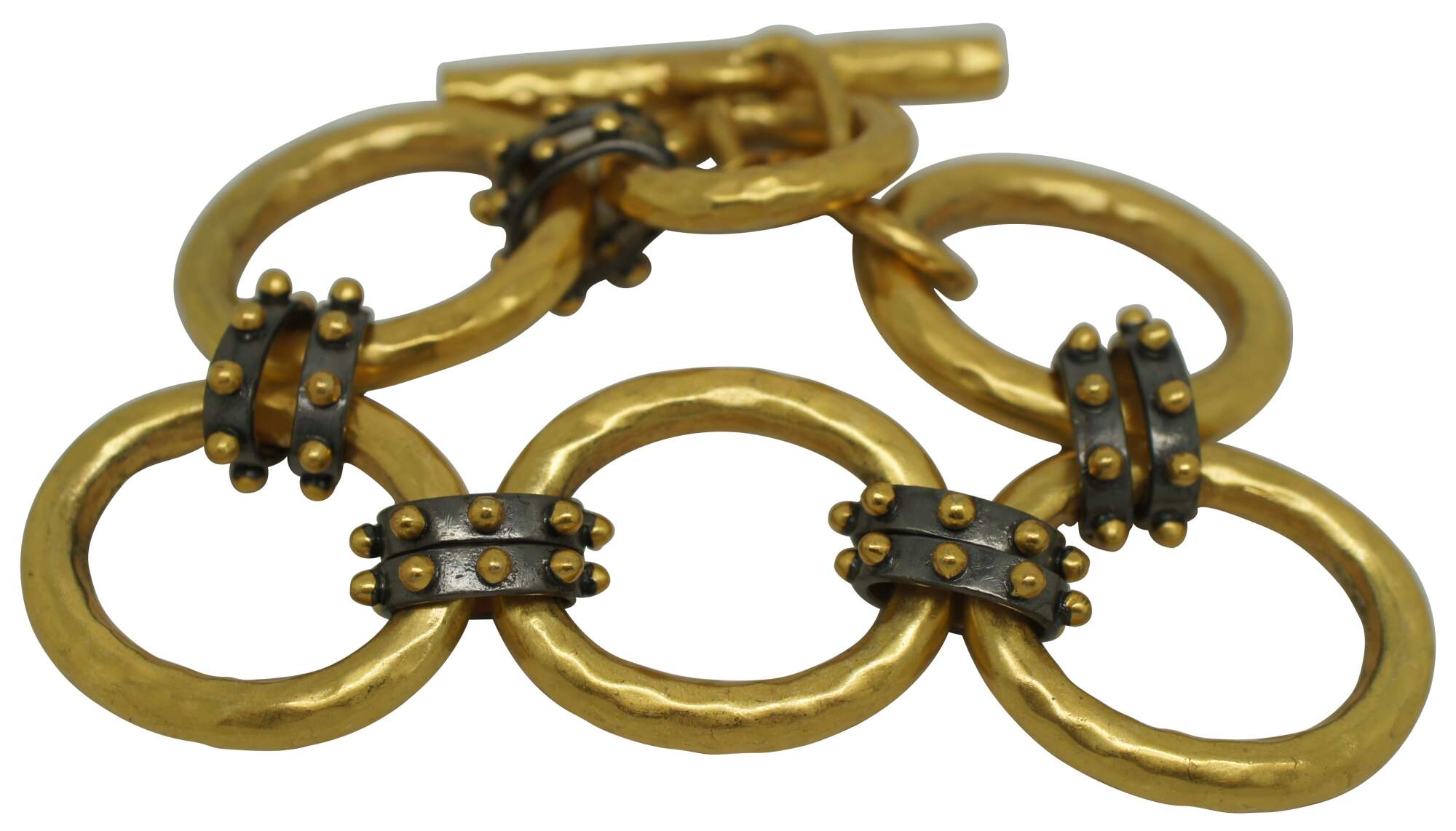 Vintage SoHo Link Bracelet by Julie Vos, featuring lightly hammered 24K gold plated oval chain links connected with dark studded connecting links. Toggle clasp.