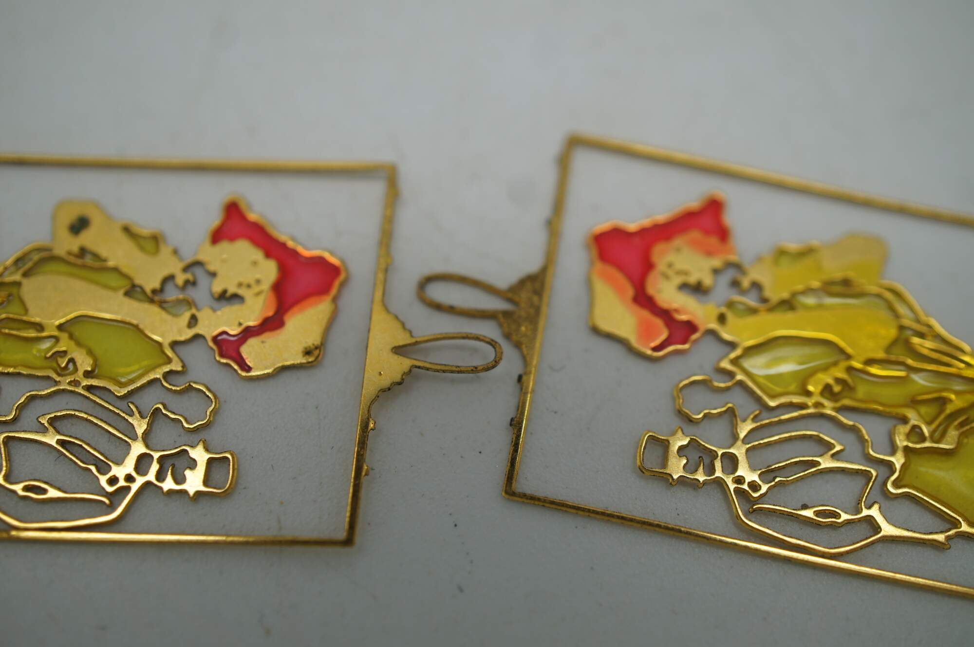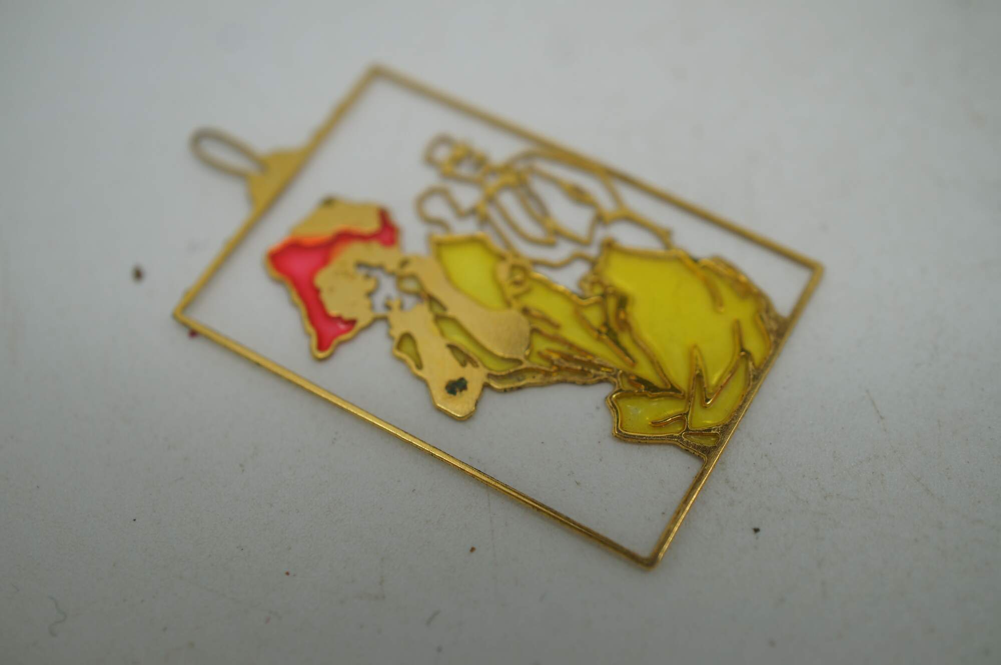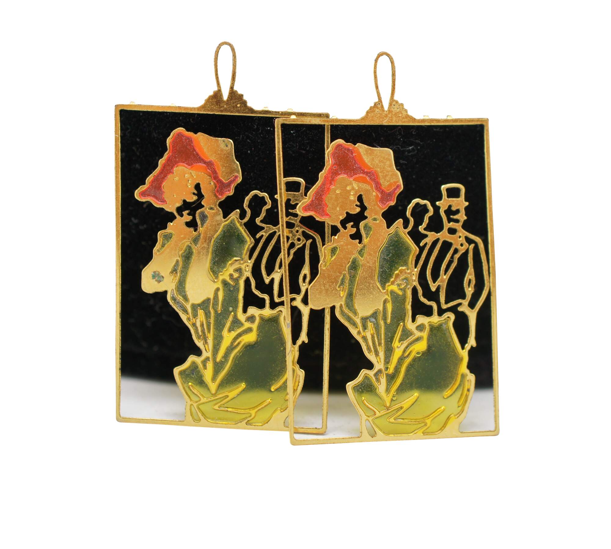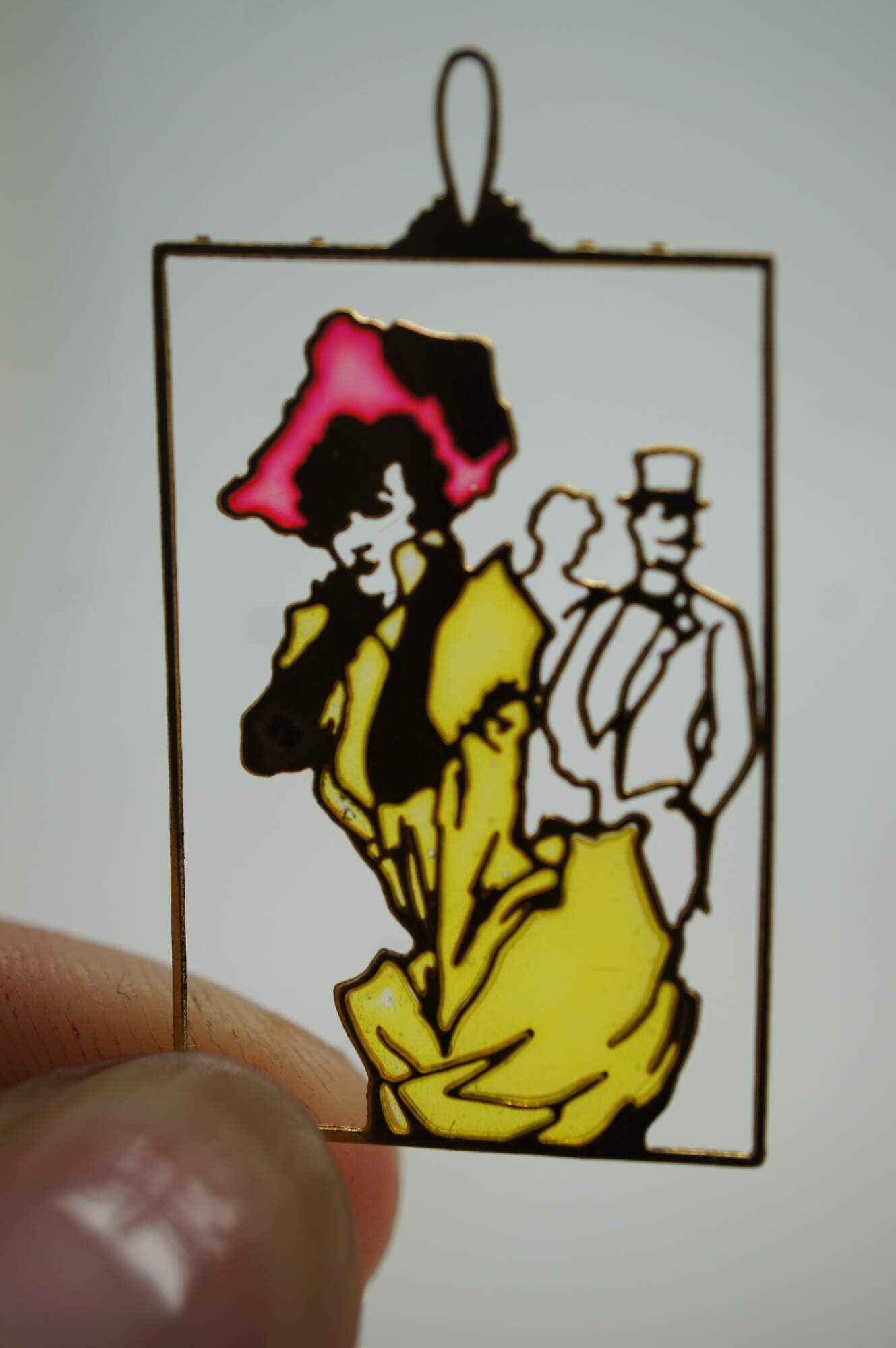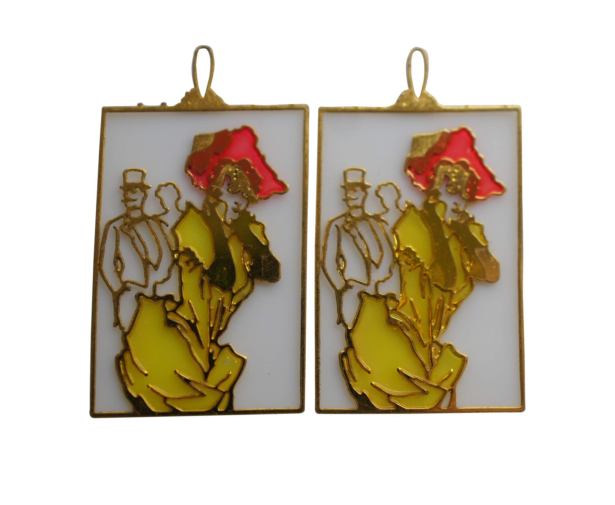 Pair of two rare Toulouse Lautrec silhouette necklace charms or pendants featuring a pierced gold plated frame with red and yellow enameled accents.