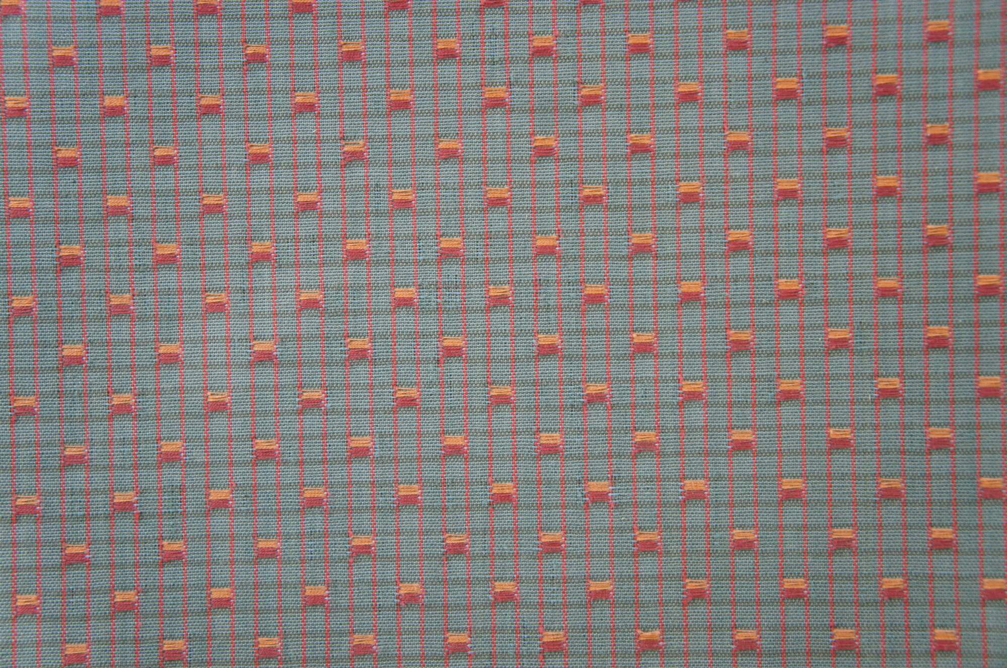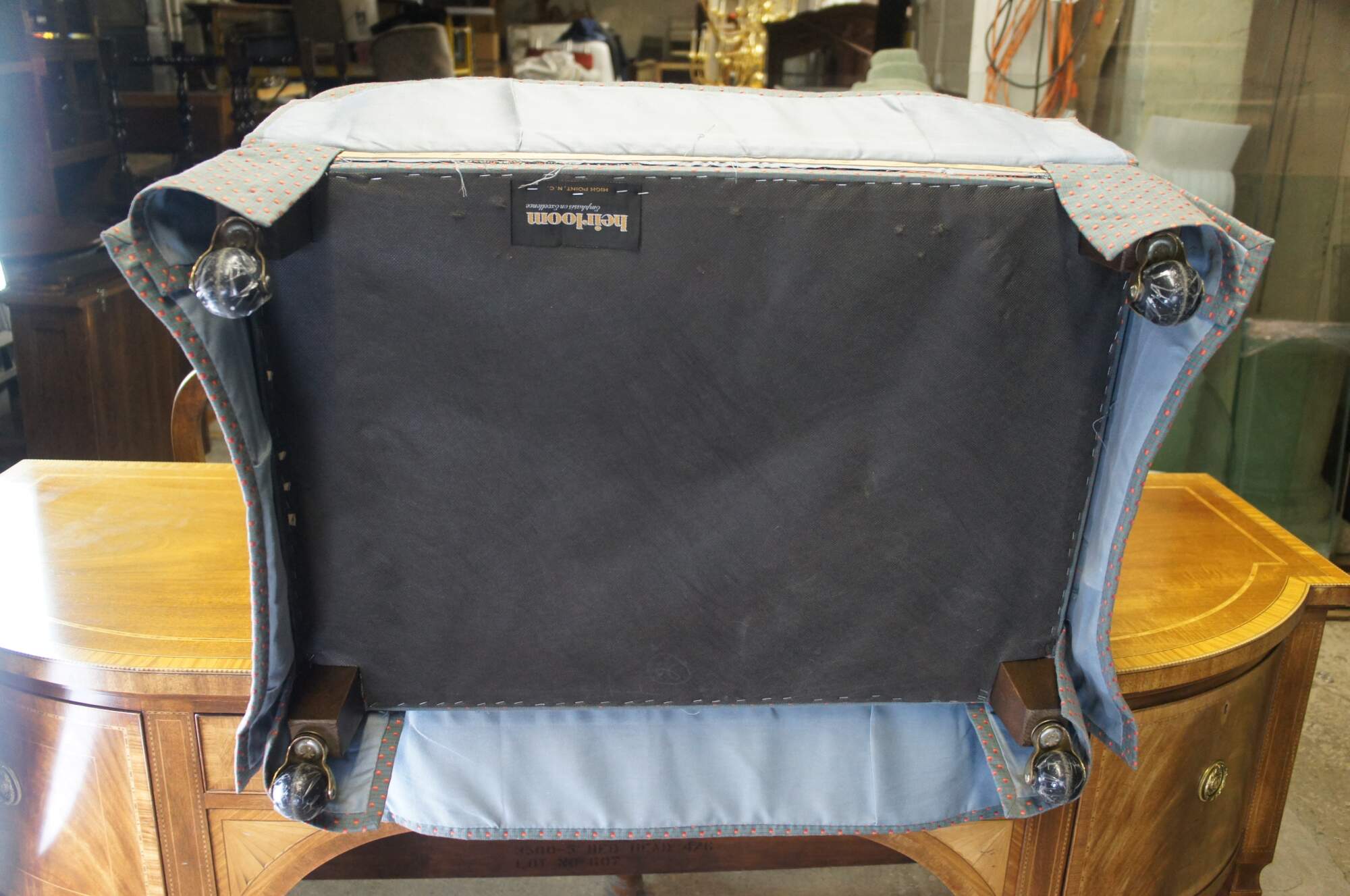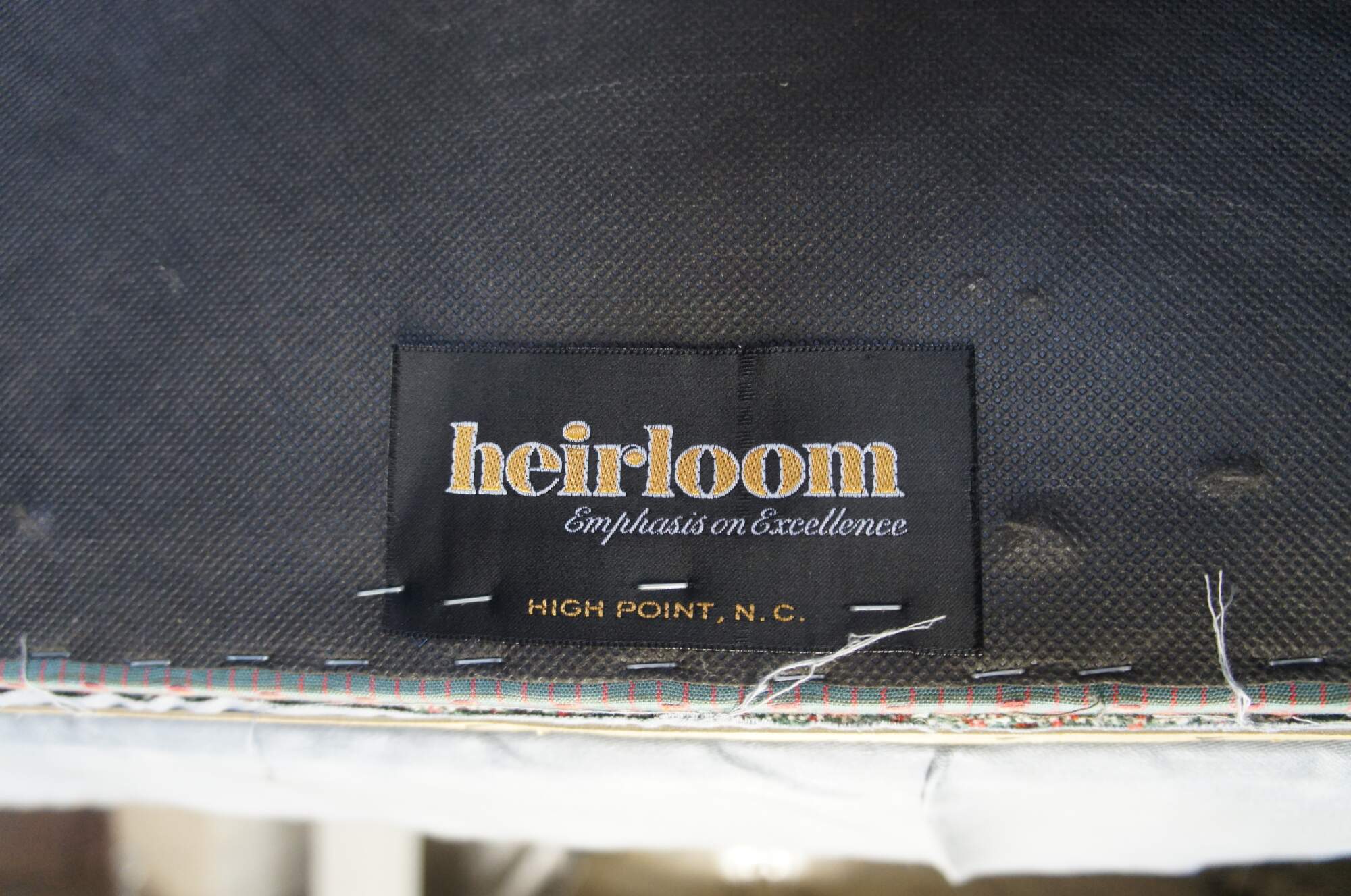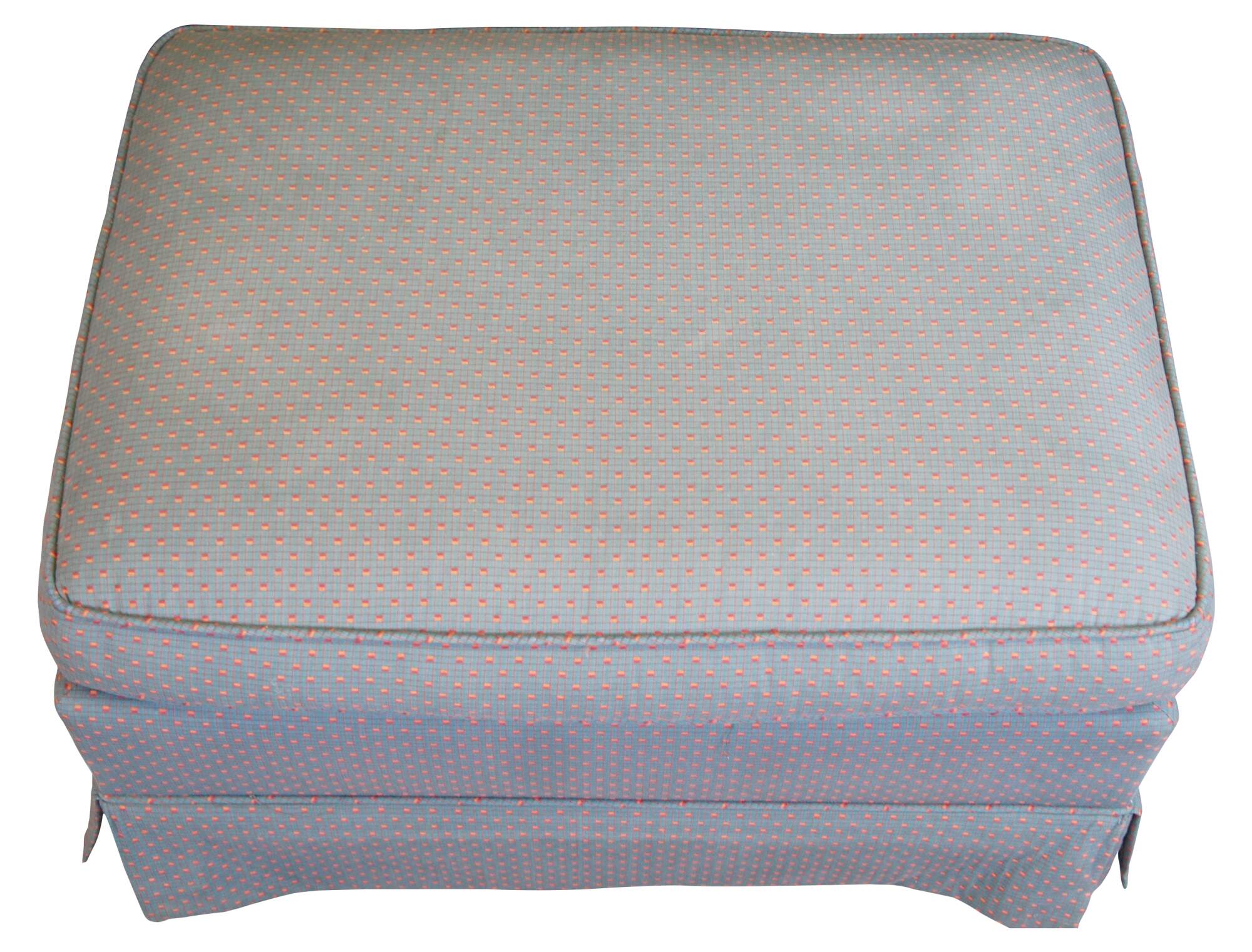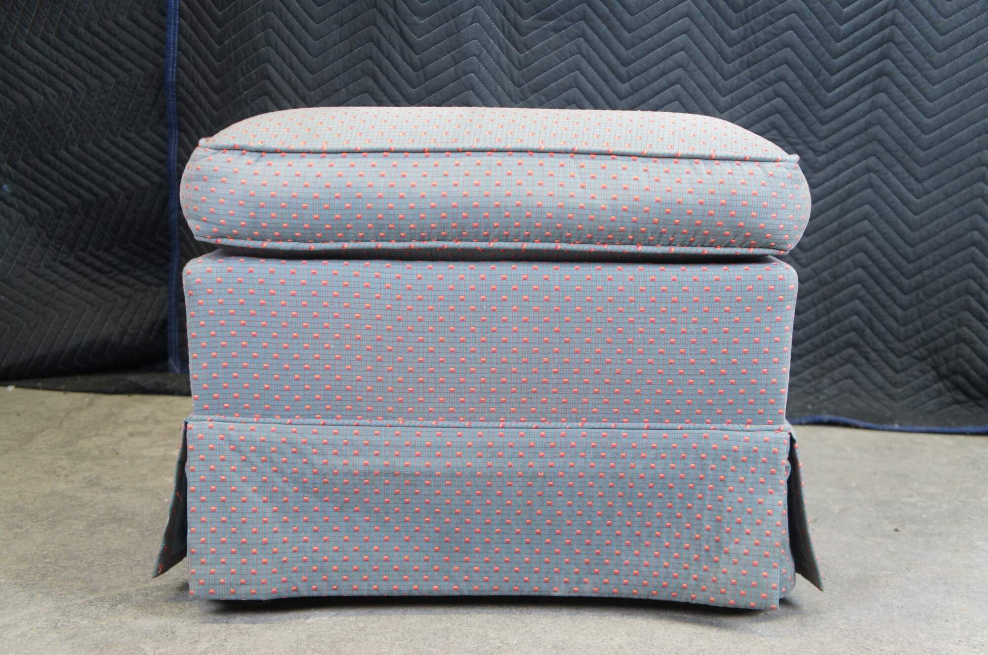 1970s Heirloom Furniture "Emphasis of Excellence" Upholstered Ottoman. Features a rectangular form with plush seat, square check/ polka dot style fabric and square tapered feet leading to casters. Made in High Point, N.C.