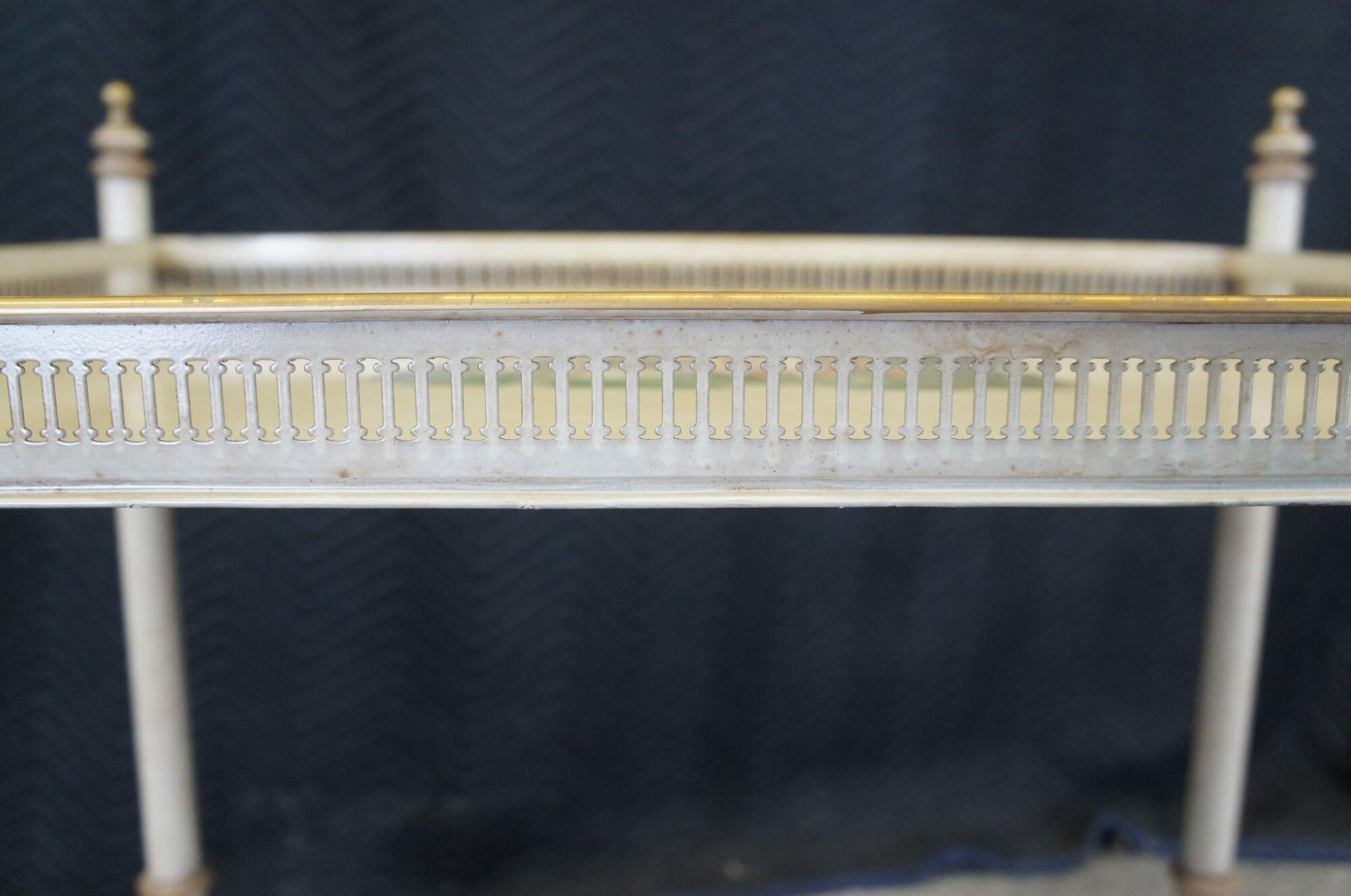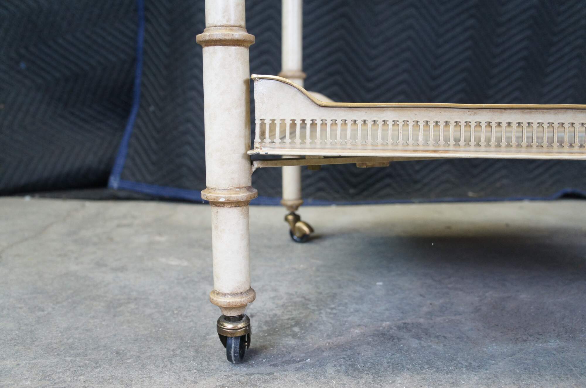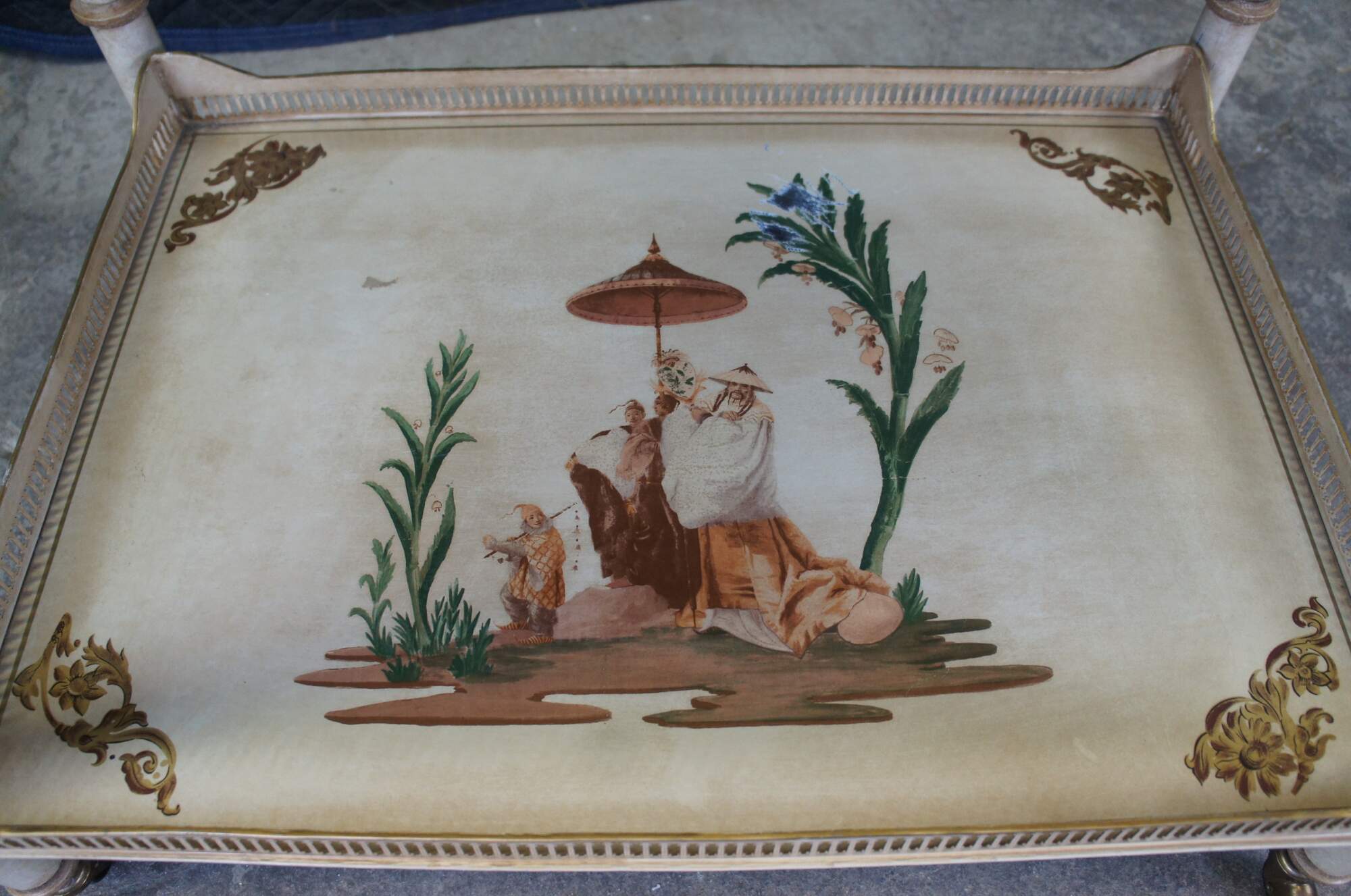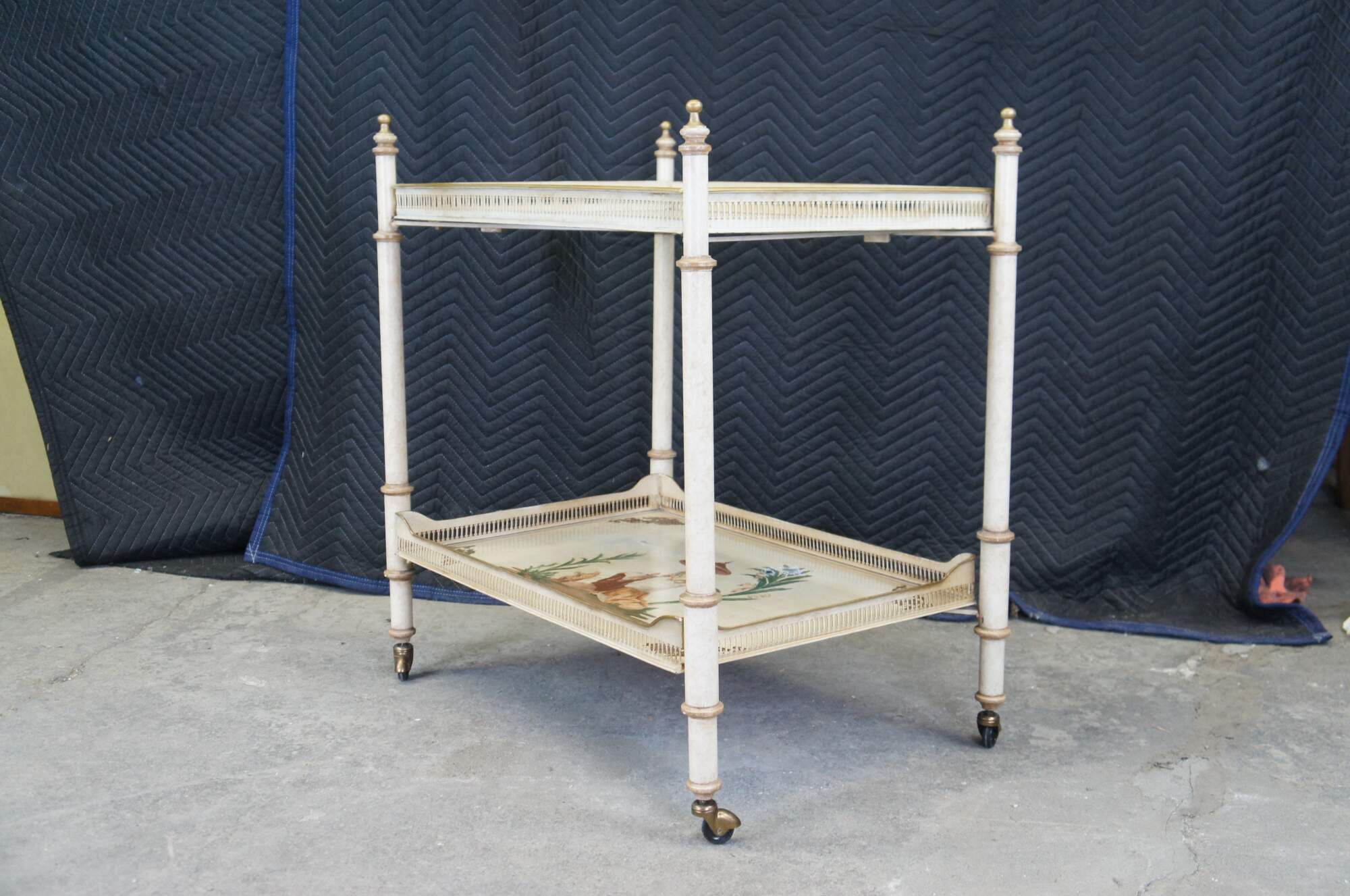 Vintage Italian Bar cart, beverage trolley or dry bar, circa 1970s. Features a two tier removable tray table design with pierced galleries and hand painted oriental scenes. Finished in a mottled off white with golden trim.