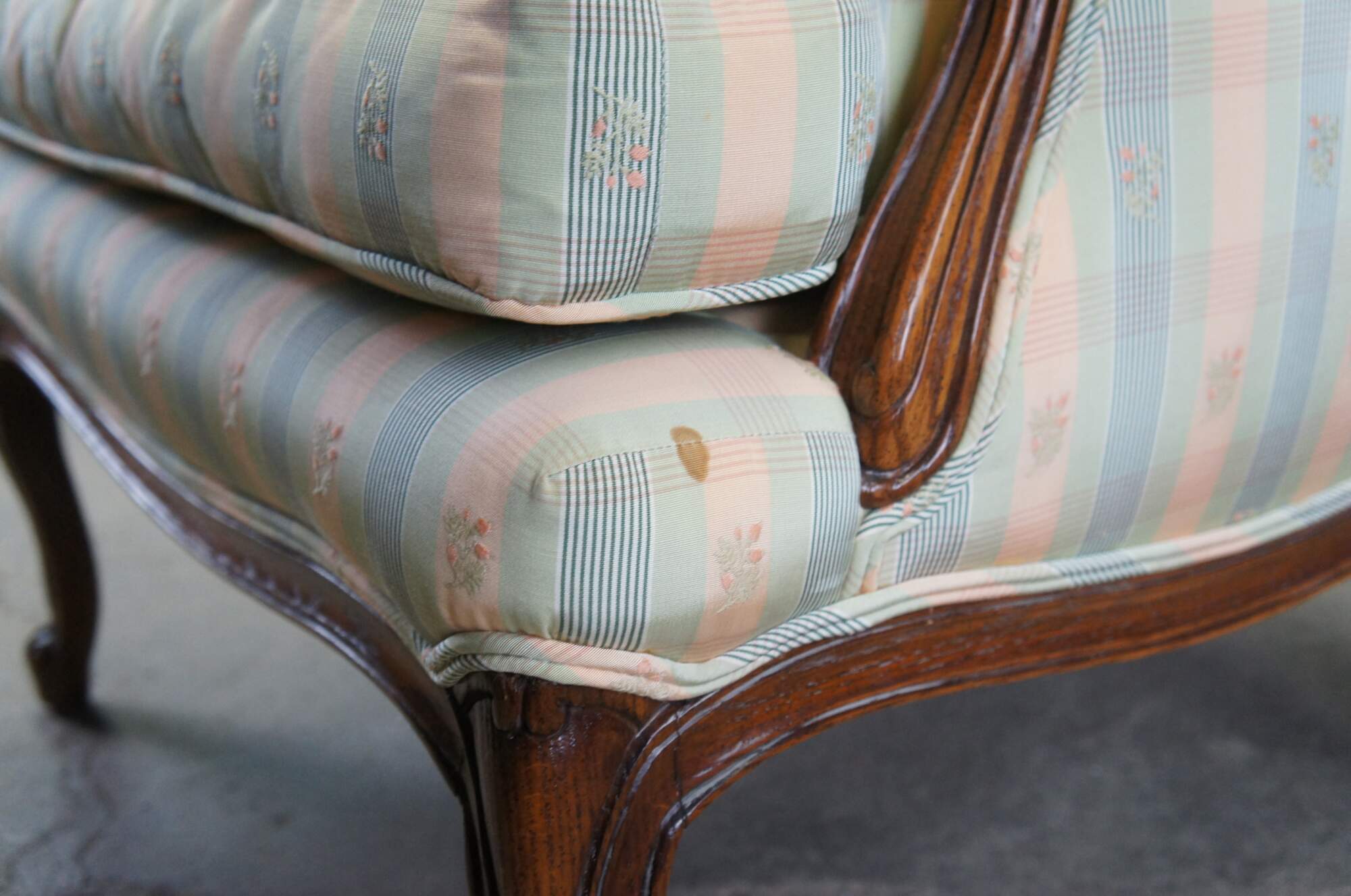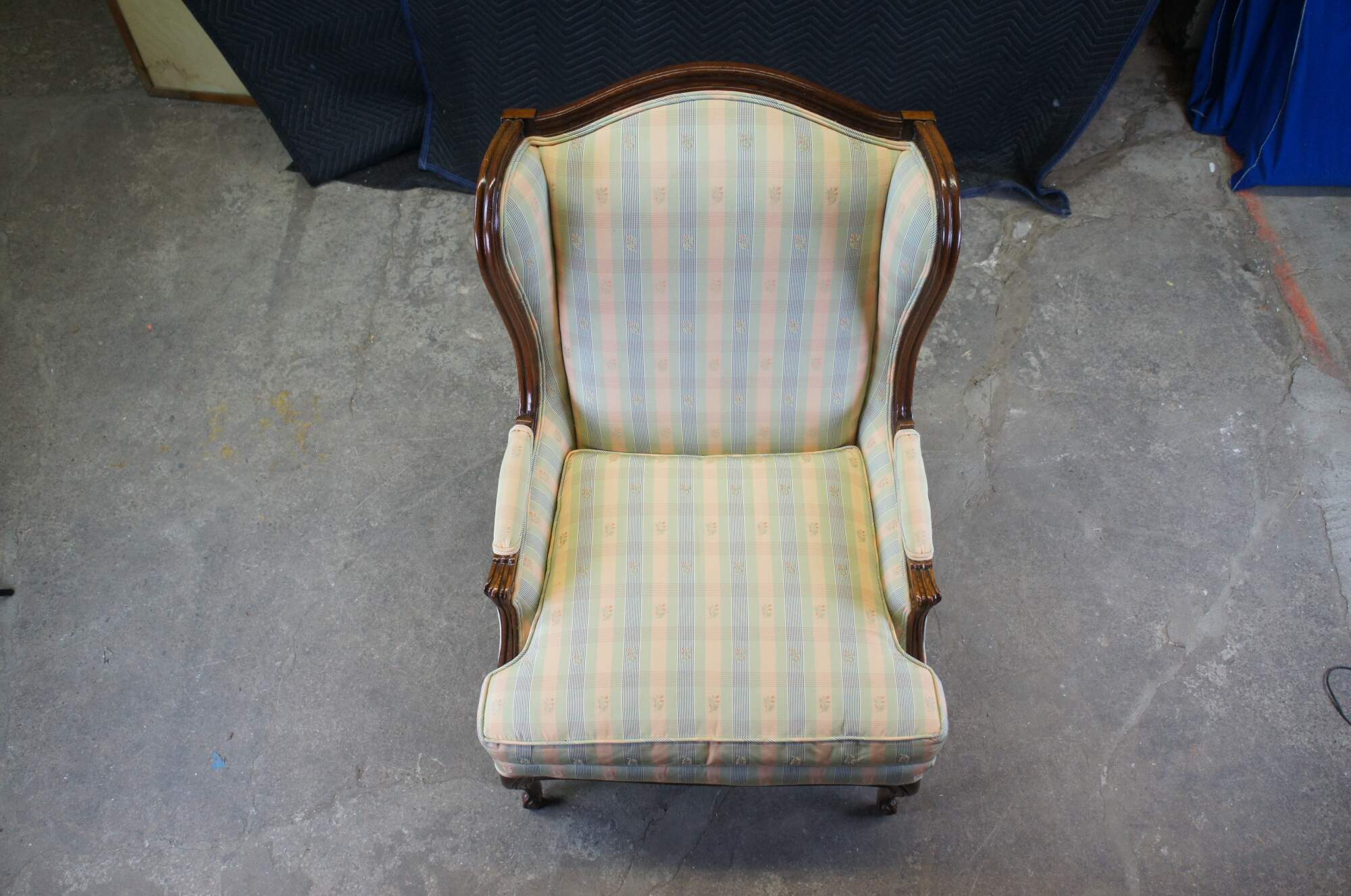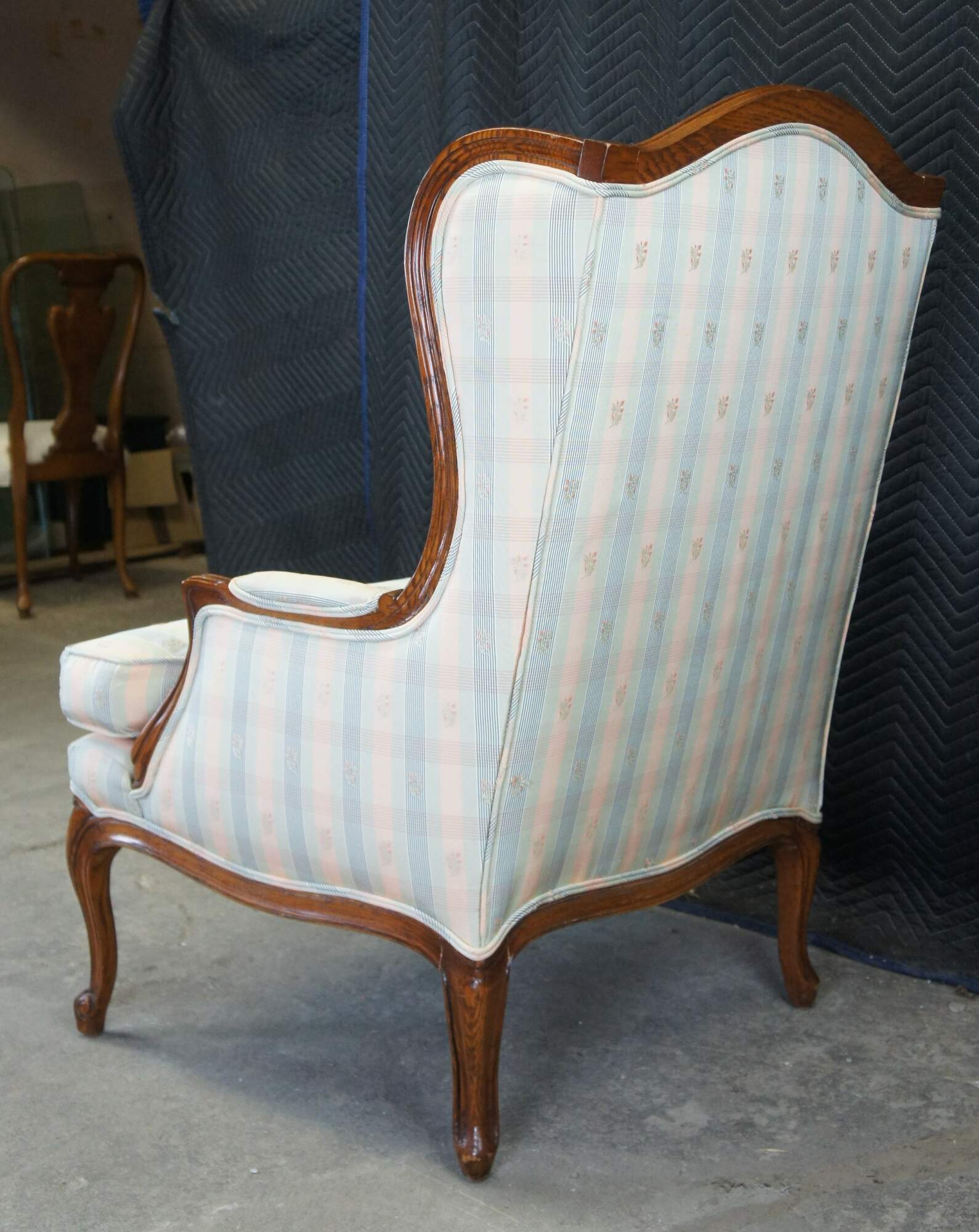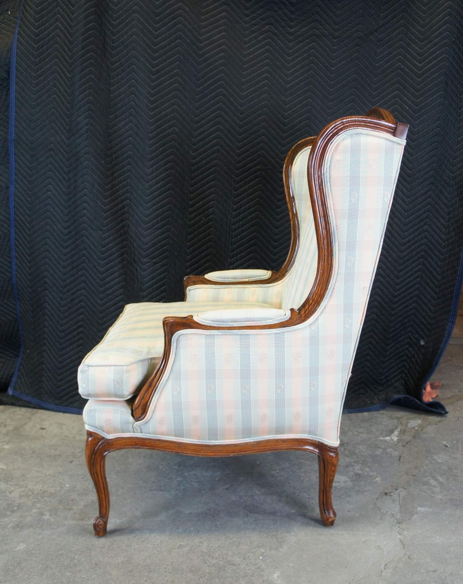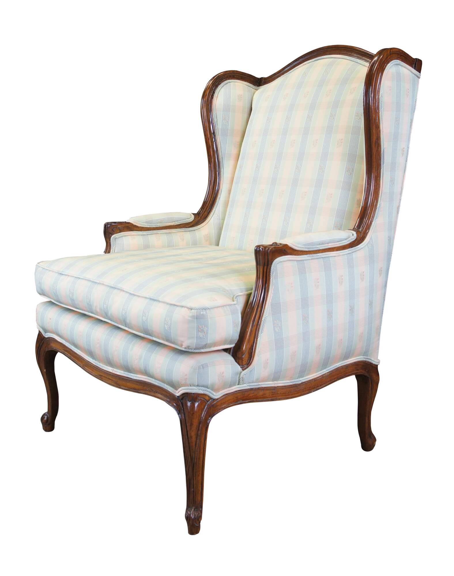 A beautiful pair of French Bergere wingback chairs by Baker Furniture, circa 1970s. Made from oak with a camelback leading to contoured sides and padded arms. The chair is supported by cabriole legs with scrolled feet along the front. Upholstered in plaid Scalamandre fabric.