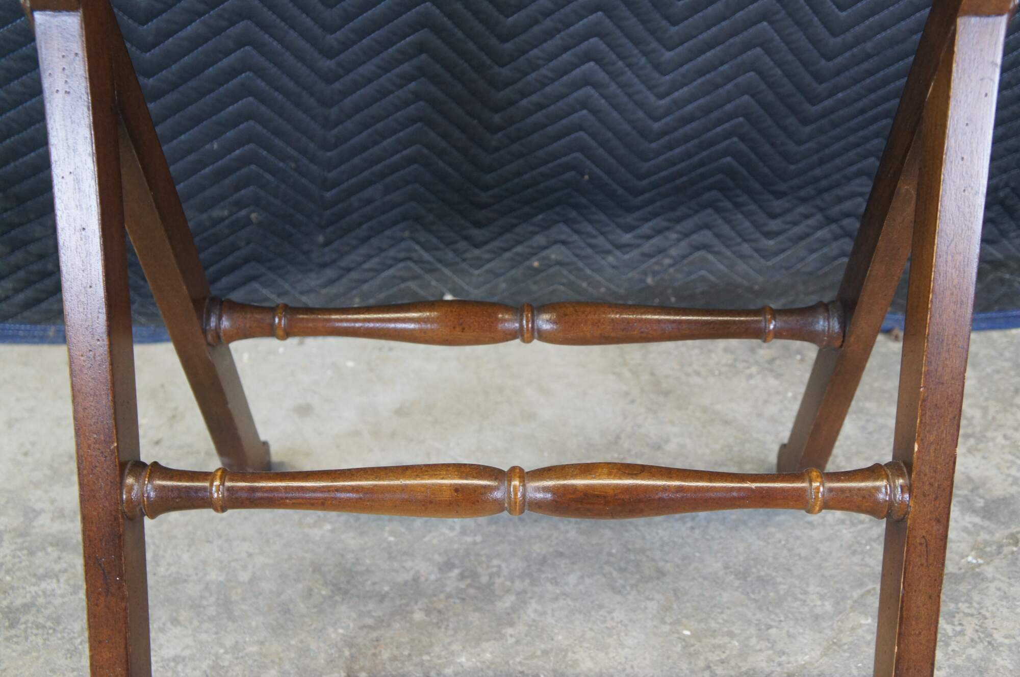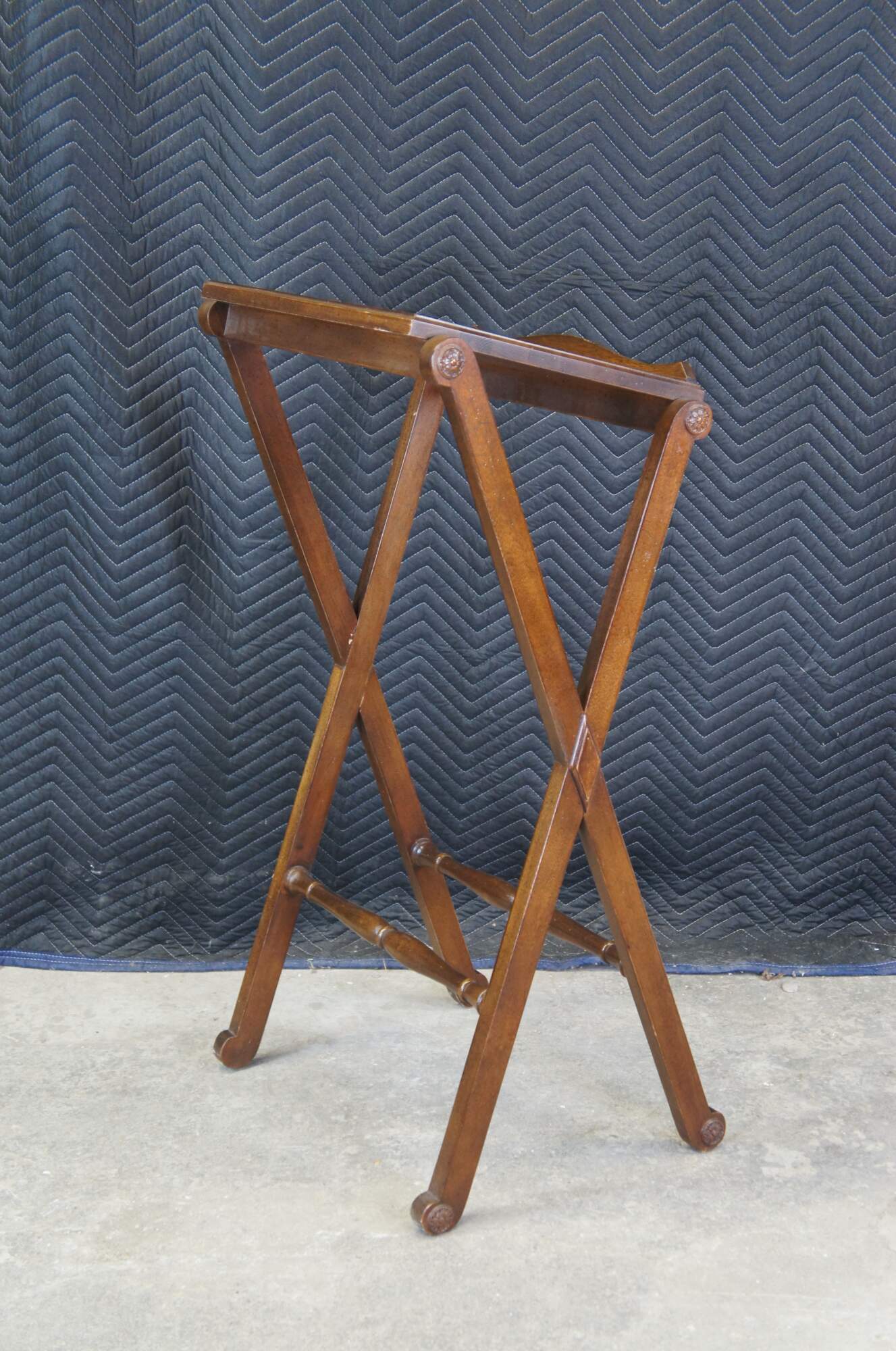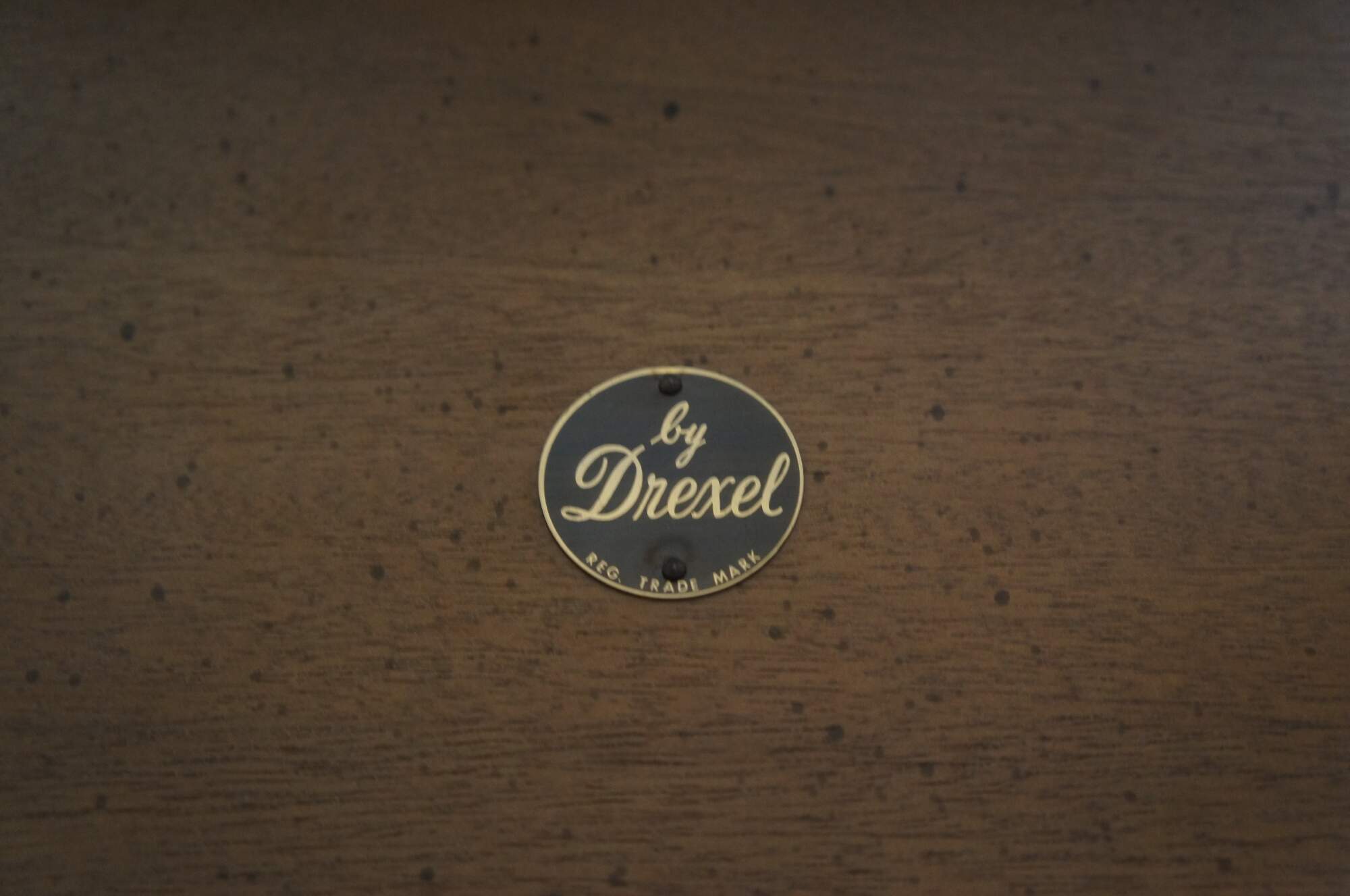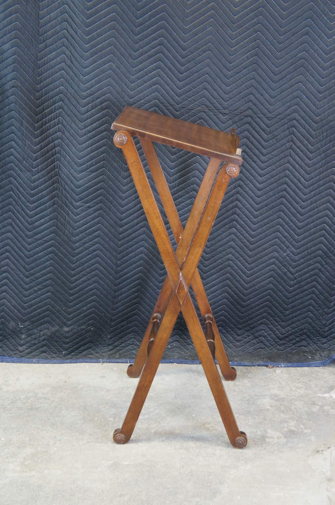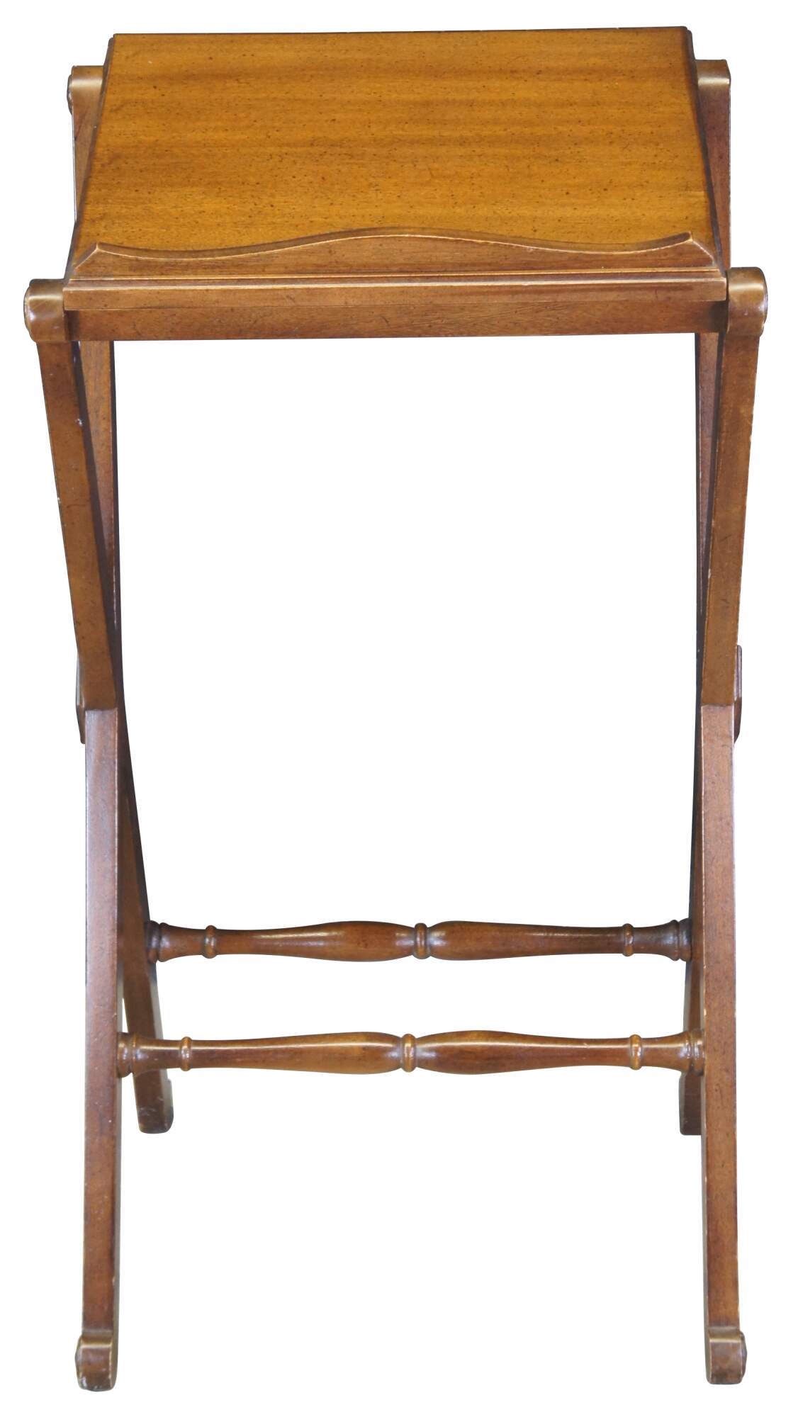 A vintage French inspired podium by Drexel, circa 1970s. Features a walnut-finished frame with an inclined surface showing a serpentine lipped bottom on an a pair of X-shaped supports joined by two baluster stretchers. The underside of the podium’s surface features a label marked ‘by Drexel’