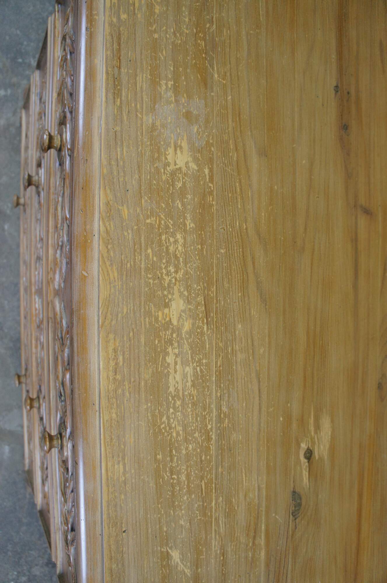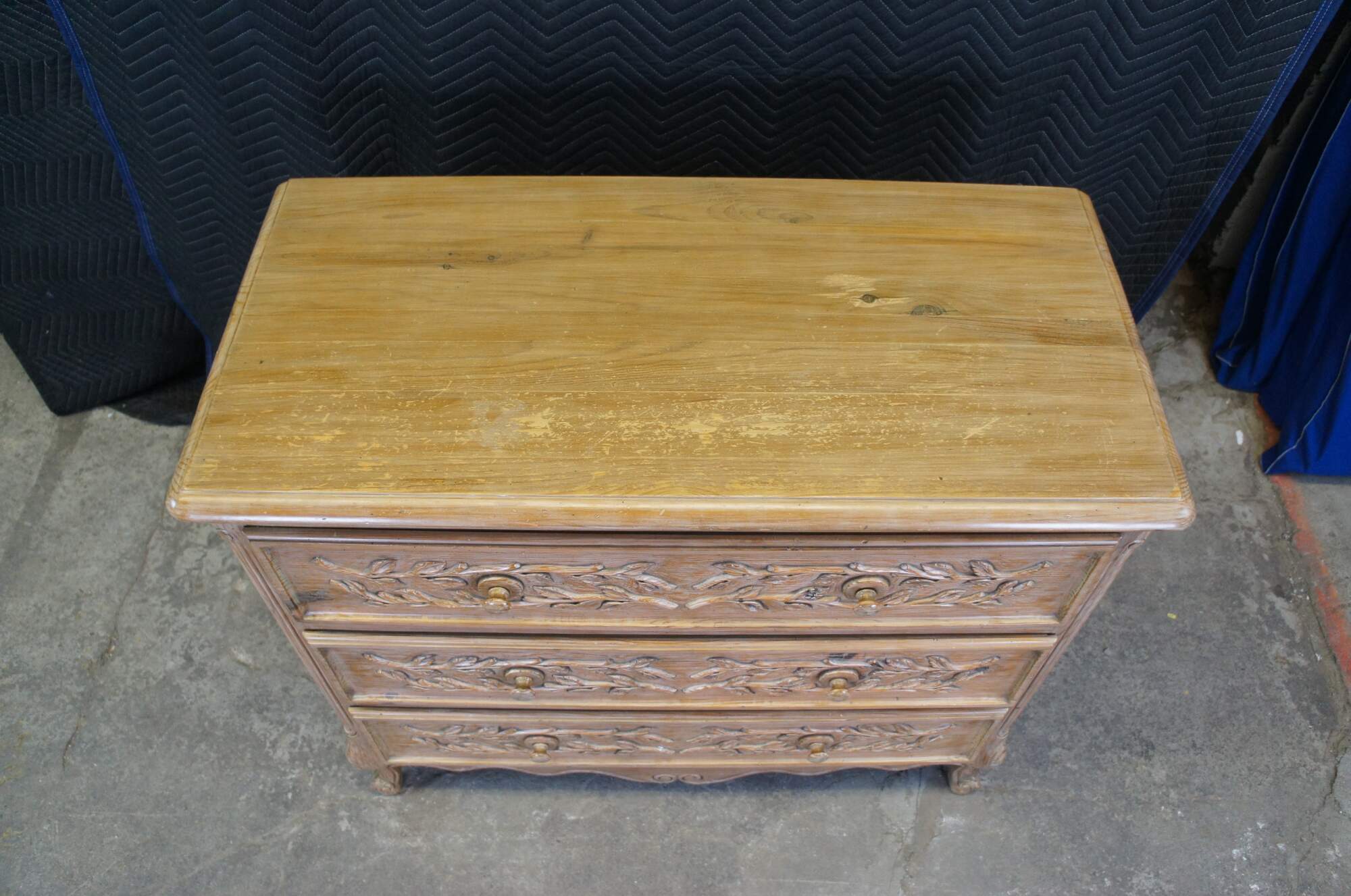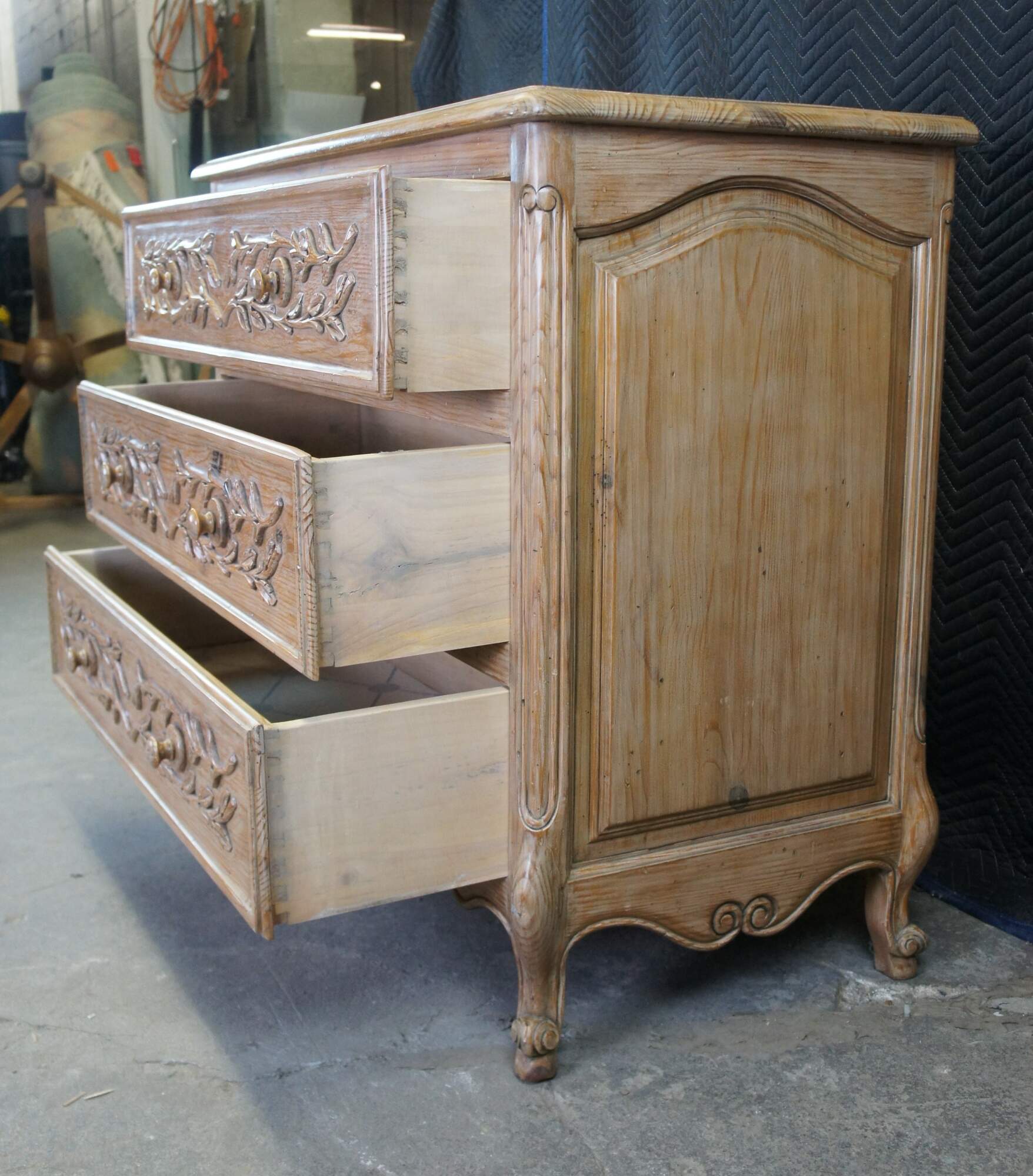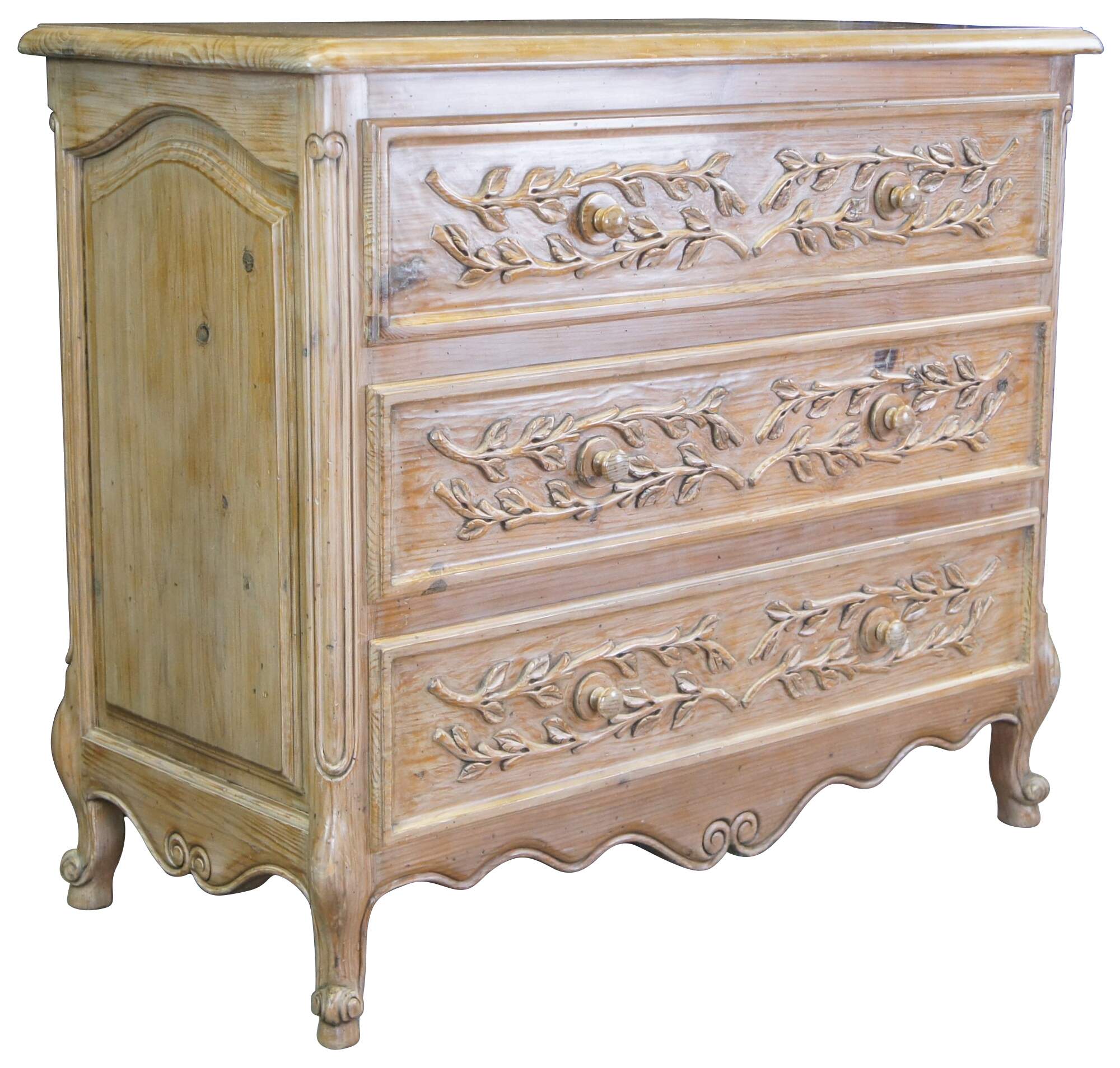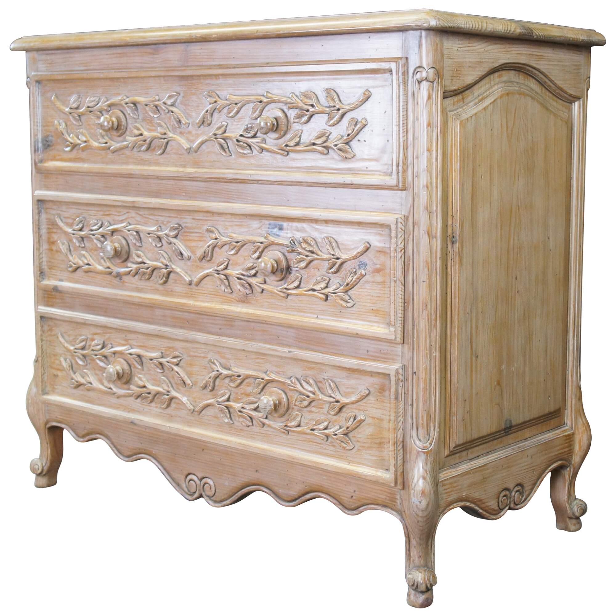 A lovely French farmhouse dresser or chest, circa 1970s. Made from pine with three dovetailed drawers, highlighted by an applied vine and leaf motif. The chest has recessed and arched moldings along the side and features a serpentine lower apron with scrolled accents. The case is raised over cabriole legs with scrolled feet.