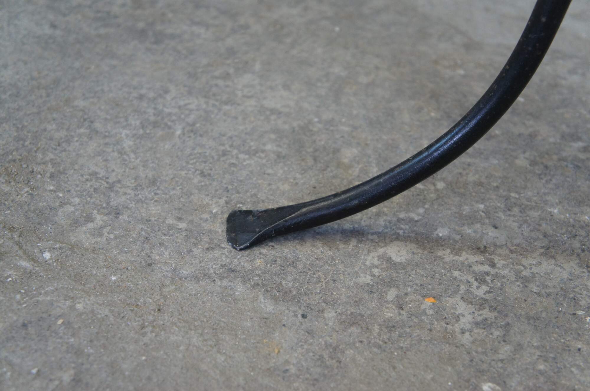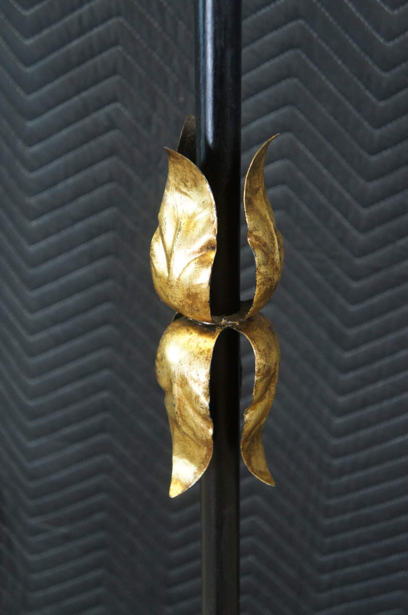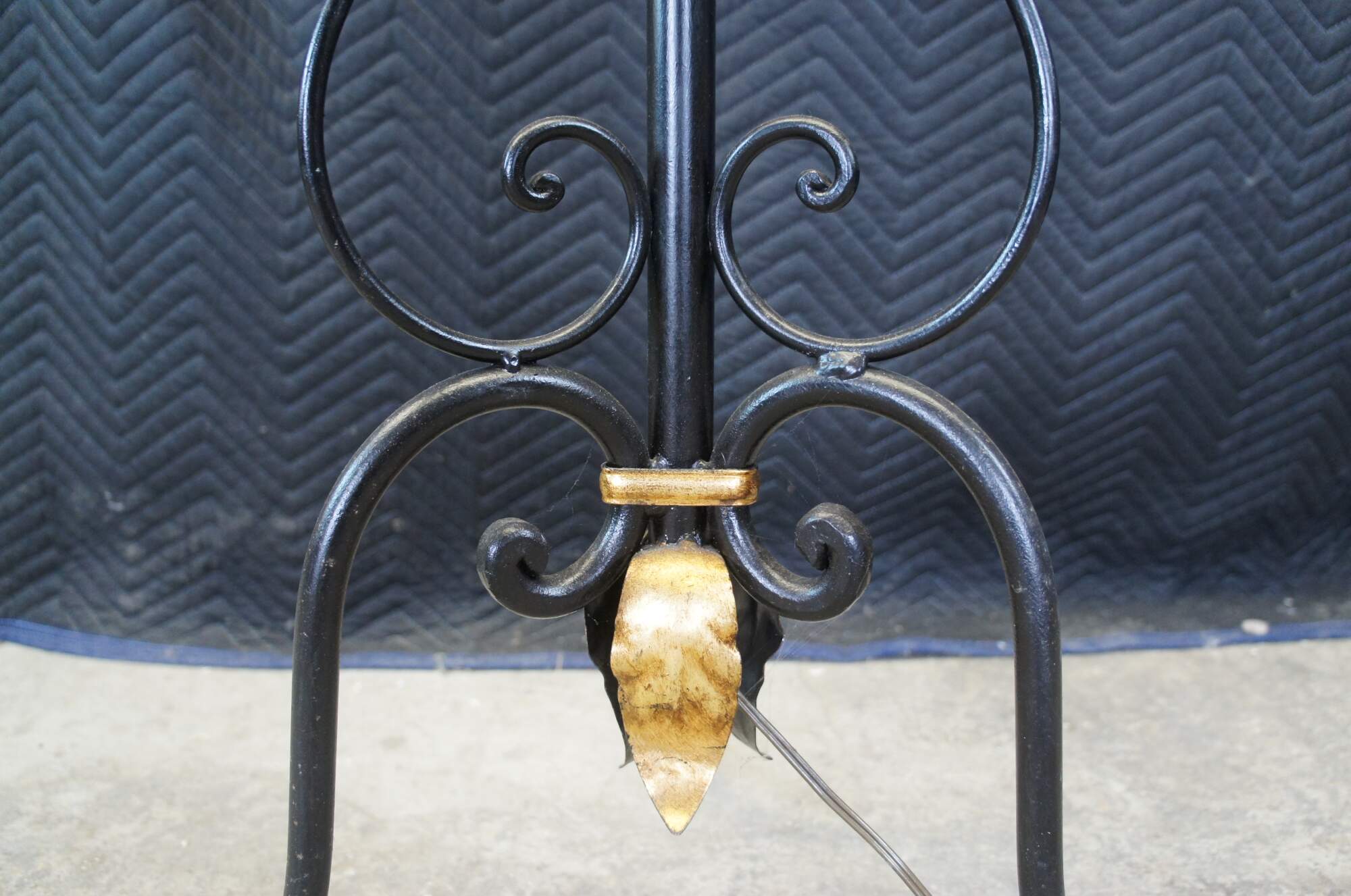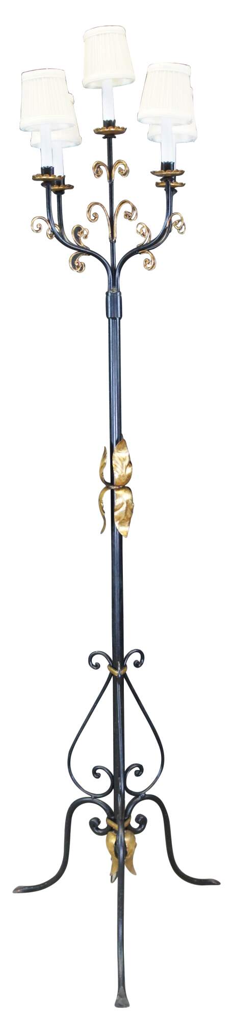 Tall vintage French Gothic Revival five light floor lamp featuring scrolled black iron with gold acanthus accents and a five arm candlestick candelabra.