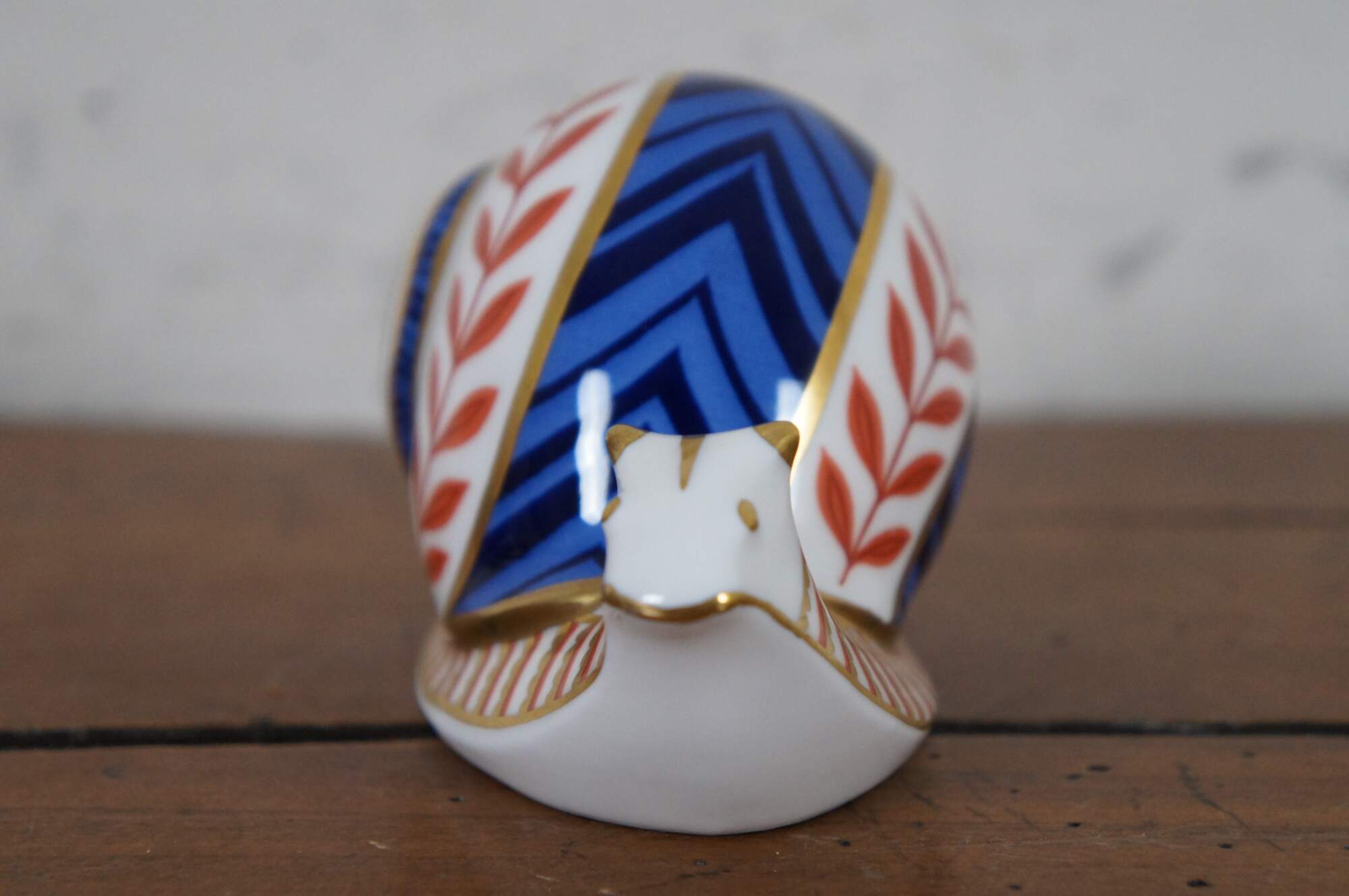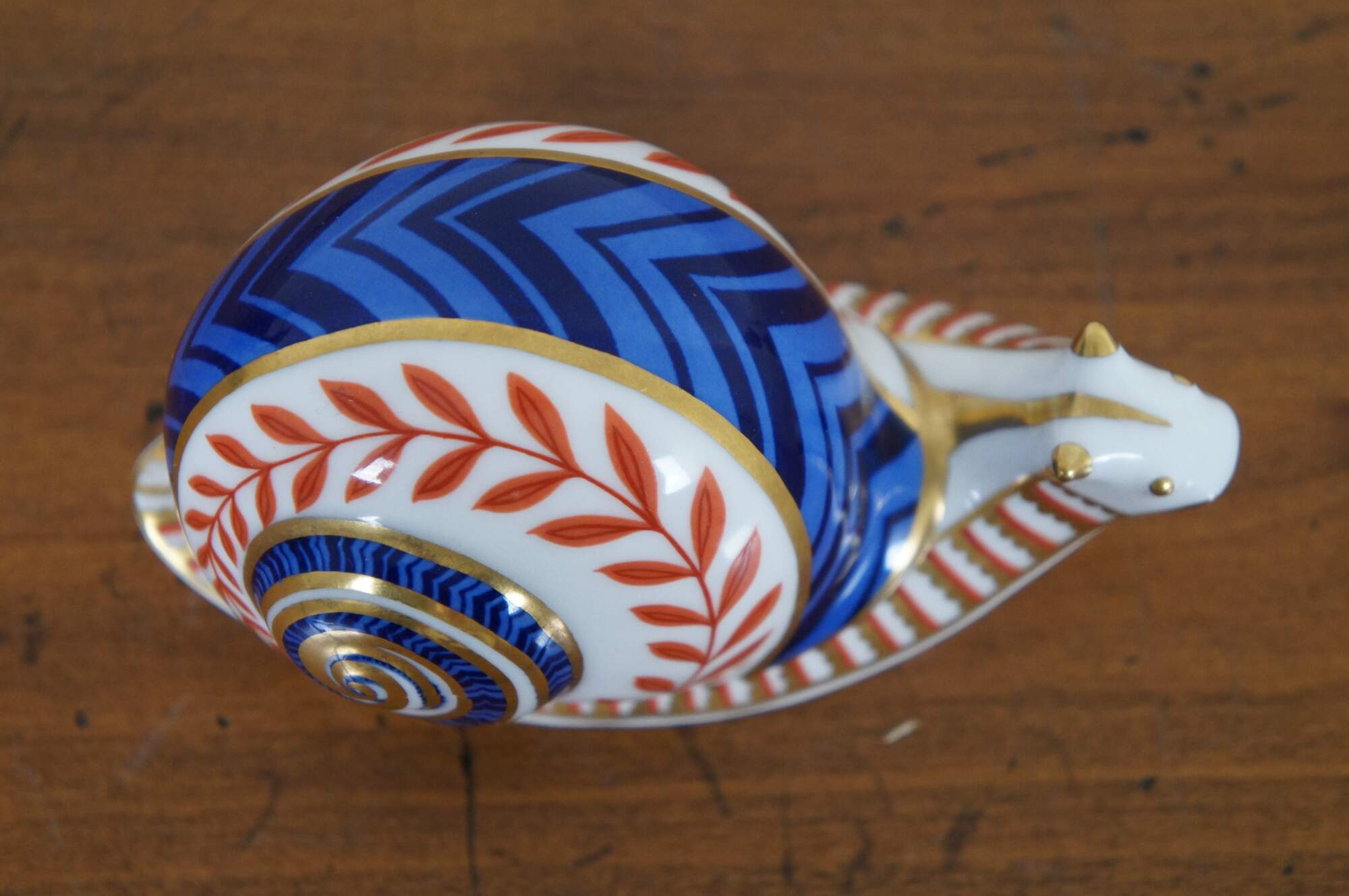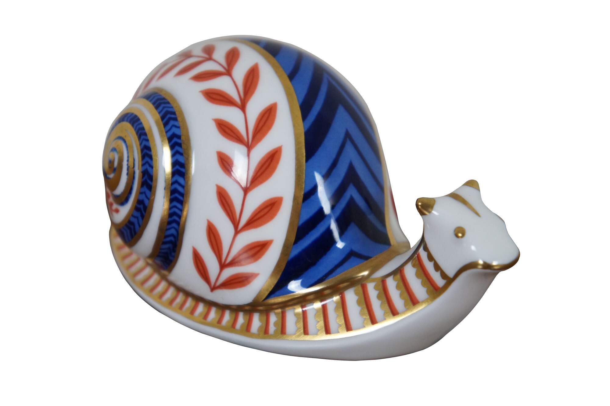 Vintage 1st edition Royal Crown Derby English Bone China porcelain snail figurine / paperweight, painted in rust, cobalt, and gold with imari inspired designs, marked with ceramic stopper.