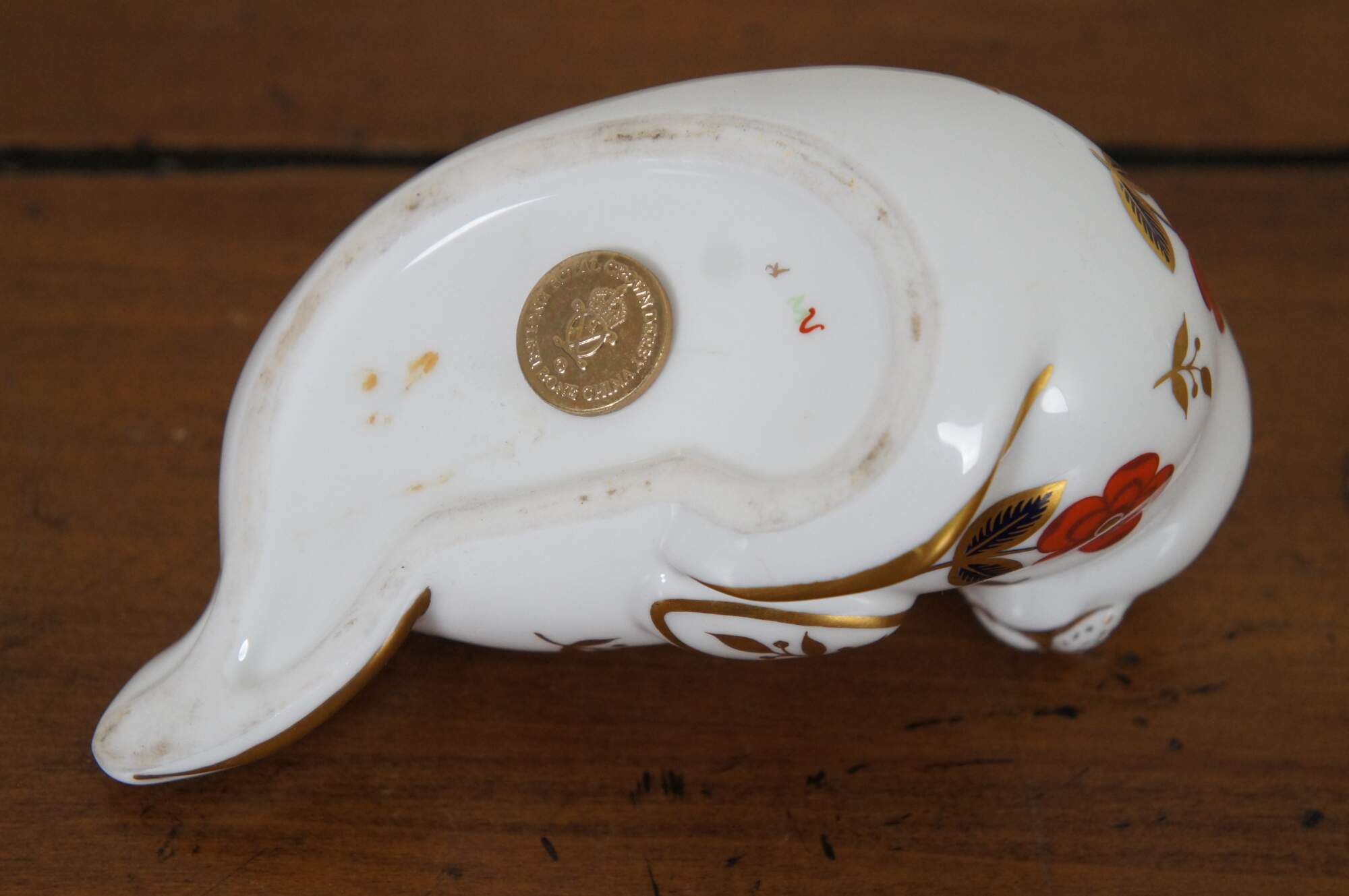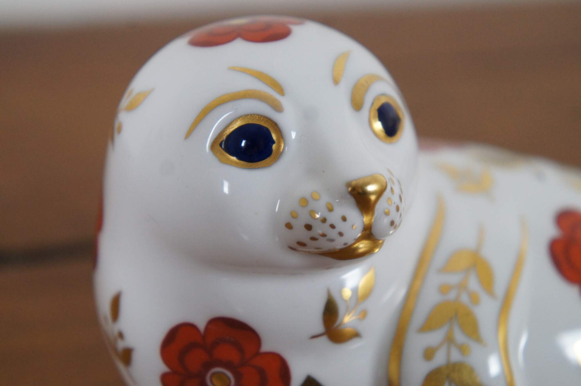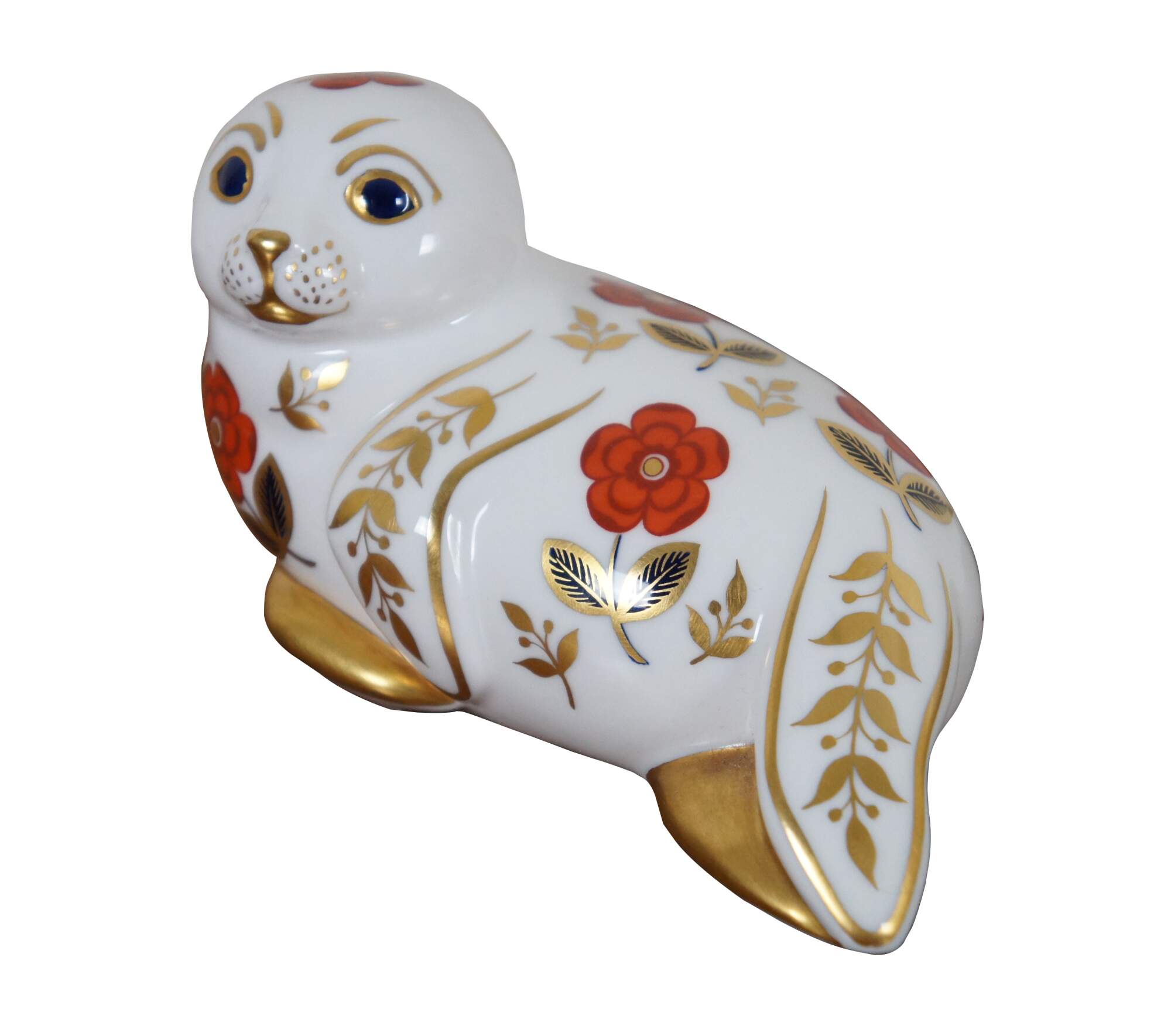 Vintage 1st edition Royal Crown Derby English Bone China porcelain seal figurine / paperweight, painting in rust, gold and cobalt with imari inspired designs, marked with gold stopper.