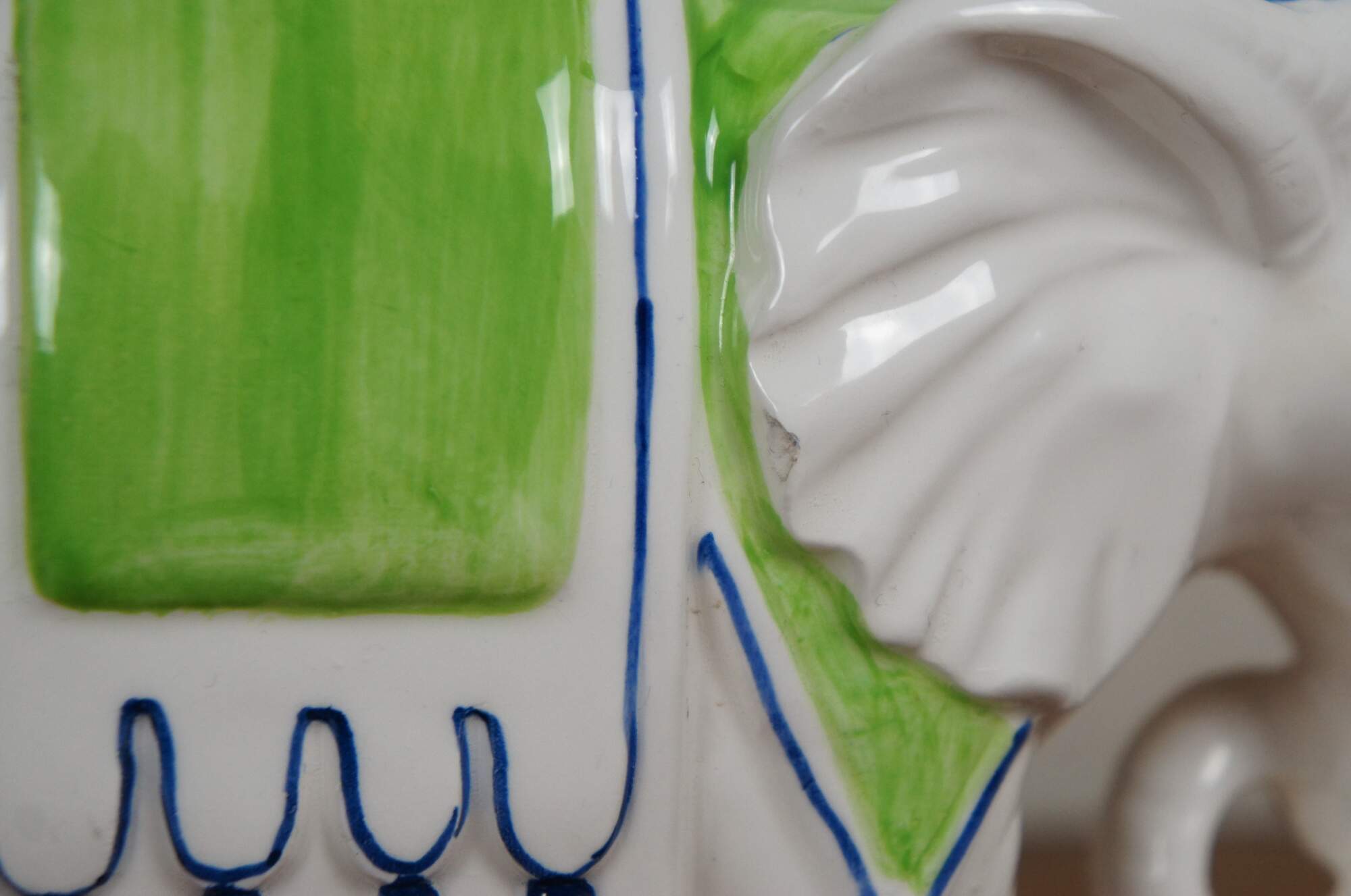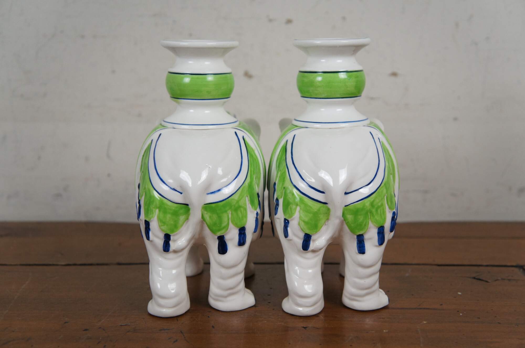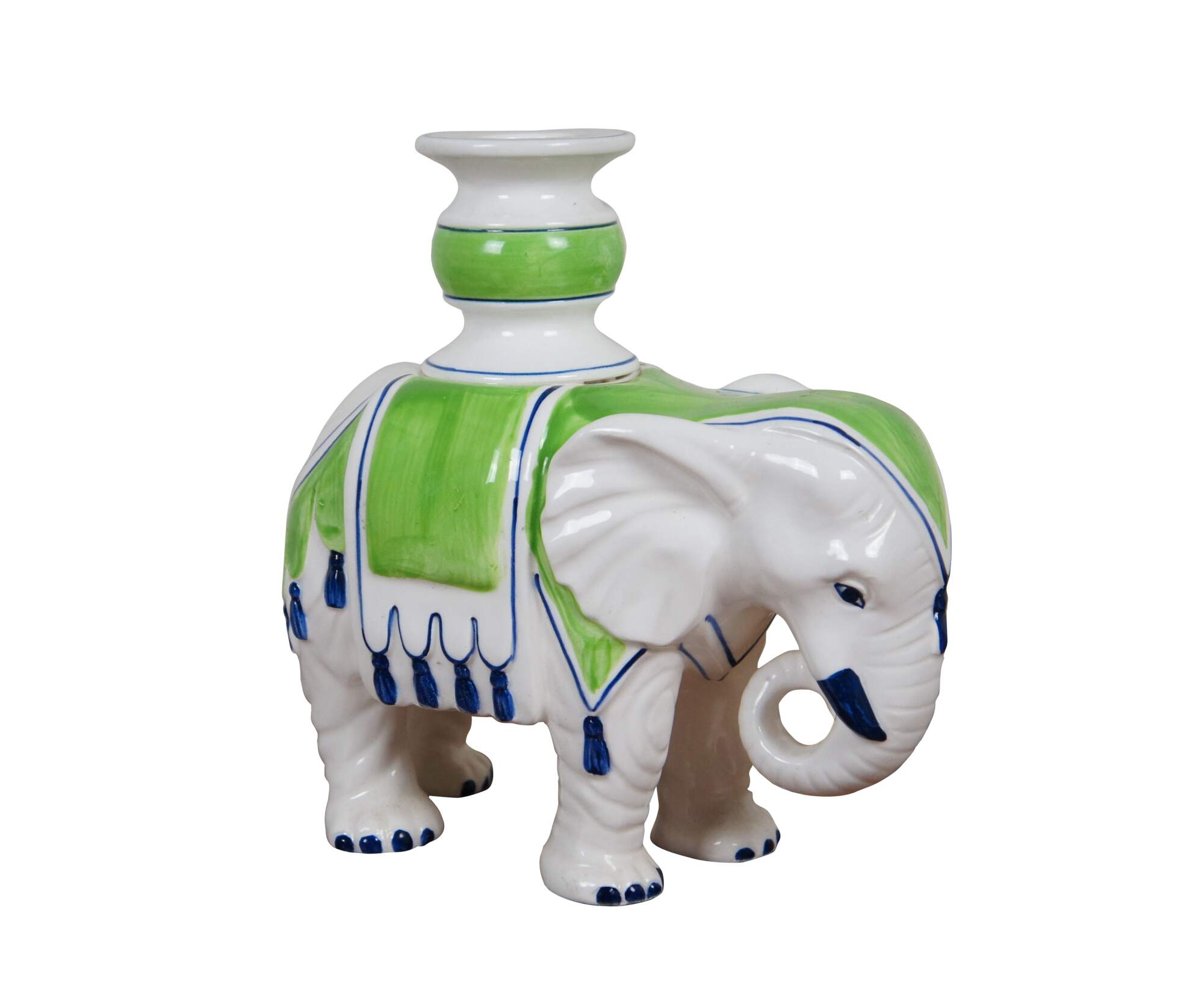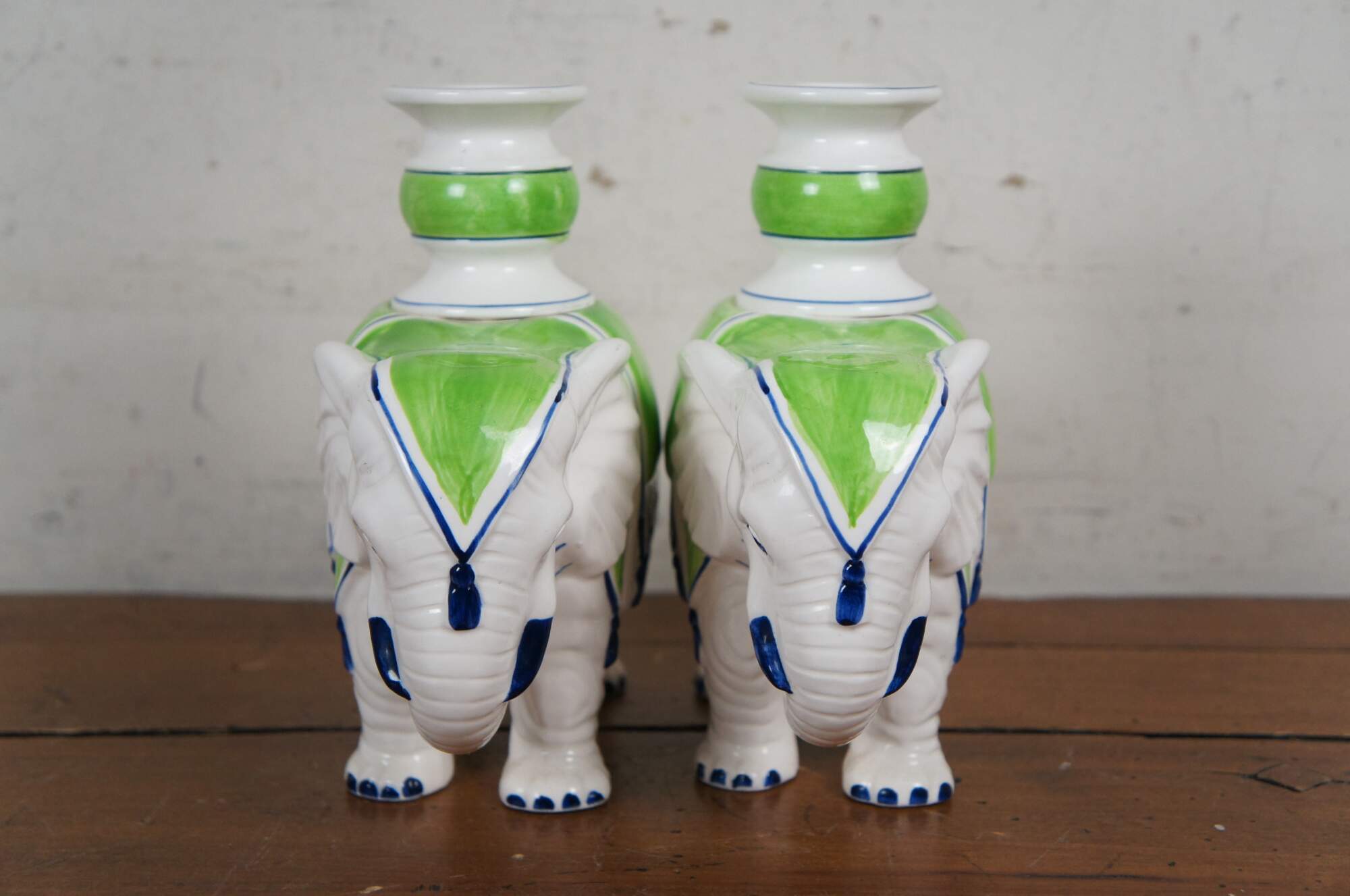 Circa 1970's Fitz & Floyd chinoiserie style white porcelain single taper candlestick holders in the shape of Indian elephants with curled trunks, draped in lime green saddlecloths with cobalt blue trim / details. Made in Japan.