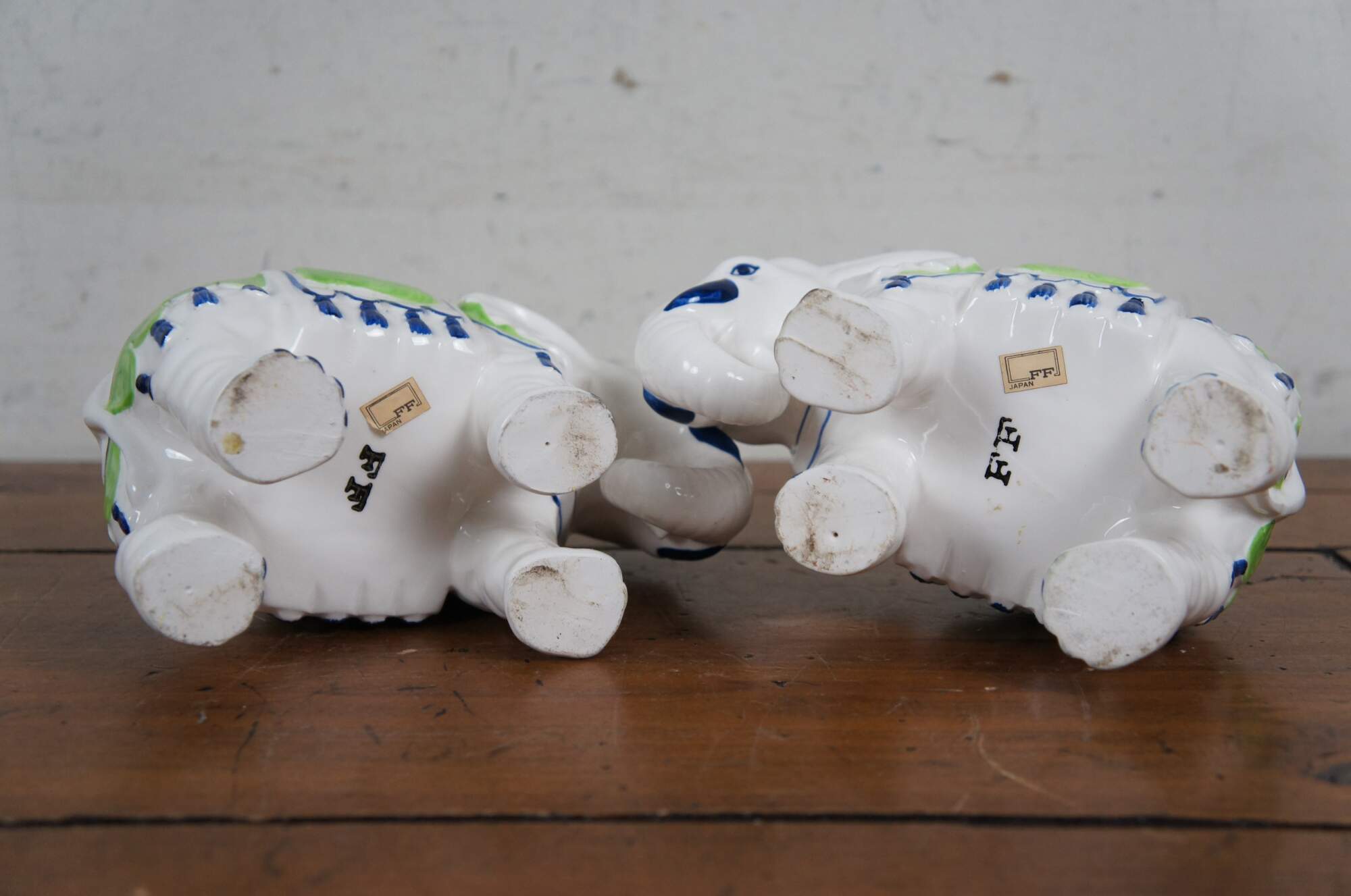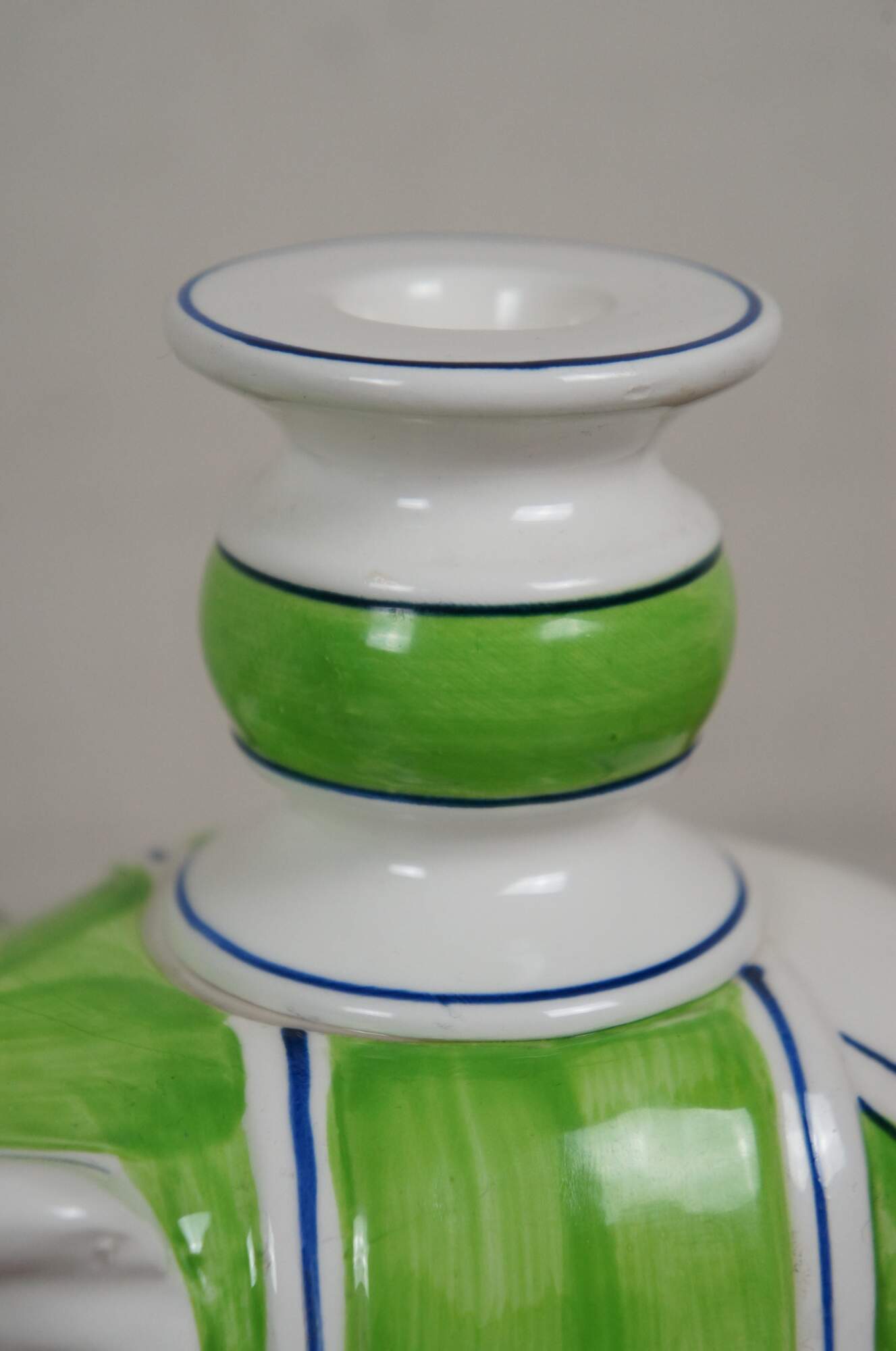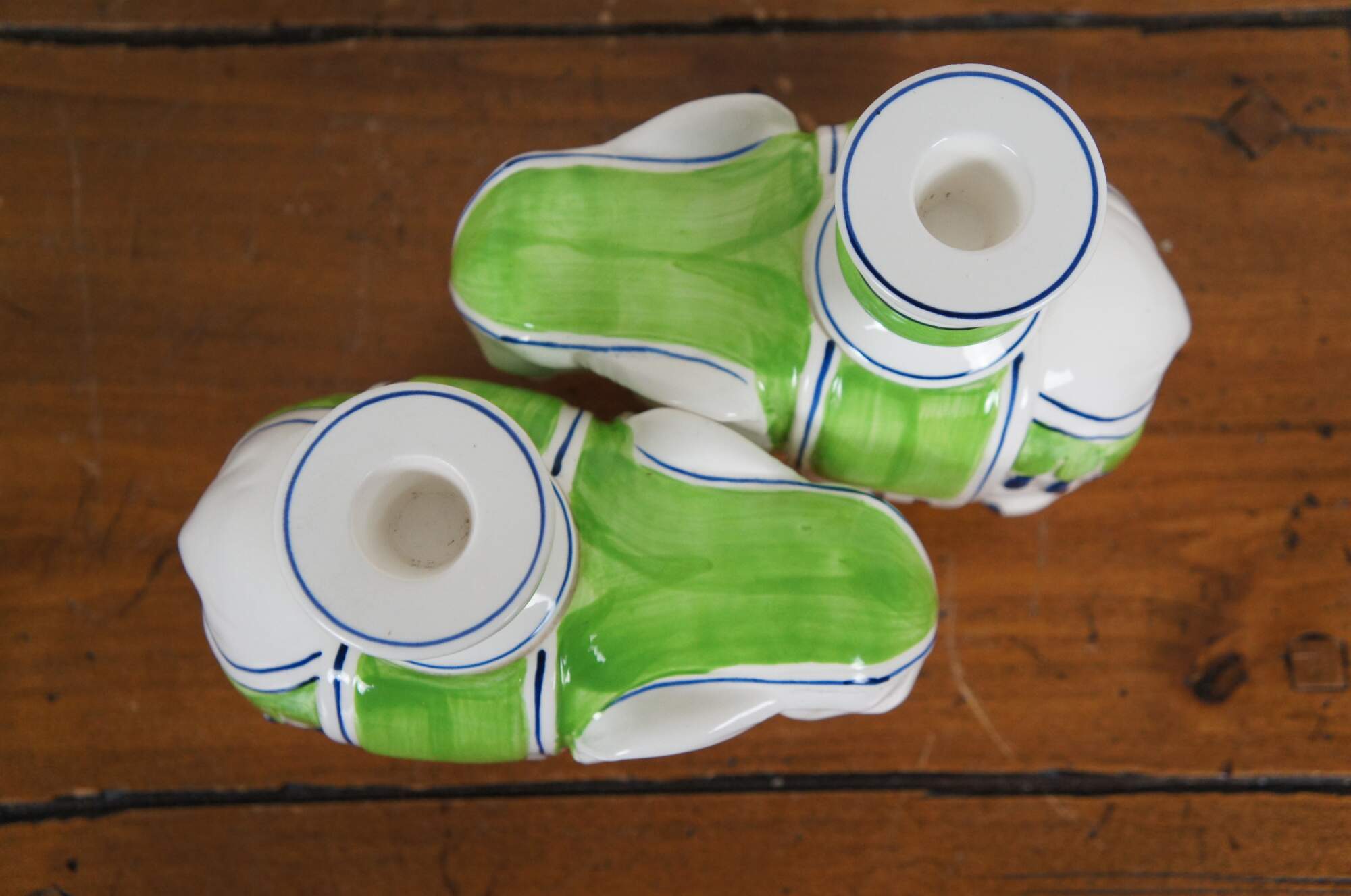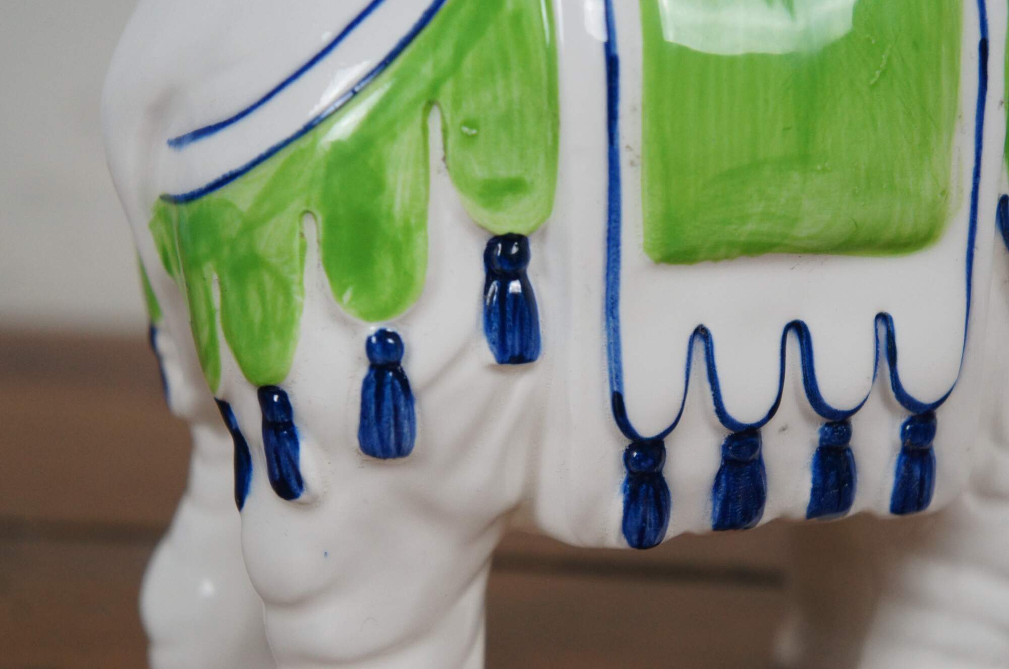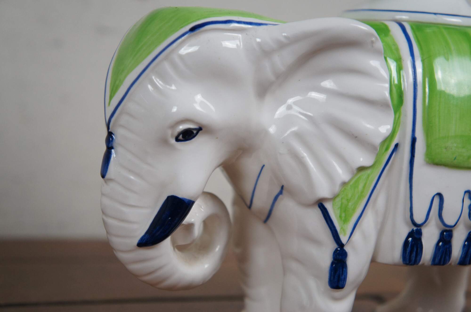 Circa 1970's Fitz & Floyd chinoiserie style white porcelain single taper candlestick holders in the shape of Indian elephants with curled trunks, draped in lime green saddlecloths with cobalt blue trim / details. Made in Japan.