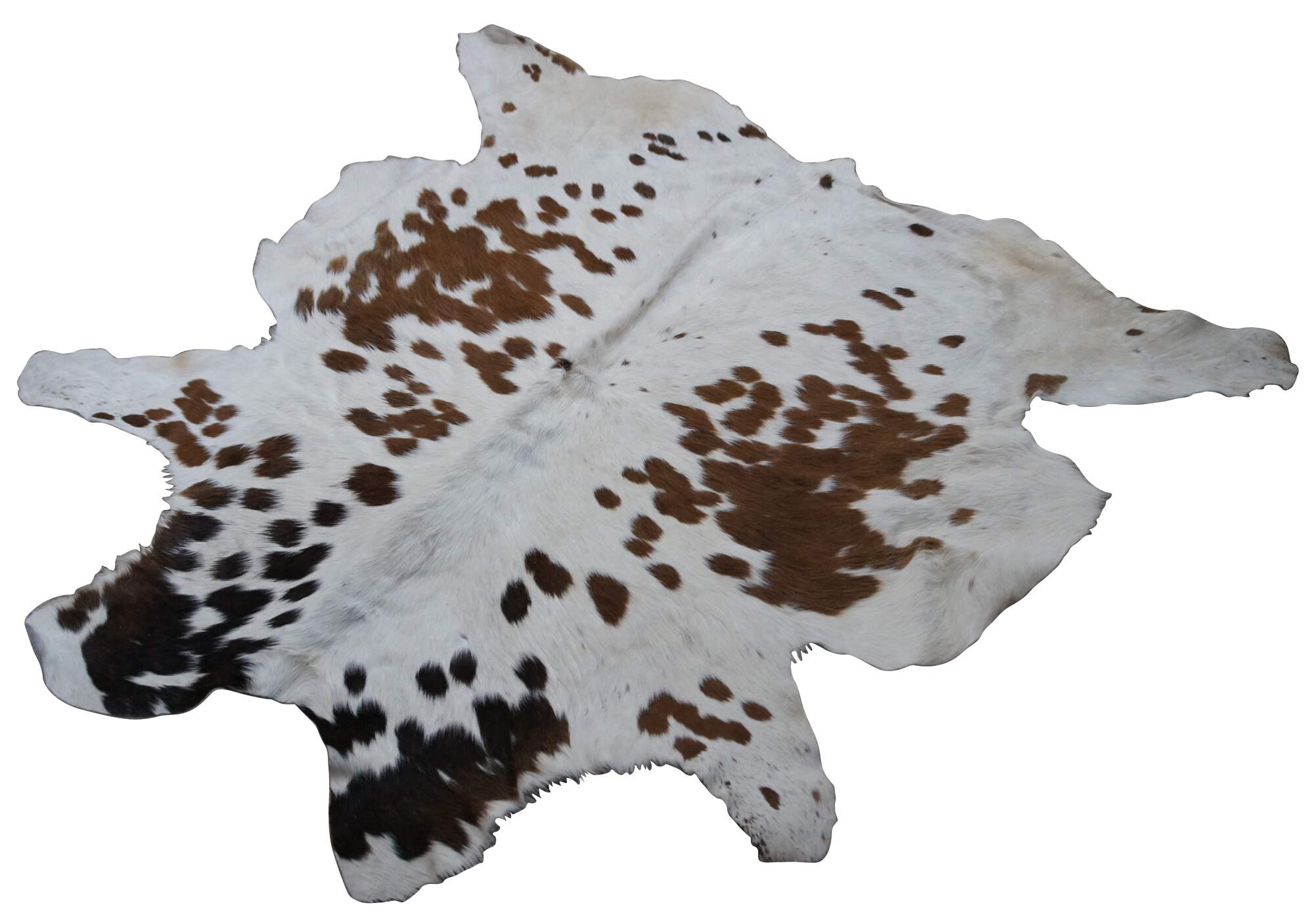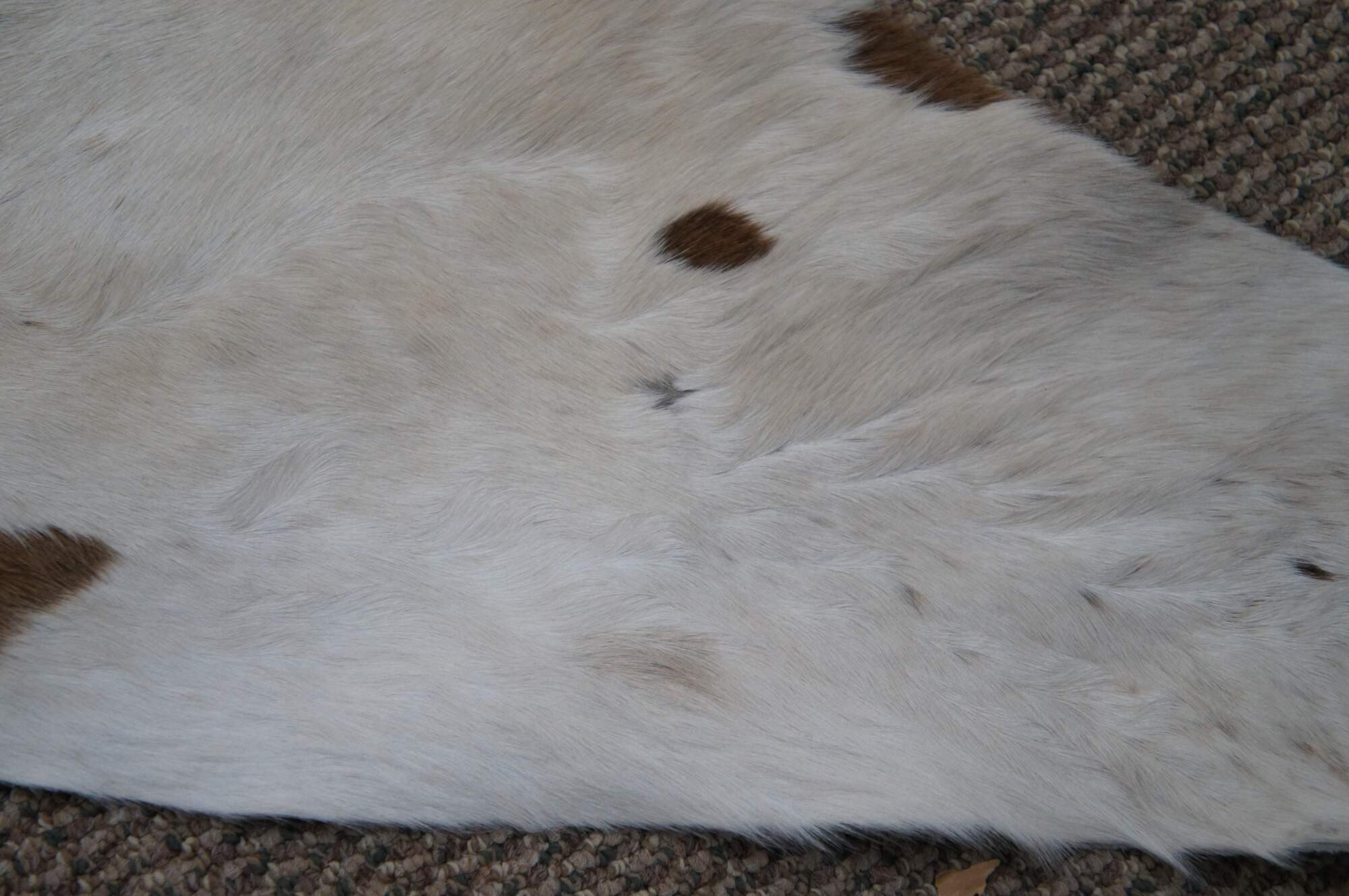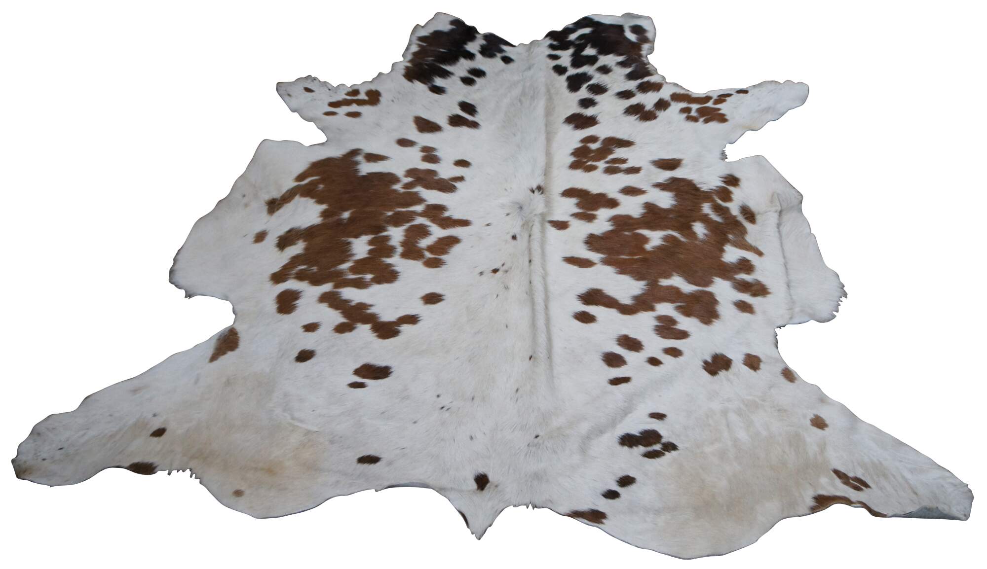 Vintage brown and white spotted cow hide rug with pale blue dyed suede back.