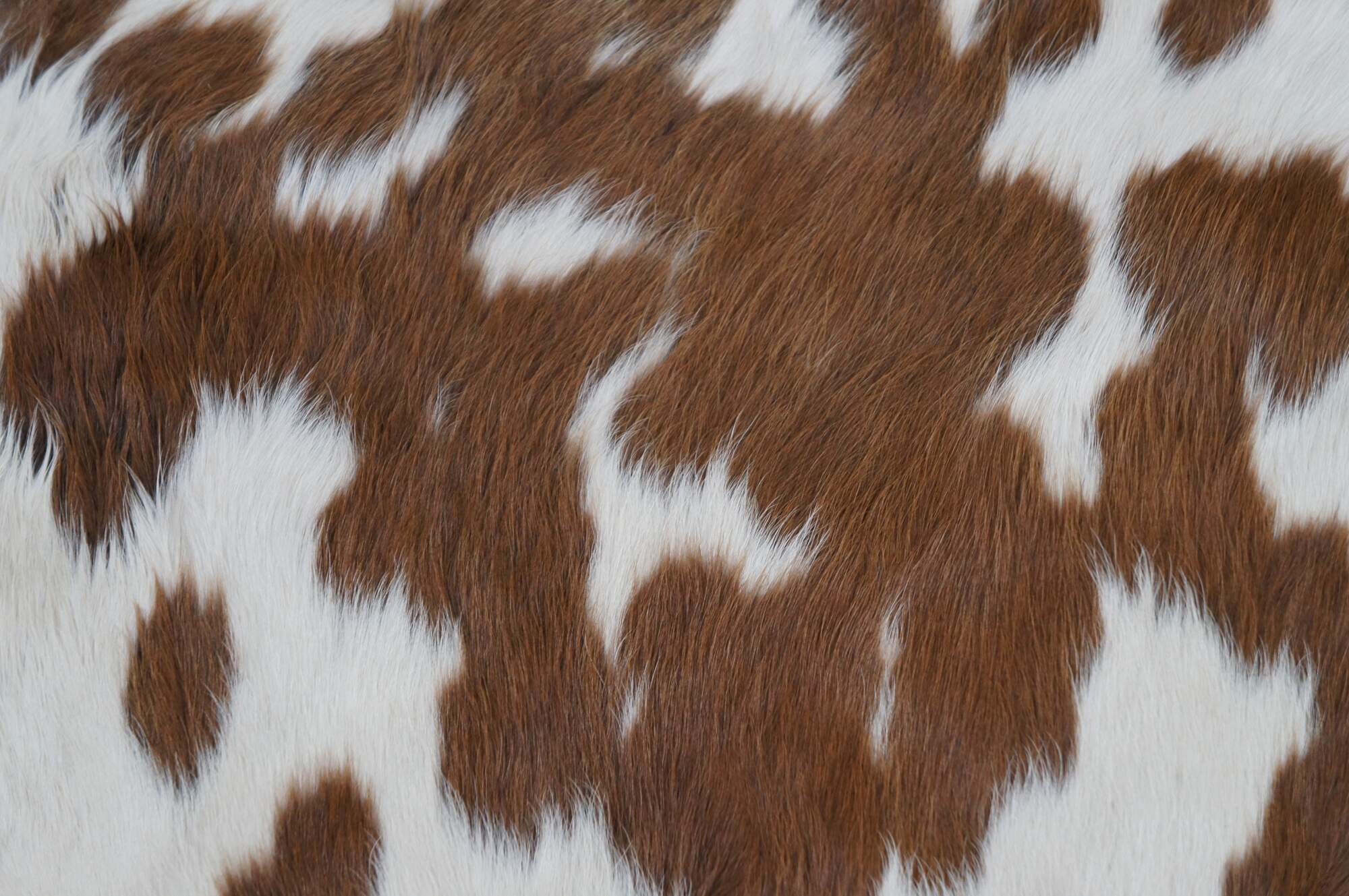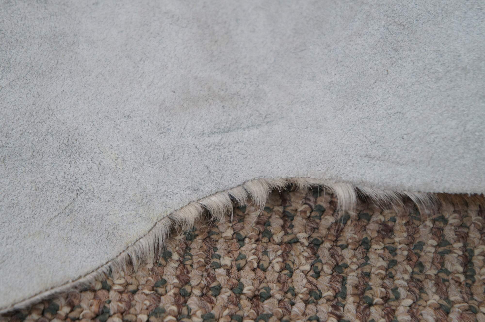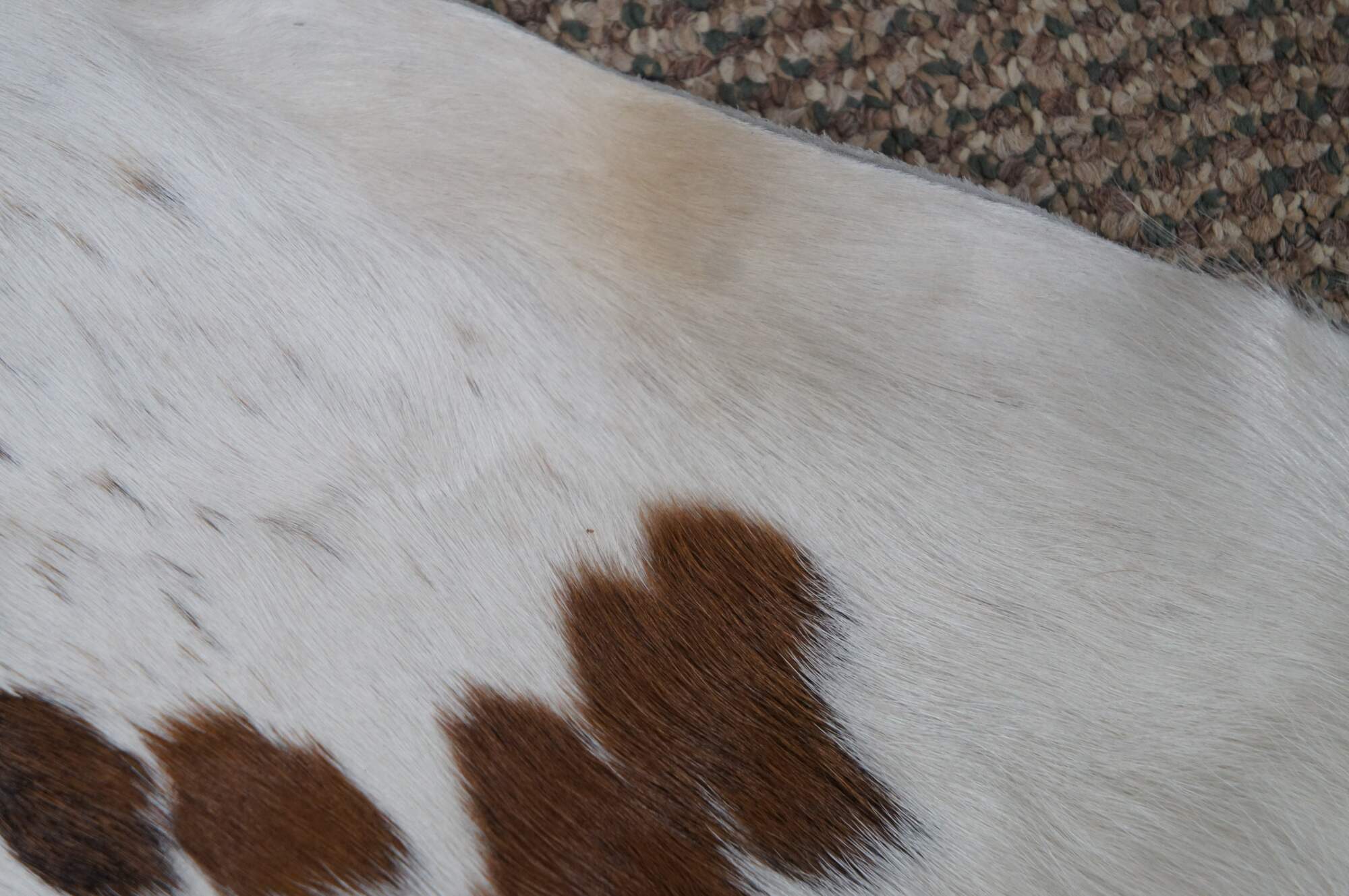 Vintage brown and white spotted cow hide rug with pale blue dyed suede back.