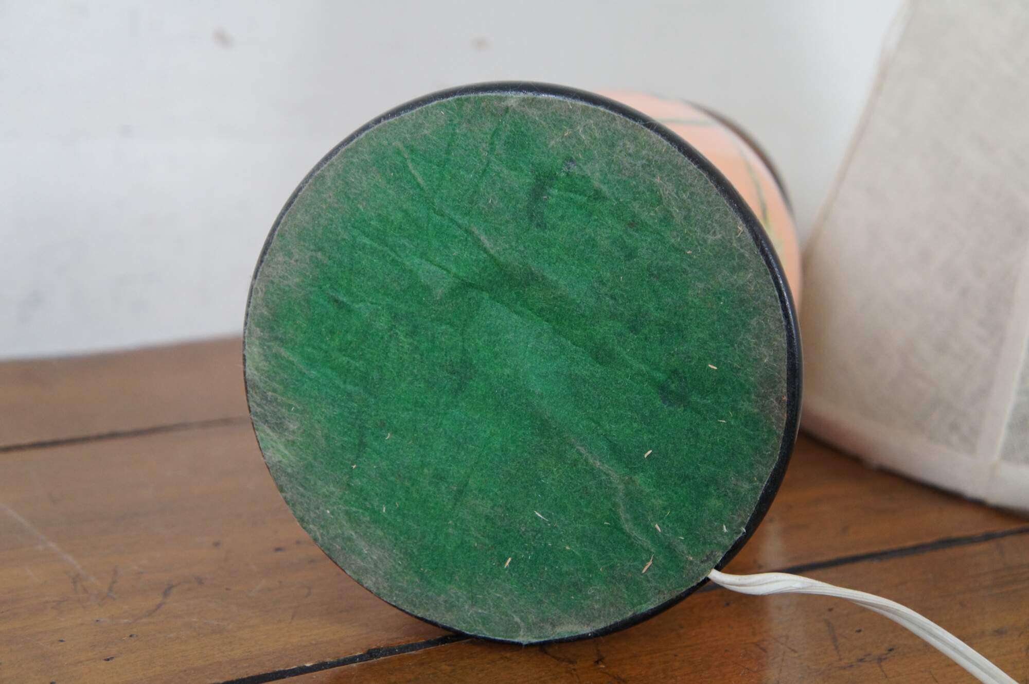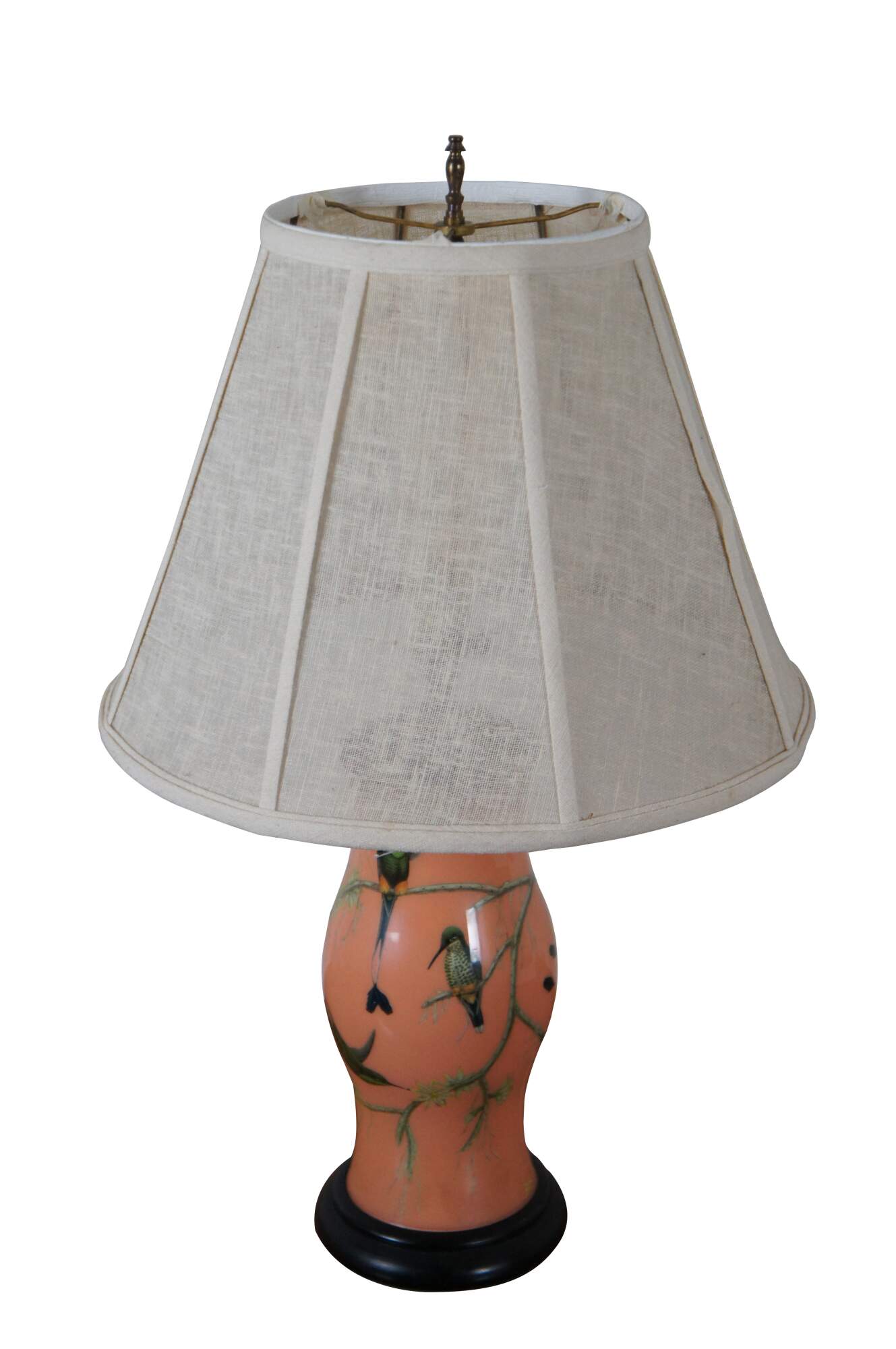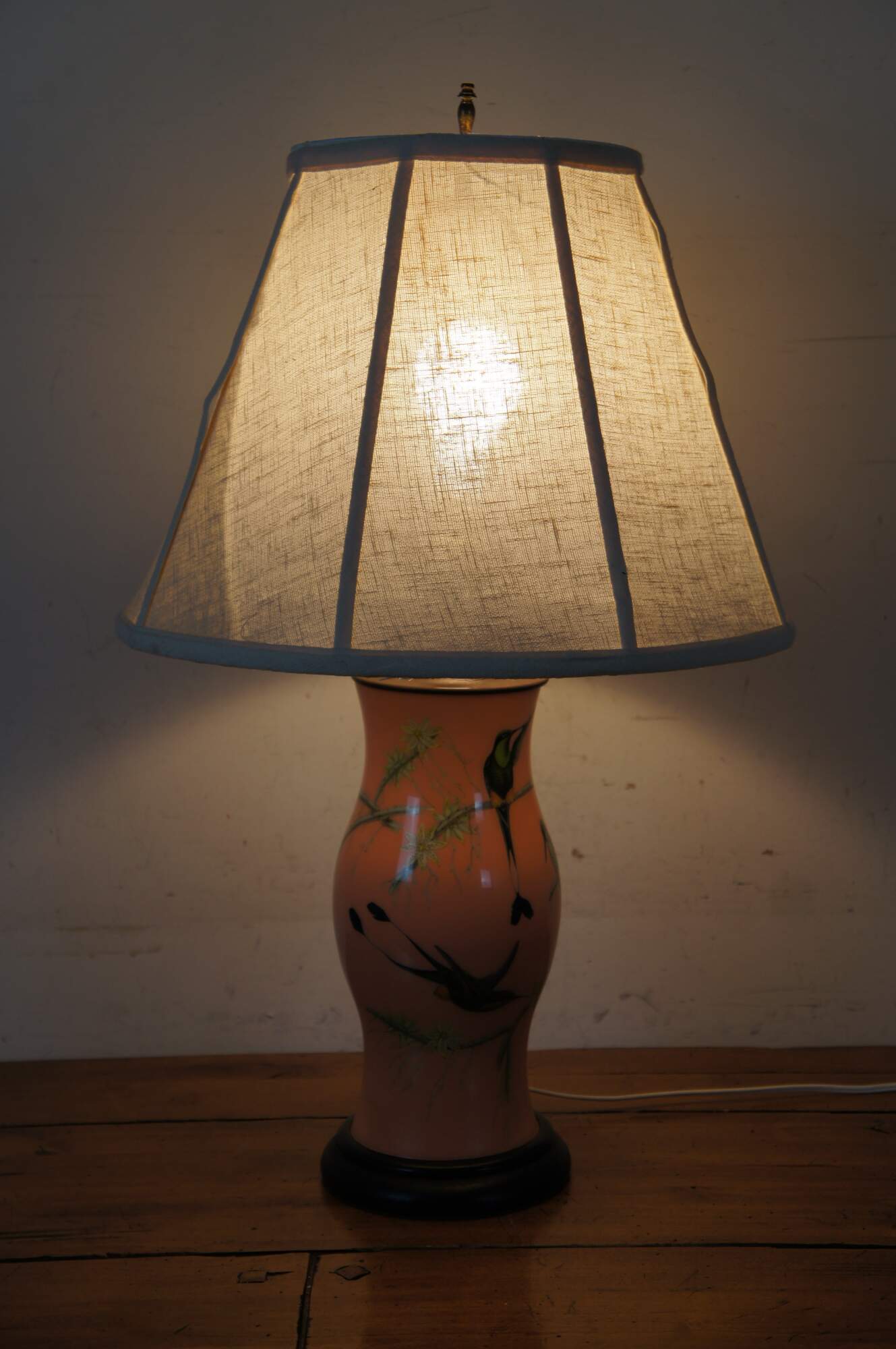 An intriguing glass table, circa last quarter 20th century. Features a peach / pink glass center with hummingbird lithograph scene. The lamp is centered on a wooden base and has a brass topper and fixture. The shade is linen.