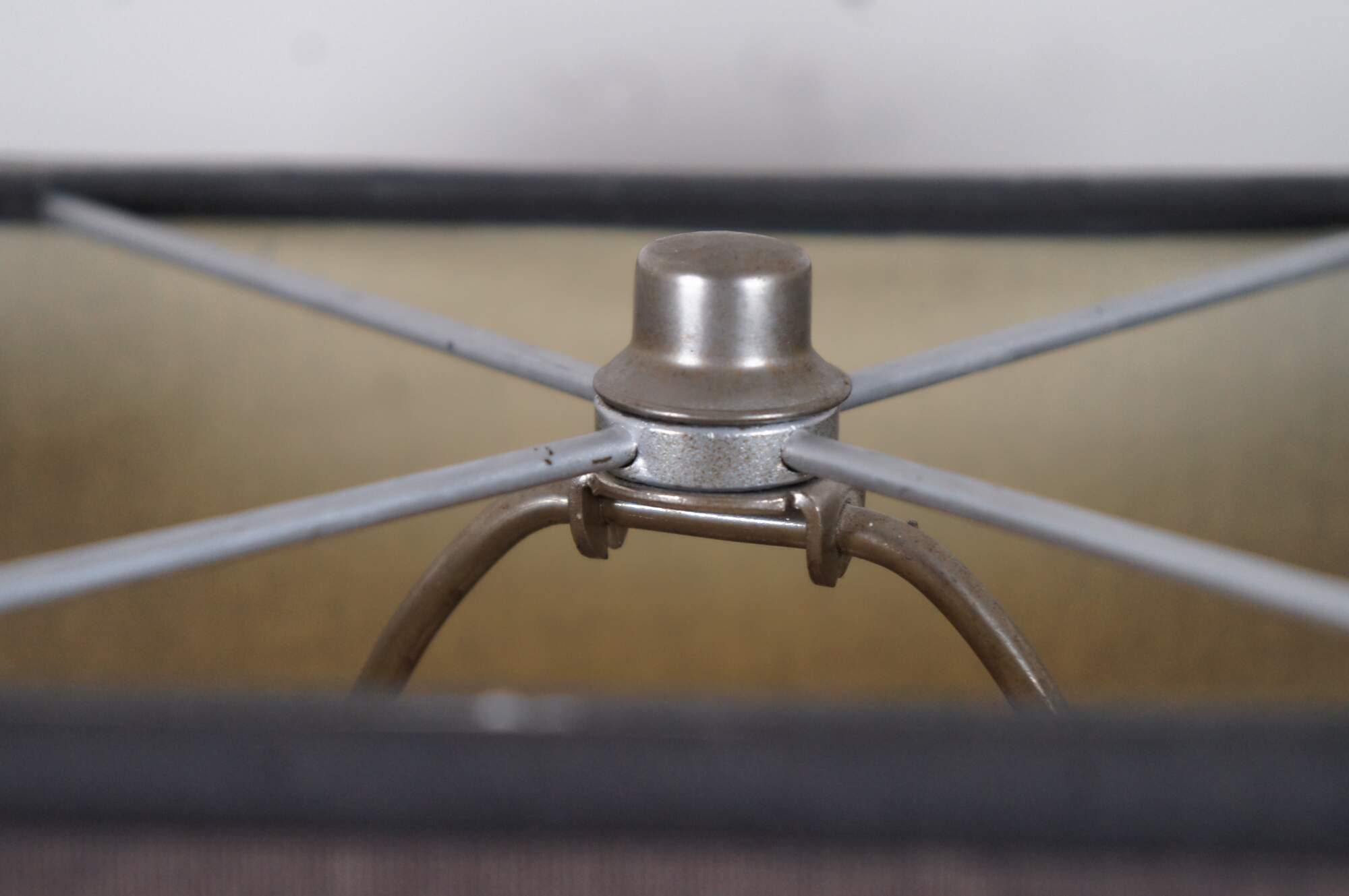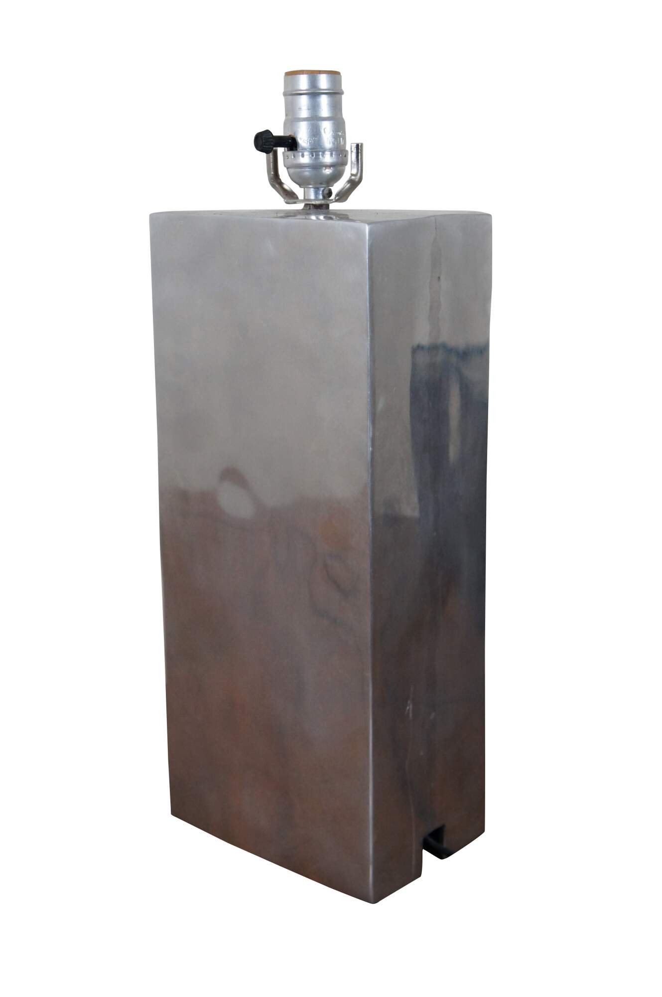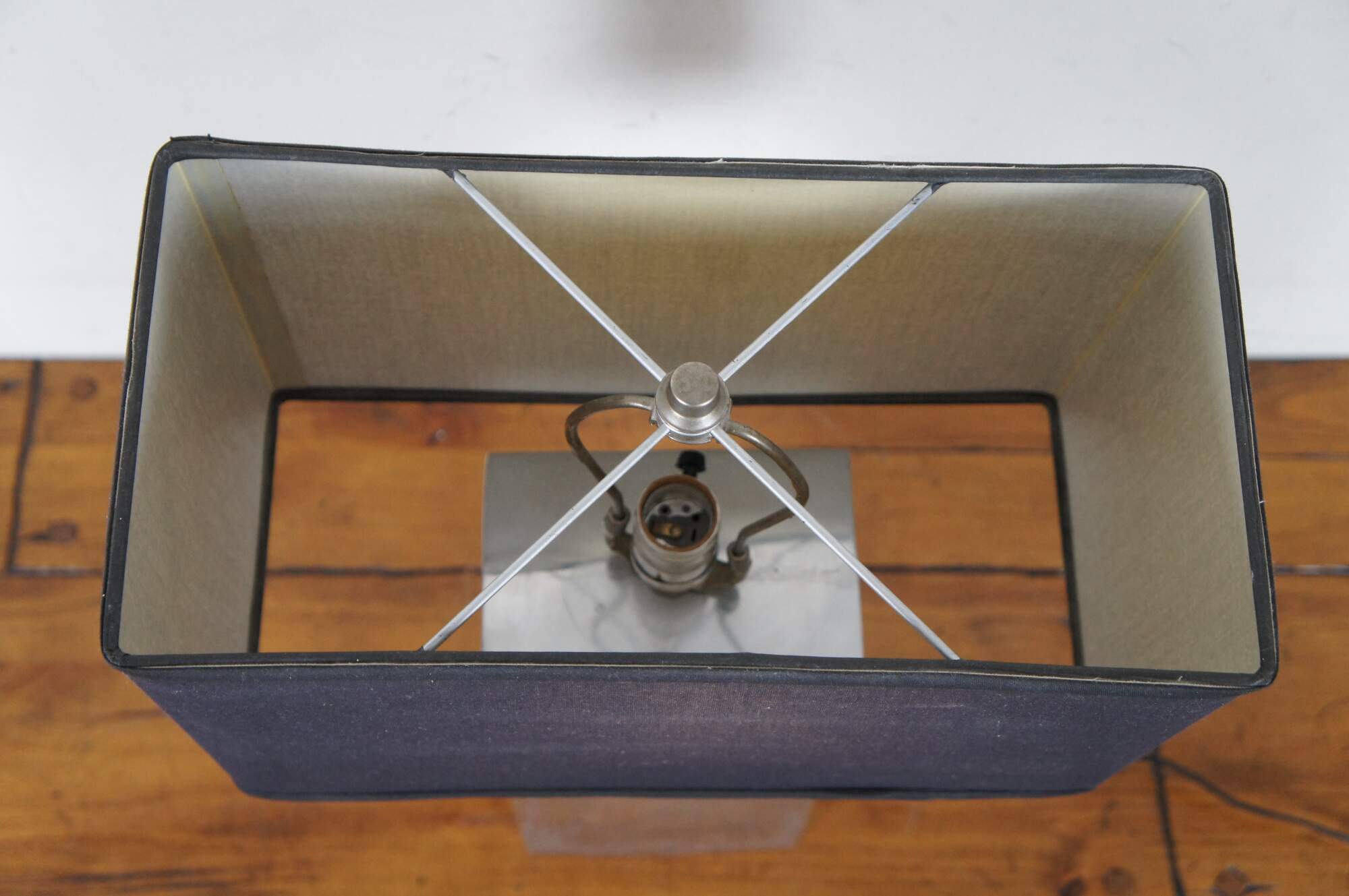 Mid Century modern table lamp by Leonard R. Foss featuring rectangular form with chrome finish and black shade.