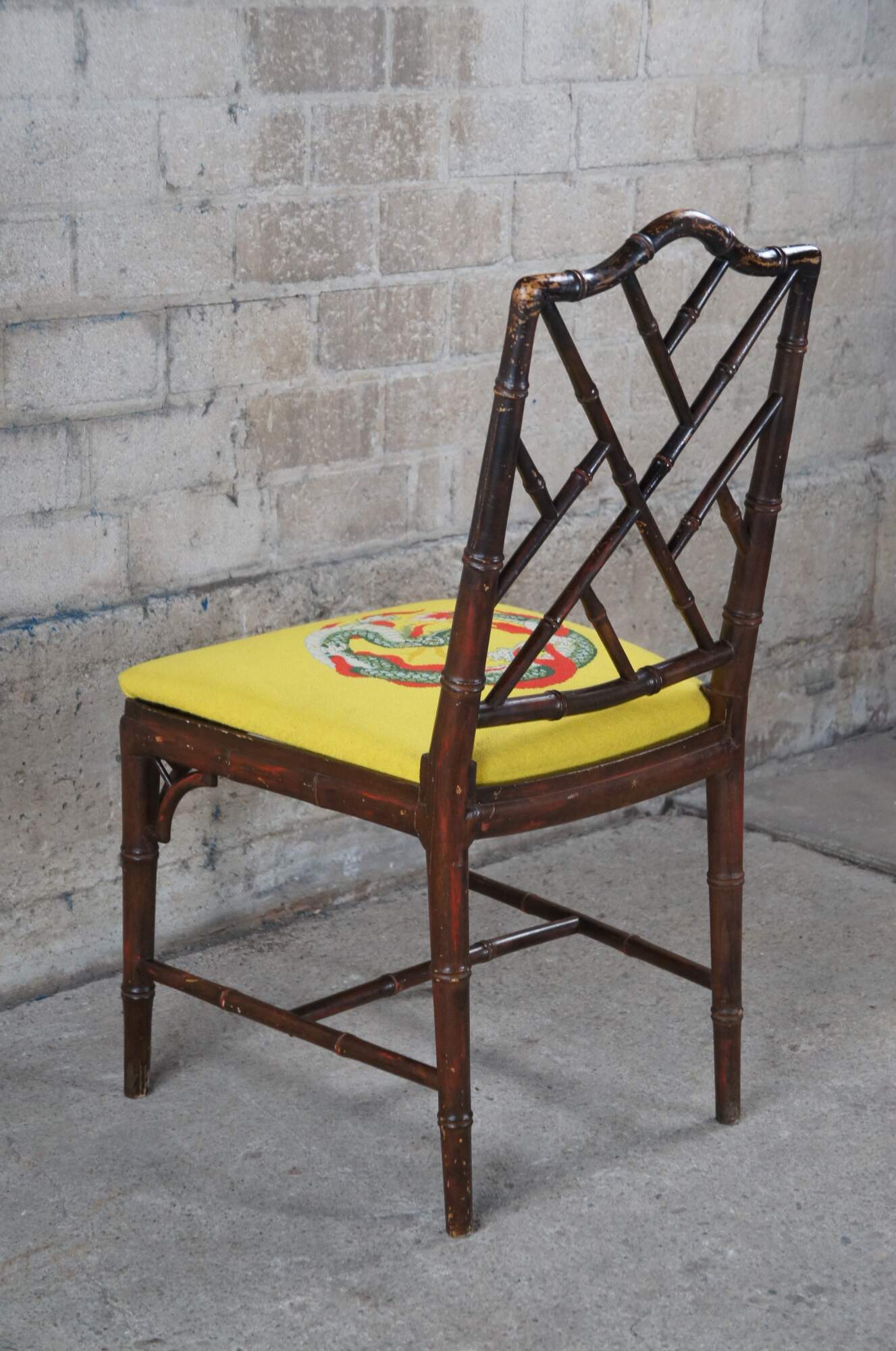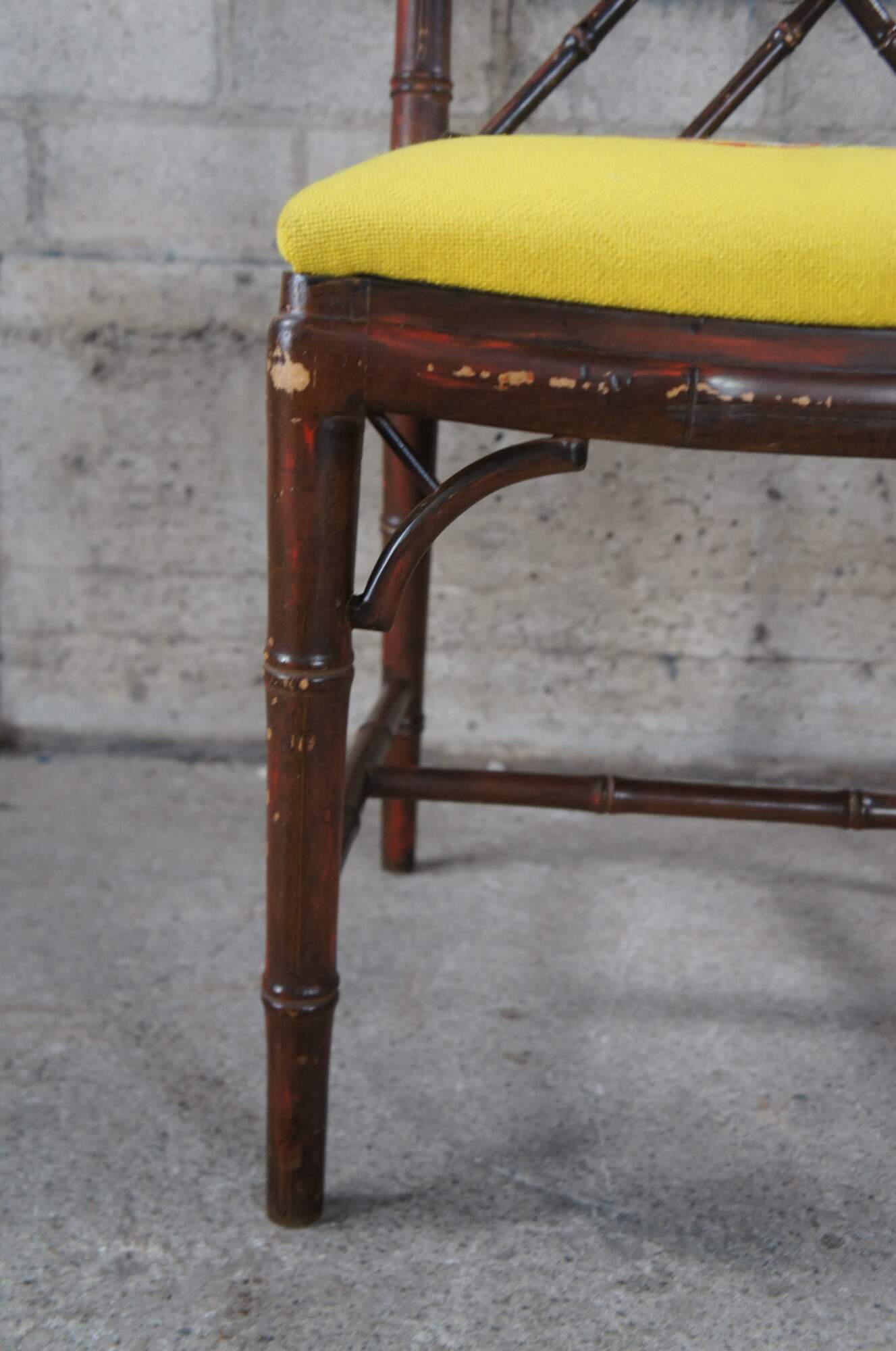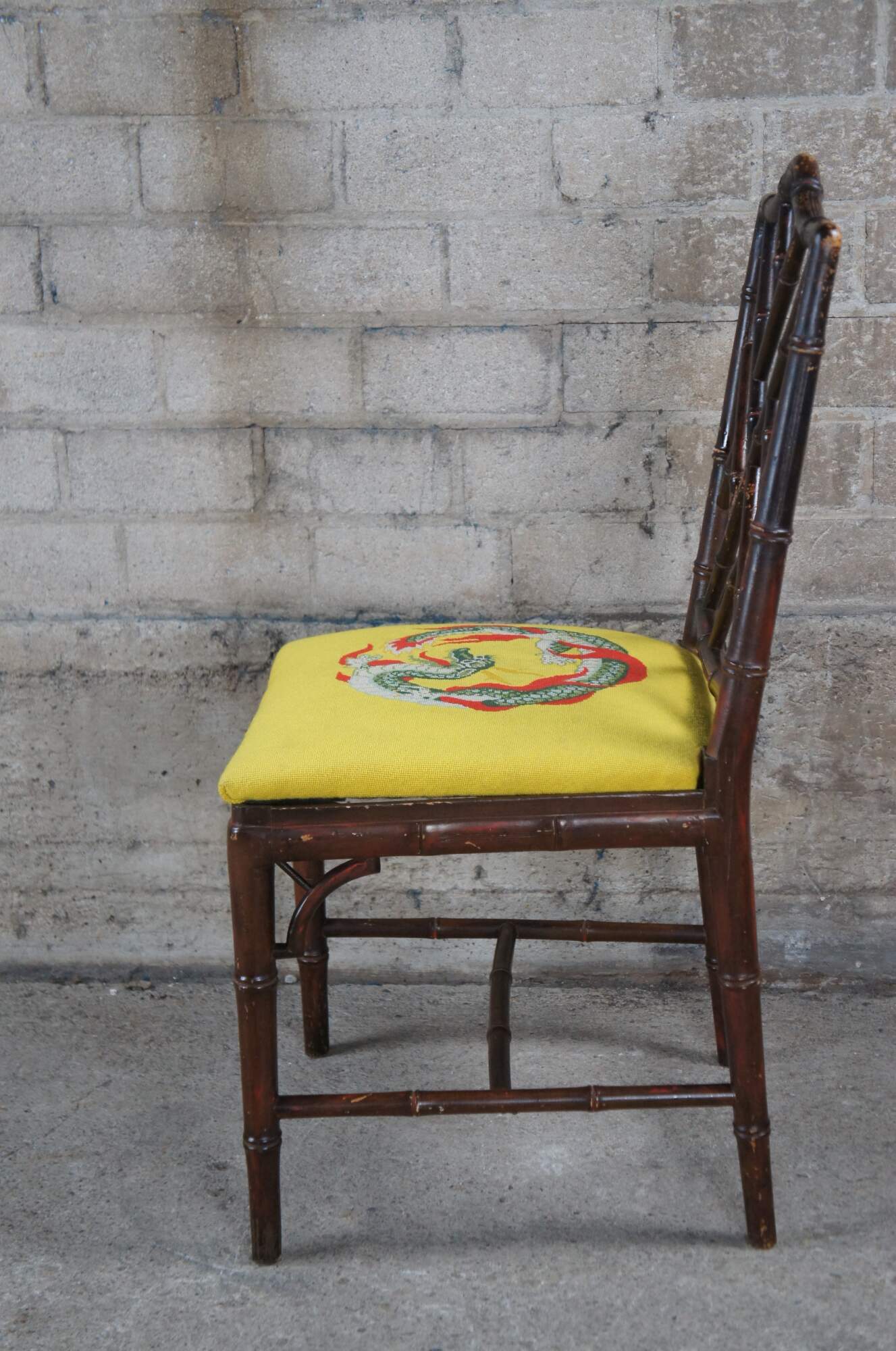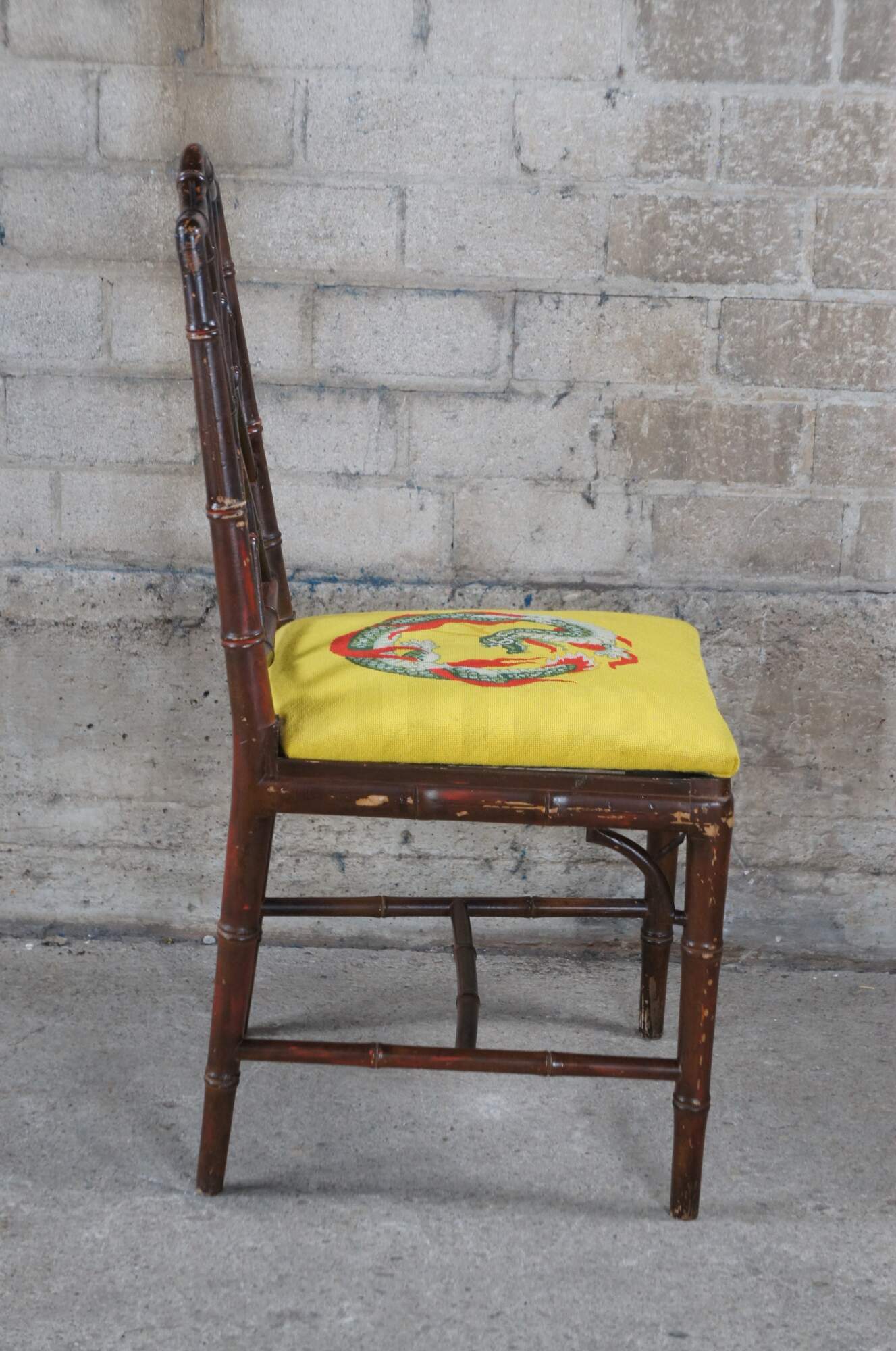 Kindel faux bamboo side chair, circa 1970s. Features a distressed hardwood frame with yellow upholstered dragon seat.