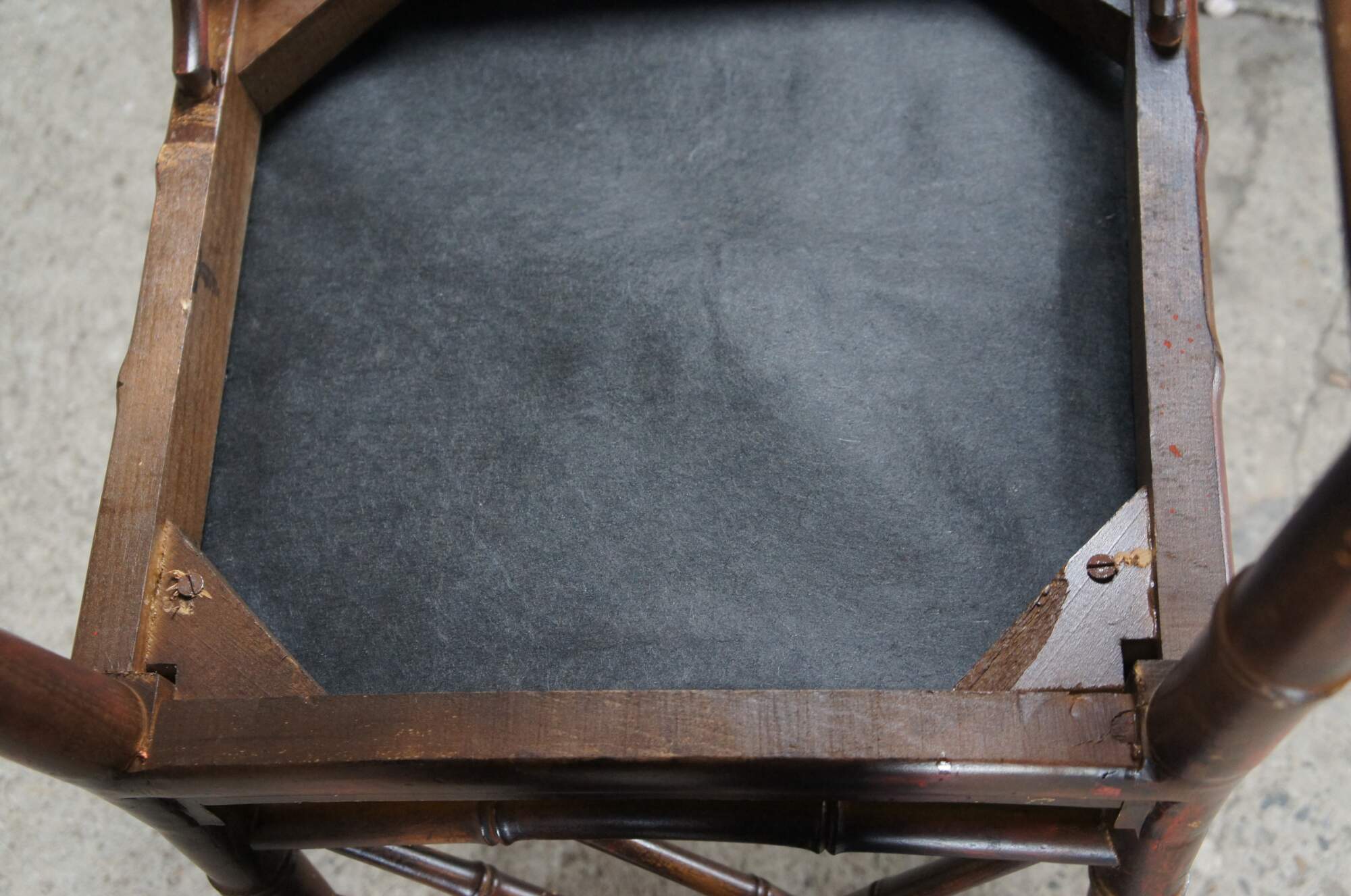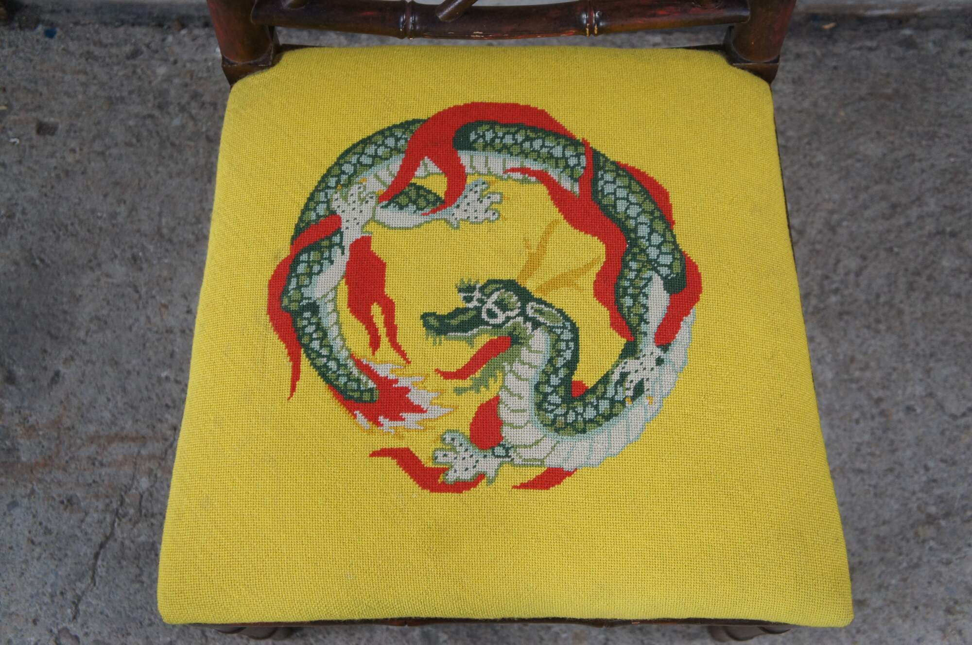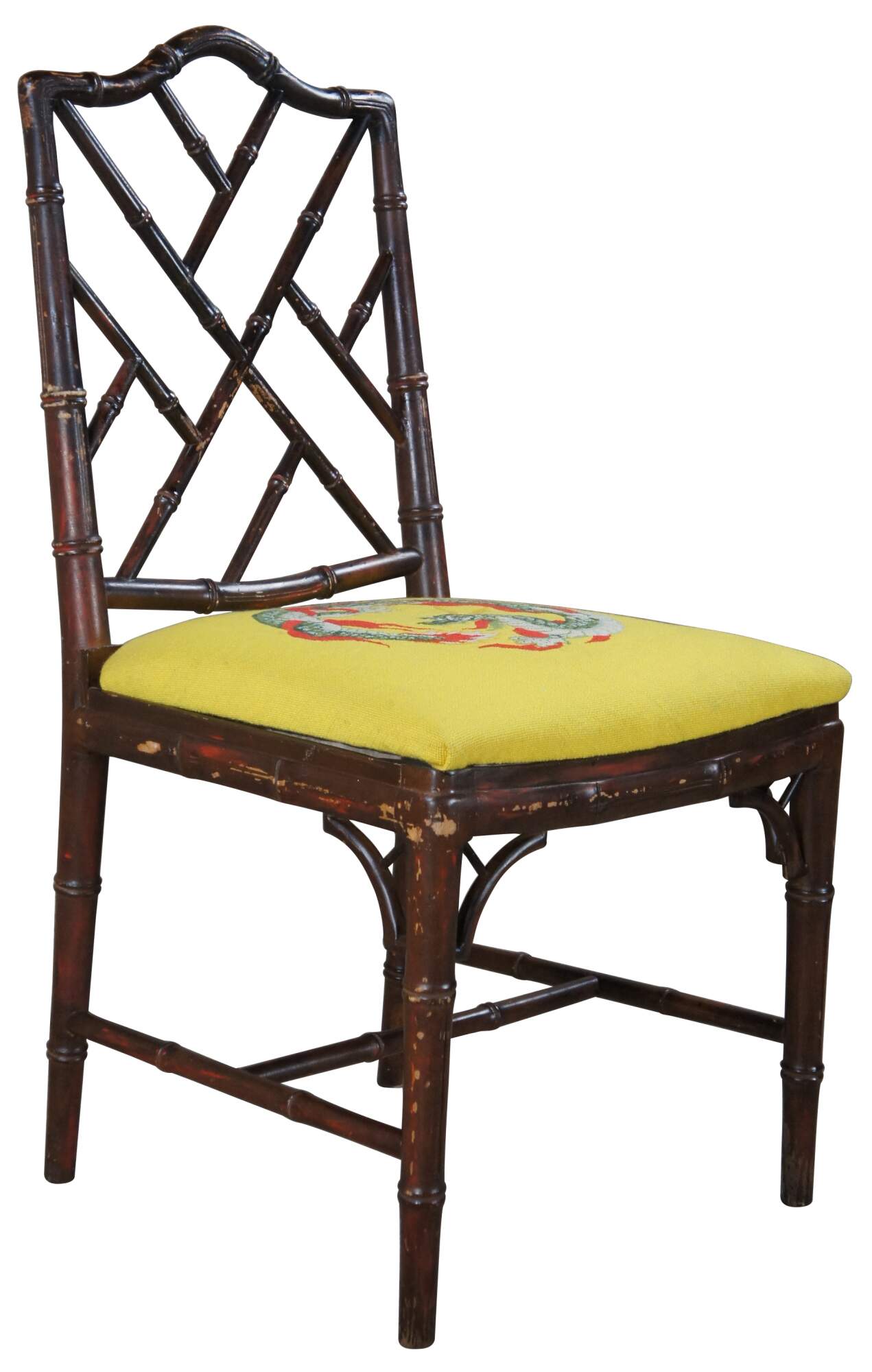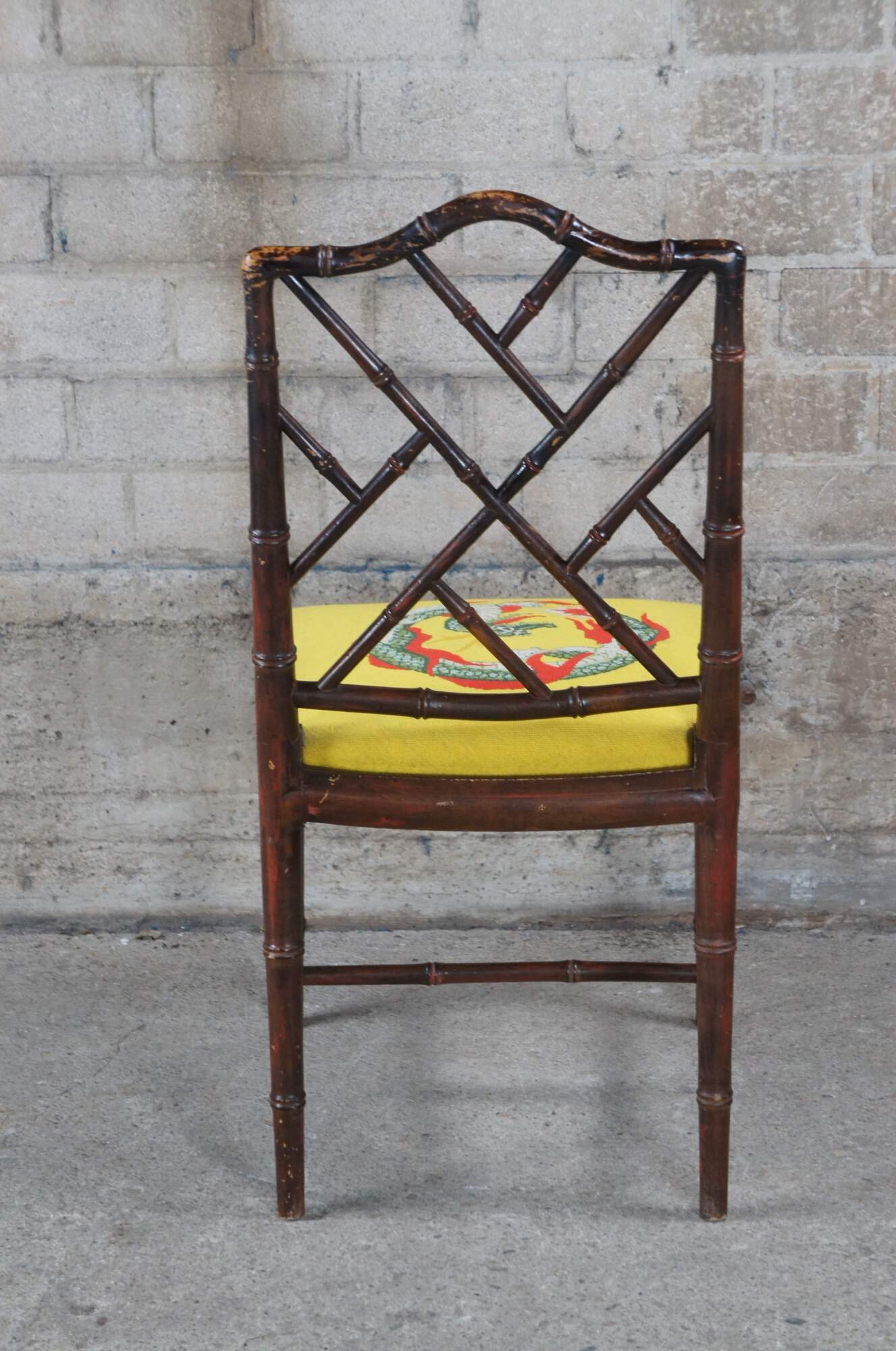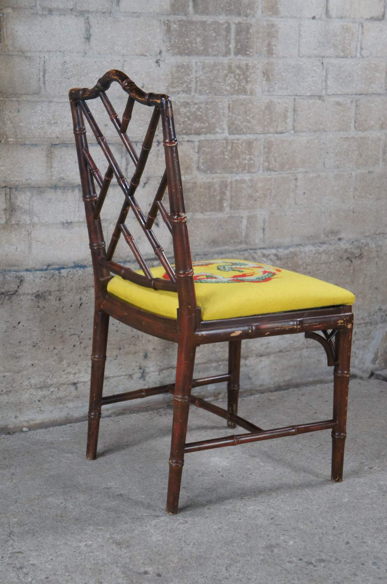 Kindel faux bamboo side chair, circa 1970s. Features a distressed hardwood frame with yellow upholstered dragon seat.