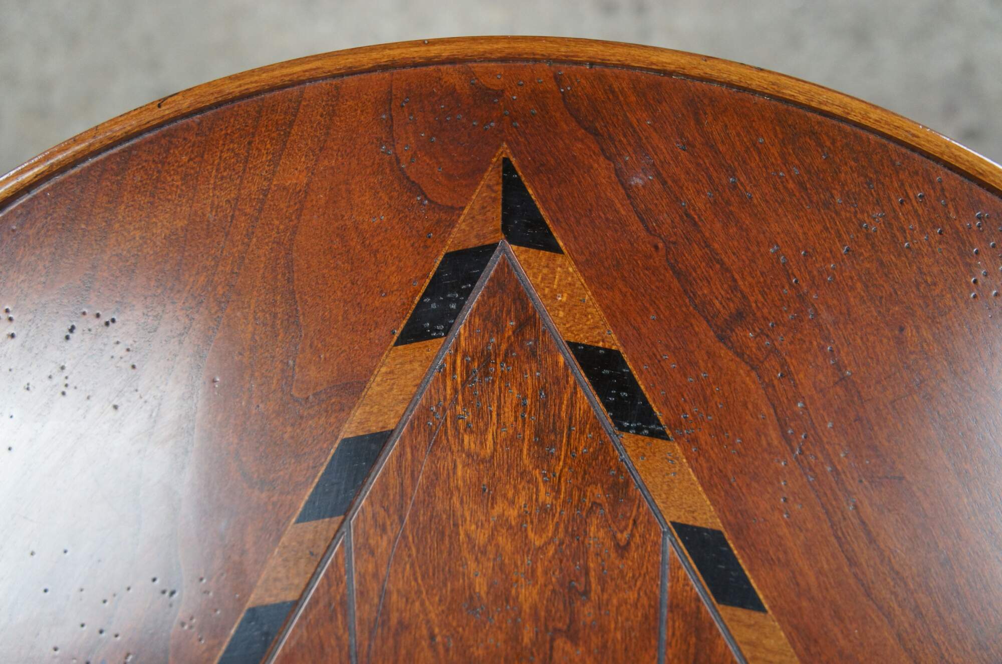 Baker Furniture traditional Queen Anne style cherry clover leaf or Trefoil end table, circa 1990s. Features an inlaid triangle along the inset top, a serpentine apron and cabriole legs with acanthus carved knees and hoof feet. A versatile table that works well as an occassional or cocktail table. Marked Baker Furniture along the underside. Made in the USA, #7258