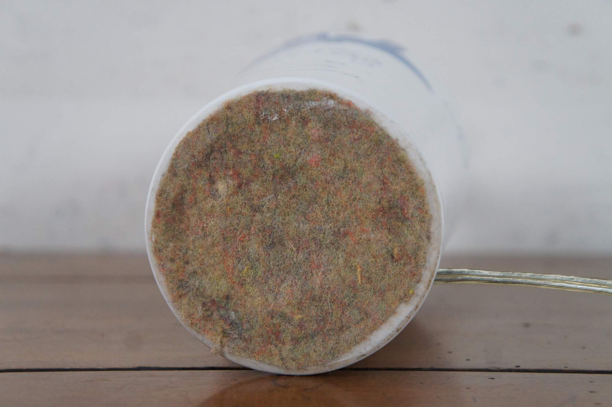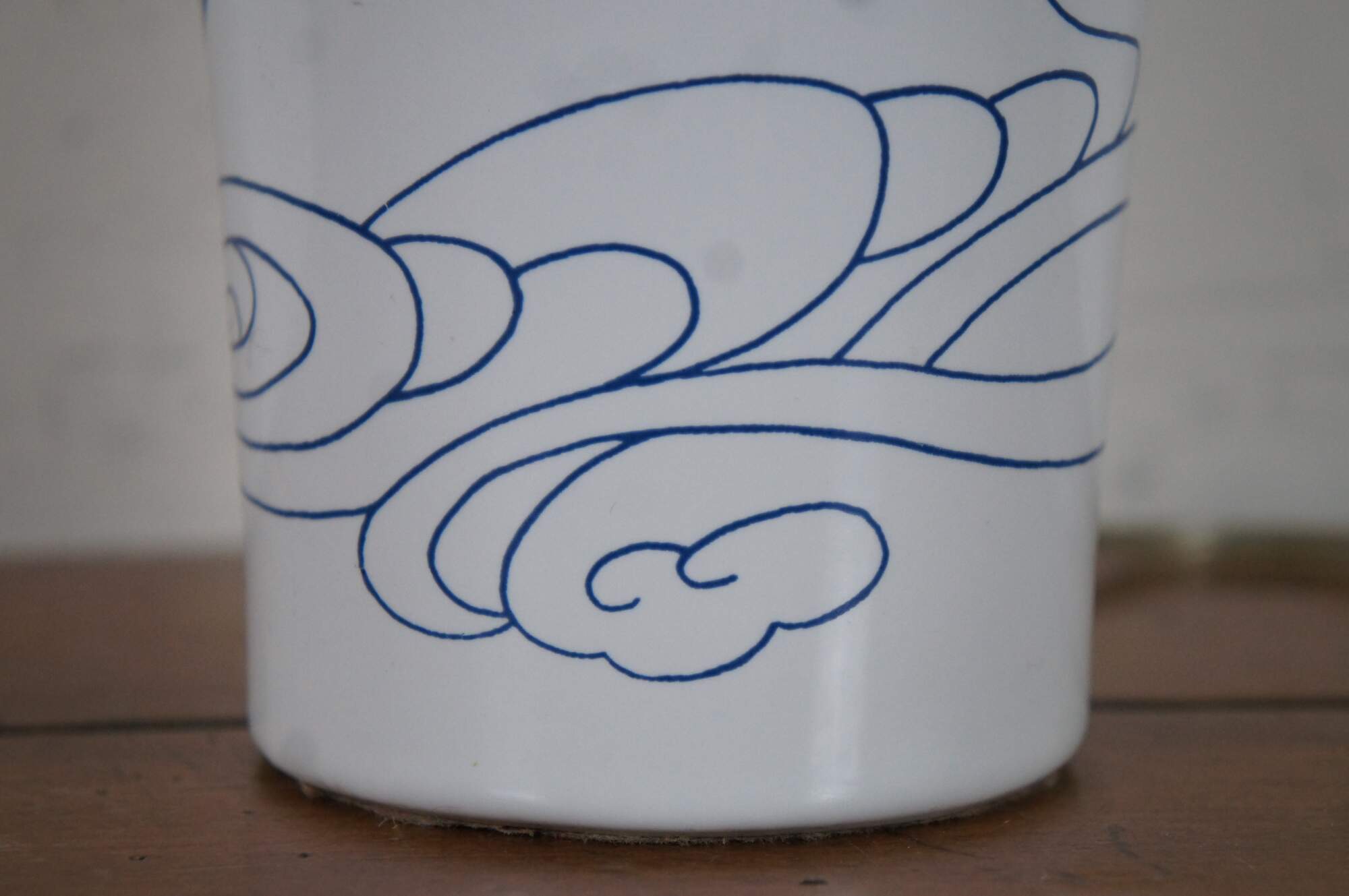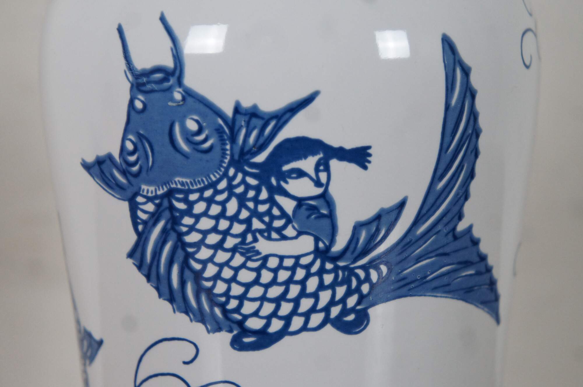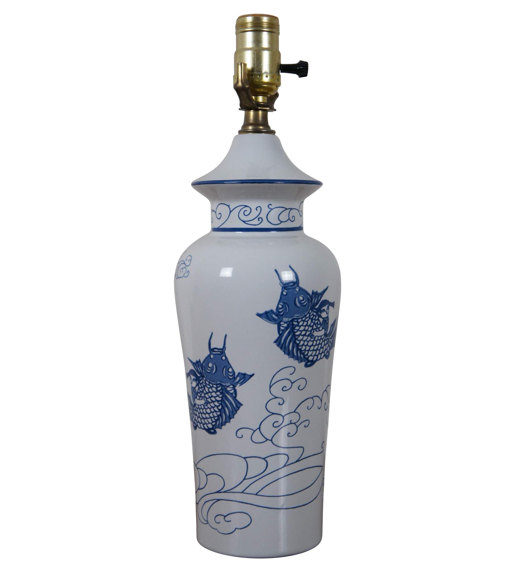 Vintage porcelain table lamp. Features a white base with blue painted design. At the center are Japanese carp with a little girl holding onto their bodies flying withing the clouds. A whimsical chinoiserie design.