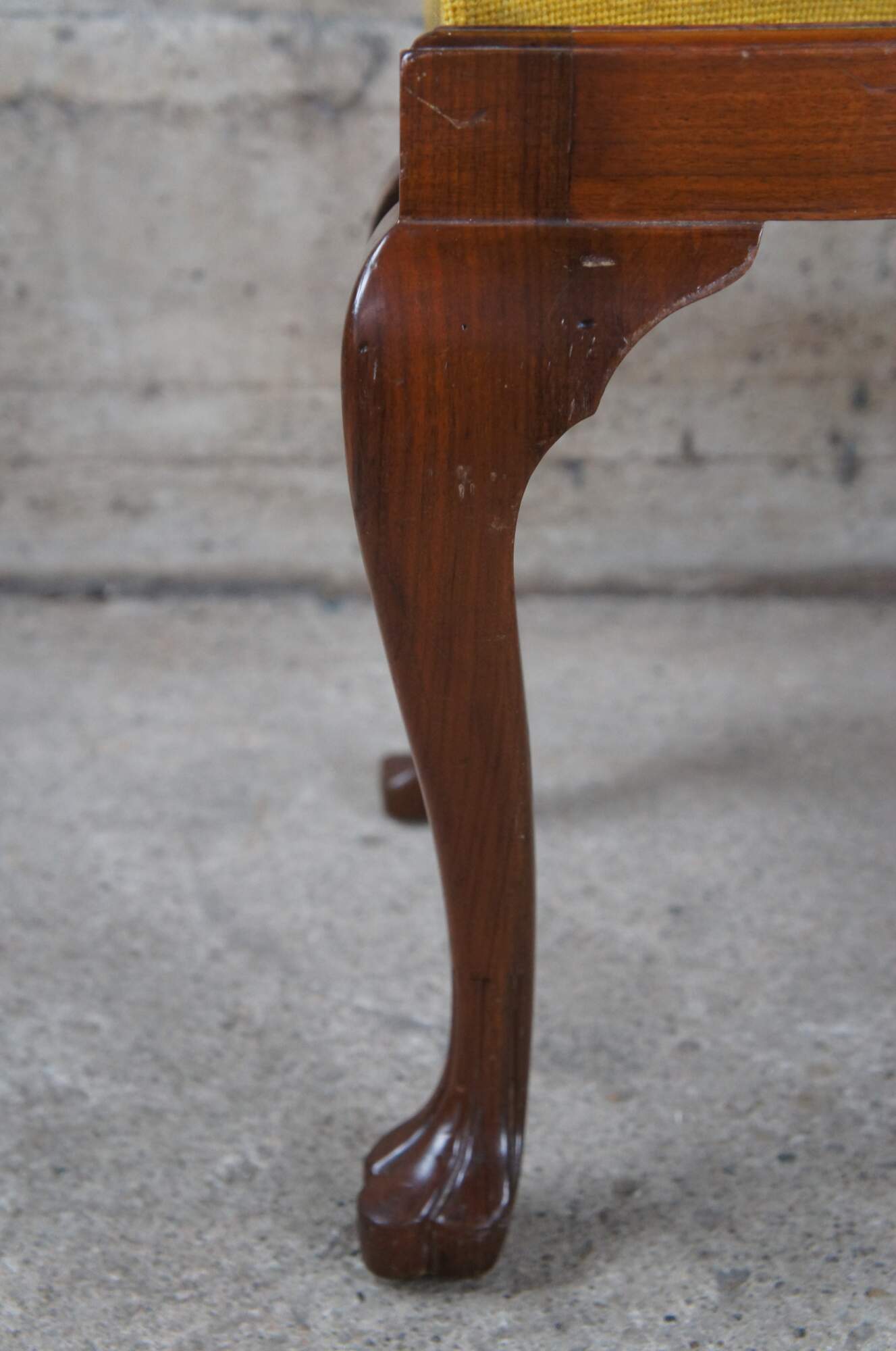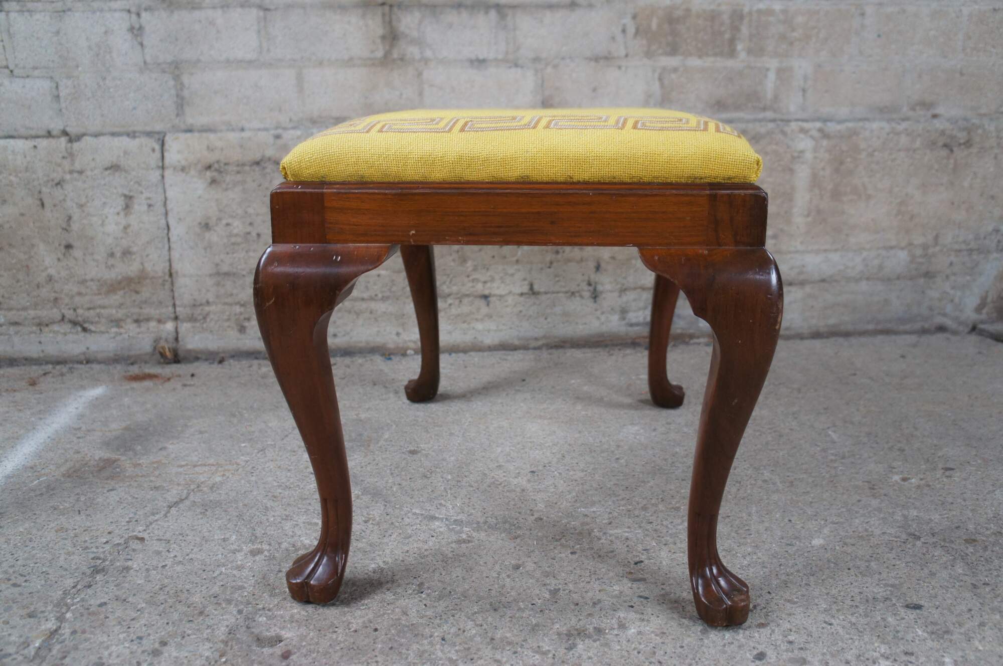 An impressive antique Queen Anne Stool or foyer bench, circa early 20th century. A rectangular form made from solid mahogany with cabriole legs leading to a trifid foot. The seat is upholstered in a needlepoint with a greek key surrounding a bird crest. The saying below the crest is written in latin and translates to ""He deserved the best from his country""