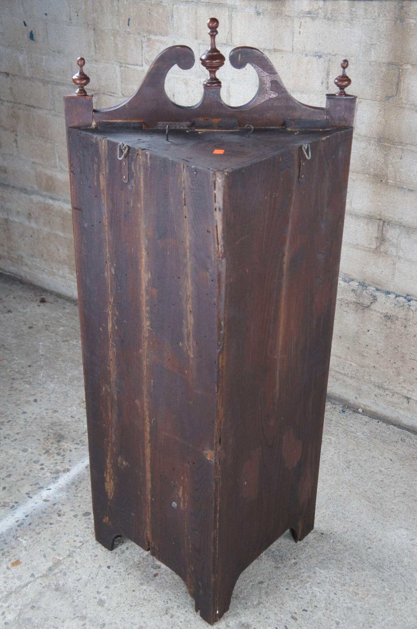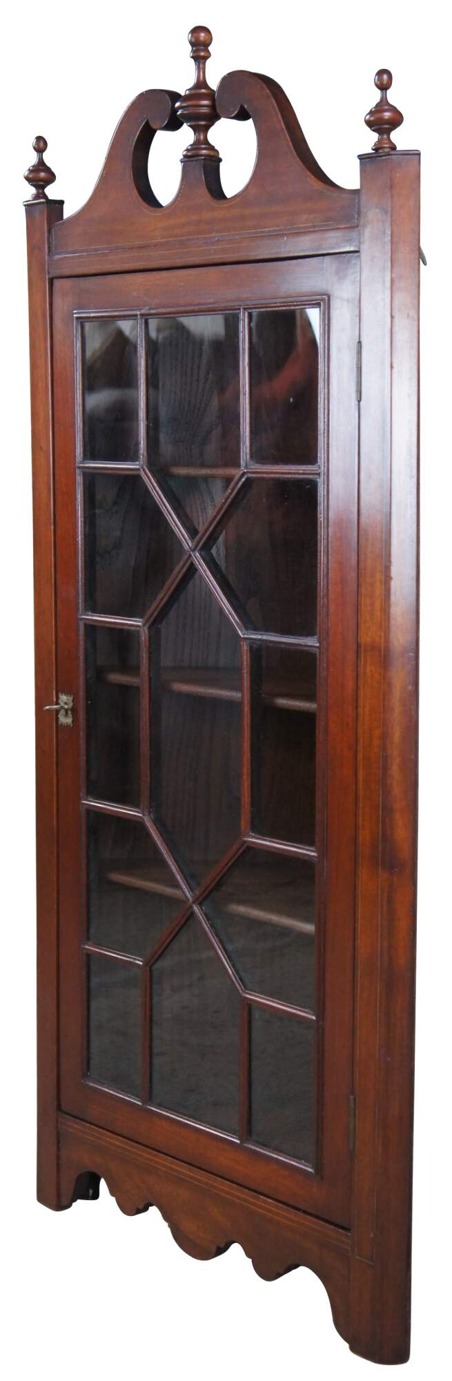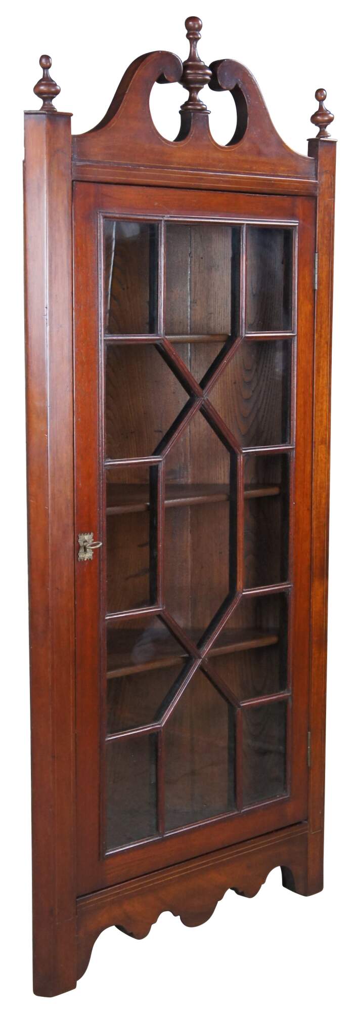 Antique 19th Century George III hanging corner cupboard. Made from mahogany with an inlaid crown and stiles. Features an open pediment, three spire shaped finials, a fretwork covered door and lower serpentine apron. The cabinet has an oak backing with three shelves. Includes key.