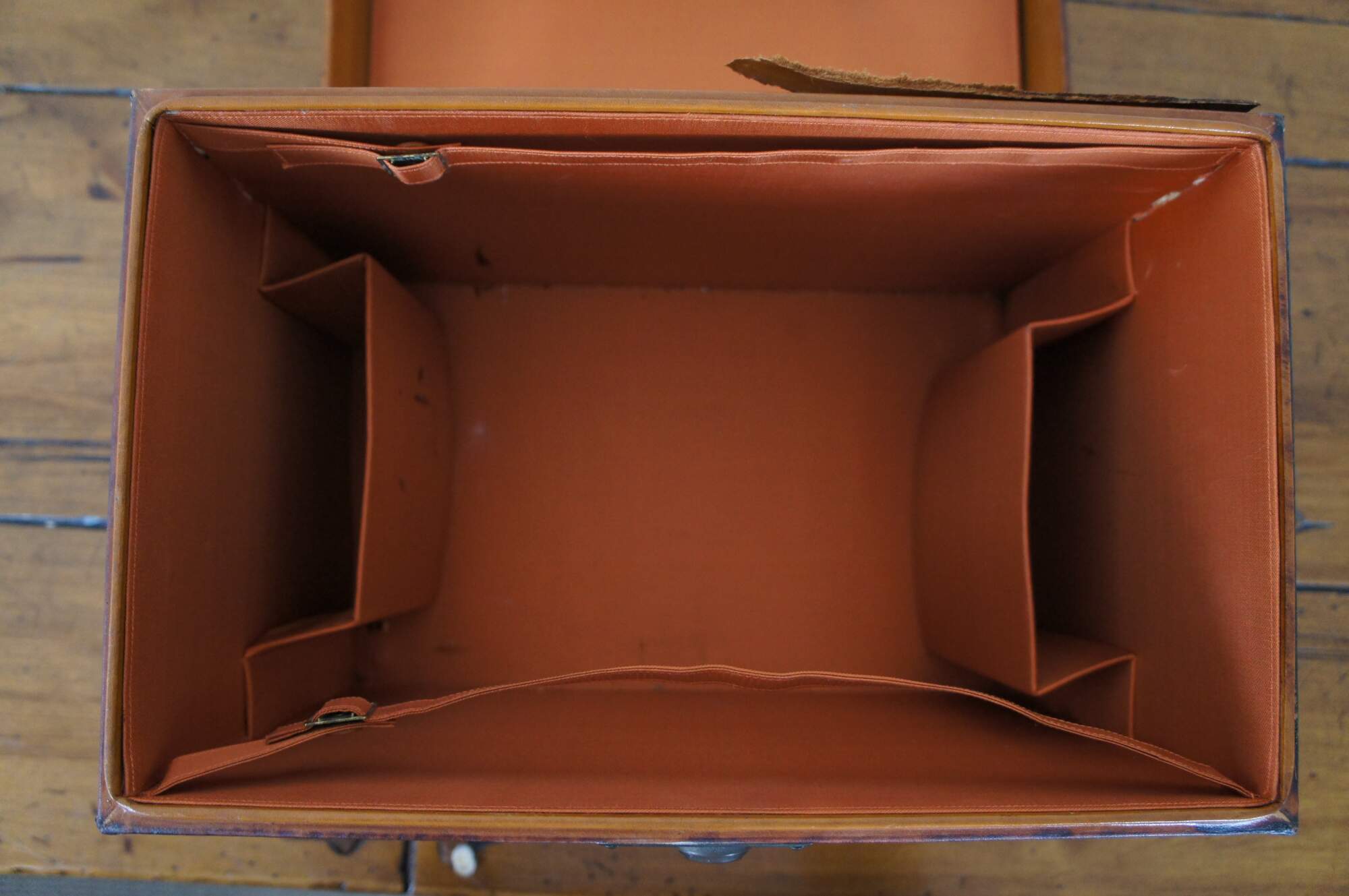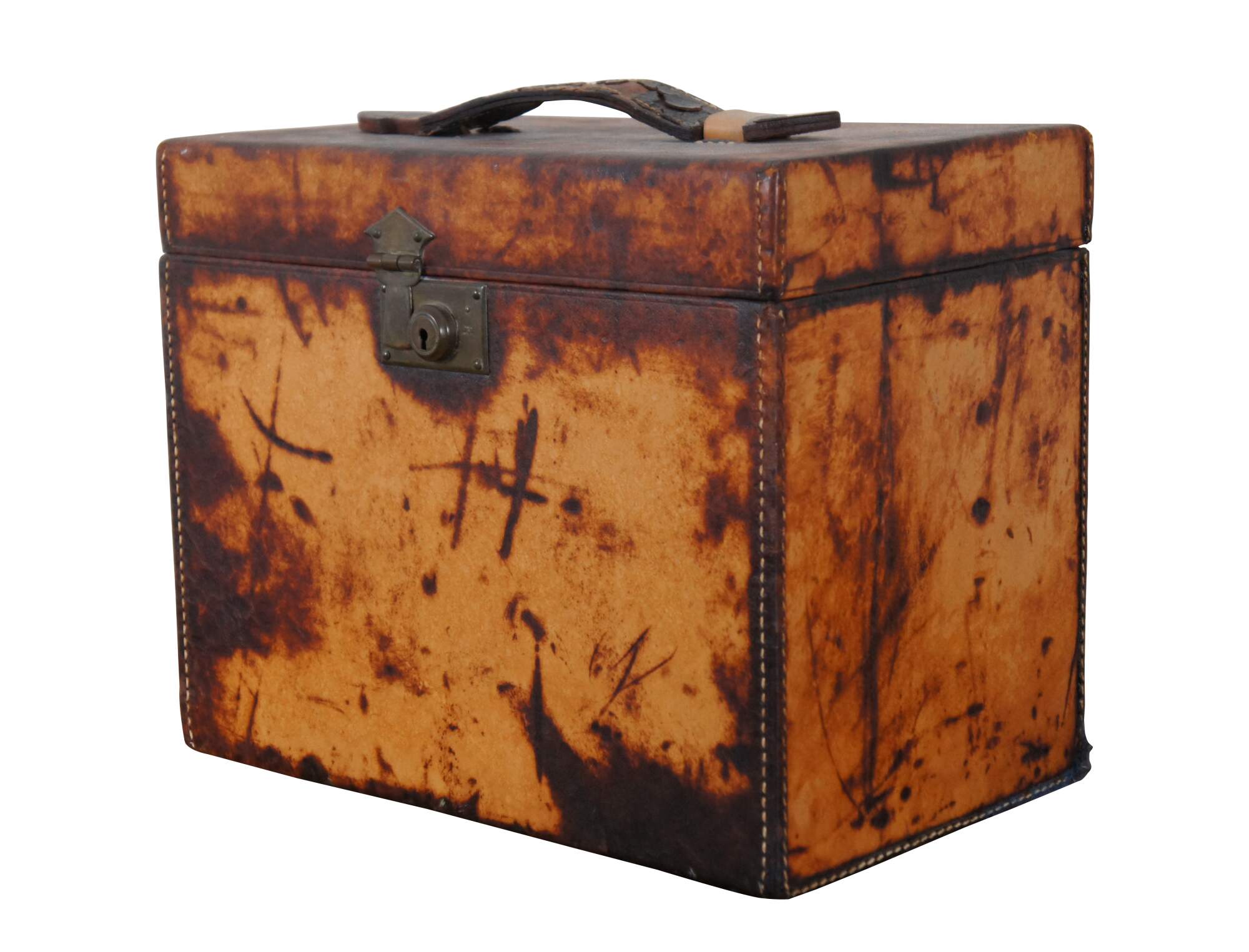 Fair Condition - Lid split from base; stains/bleaching/discoloration/dings/scuffs/peeling to leather; interior pretty good - a couple stains